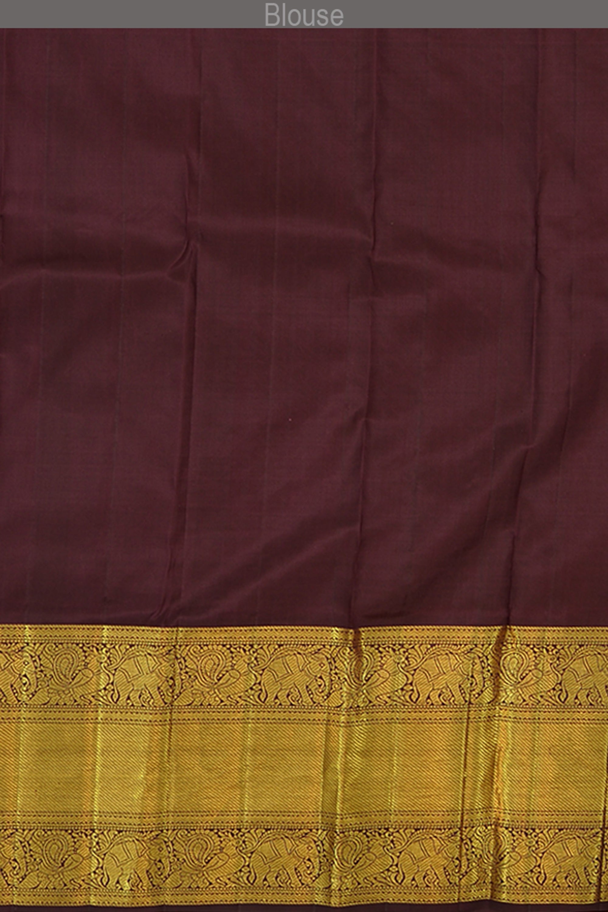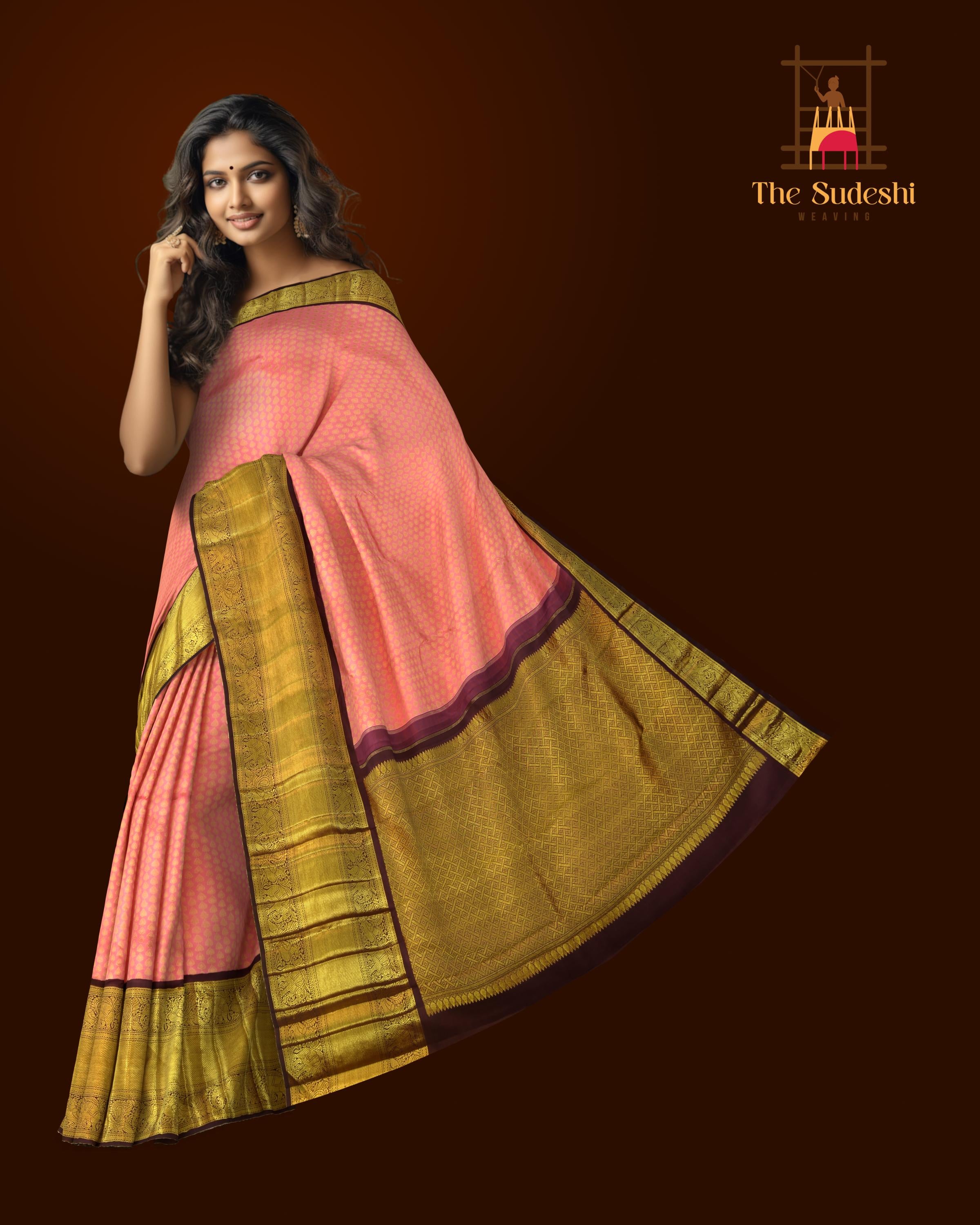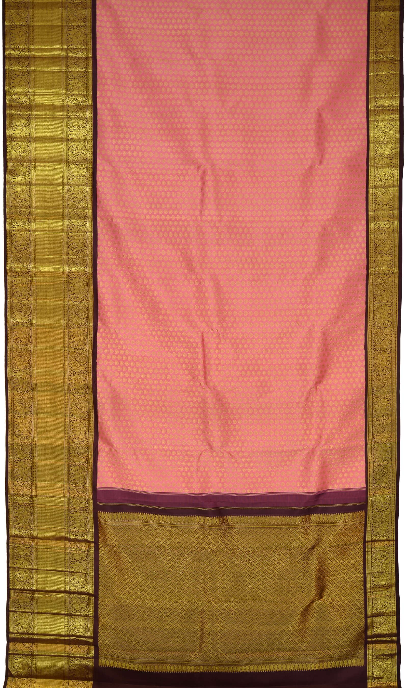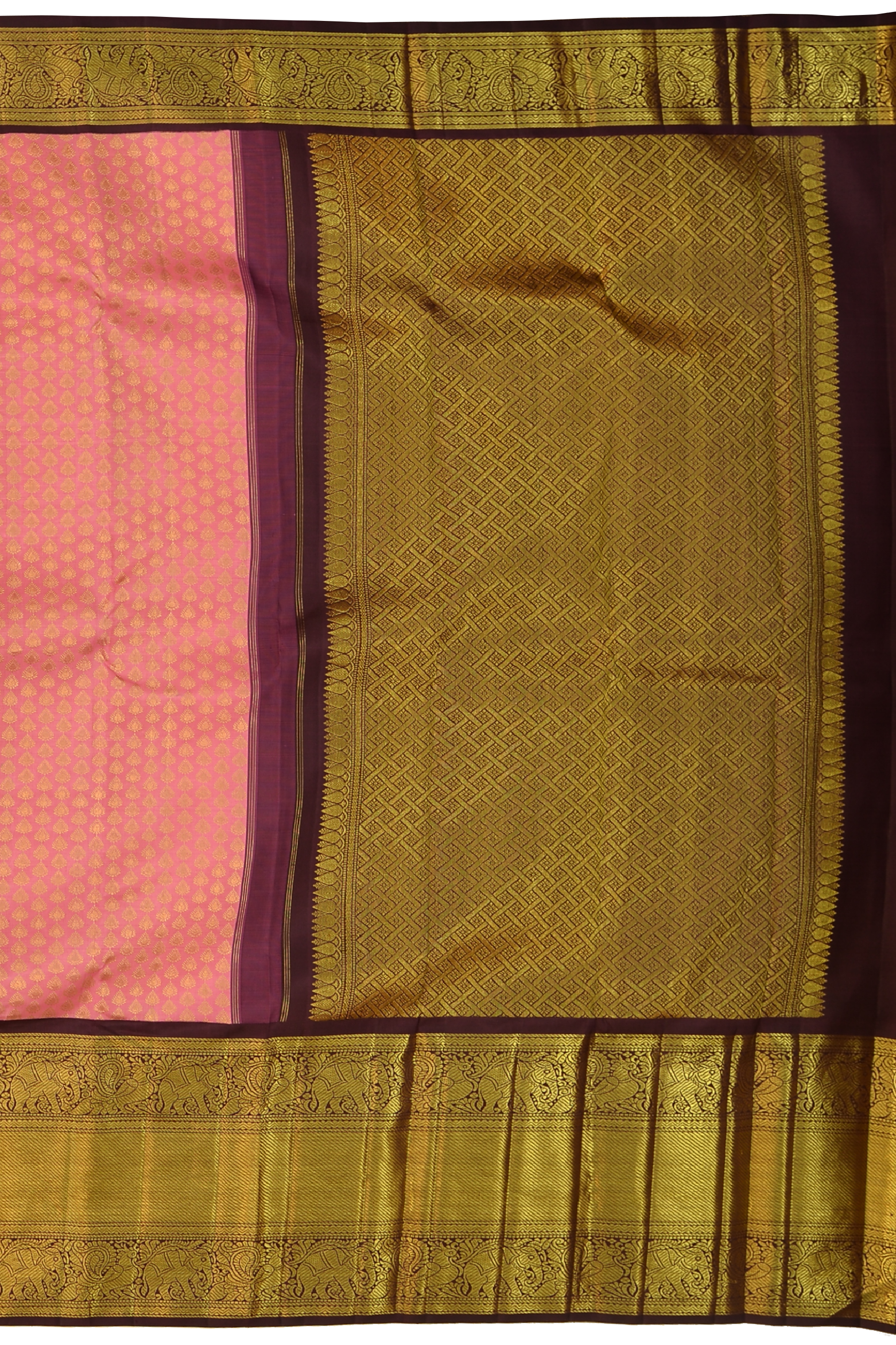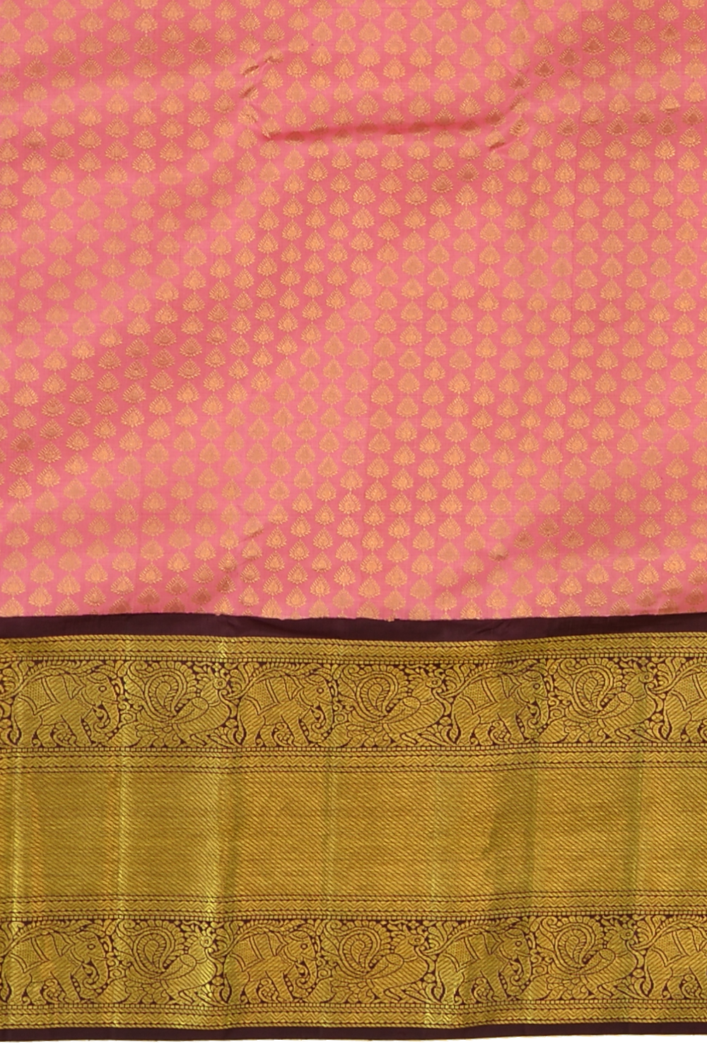 Lotus Pink (Sneha saree) Kanchipuram Silk Saree with Jackard Small tilak body with Annapakshi and Elephant Contrast border and Coffee Brown Grand Pallu with diamond design