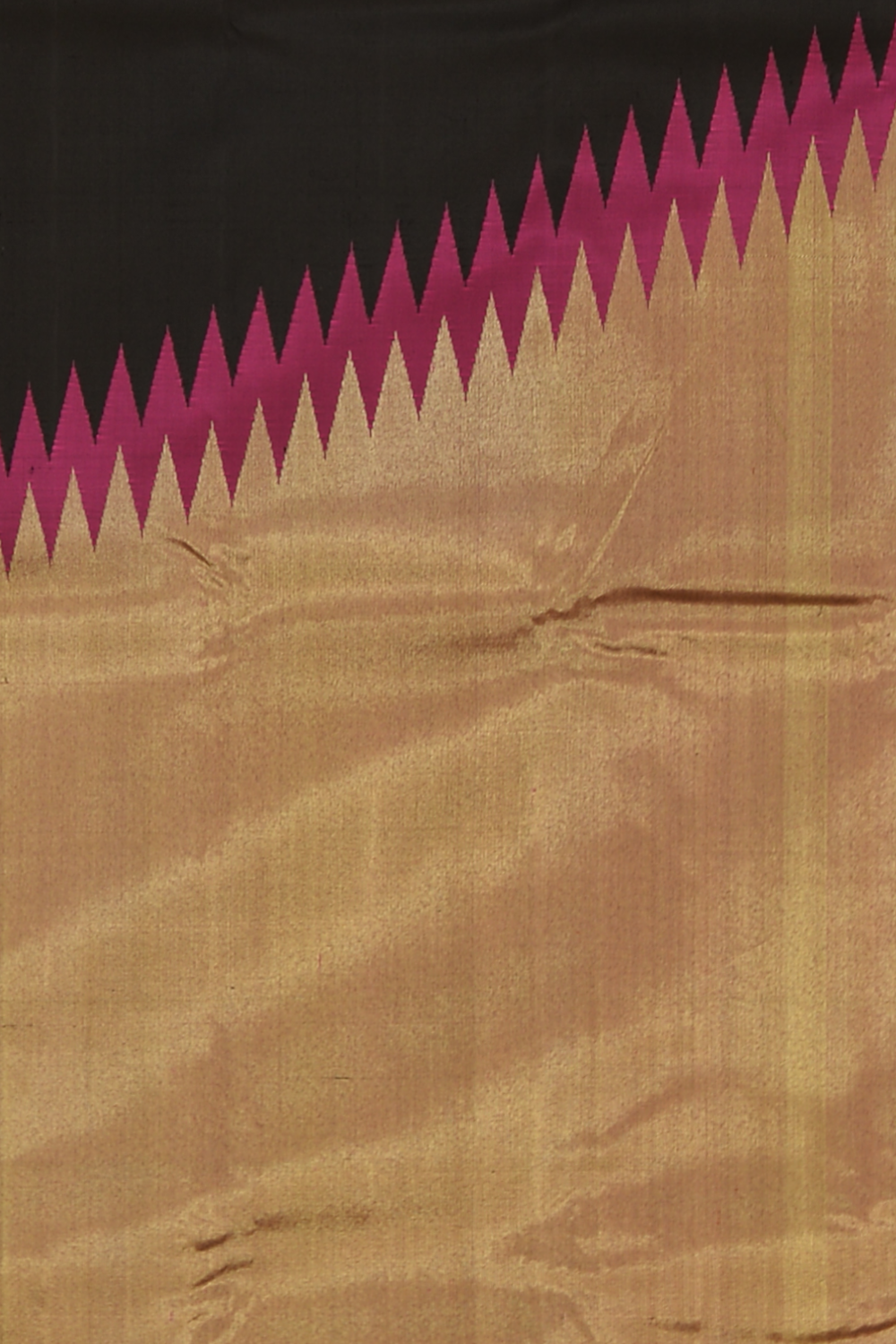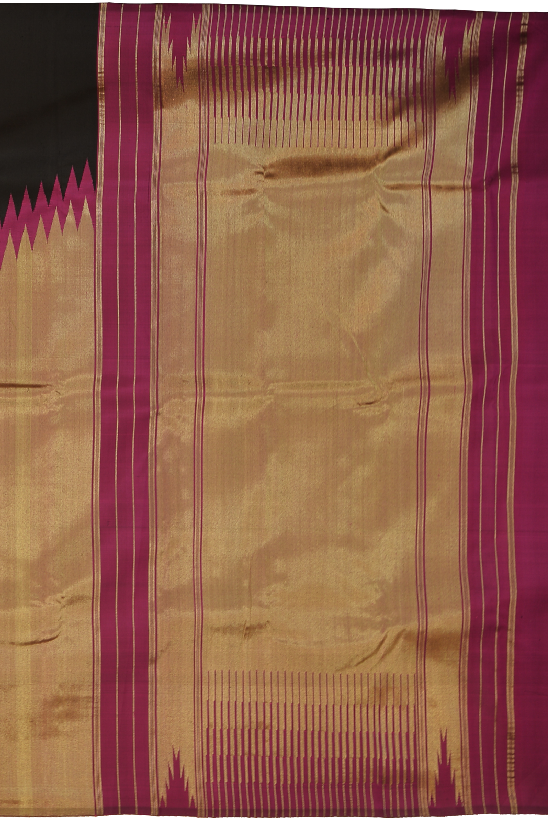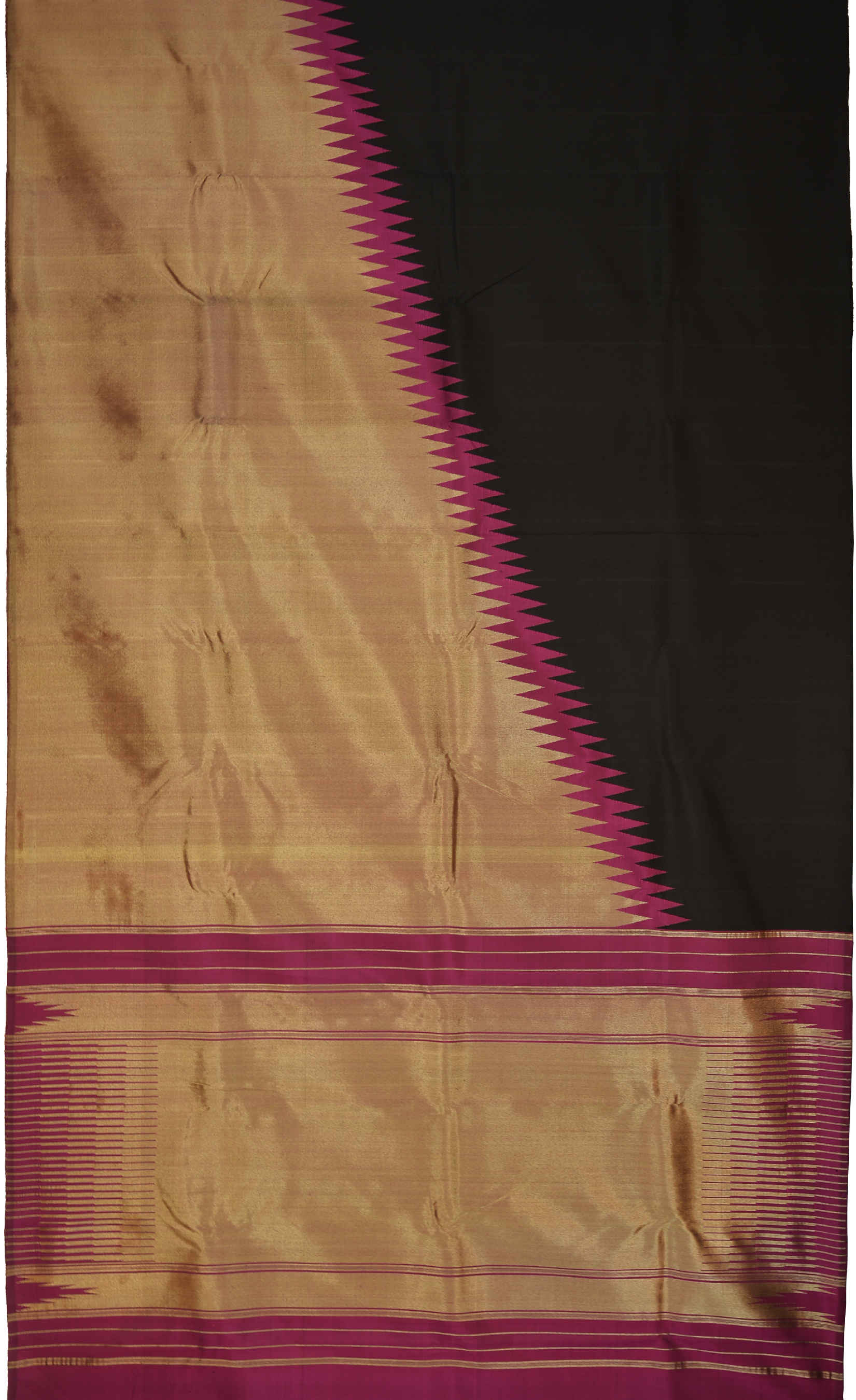A nod to the iconic style of the national carrier, this Kanchipuram silk saree embodies sophistication with its plain black body and the quintessential Air India-inspired long border. It stands as a testament to the fusion of contemporary design with age-old traditions.