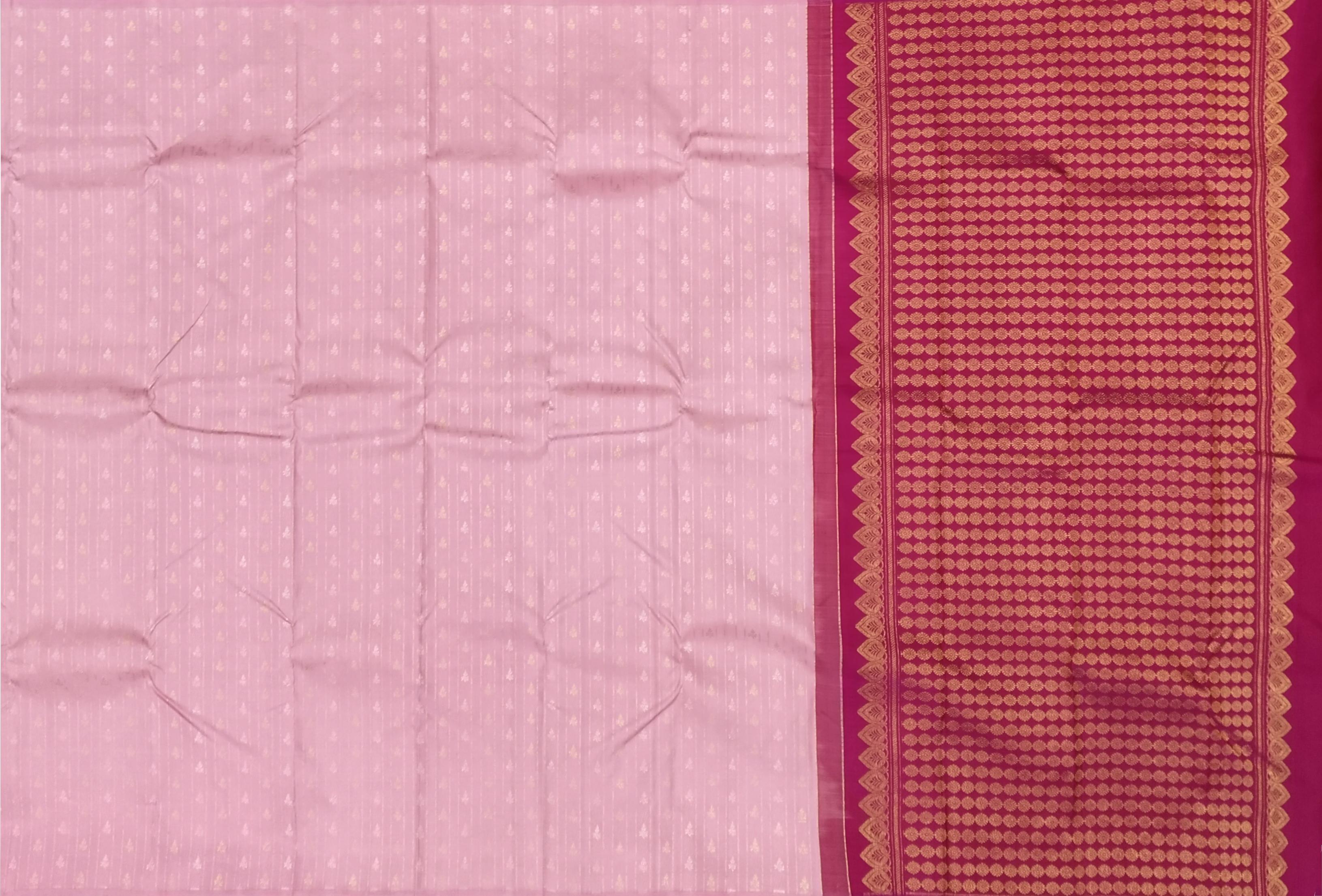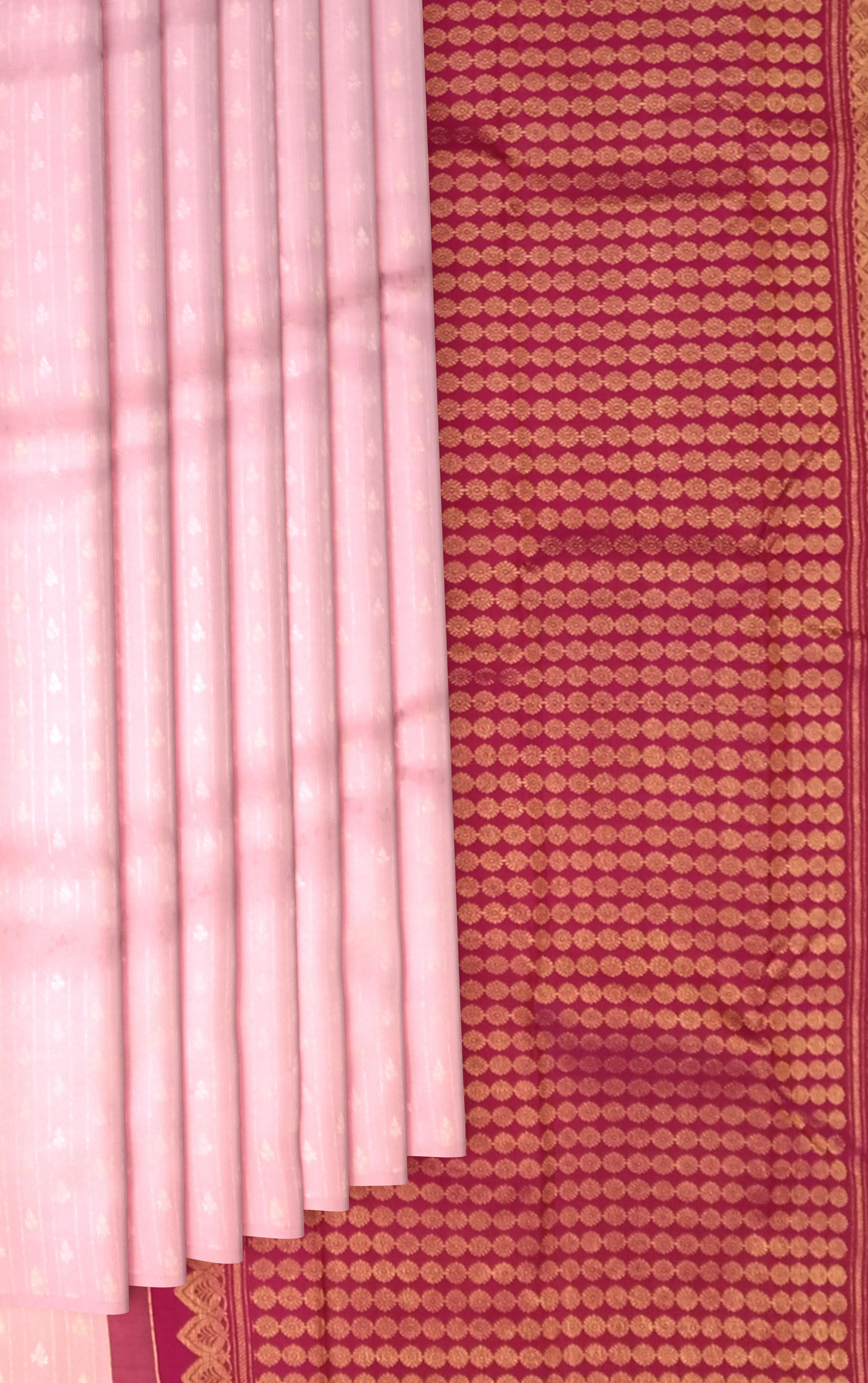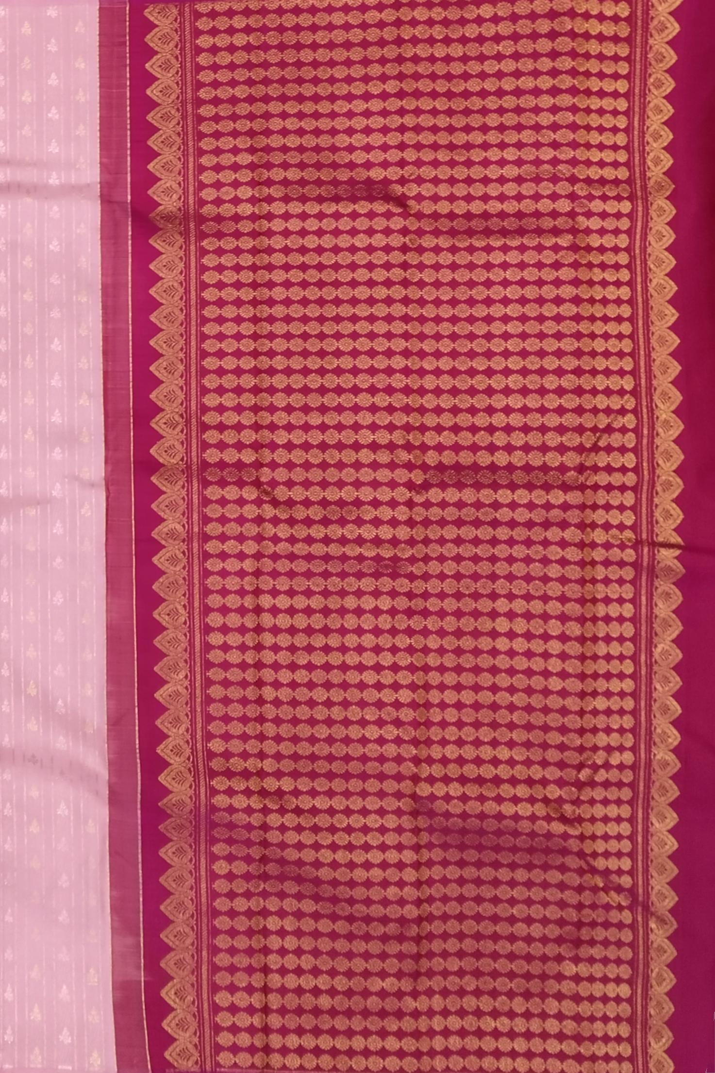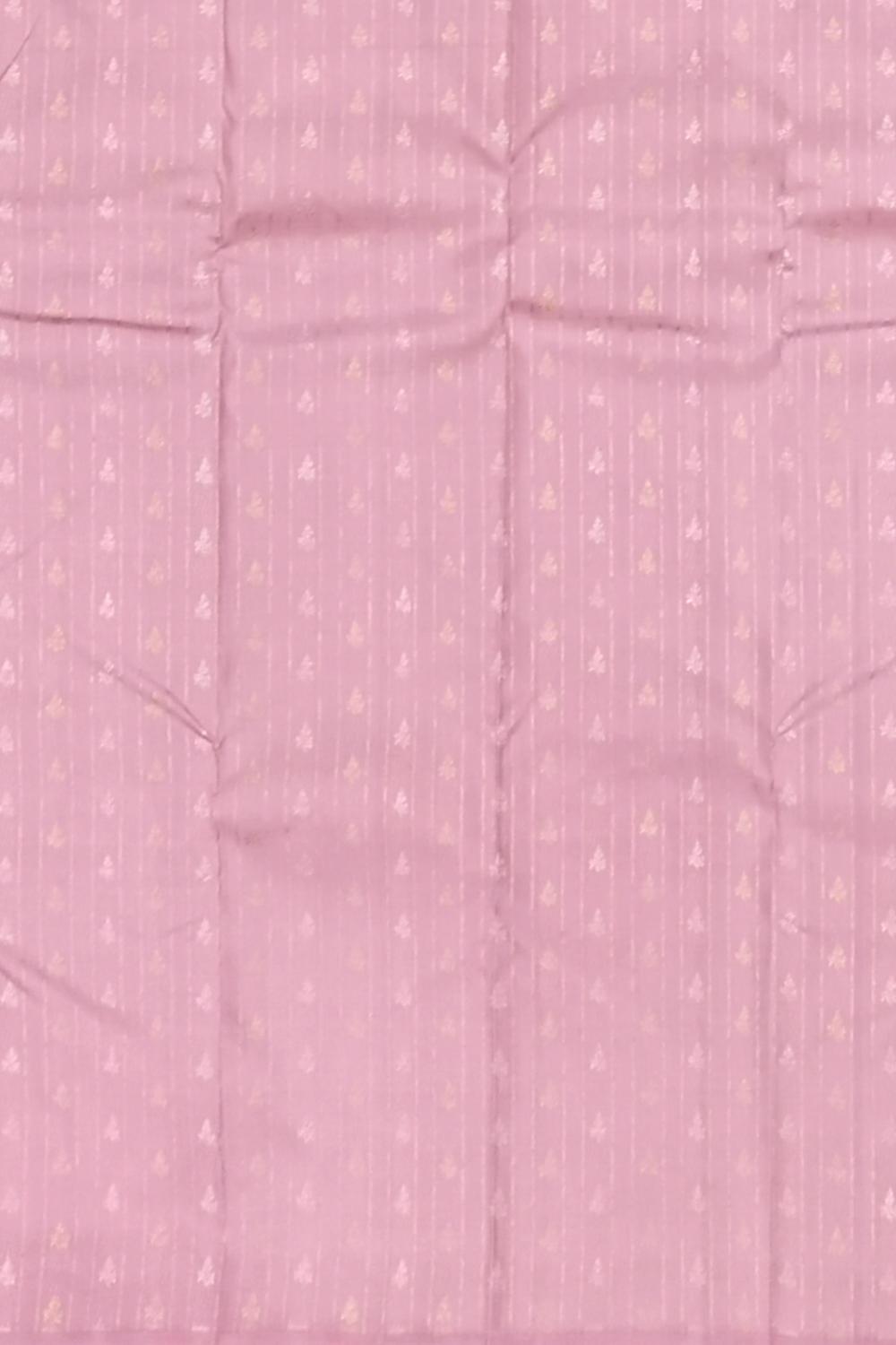 Soft, feminine, and graceful — this baby pink Kanchipuram silk saree features small bhutta motifs lined with subtle stripes, all set in a delicate borderless format. The pastel hue gives it an ethereal quality, while the detailed bhutta weave adds subtle richness.