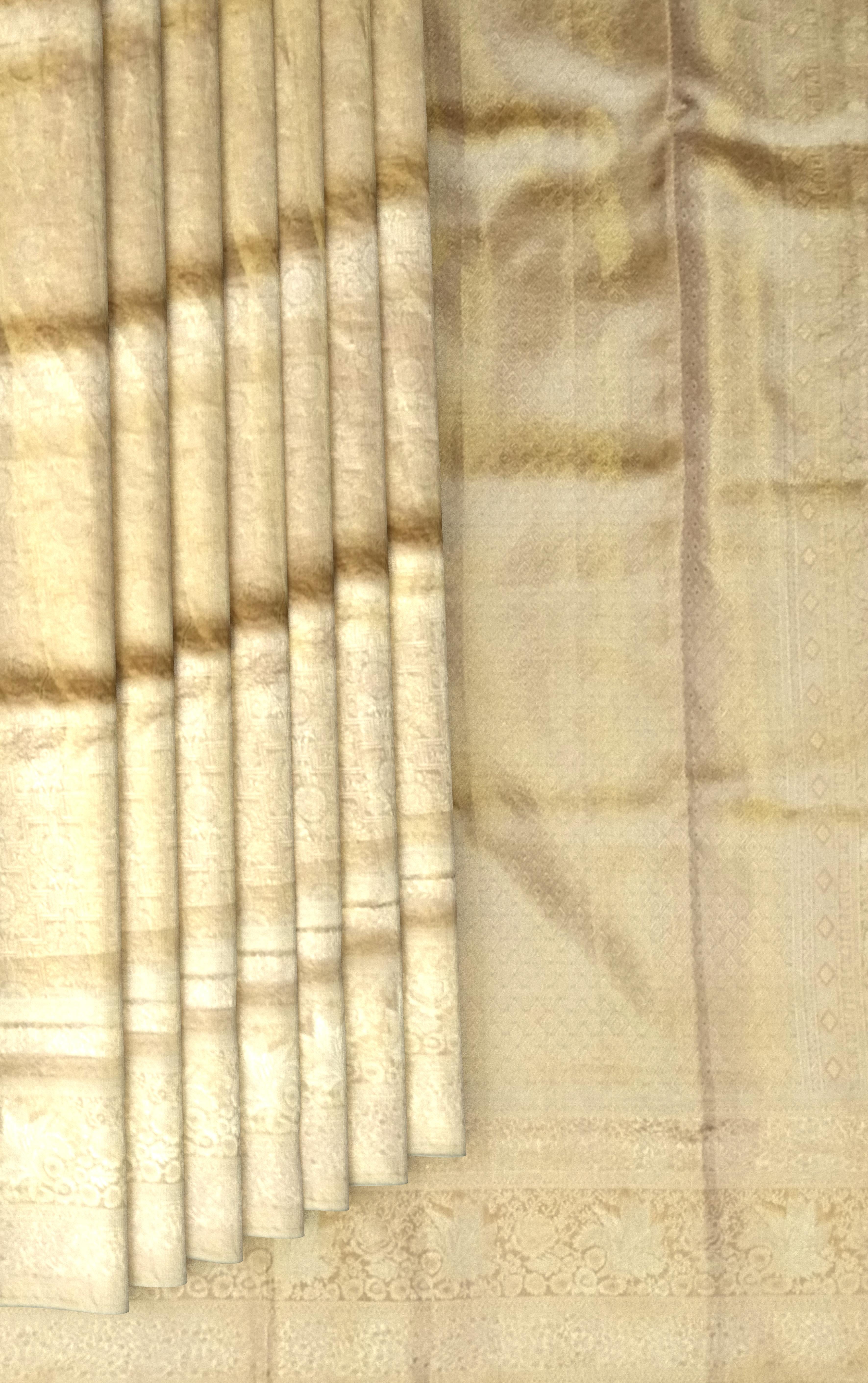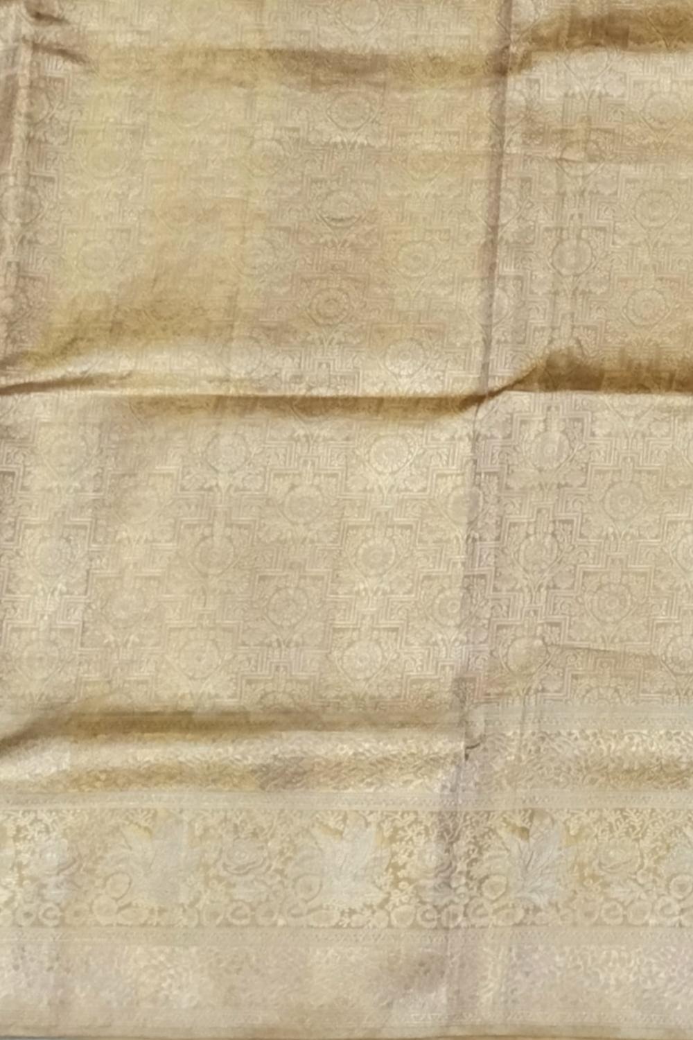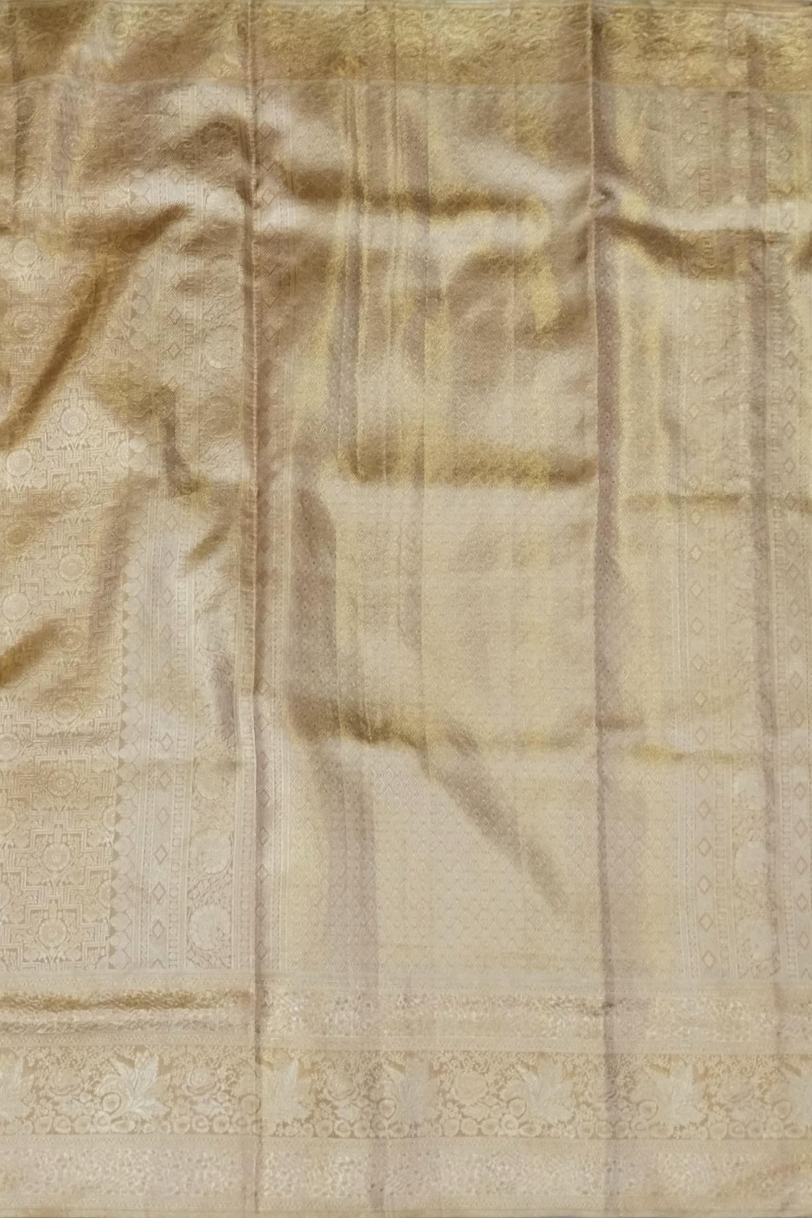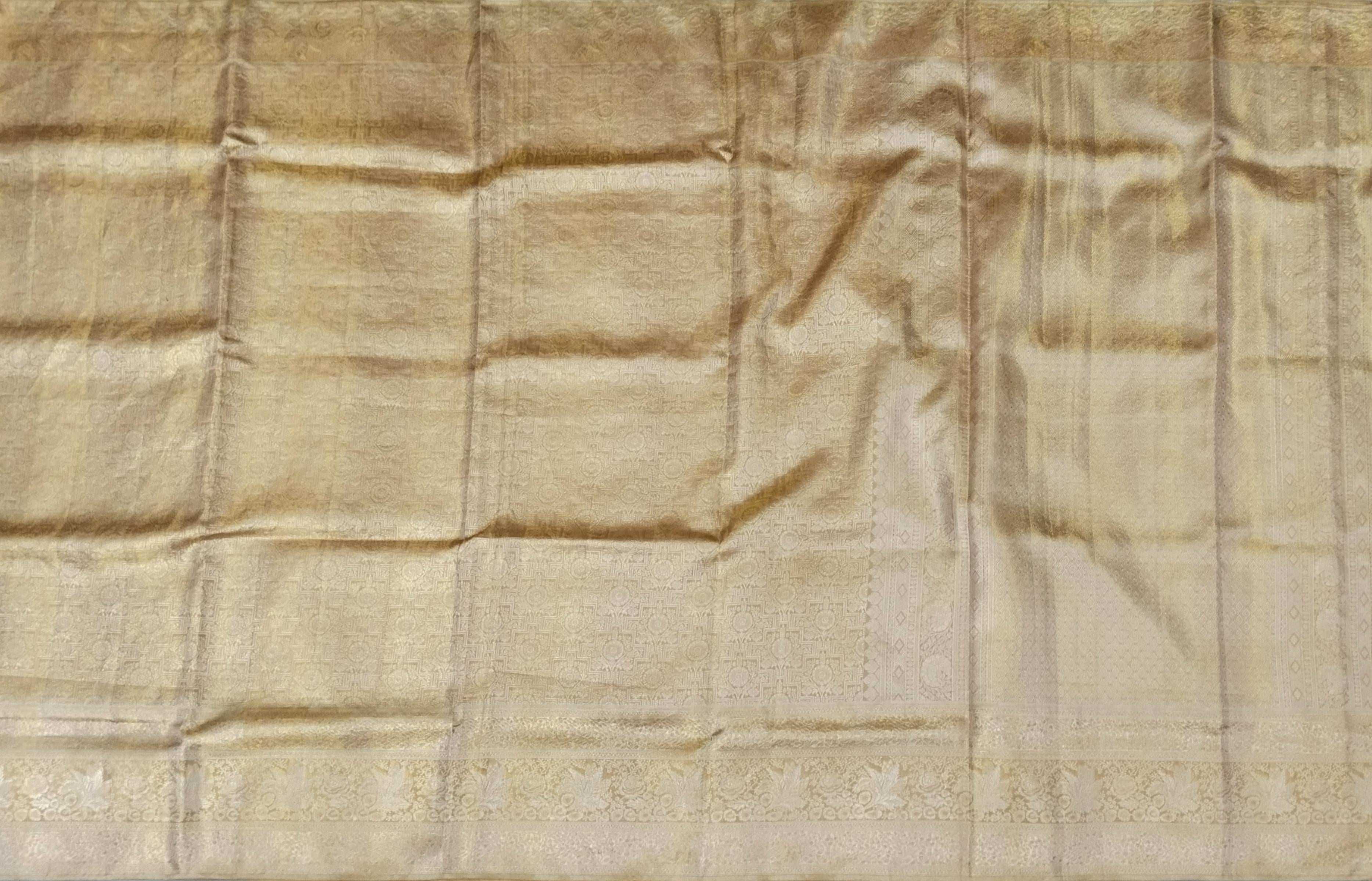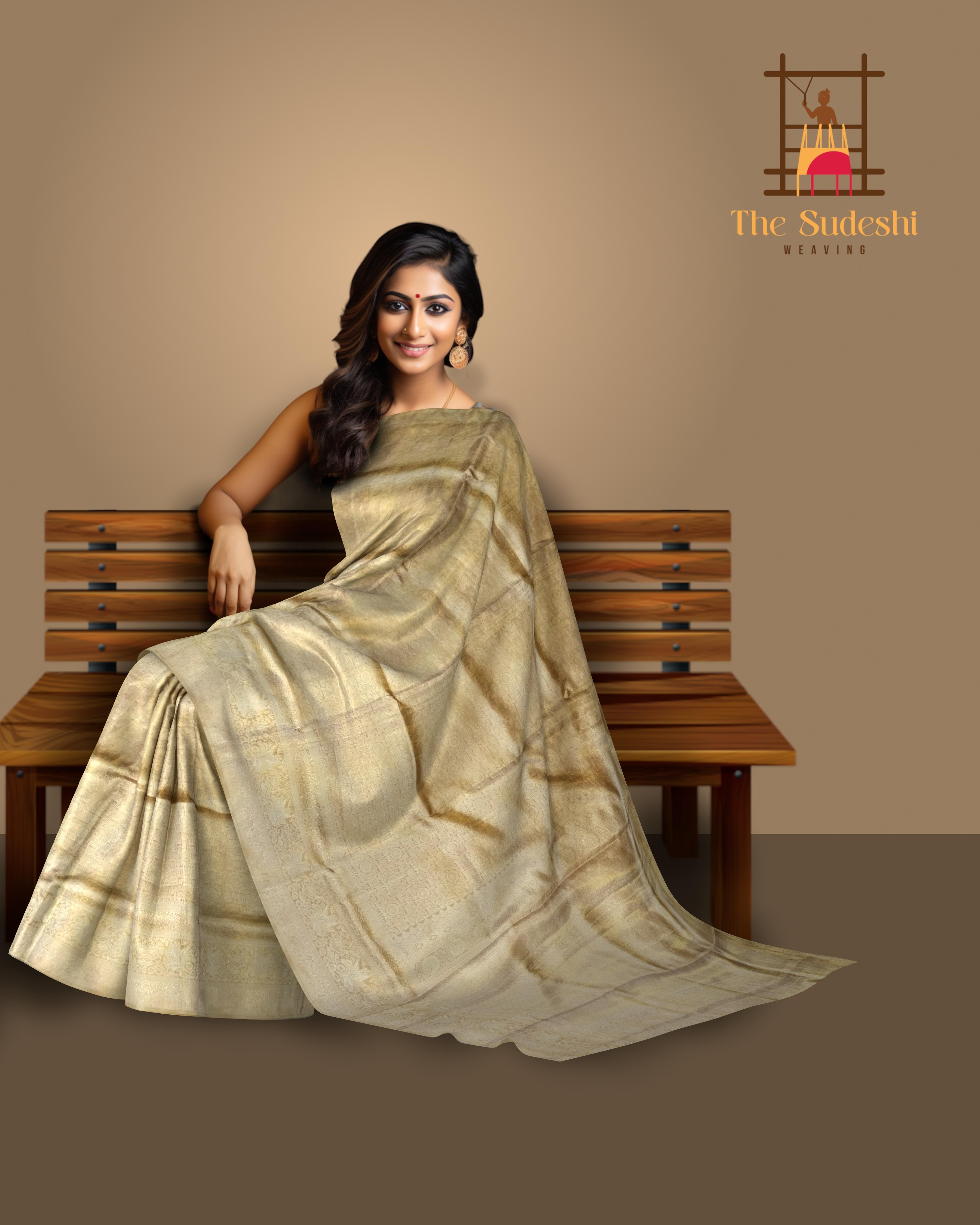 Sublime and sophisticated, this Beige Kanchipuram Silk Saree woven in intricate Brocade patterns is a celebration of understated luxury. The self-color body and pallu shimmer gently under light, creating a serene yet regal aura. Its minimalistic palette allows the zari artistry to take center stage, making it a versatile choice for both festive and formal occasions. Each Kanchipuram Pure Silk Saree is an ode to the weaver’s devotion, skillfully interlacing silk and zari threads to produce exquisite motifs and rich textures. Originating from Tamil Nadu’s heritage looms, these sarees represent centuries of sacred tradition and the unbroken legacy of Indian handloom excellence. Perfect for weddings, receptions, and grand celebrations, this saree pairs beautifully with statement gold jewelry or Kundan pieces. Complete the look with soft curls and nude-toned makeup for a timeless appeal. Note: The appearance of the product’s colors may vary due to lighting conditions or your device’s screen calibration. For further assistance or additional images/videos, feel free to contact us at +91 97897 60367 or email at wecare@thesudeshiweaving.com.