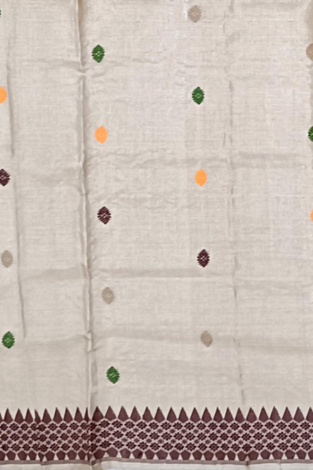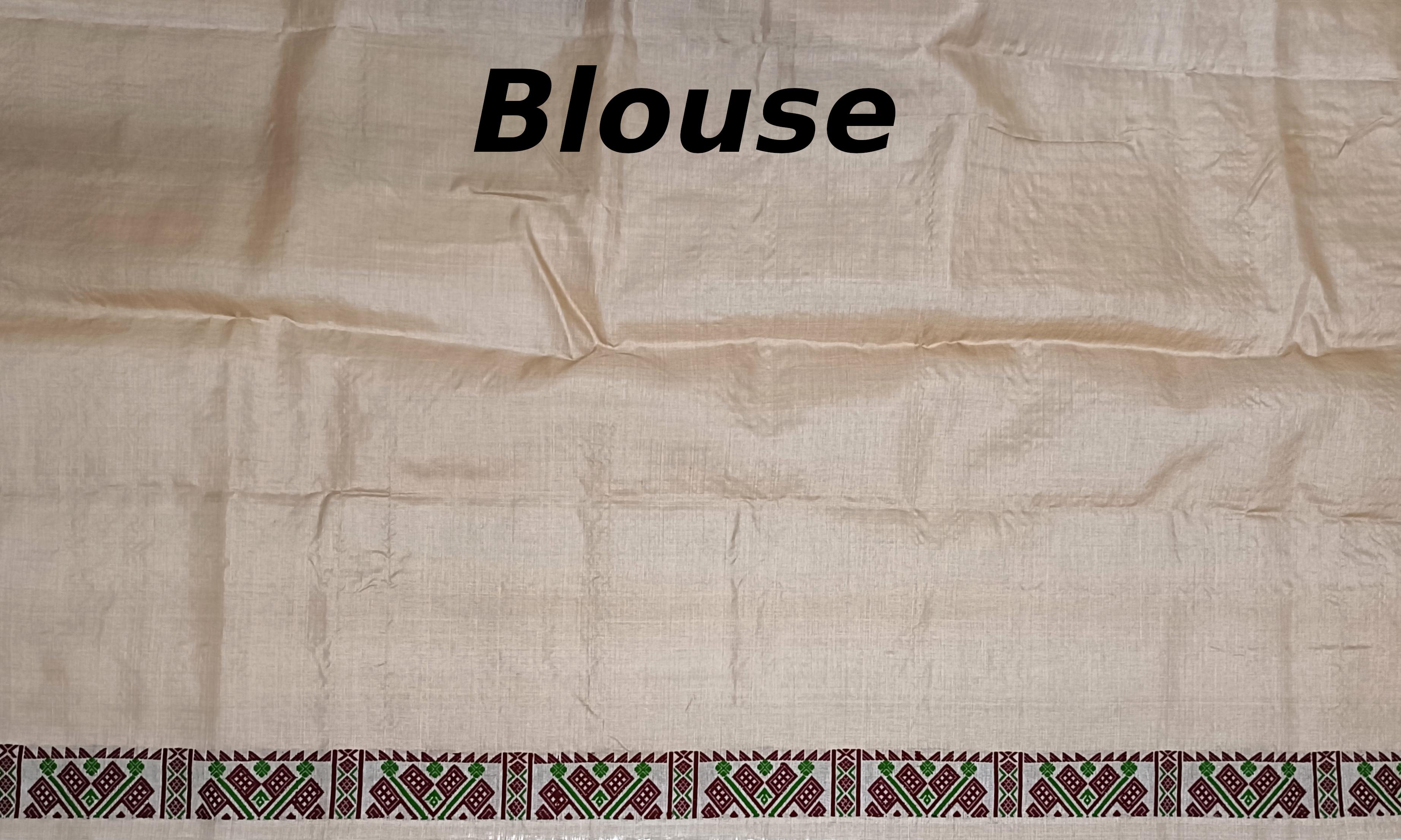 Step into the elegance of tradition with this beige Tussar saree from Assam. The saree features intricate buttis and motifs that beautifully celebrate the artistic heritage of Assamese weavers. The dark maroon border and maroon pallu create a rich, complementary contrast to the subtle beige, offering a classic look that exudes sophistication.