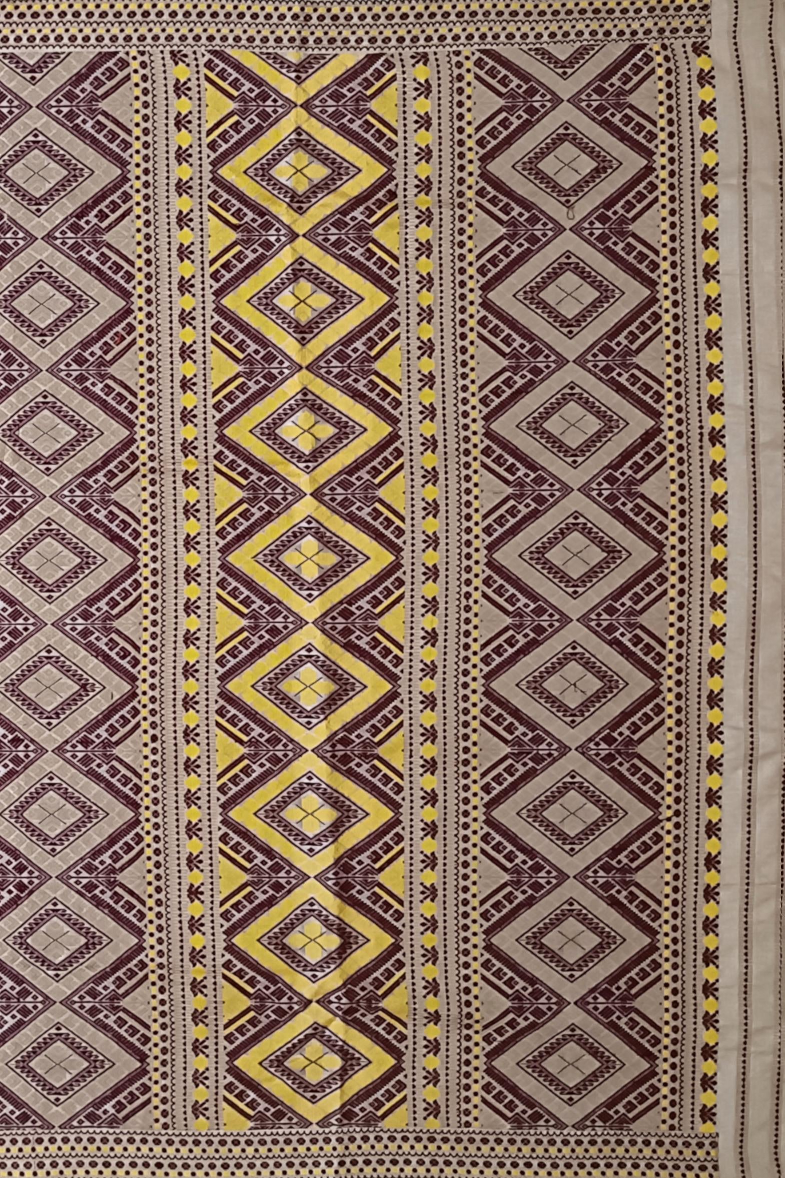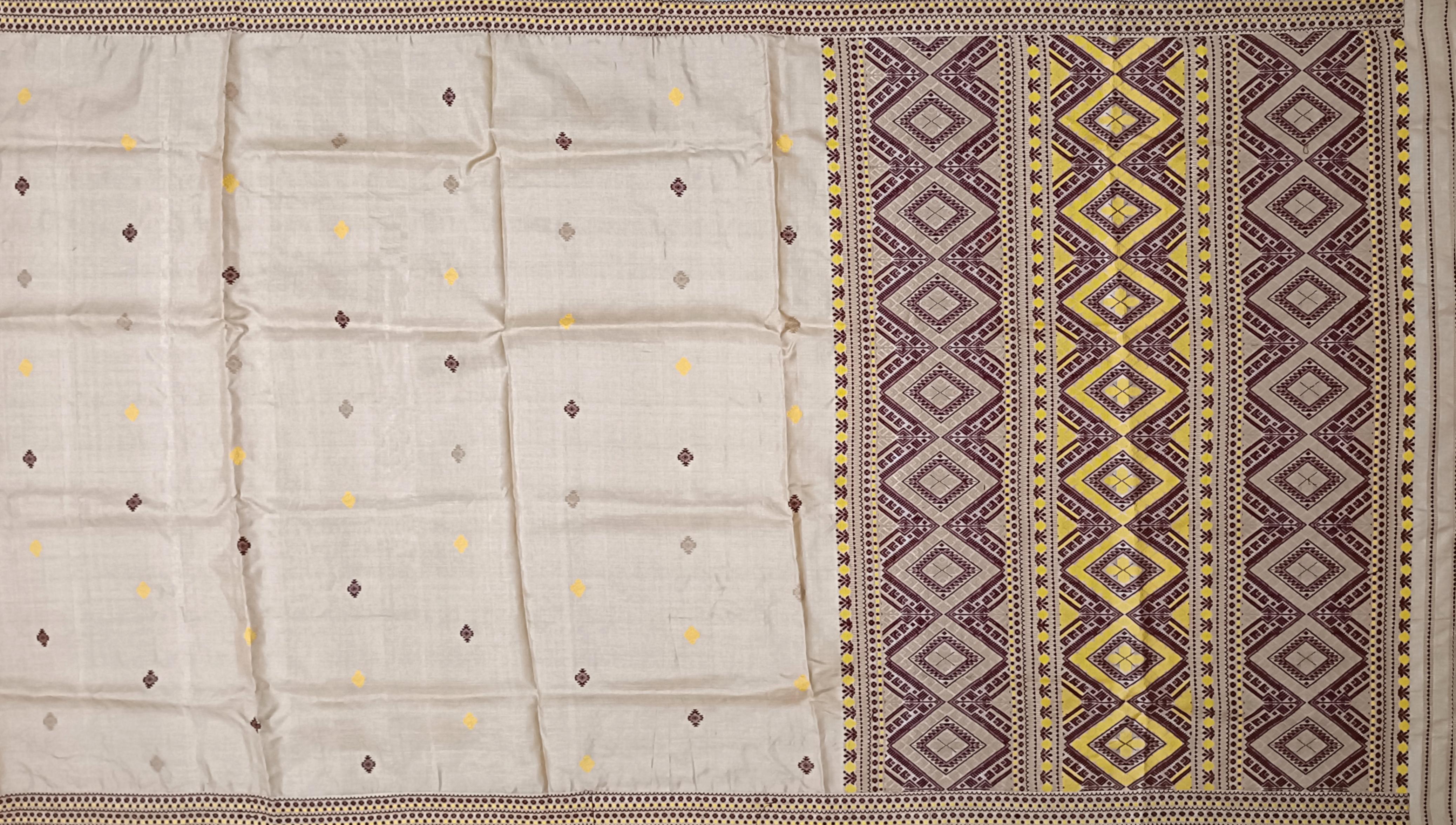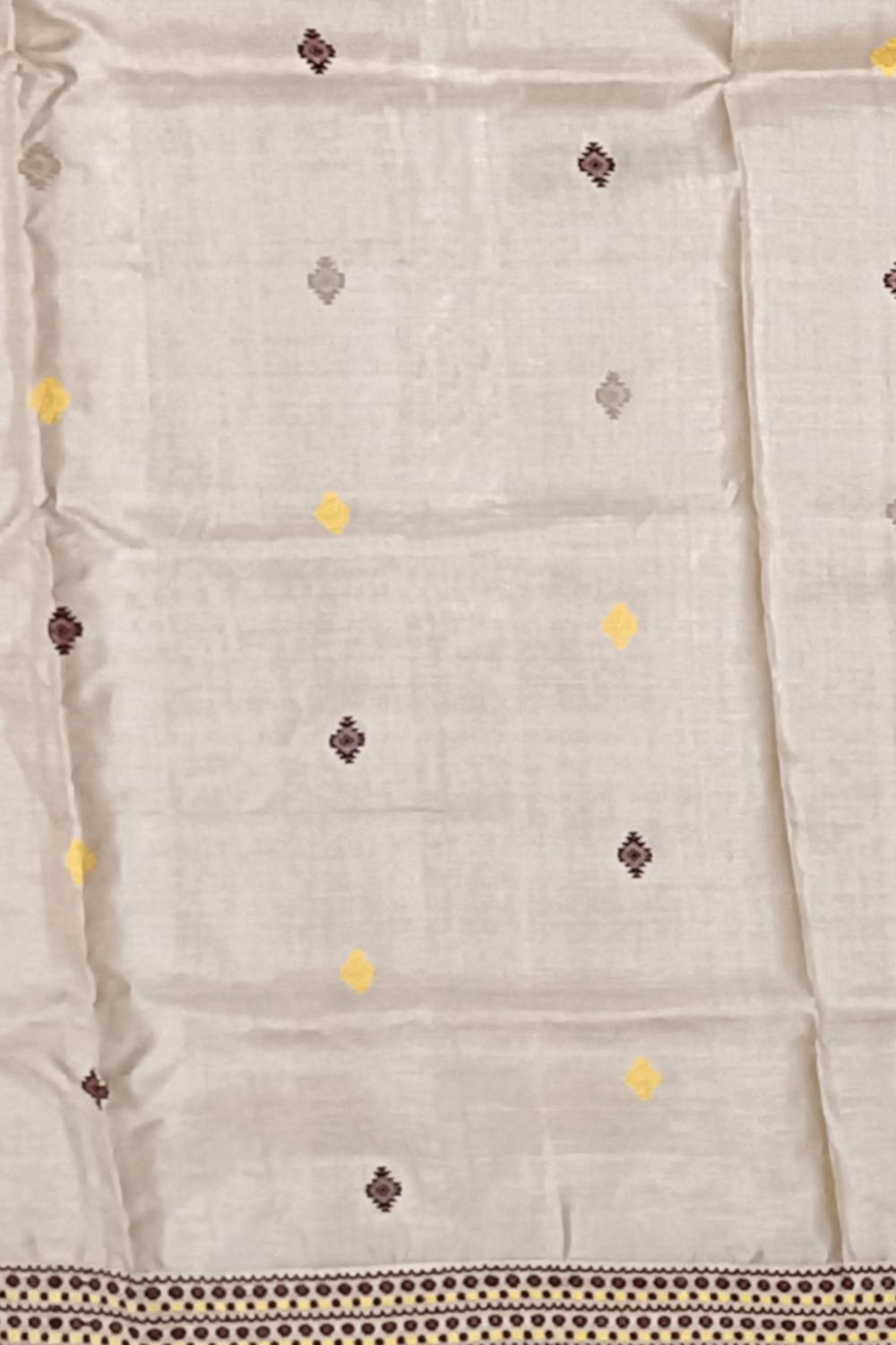 Celebrate the beauty of simplicity with this beige Tussar saree from Assam. Adorned with graceful buttis and motifs, this saree highlights the meticulous craftsmanship of Assamese artisans. The maroon border and pallu add a striking contrast to the understated beige, making it an ideal choice for any occasion.