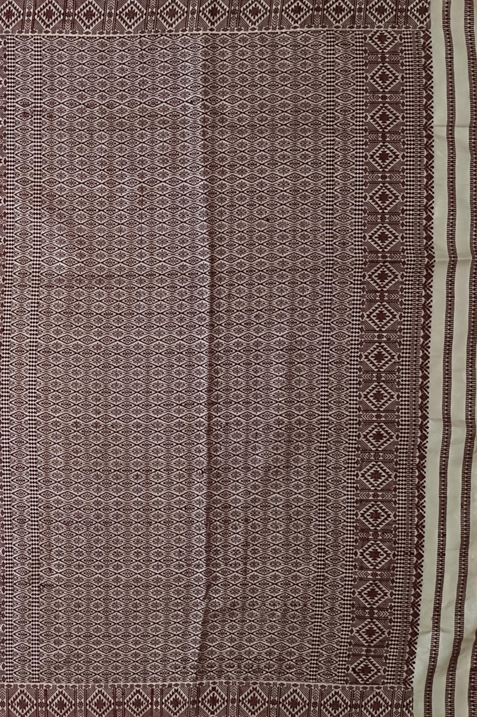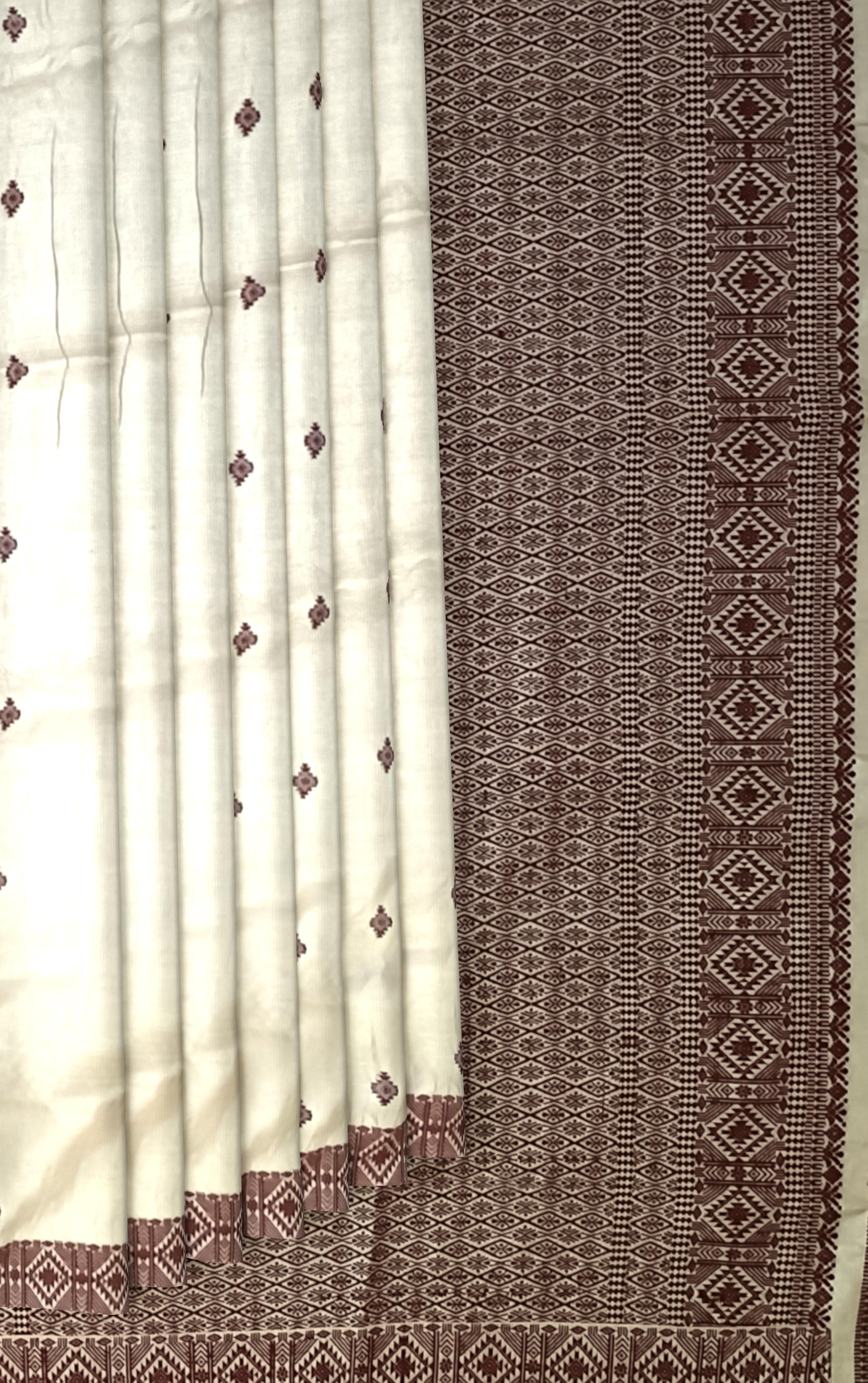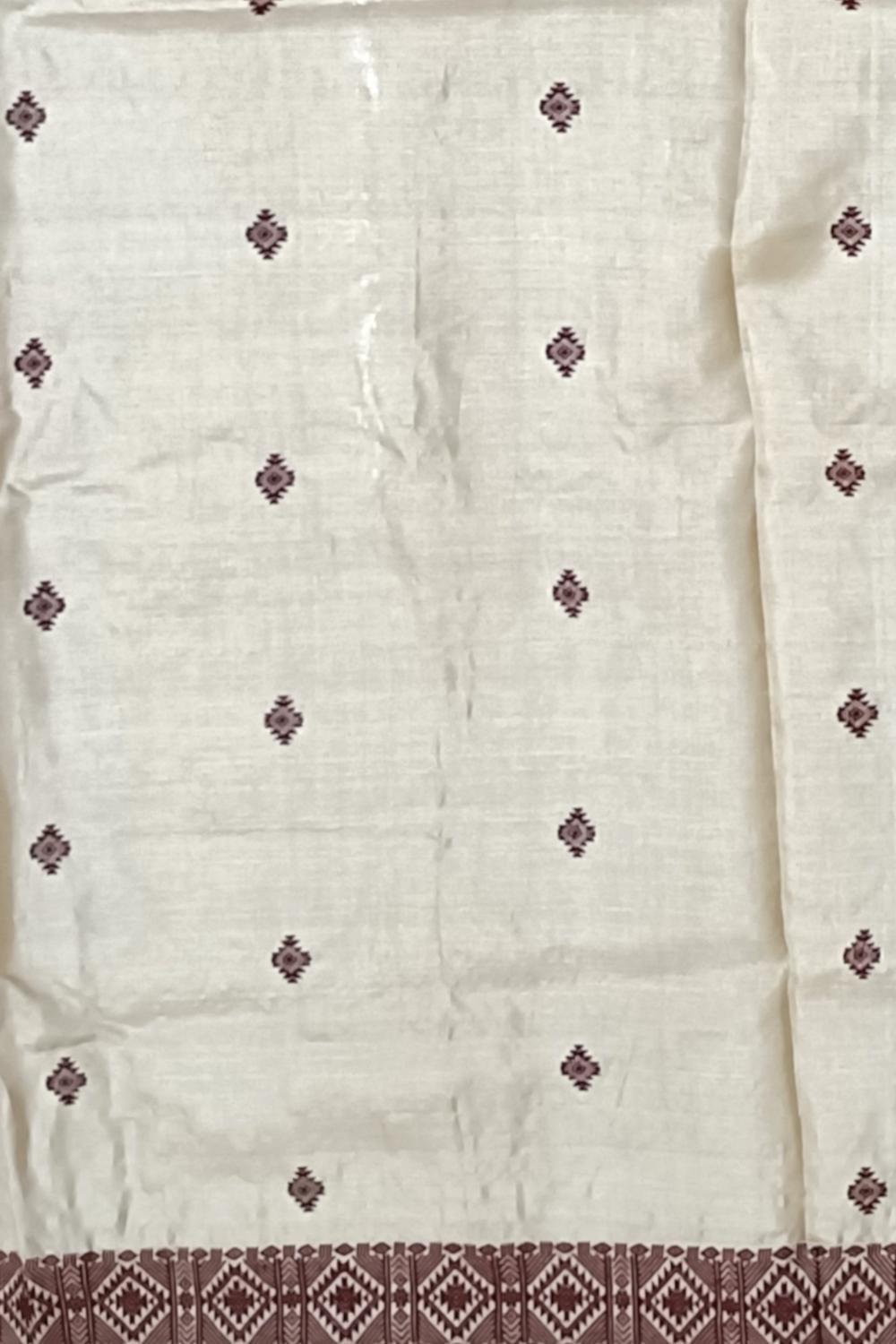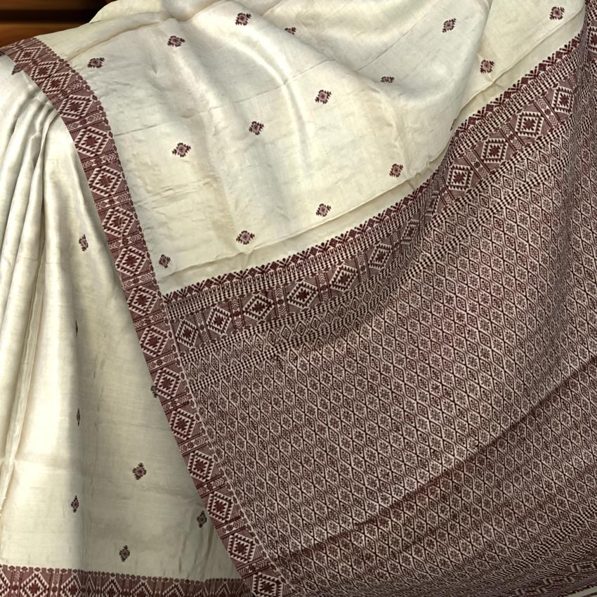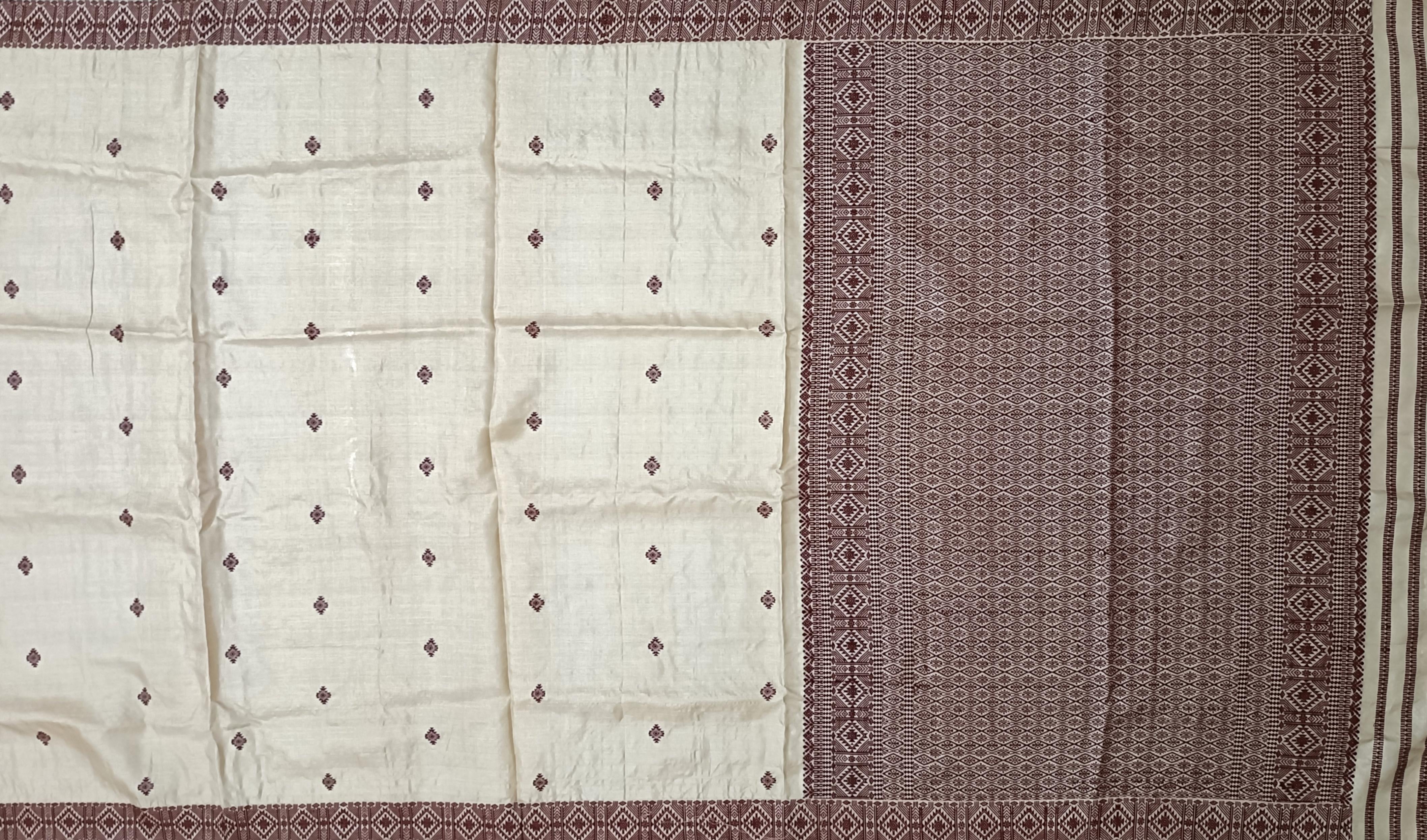 Indulge in the timeless charm of Assamese handloom with this beige Tussar saree. The body, adorned with elegant buttis and motifs, reflects the artistic legacy of skilled weavers from Assam. The rich maroon border and pallu create a perfect contrast, offering a sophisticated and versatile saree that blends tradition with modern elegance.