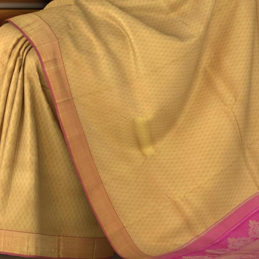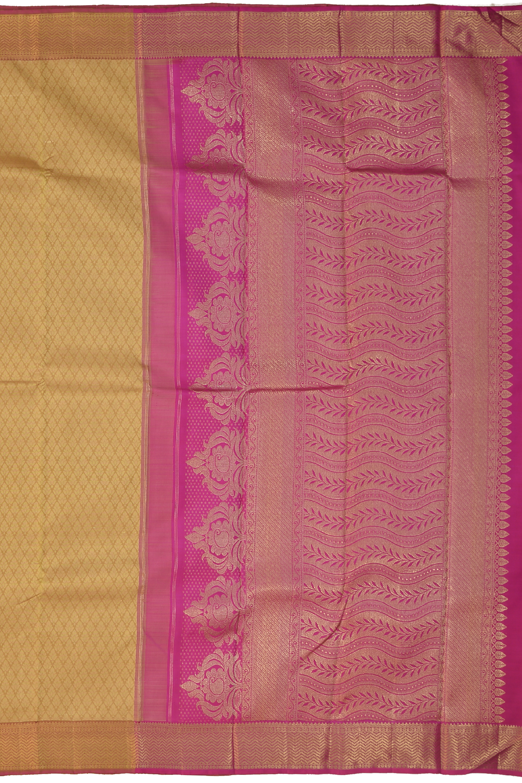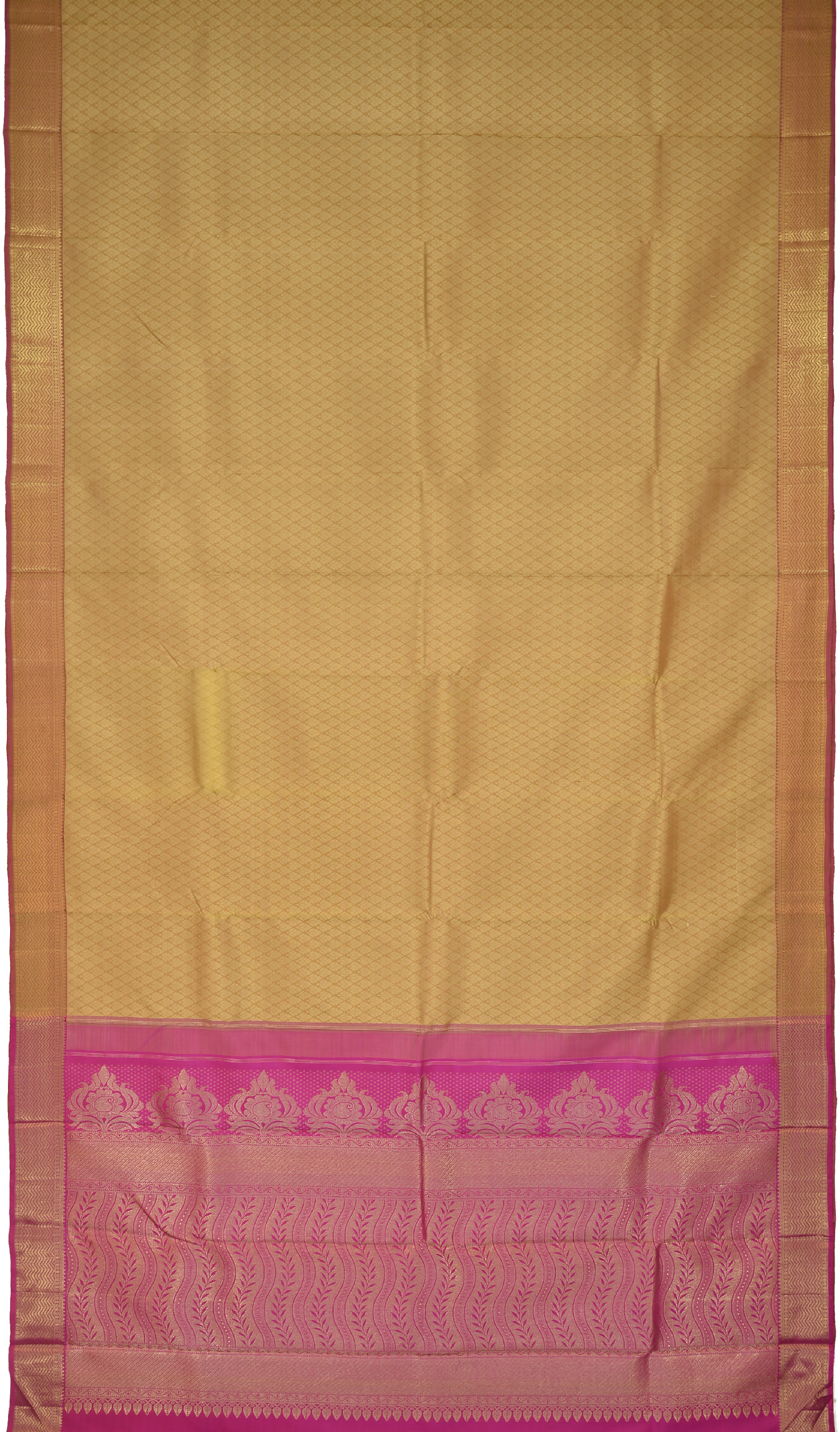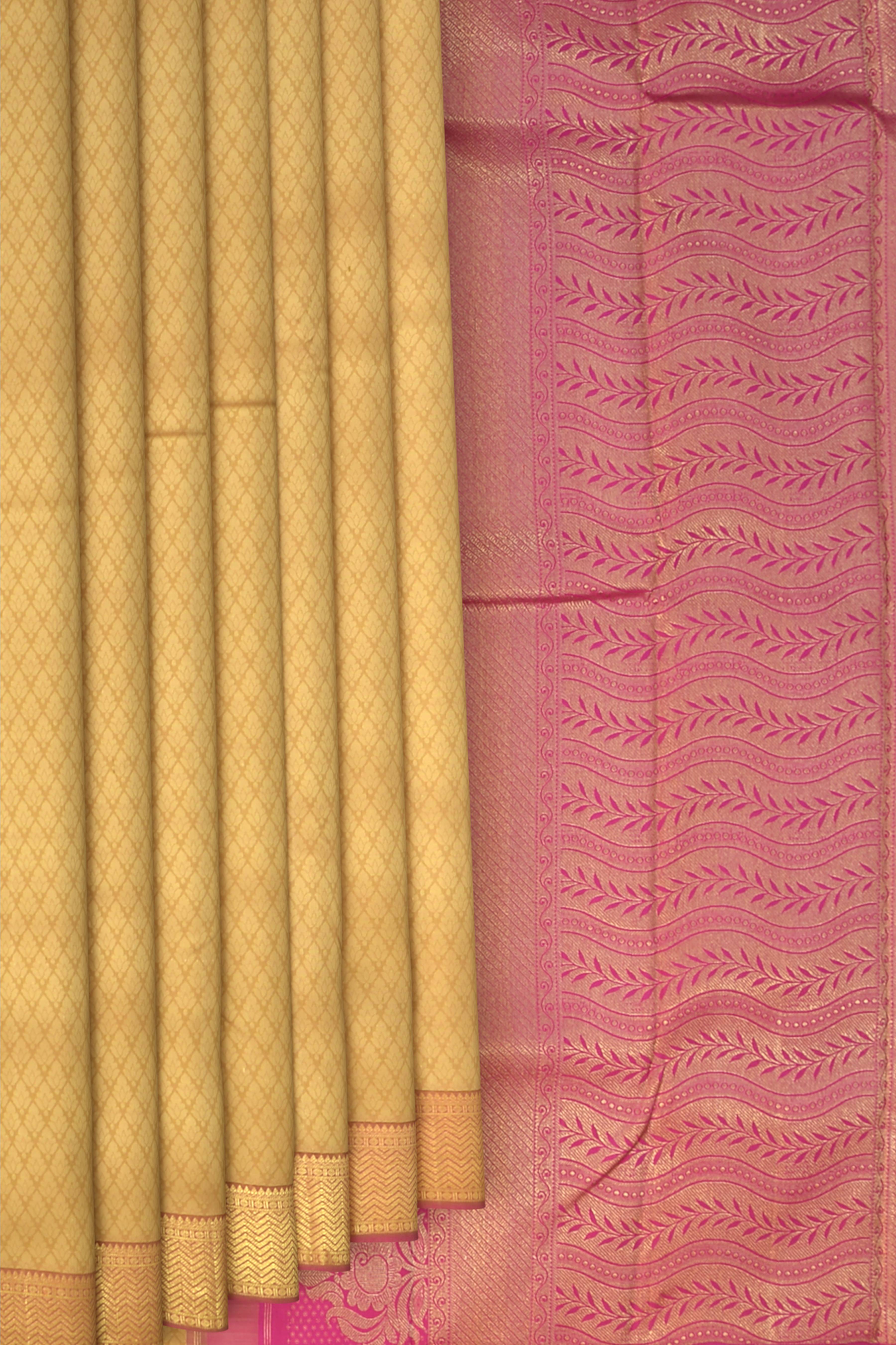Dive into the serene vastness of a sandy desert with this Beige Kanchipuram silk saree. The Jacquard woven body design brings intricate artistry to life, reminiscent of desert winds shaping the sands.