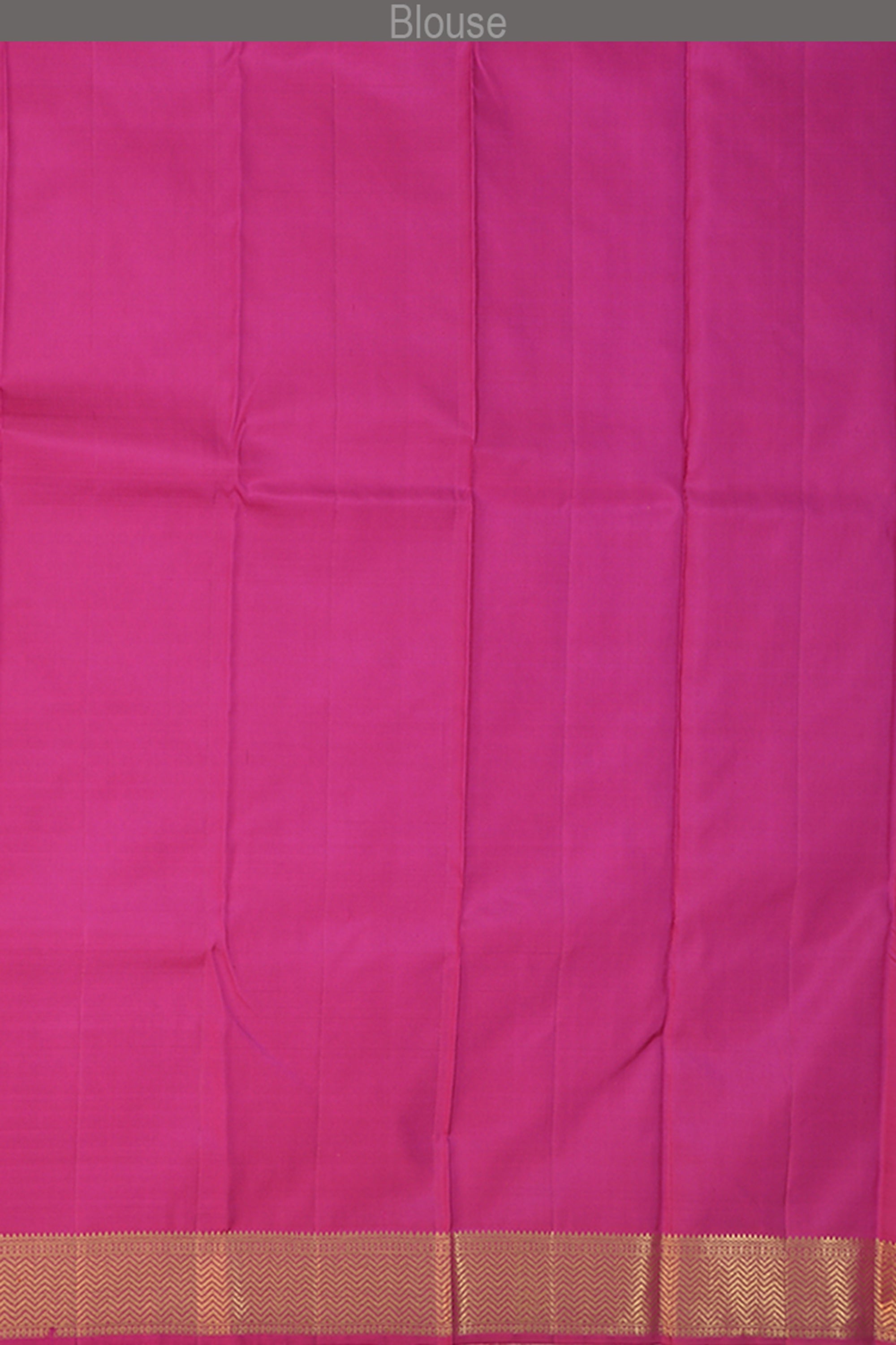The saree's uniqueness is further accentuated by its vibrant pink Zig Zag contrast border. The grandeur of the saree comes alive in its grand pink pallu, embroidered with an intricate floral motif and leaf patterns.