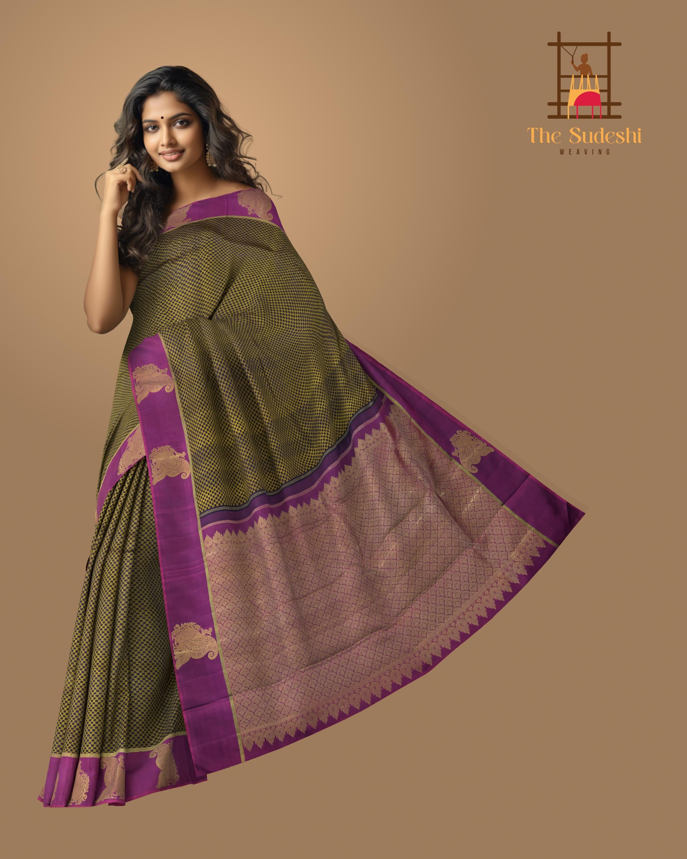 This black Kancheevaram silk saree stands as a beacon of elegance and sophistication. The jacquard weave with fine diamond design across the body sets a backdrop for the stunning large peacock motifs on the contrast purple border, a symbol of grace and beauty. The purple pallu, intricately designed, completes the saree’s majestic appearance, making it a piece of unparalleled beauty.