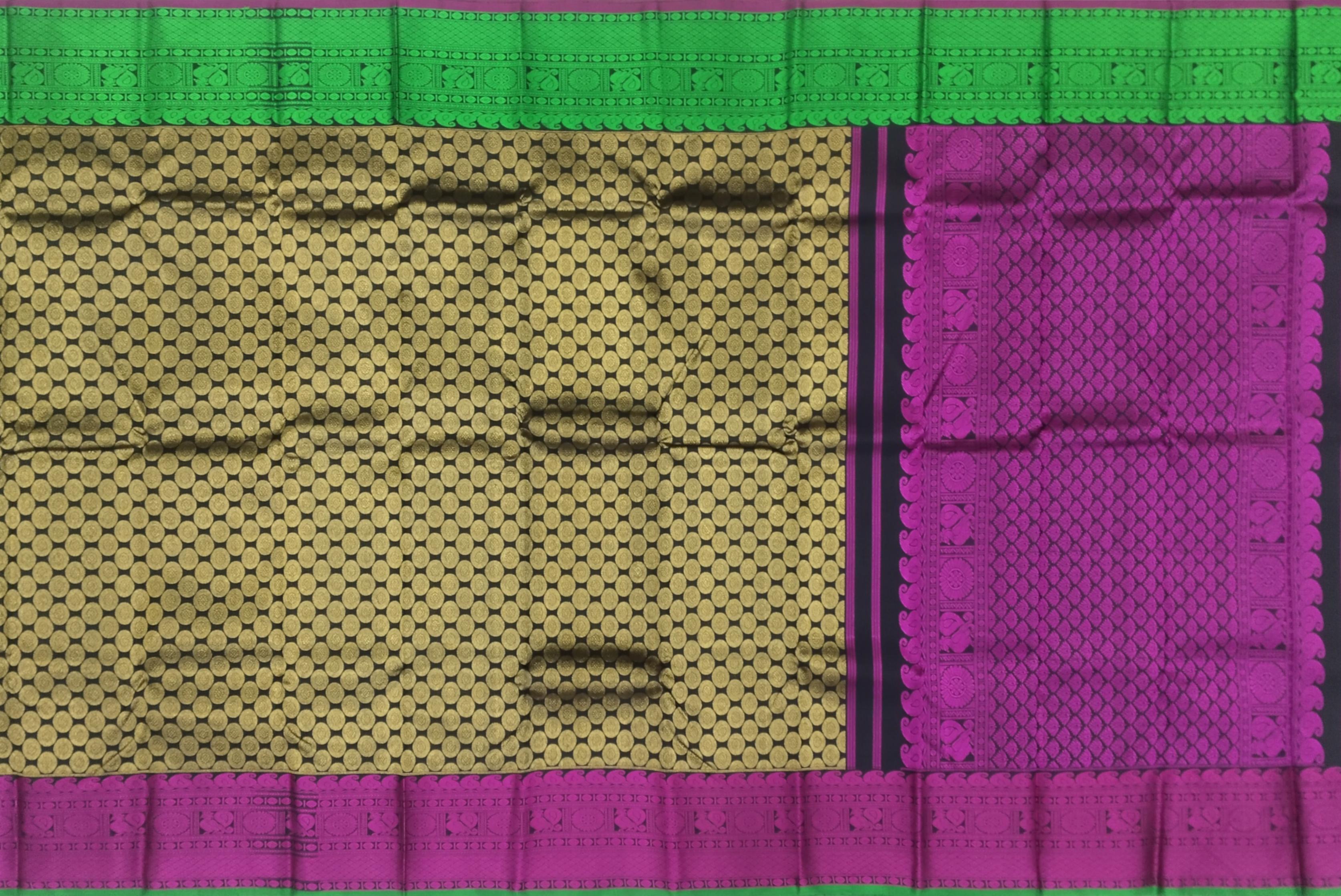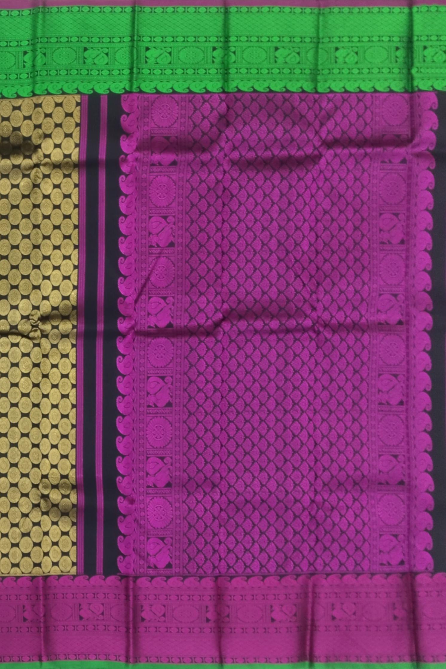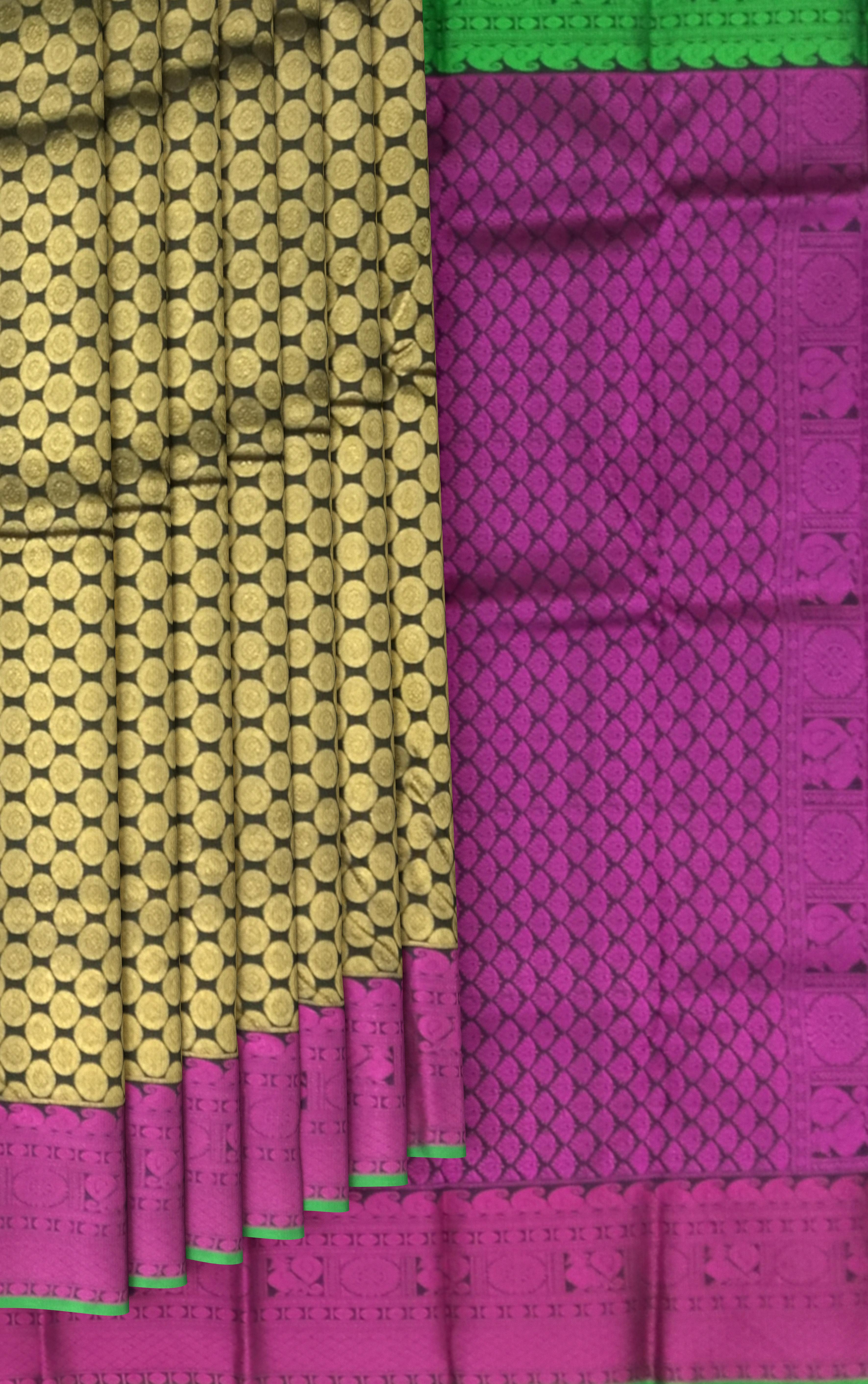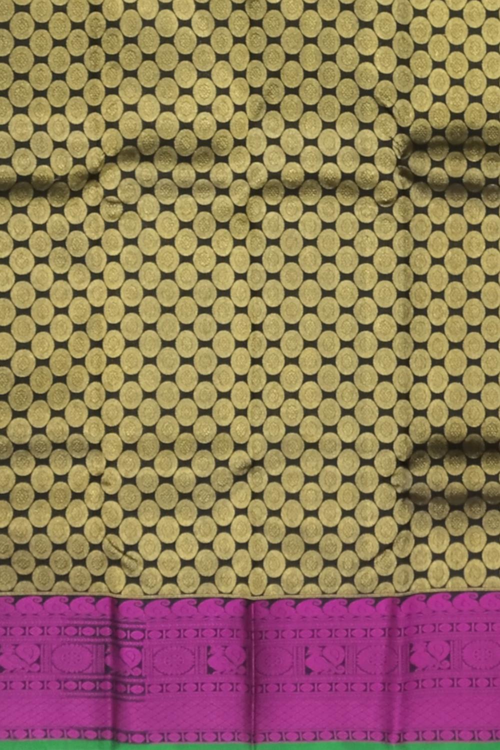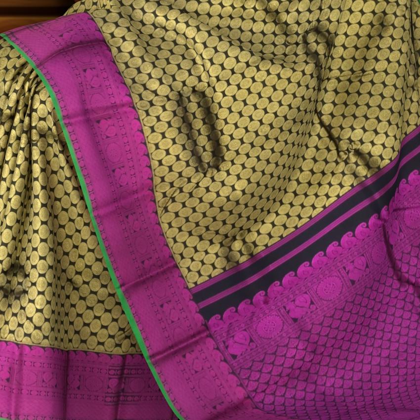 Bold and graceful, this black Kanchipuram silk saree features shimmering coin bhutta zari motifs scattered across the body, complemented by a rich pink threadwork border. The interplay of gold zari on the black silk base creates a dramatic and festive effect, while the border adds a hint of vibrant charm.