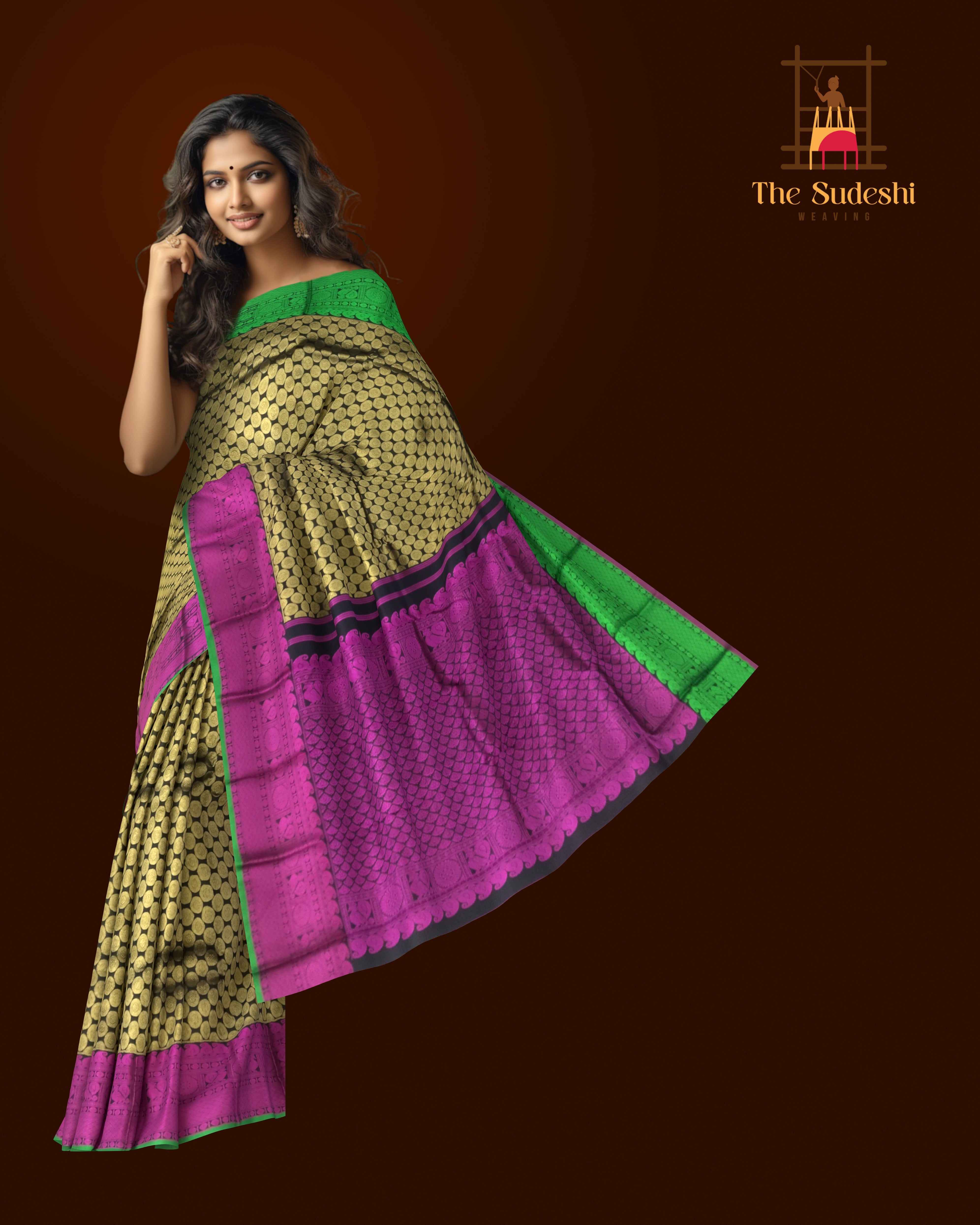 Coin bhutta motifs, often symbolizing wealth and auspiciousness, have long been an essential element in traditional South Indian sarees. Woven by master artisans in Kanchipuram, this saree combines classic symbolism with modern style, creating a piece that is as meaningful as it is eye-catching.