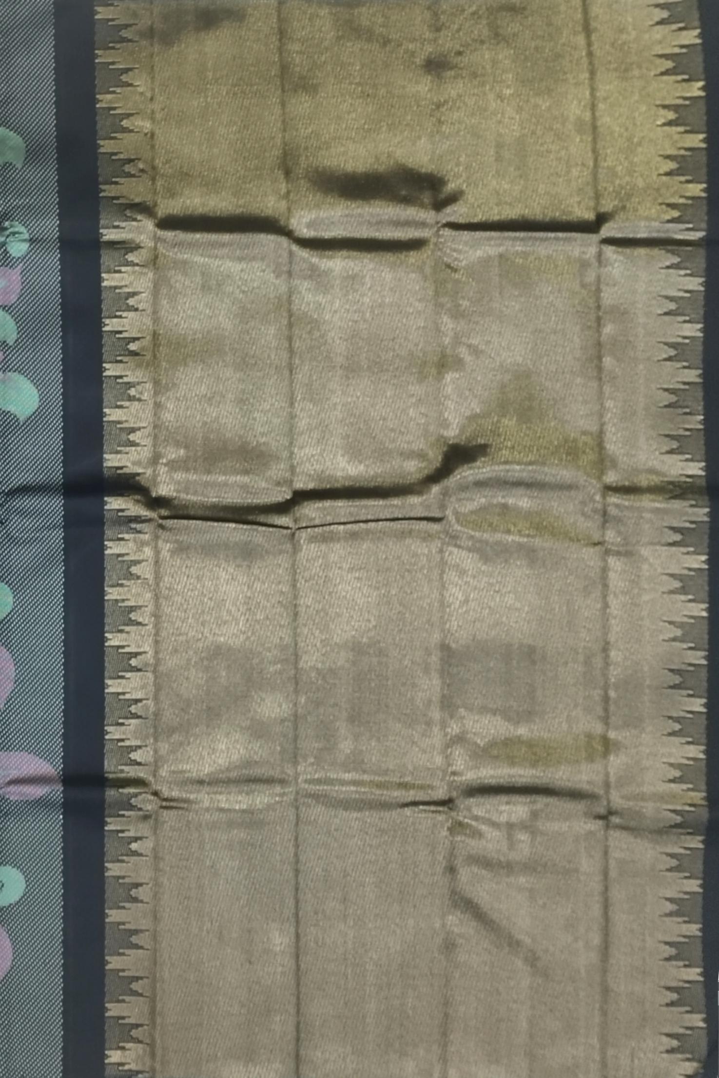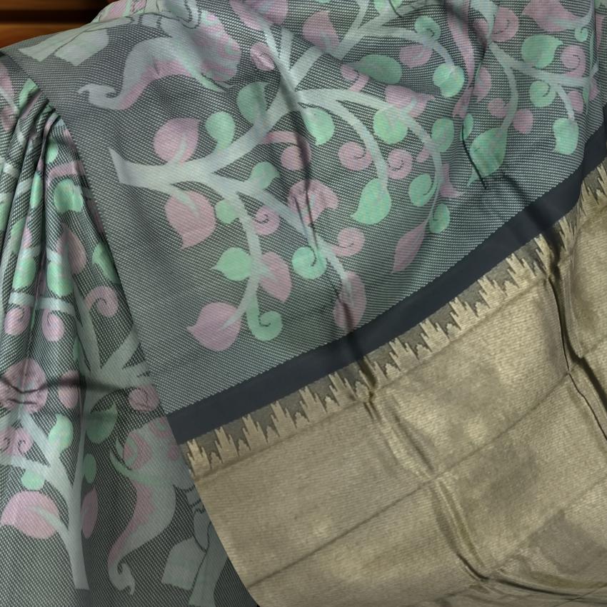 The absence of a traditional border allows the pattern to flow seamlessly, enhancing the richness of the weave. Crafted in Kanchipuram, the jacquard technique used here adds depth, elegance, and a contemporary touch to a culturally rich design.