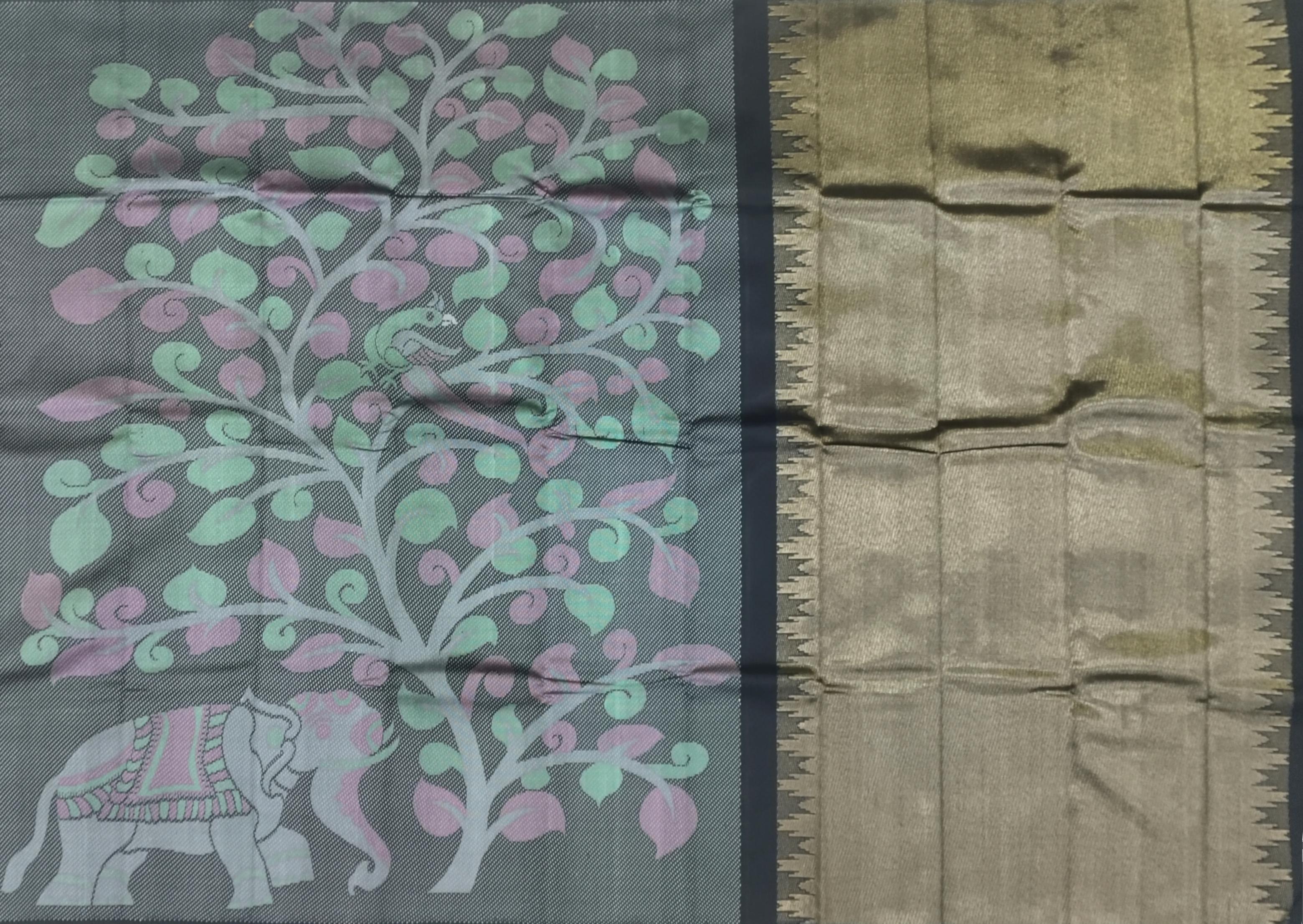 A celebration of artistry and symbolism, this black borderless Kanchipuram silk saree features a stunning jacquard weave of elephants and trees throughout the body. The motifs are intricately designed to evoke themes of strength, growth, and nature’s balance—making this saree both stylish and spiritually resonant.
