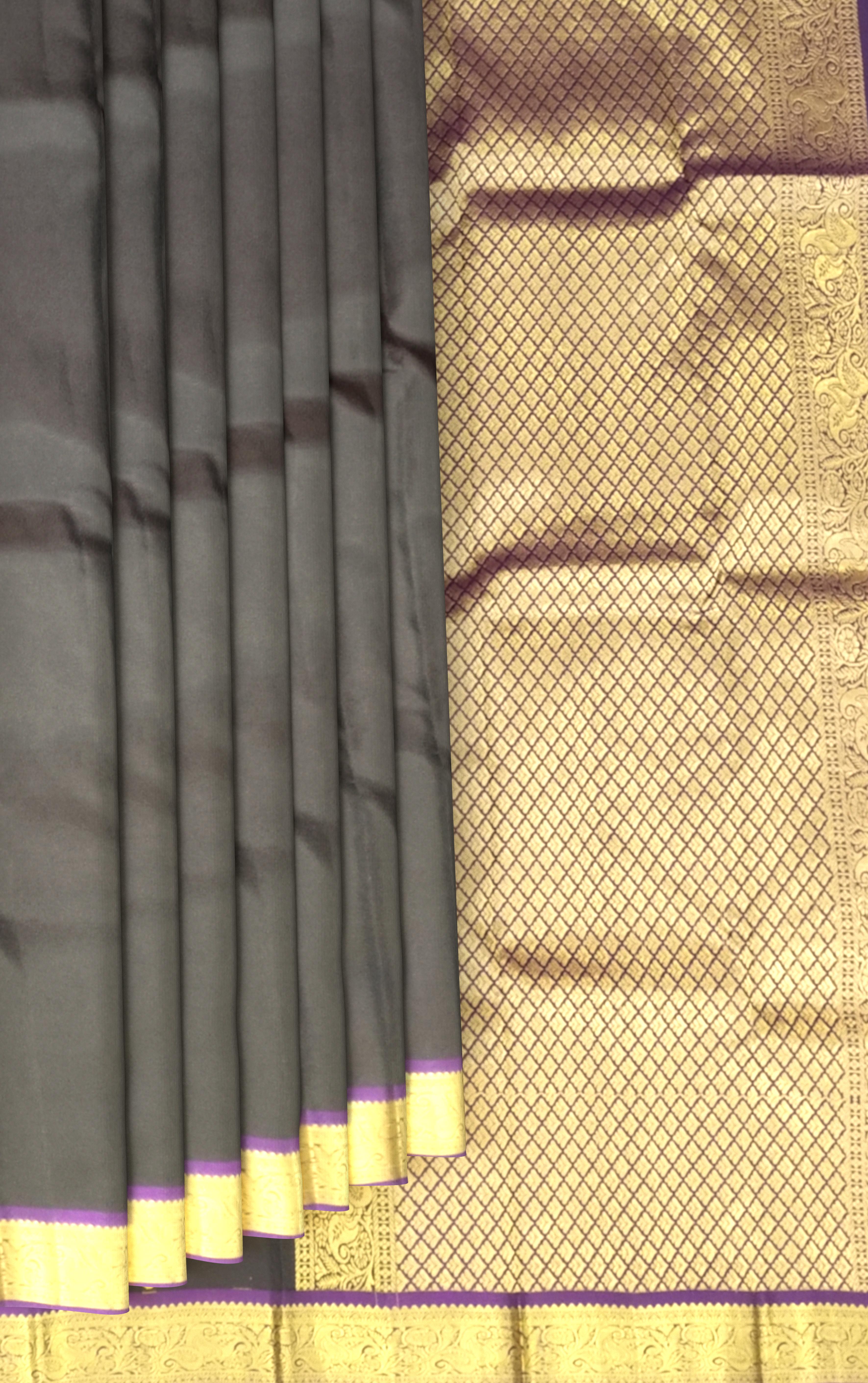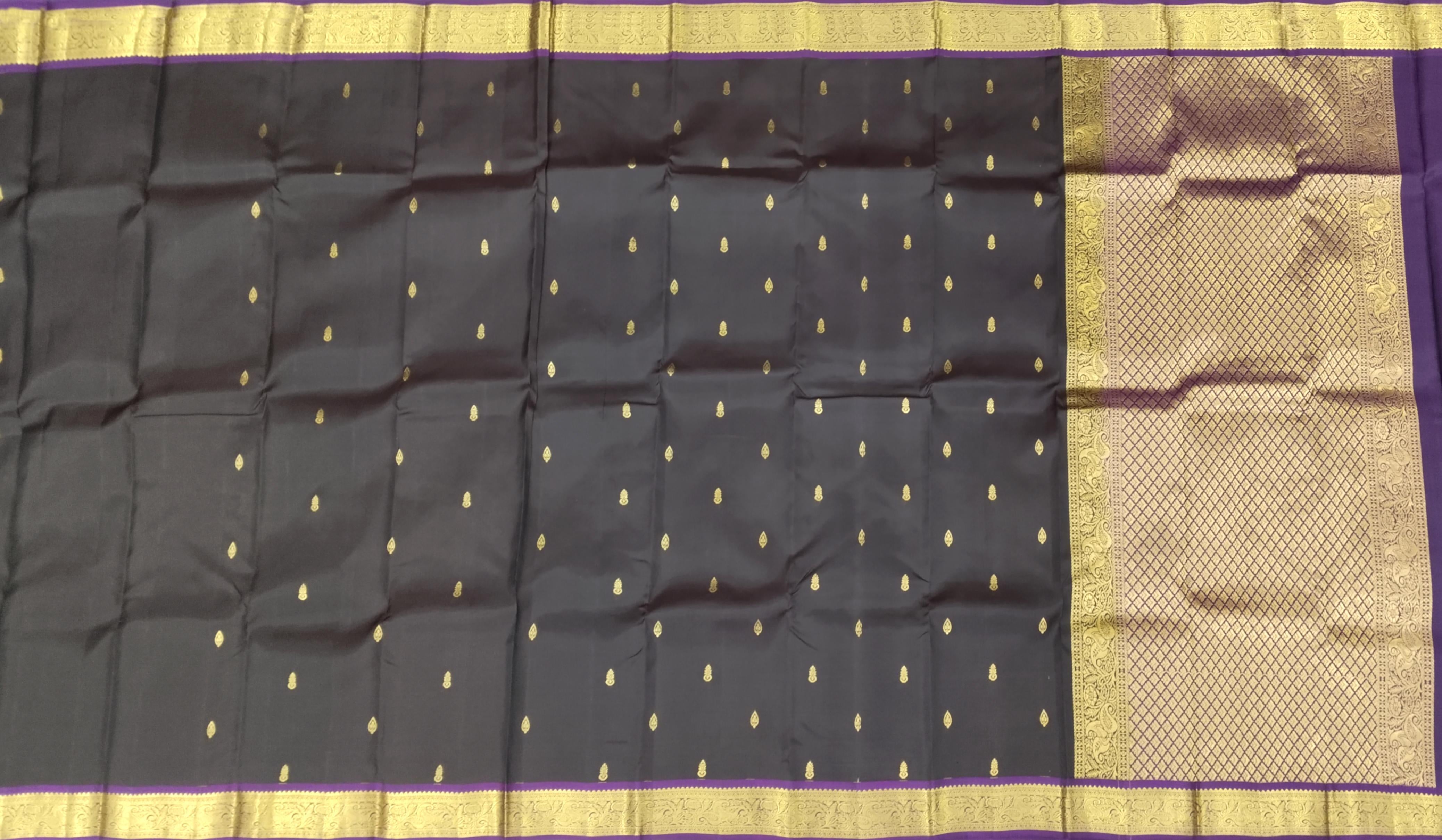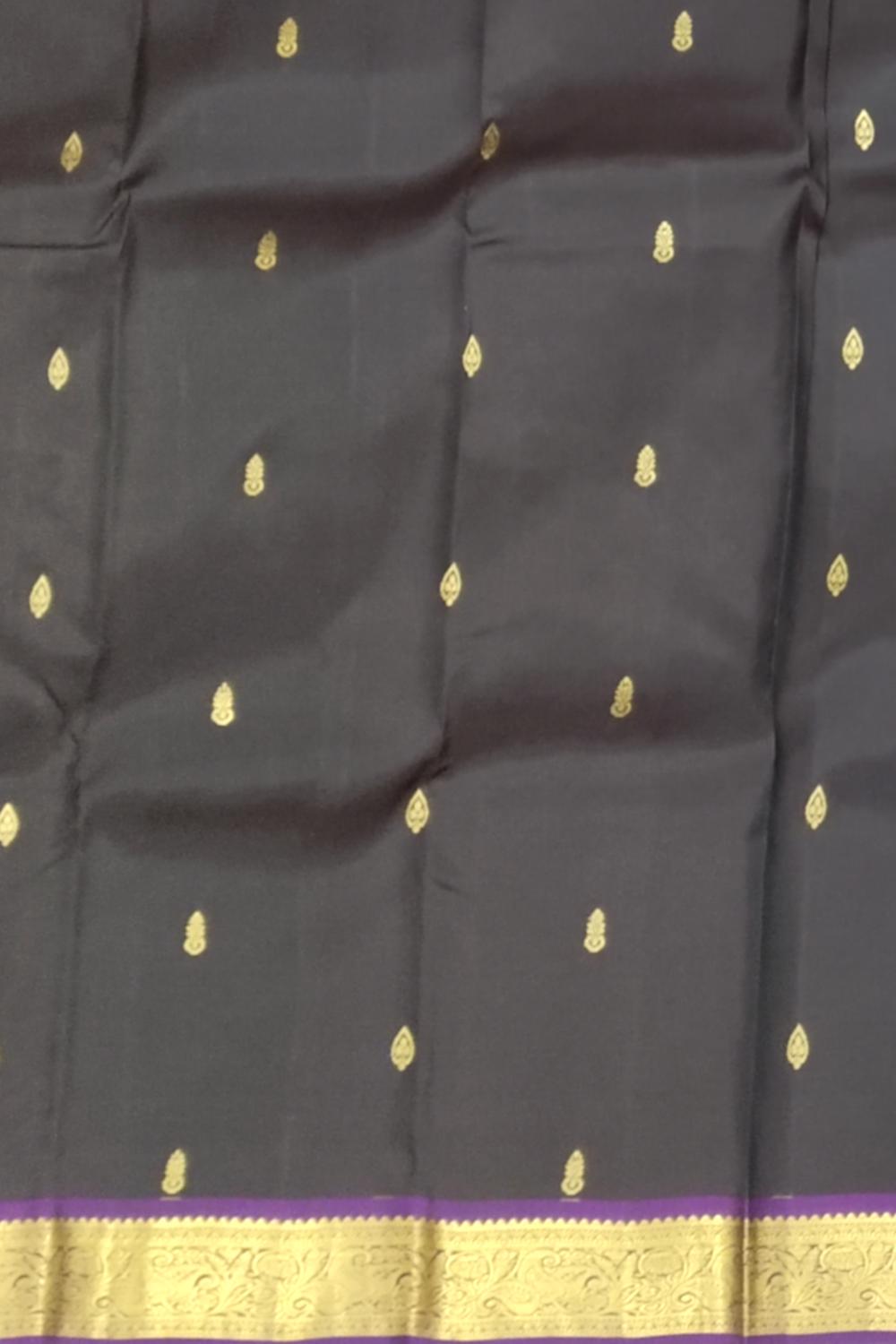 Bold and timeless, this Black Kanchipuram Silk Saree is beautifully accentuated with small buttas and a striking purple border and pallu. The dark base enhances the lustrous sheen of pure silk, while the rich purple tones lend a touch of royal sophistication. This saree perfectly embodies power, poise, and grace. Each Kanchipuram silk saree is handwoven with finesse using pure mulberry silk, celebrated for its strength, sheen, and long-lasting elegance. The artistry of these sarees continues to represent South India’s rich weaving tradition. This versatile saree pairs wonderfully with a purple blouse. Accessorize with gold or diamond jewellery and statement earrings to complete your bold yet classic festive look. Note: The appearance of the product’s colors may vary due to lighting conditions or your device’s screen calibration. For further assistance or additional images/videos, feel free to contact us at +91 97897 60367 or email at wecare@thesudeshiweaving.com.