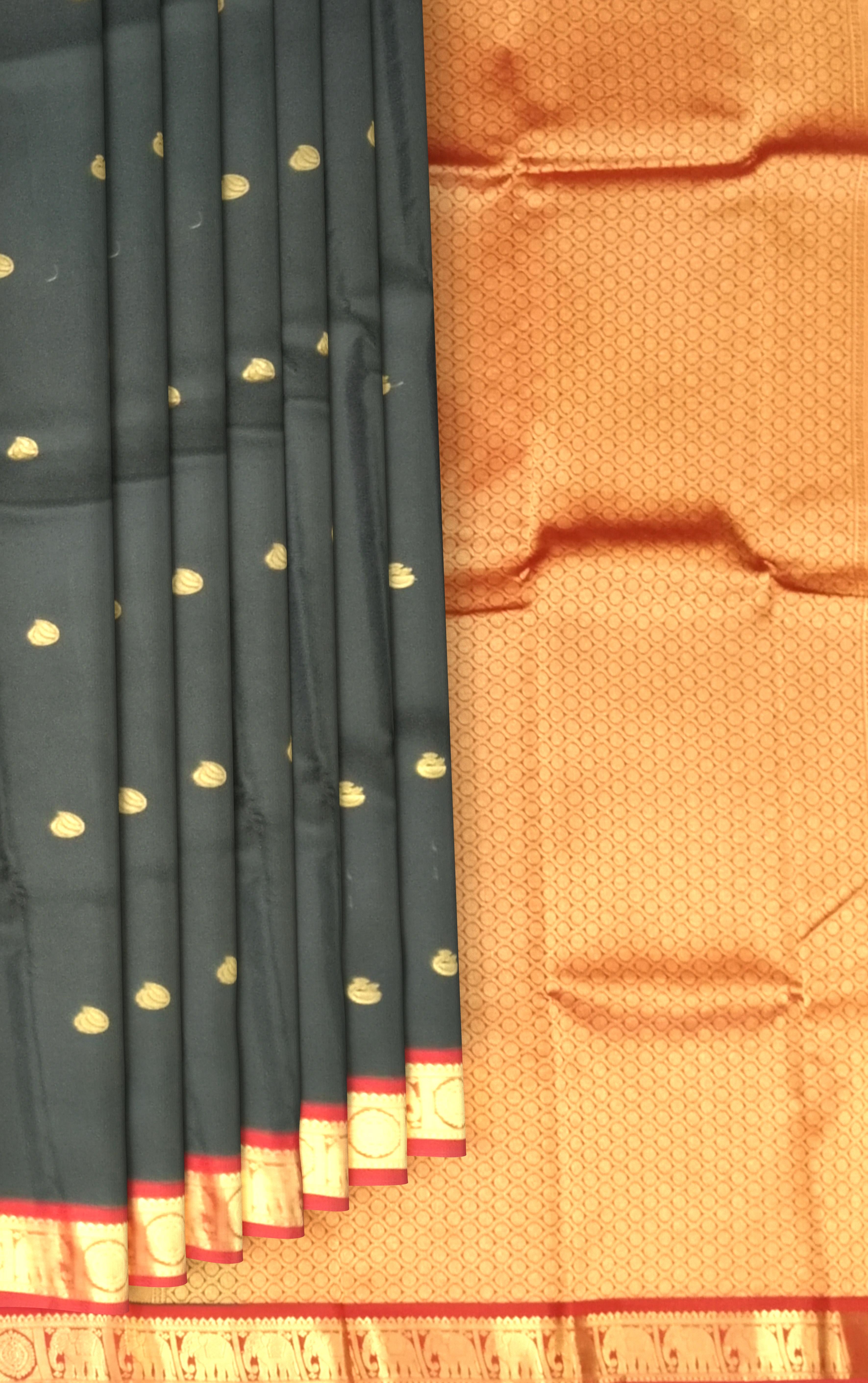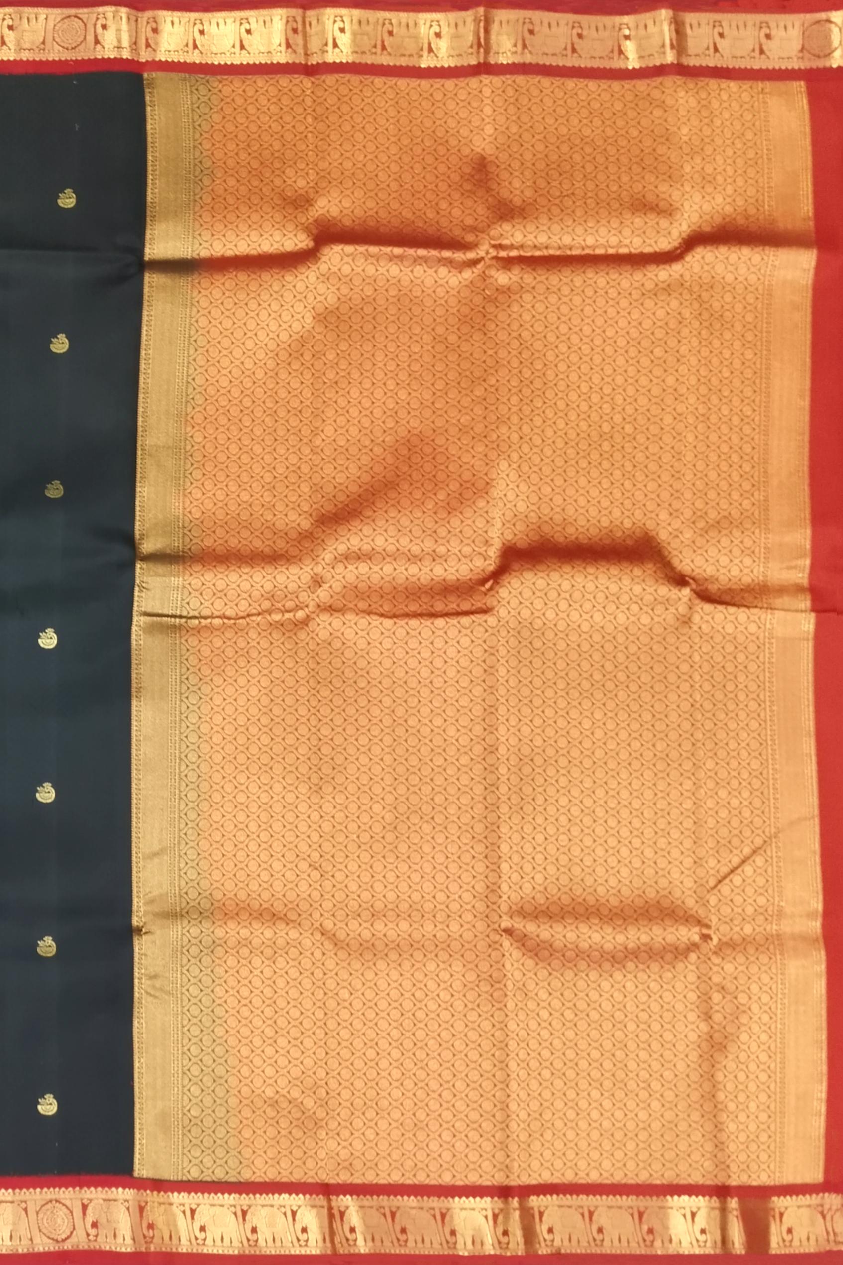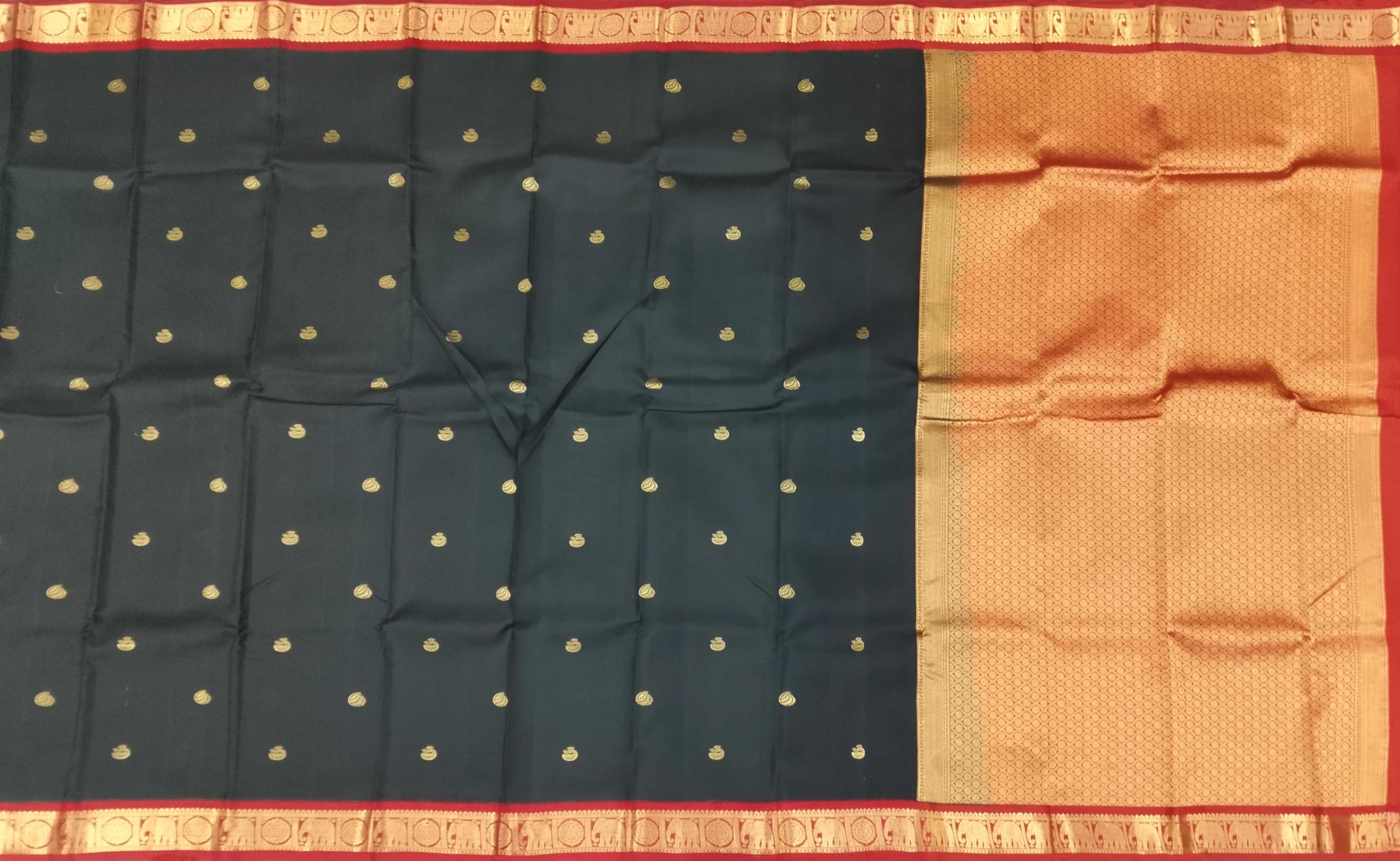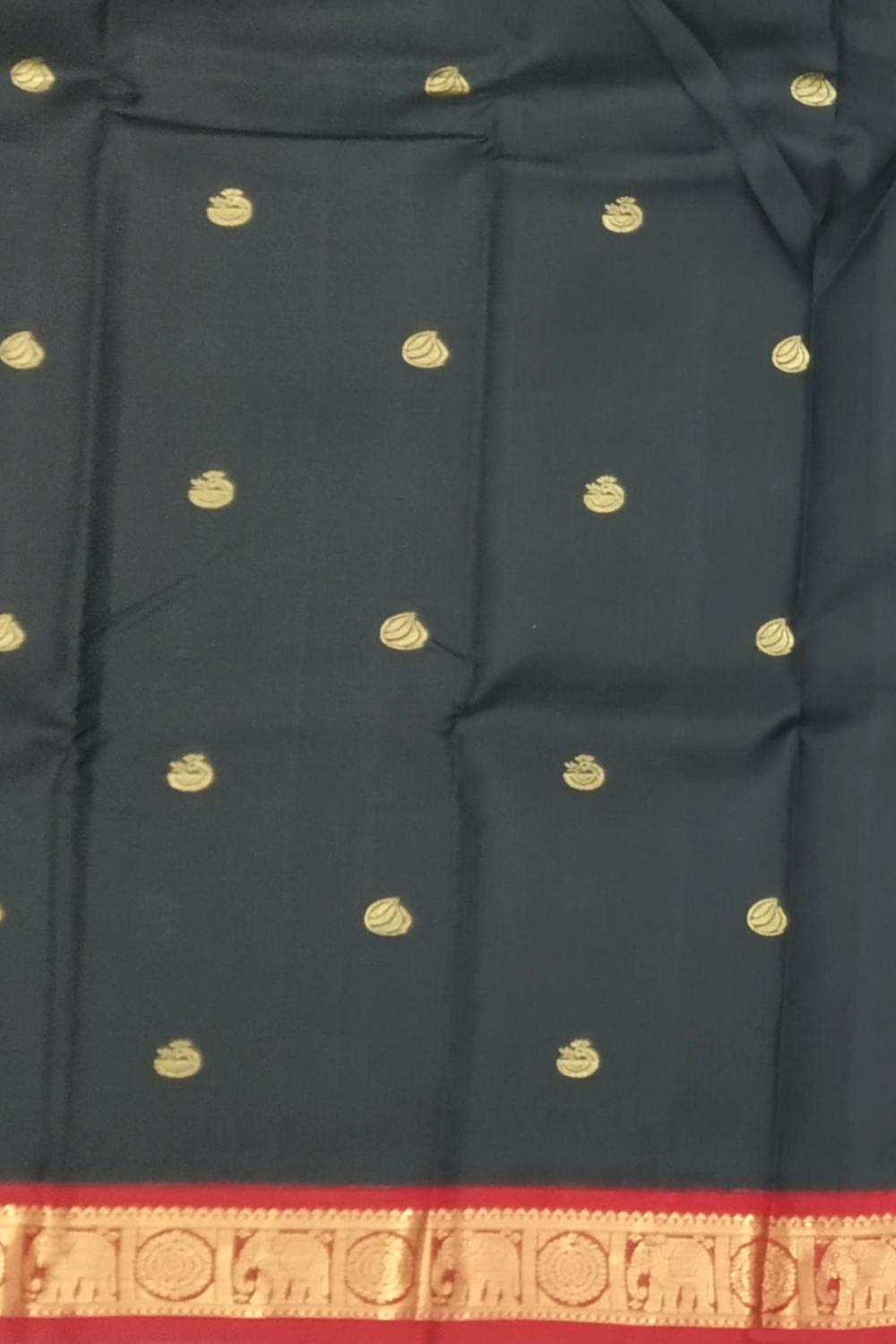 Command attention in this Black Kanchipuram Silk Saree featuring intricate tear-shaped small buttas woven across the body. The deep black tone exudes confidence and poise, while the contrasting red border and pallu add a bold, festive charm. The luminous sheen of pure silk highlights the saree’s texture, creating an enchanting blend of tradition and elegance. Woven from premium mulberry silk, Kanchipuram sarees are renowned for their durability and luxurious drape. Each weave reflects centuries of artistic legacy, symbolizing the perfect balance of culture, craftsmanship, and timeless beauty. Ideal for evening functions, festive celebrations, or traditional events, this saree pairs beautifully with a matching red blouse. Accessorize with antique gold or kundan jewellery and finish your look with a statement clutch for an elegant finish. Note: The appearance of the product’s colors may vary due to lighting conditions or your device’s screen calibration. For further assistance or additional images/videos, feel free to contact us at +91 97897 60367 or email at wecare@thesudeshiweaving.com.
