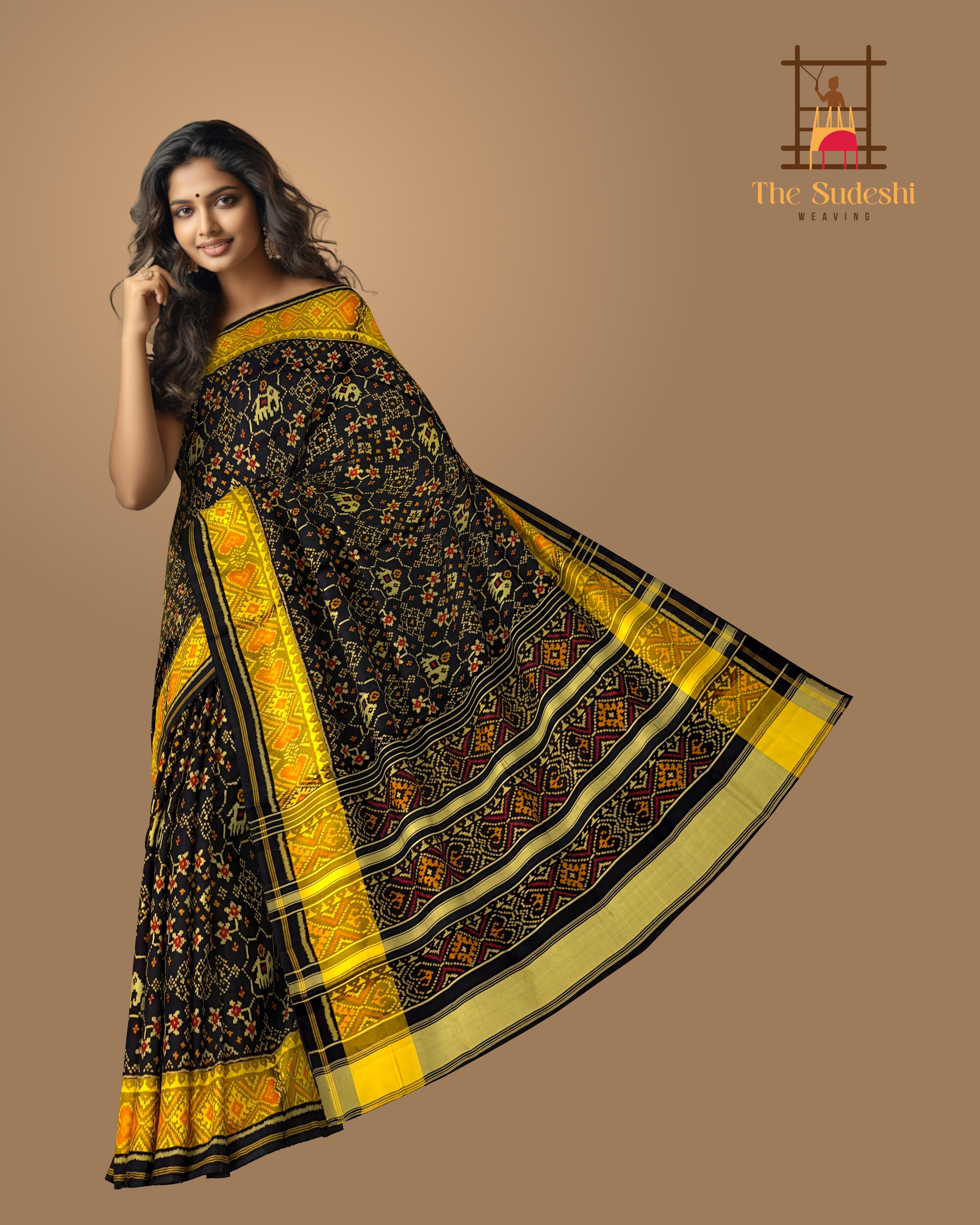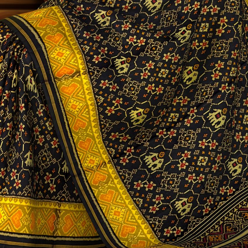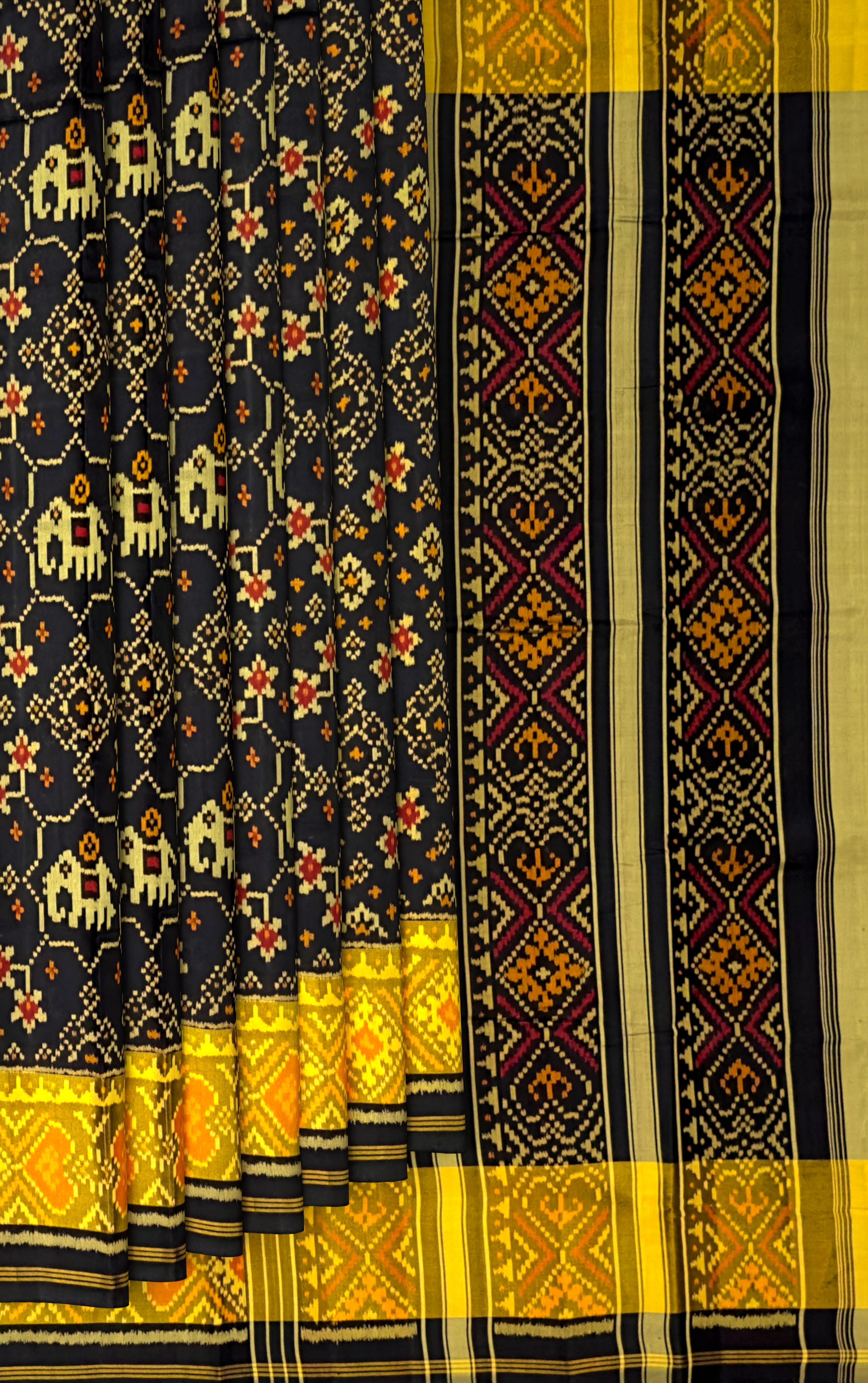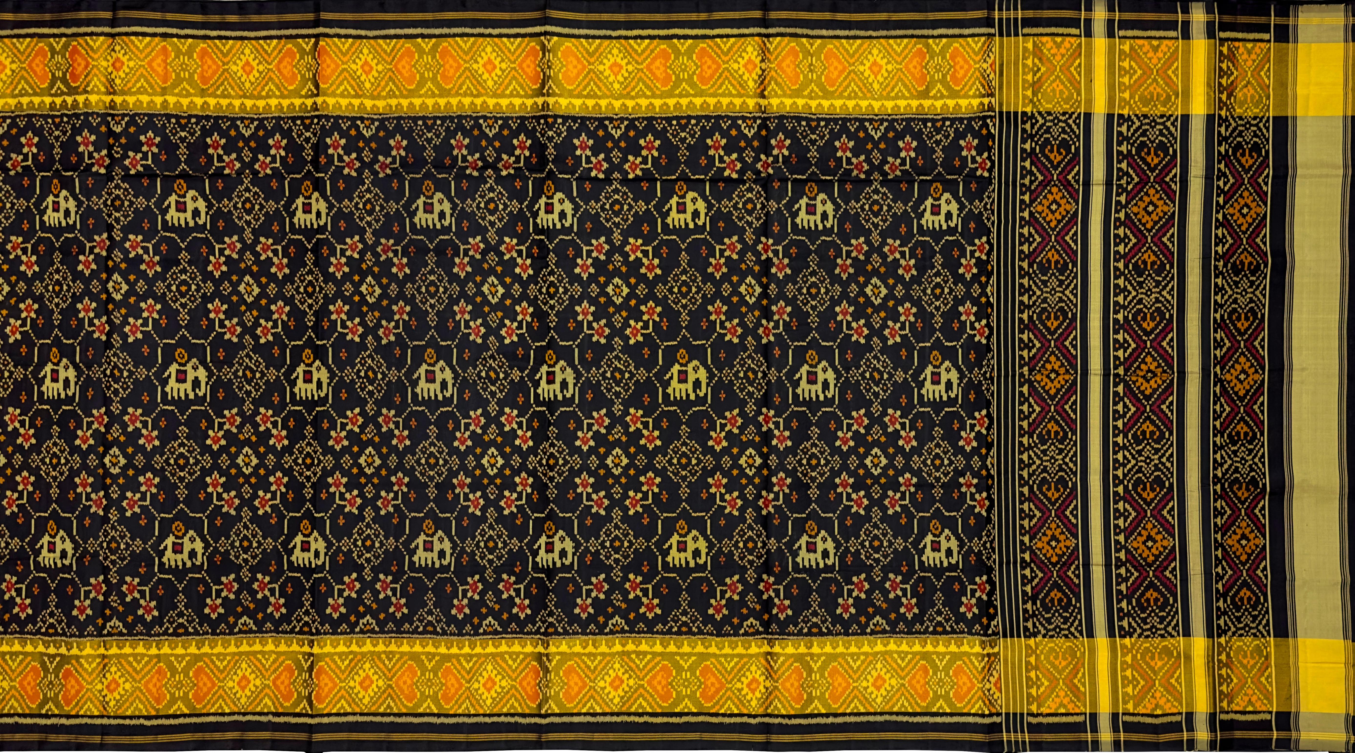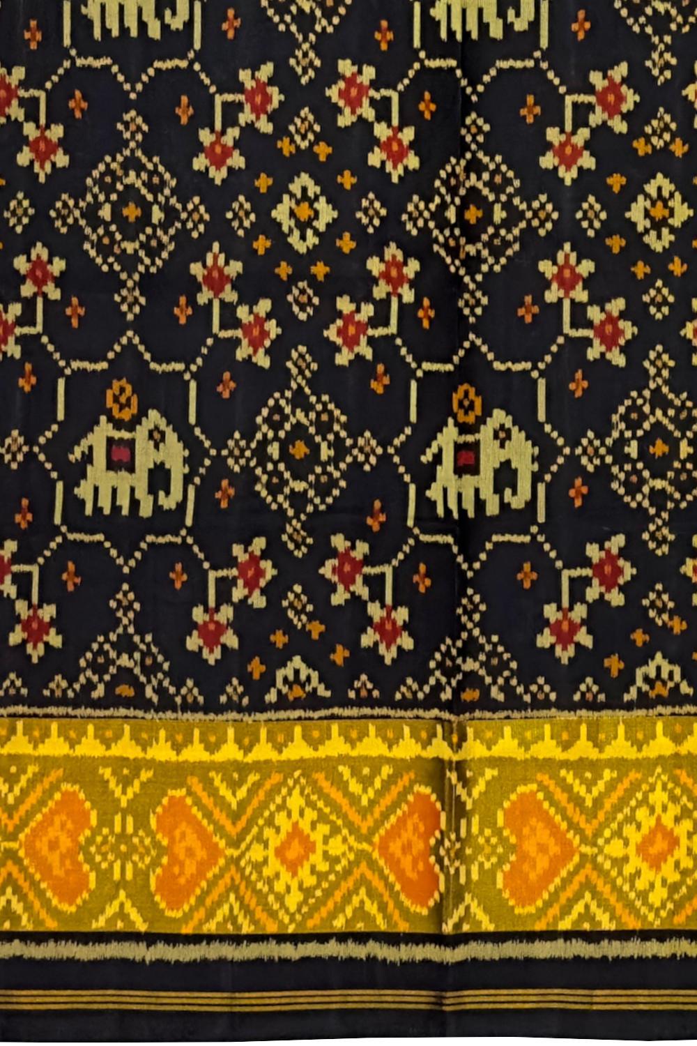 Elevate your ethnic wardrobe with the Black Navratna + Hathi Border Pallu Chelari Single Ikat Rajkot Patola Saree. The deep black hue, accentuated by the vibrant Navratna and Hathi motifs, creates a striking contrast that is both bold and elegant. The detailed border and pallu designs make this saree a true masterpiece of Indian textile art.