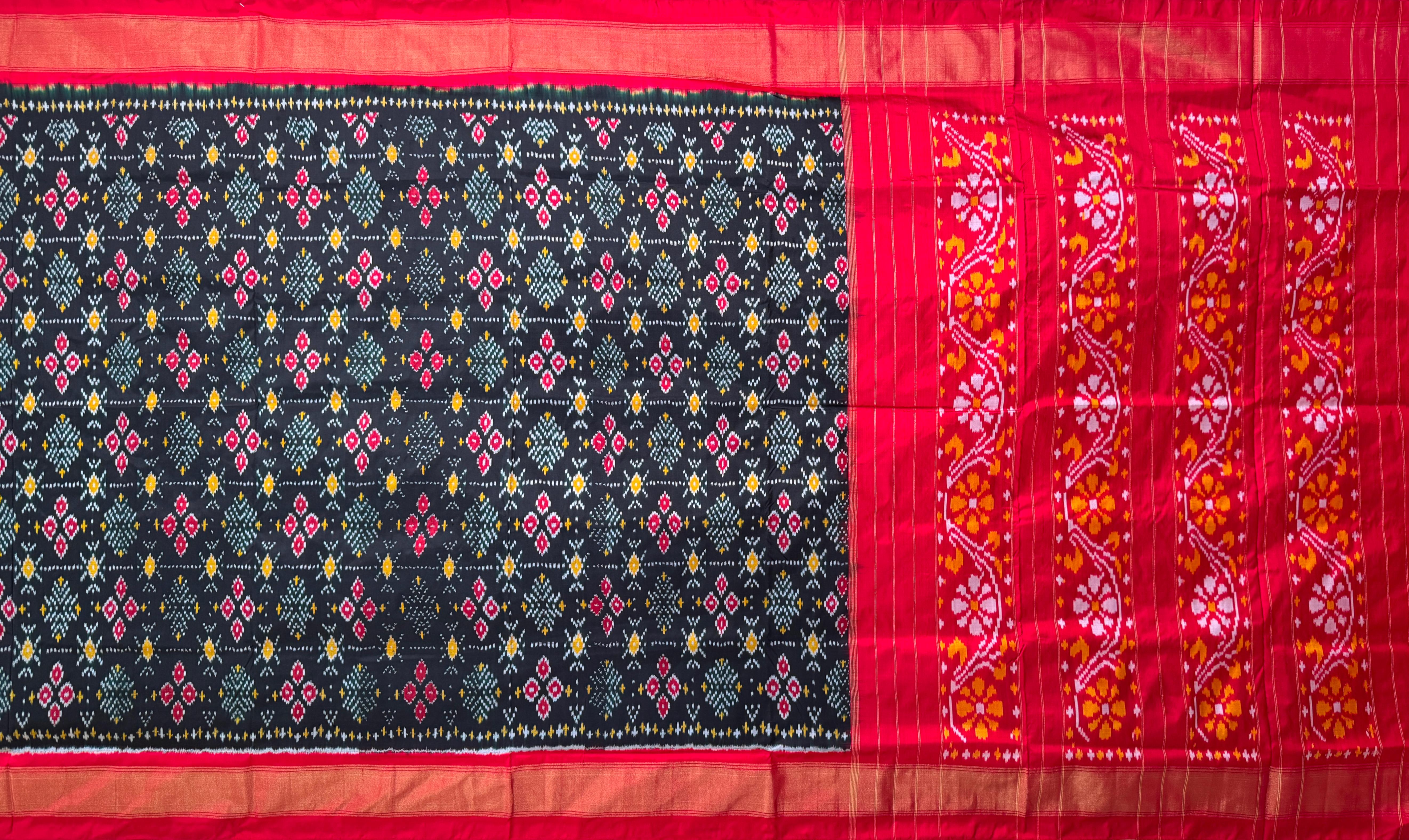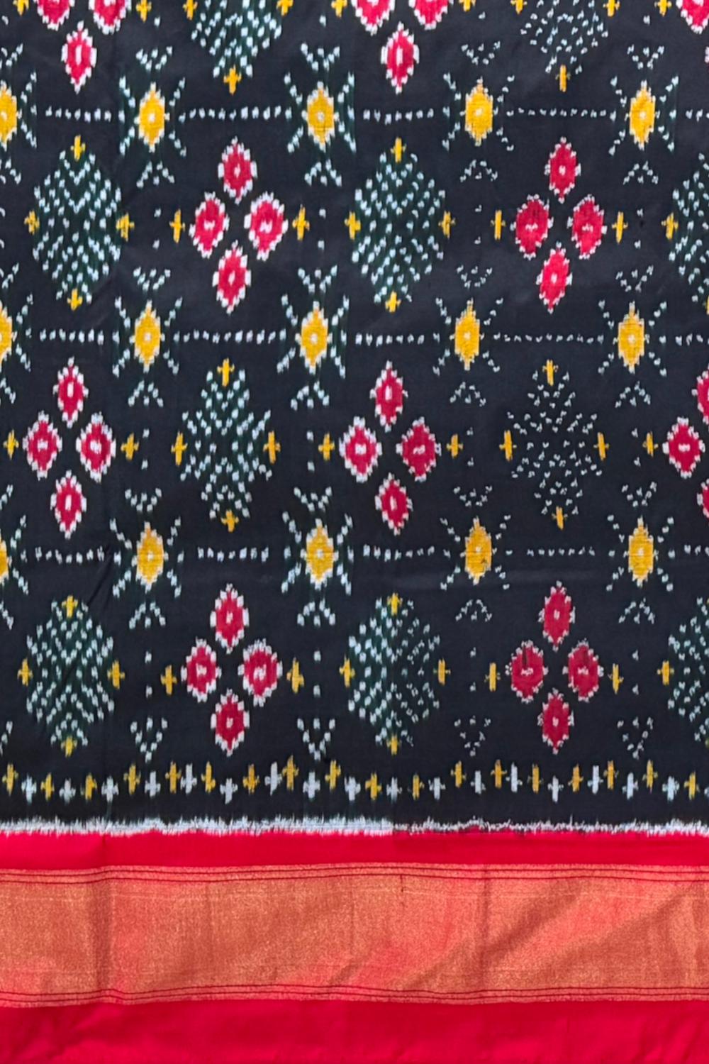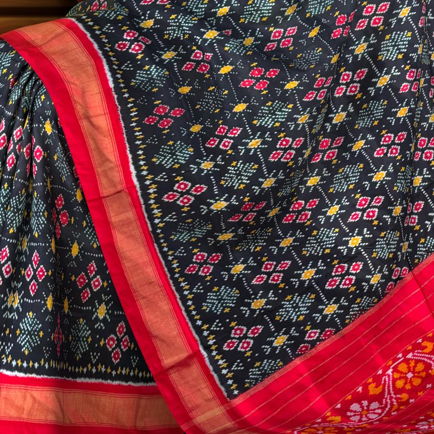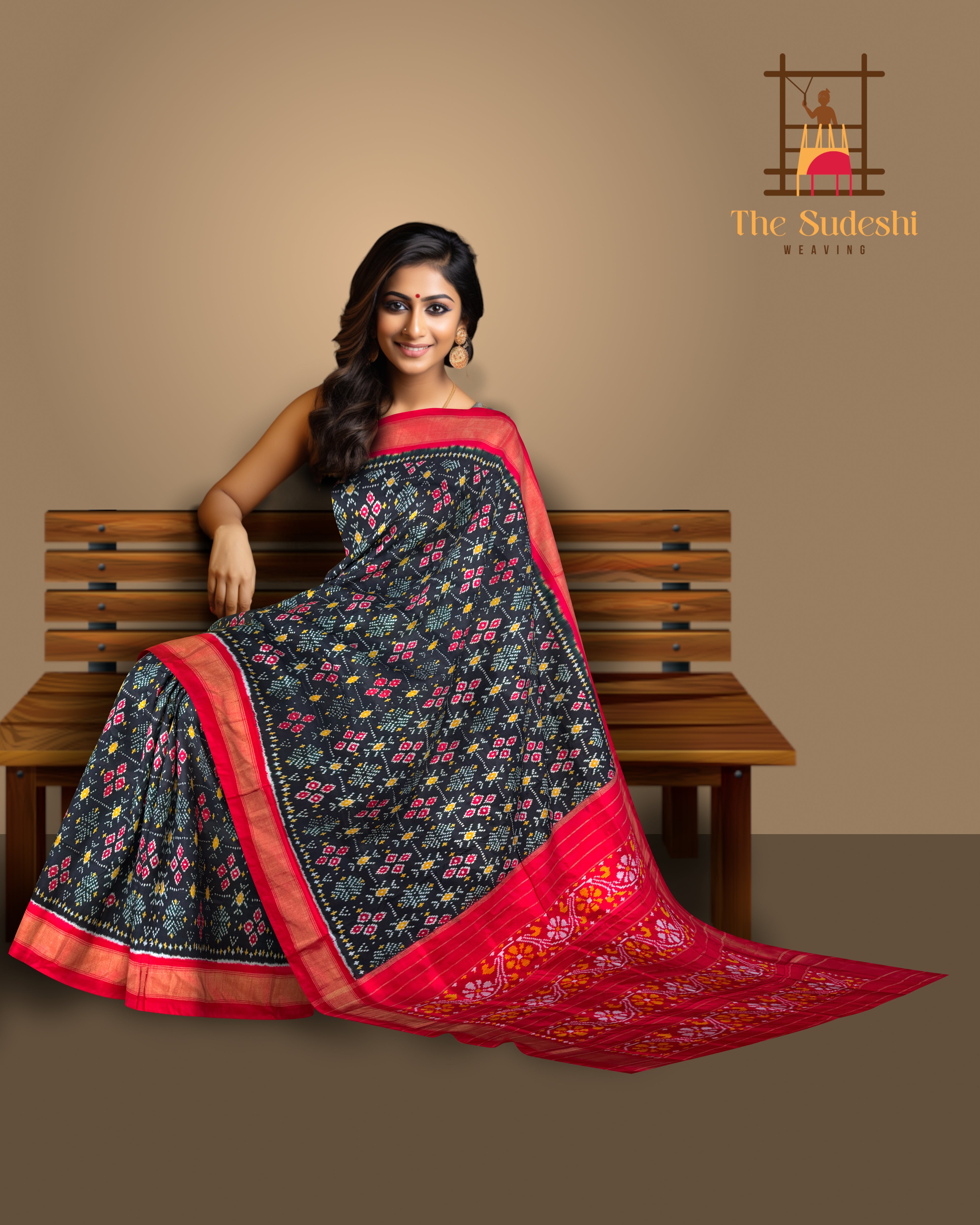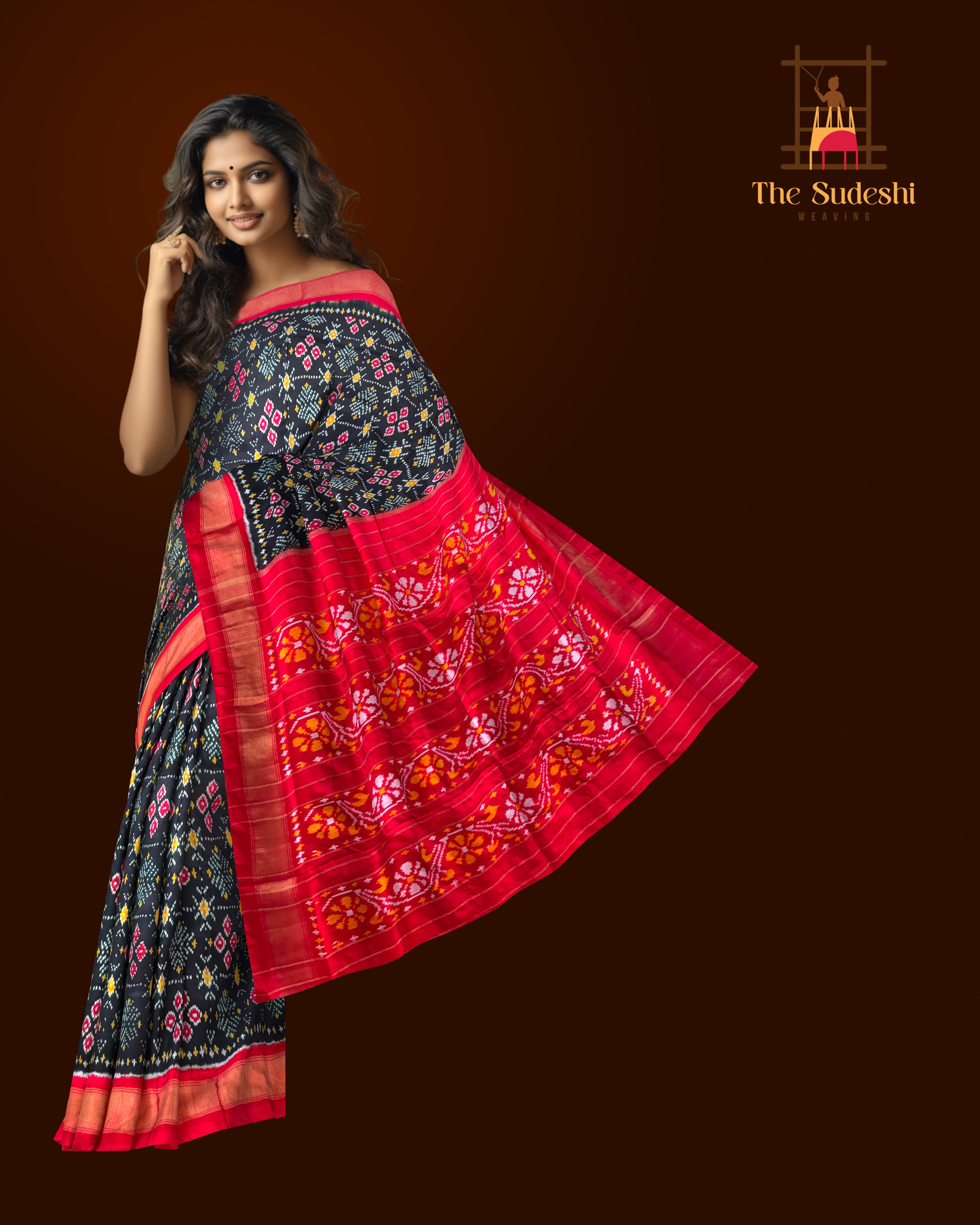 Bold, timeless, and effortlessly elegant — the Black Pochampally Ikat Saree with its striking red border and pallu is a showstopper. The deep black body symbolizes power and sophistication, while the vibrant red details infuse the saree with festive grandeur. This powerful color pairing makes it an ideal choice for making a confident statement. Originating from the historic looms of Pochampally in Telangana, these sarees are crafted using the double ikat technique, where both warp and weft threads are pre-dyed in intricate patterns. The resulting designs often embody themes of strength, continuity, and cultural heritage, with the black-red duo representing power and celebration. Perfect for weddings, receptions, and evening parties, this saree pairs beautifully with a red or gold blouse. Complement the ensemble with gold jewelry, statement bangles, and a classic updo for a regal traditional look. Note: The appearance of the product’s colors may vary due to lighting conditions or your device’s screen calibration. For further assistance or additional images/videos, feel free to contact us at +91 97897 60367 / +1 (945) 308-5962 or email at wecare@thesudeshiweaving.com.