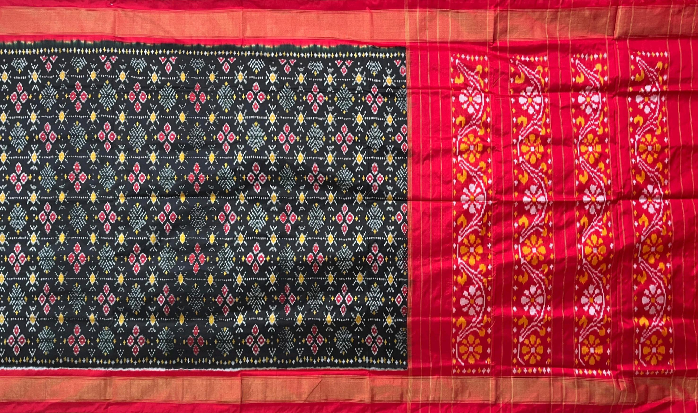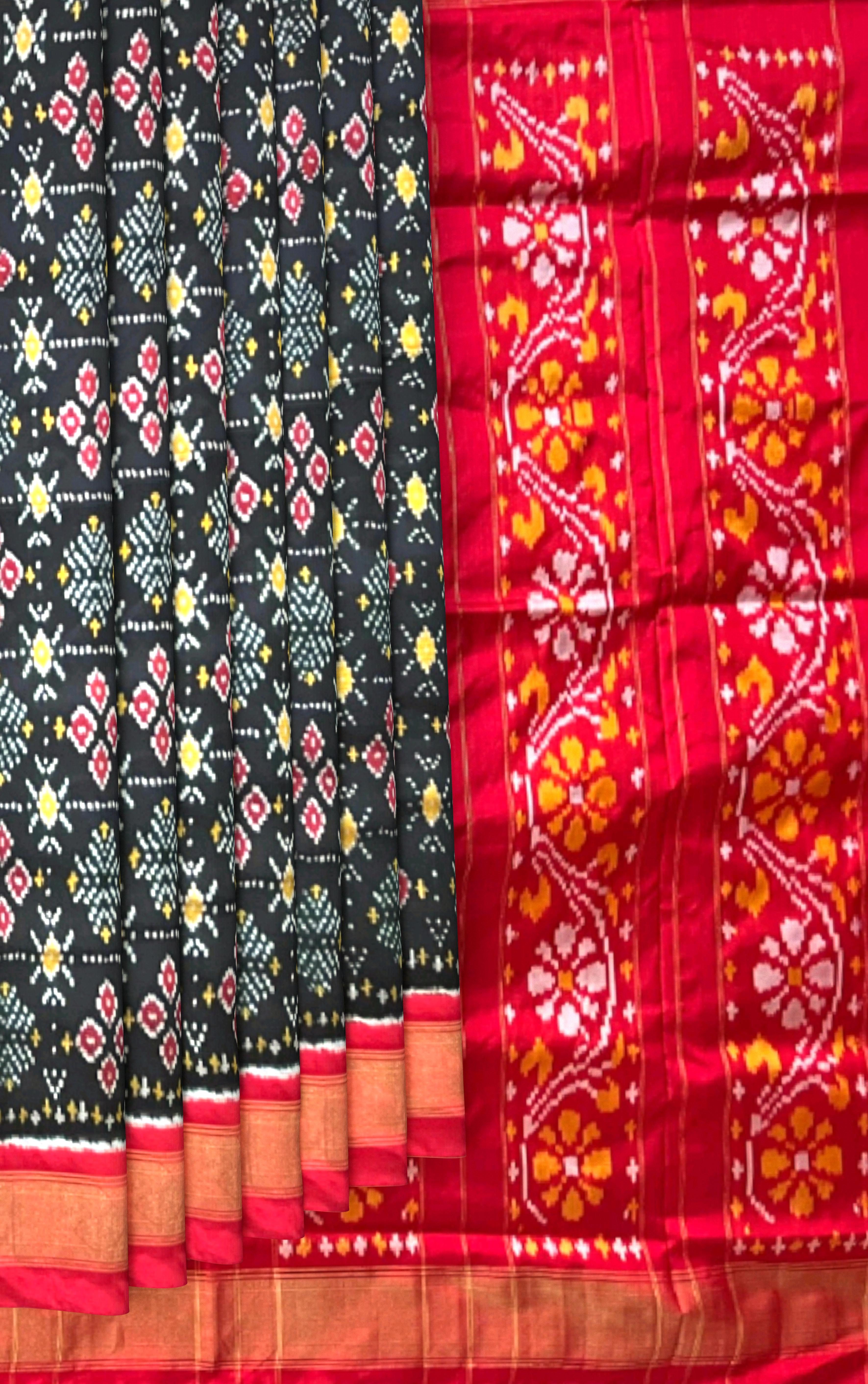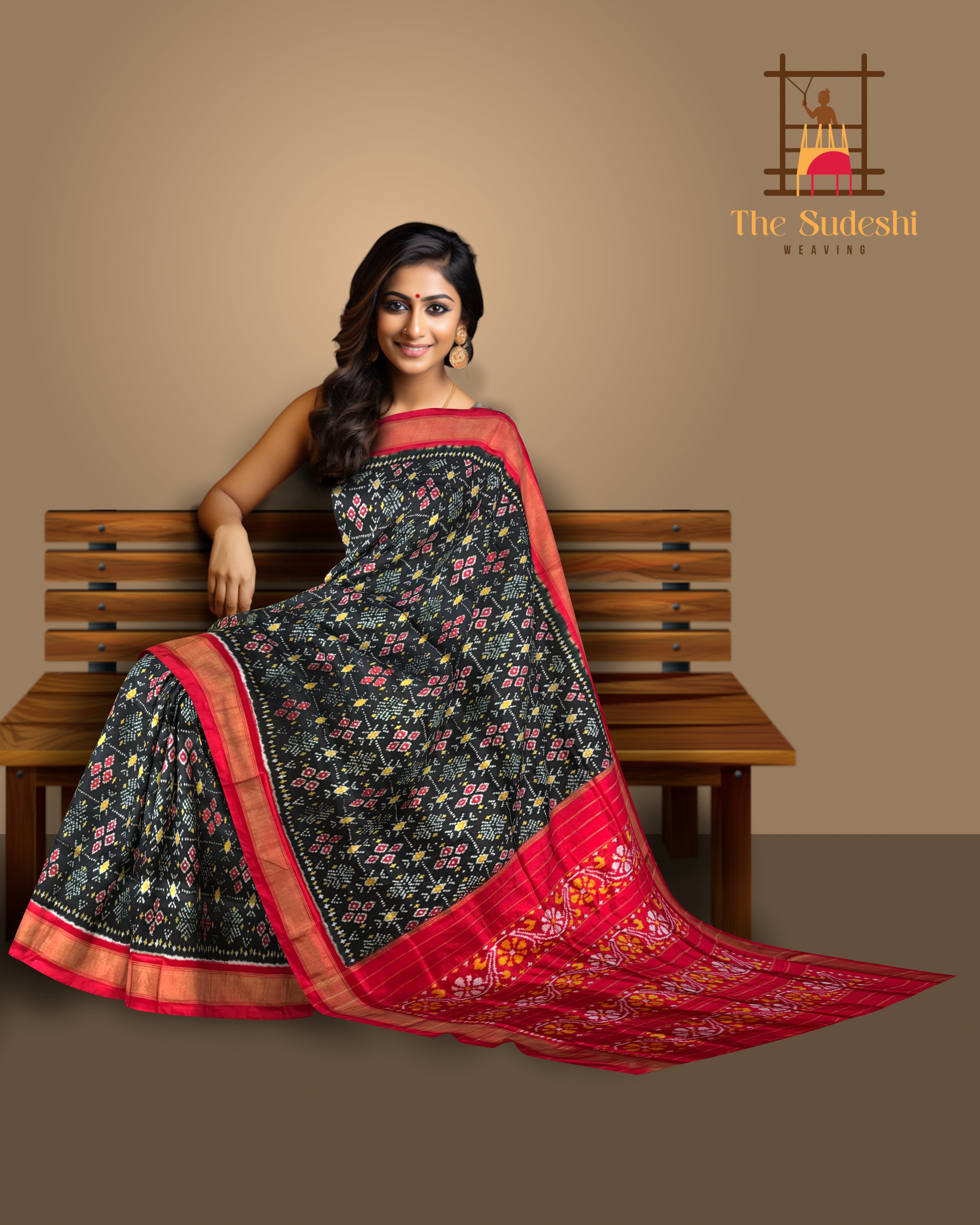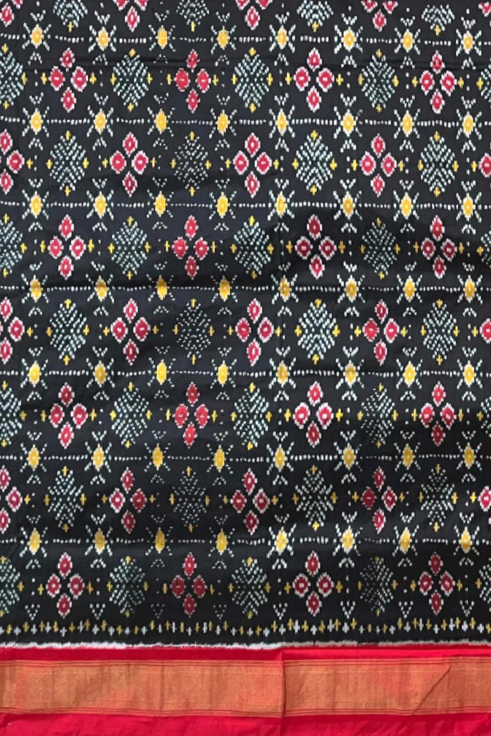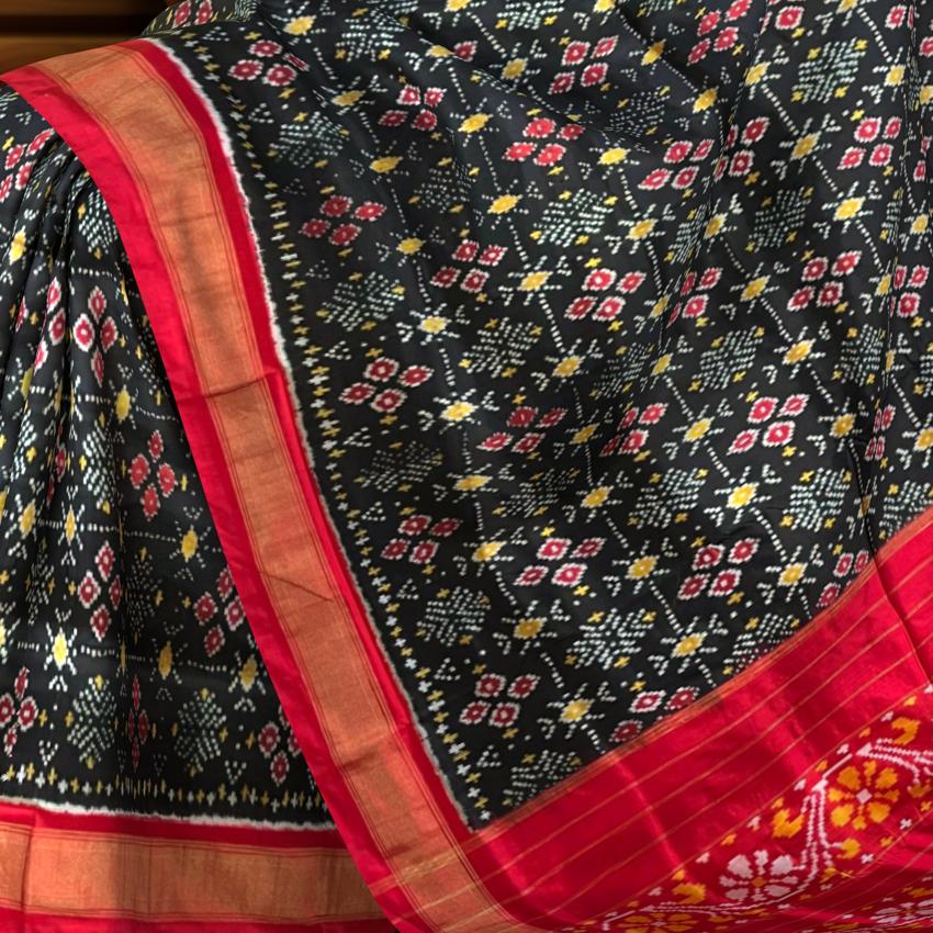 Bold and effortlessly elegant, the Black Pochampally Ikat Saree with a rich red border and pallu is a timeless classic. The deep black body contrasts sharply with the bright red accents, creating a stunning visual appeal. The subtle ikat patterns woven into the fabric further enhance its traditional charm while maintaining modern sophistication. This exquisite saree is a product of Pochampally, Telangana, renowned for its double ikat weaving technique. The precision in dyeing and weaving each thread creates symmetrical designs that often symbolize protection, prosperity, and cultural pride. Black symbolizes power and grace, while red conveys festivity and passion — a combination that's perfect for making a bold statement. Ideal for weddings, receptions, and evening events, this saree pairs beautifully with a red or gold blouse. Complete your look with antique gold jewelry, a bold red lip, and sleek accessories for a striking ensemble. Note: The appearance of the product’s colors may vary due to lighting conditions or your device’s screen calibration. For further assistance or additional images/videos, feel free to contact us at +91 97897 60367 / +1 (945) 308-5962 or email at wecare@thesudeshiweaving.com.