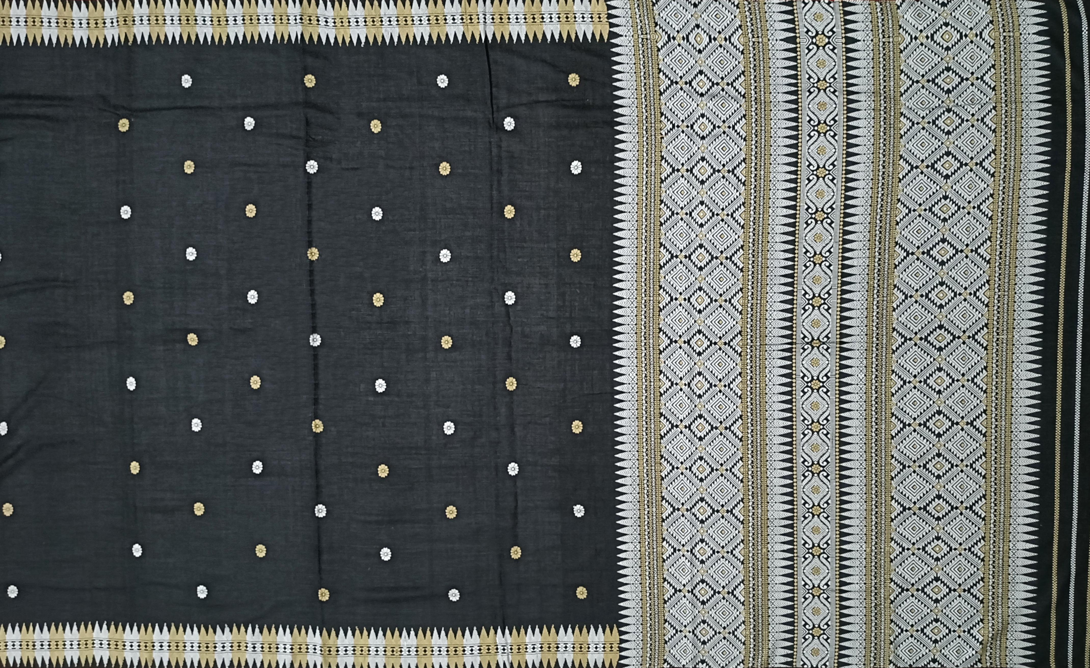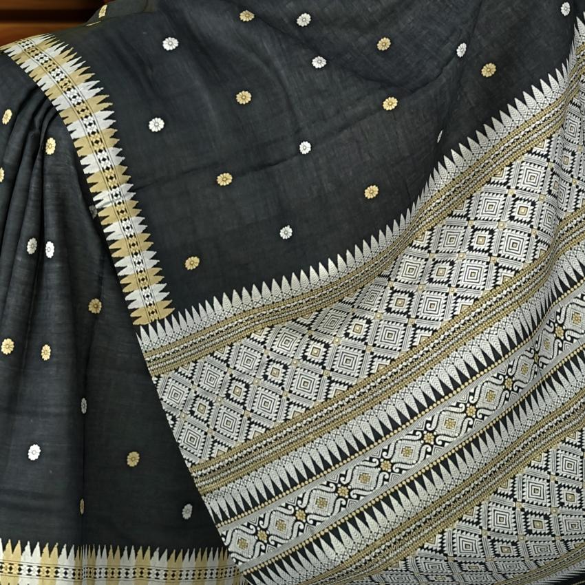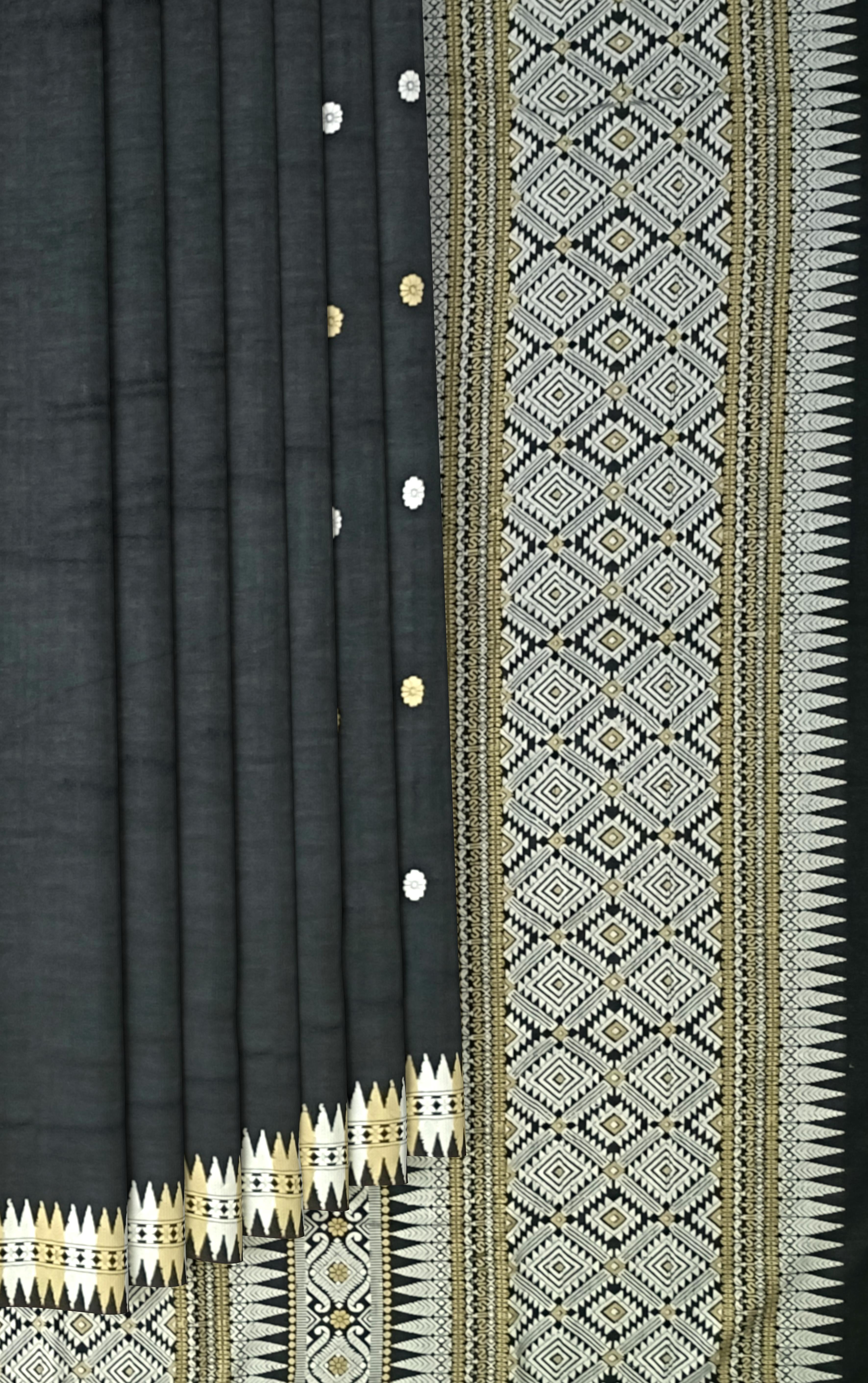 Step into sophistication with this black Erisaree from Assam, a stunning piece with timeless appeal. The saree’s body, enriched with intricate buttis and motifs, reflects the unparalleled artistry of Assamese handlooms. The contrasting off-white border and pallu add a subtle yet striking element of elegance to this classic piece.