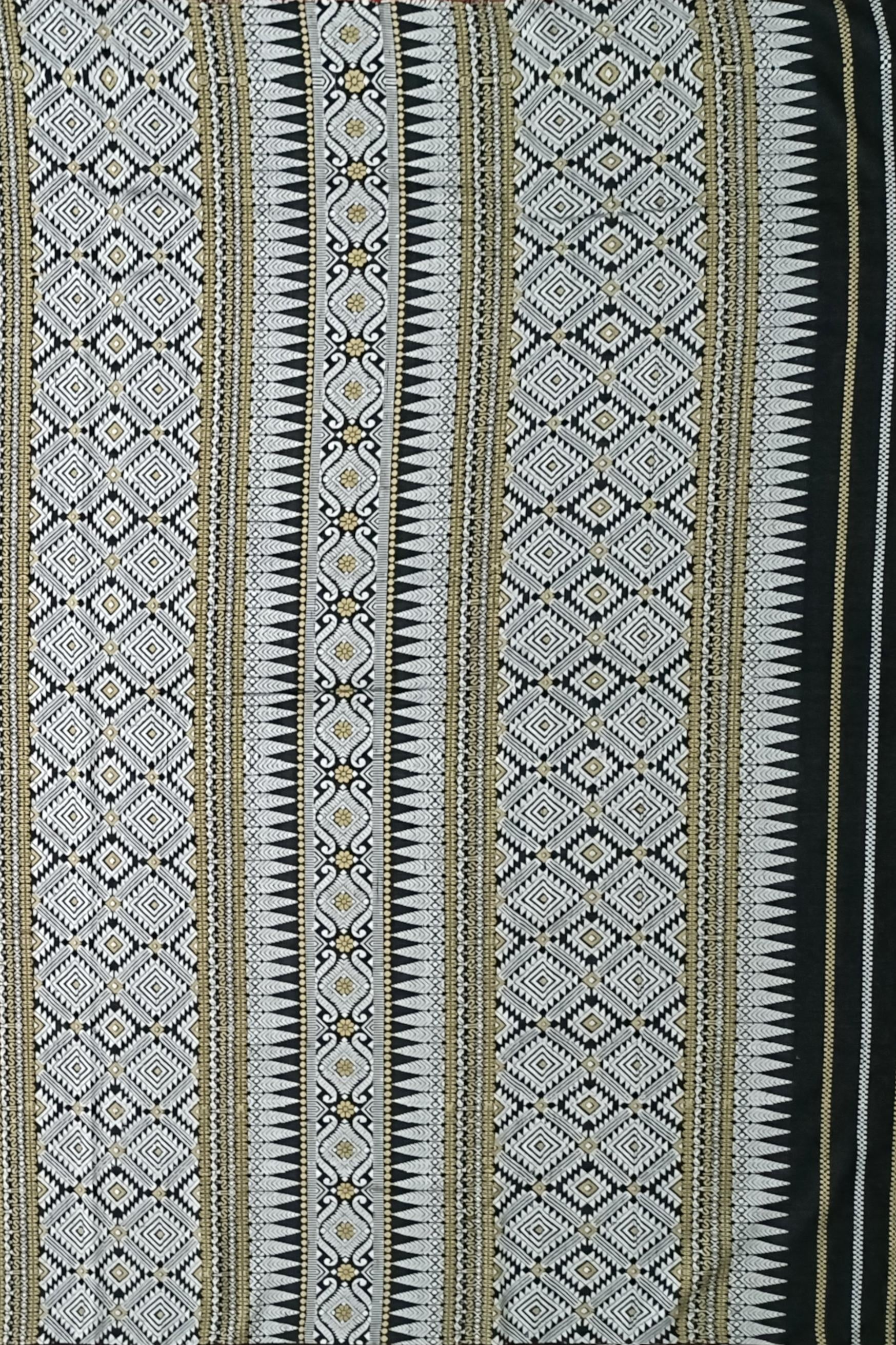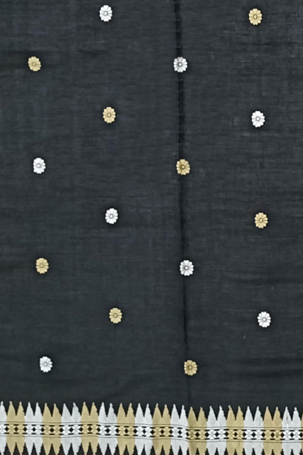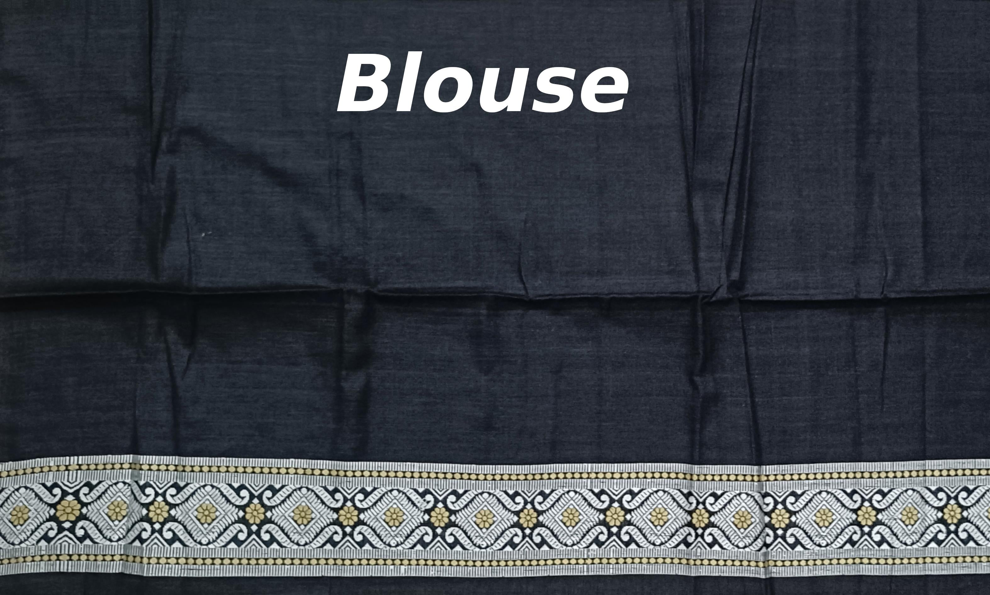 Step into sophistication with this black Erisaree from Assam, a stunning piece with timeless appeal. The saree’s body, enriched with intricate buttis and motifs, reflects the unparalleled artistry of Assamese handlooms. The contrasting off-white border and pallu add a subtle yet striking element of elegance to this classic piece.