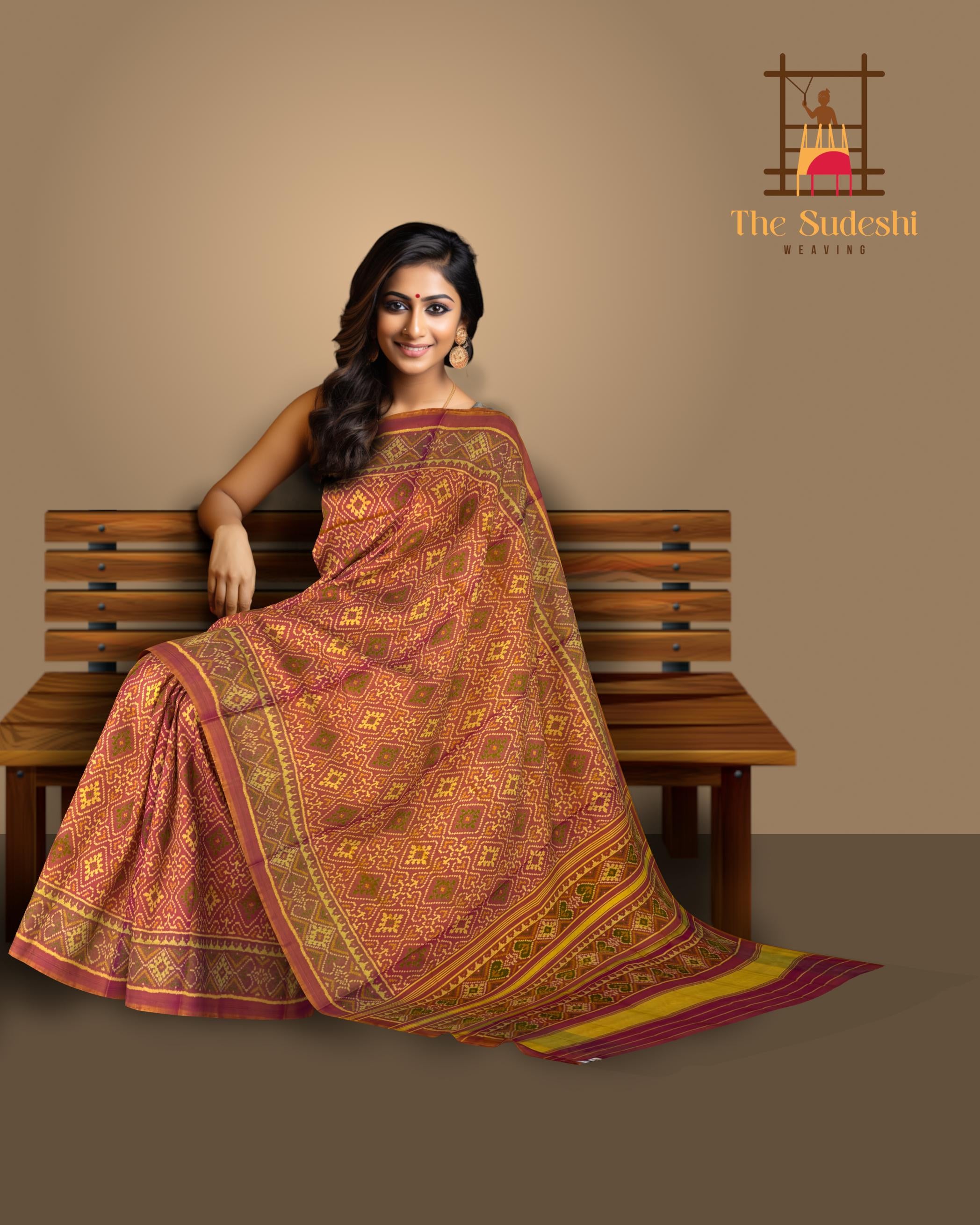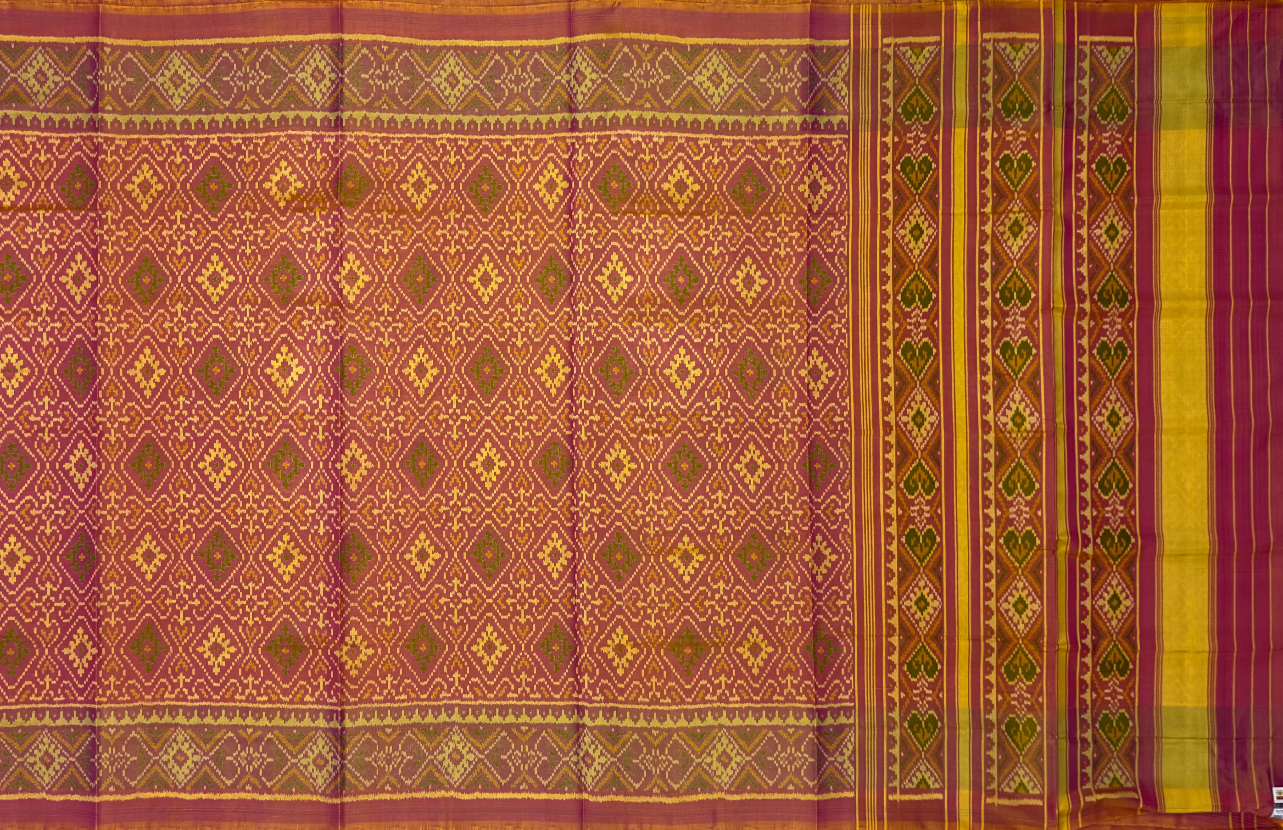 Adorn yourself in the Bleed Red Pan Chanda Regular Rajkot Patola Saree, featuring rich rust colors with timeless Pan Chanda motifs. Ideal for weddings and special occasions, it represents the perfect blend of heritage and style.