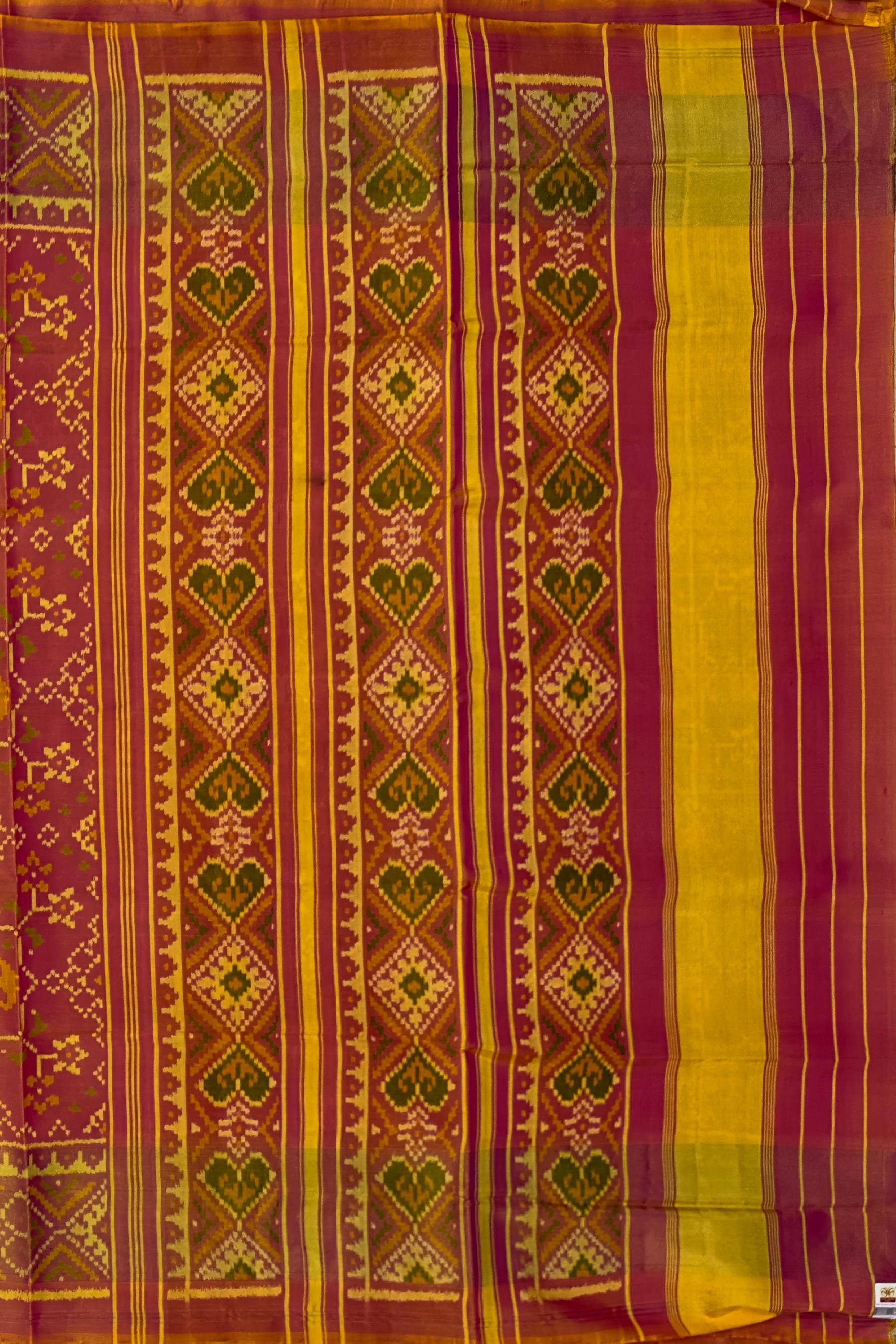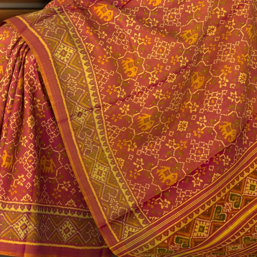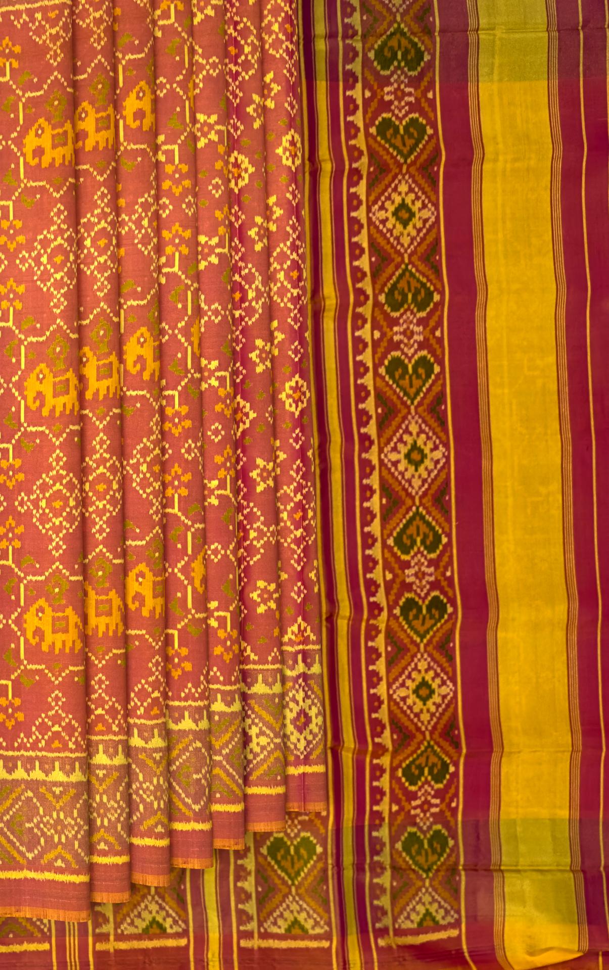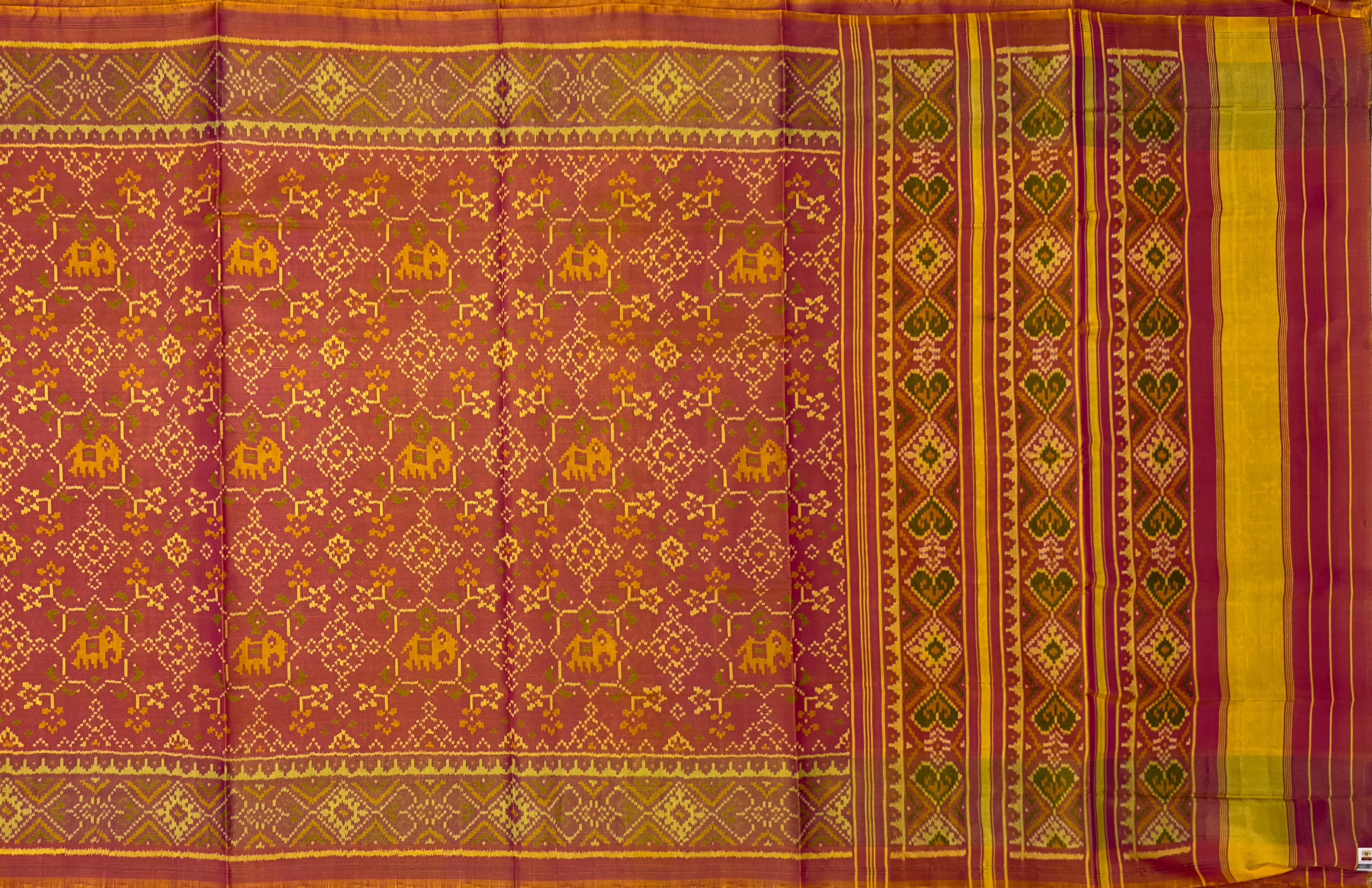 The Bleed Red Rajkot Patola Saree, featuring the 'Navratna + Hathi' design, is a vibrant choice for those who stand bold. Its single ikat weave brings out rich, fuzzy patterns that symbolize strength and royalty, making it suitable for significant occasions where heritage and style go hand in hand.