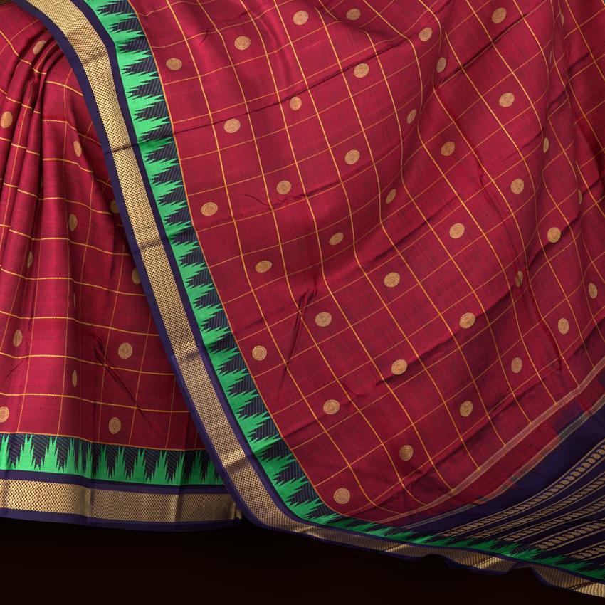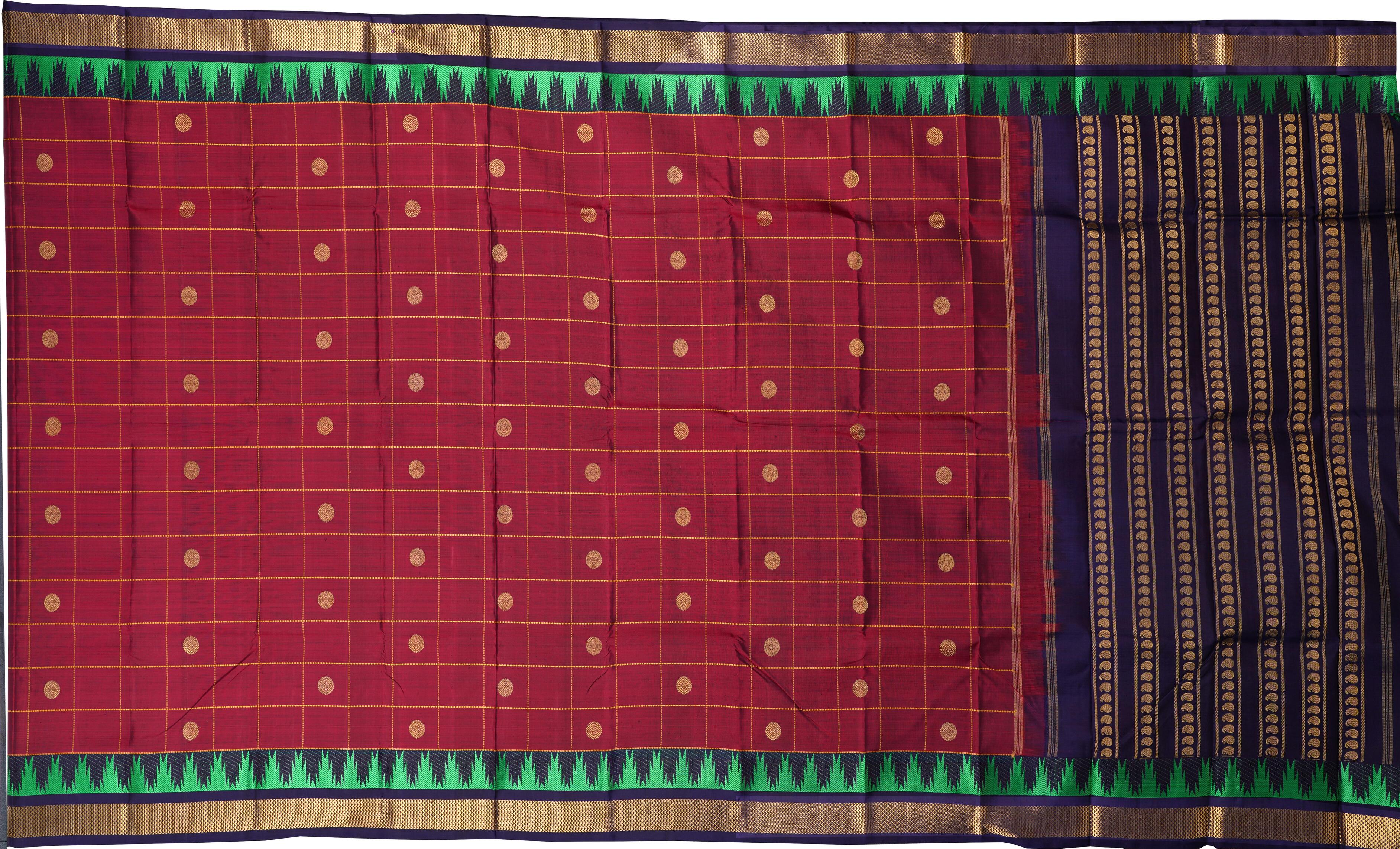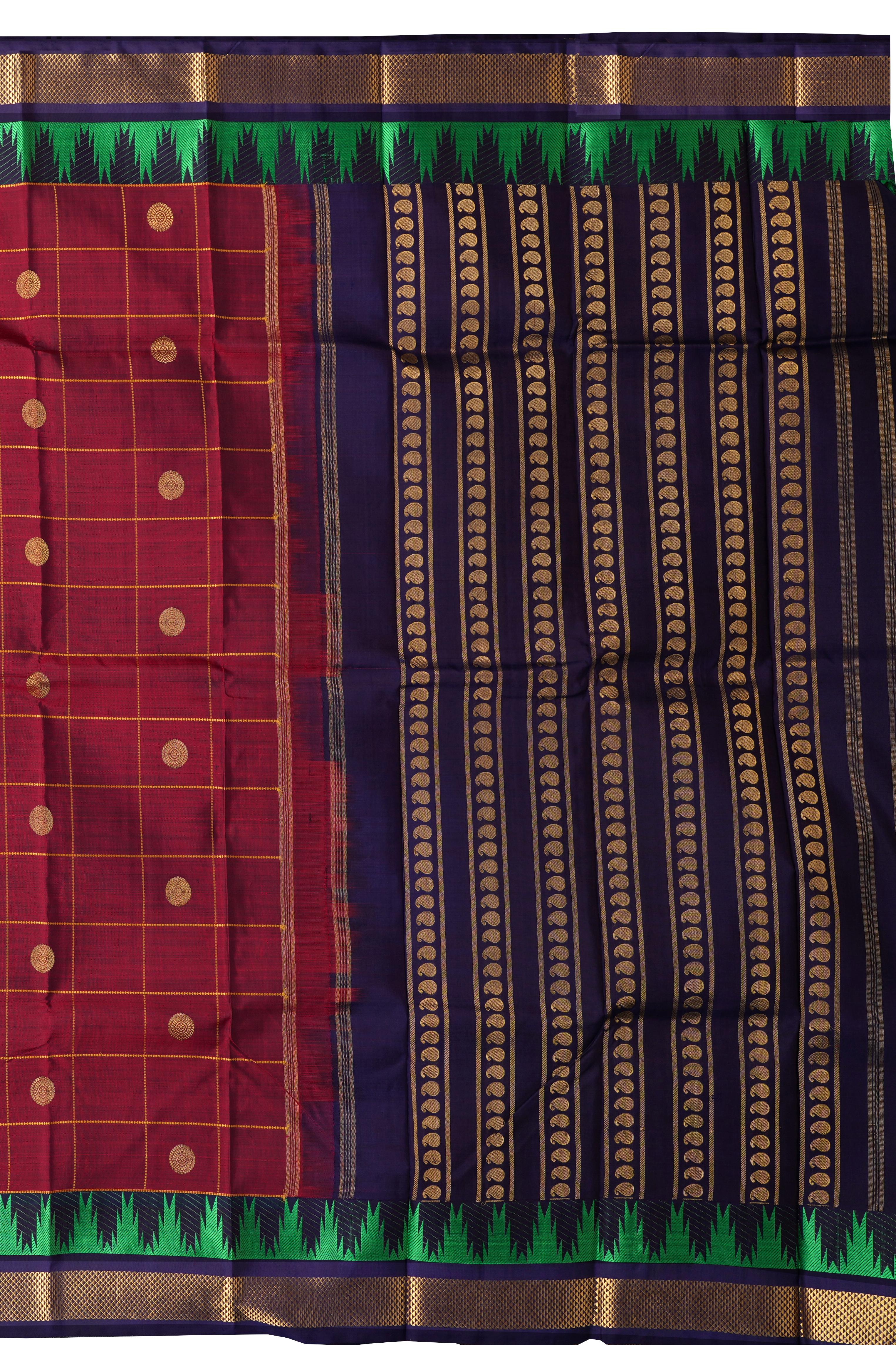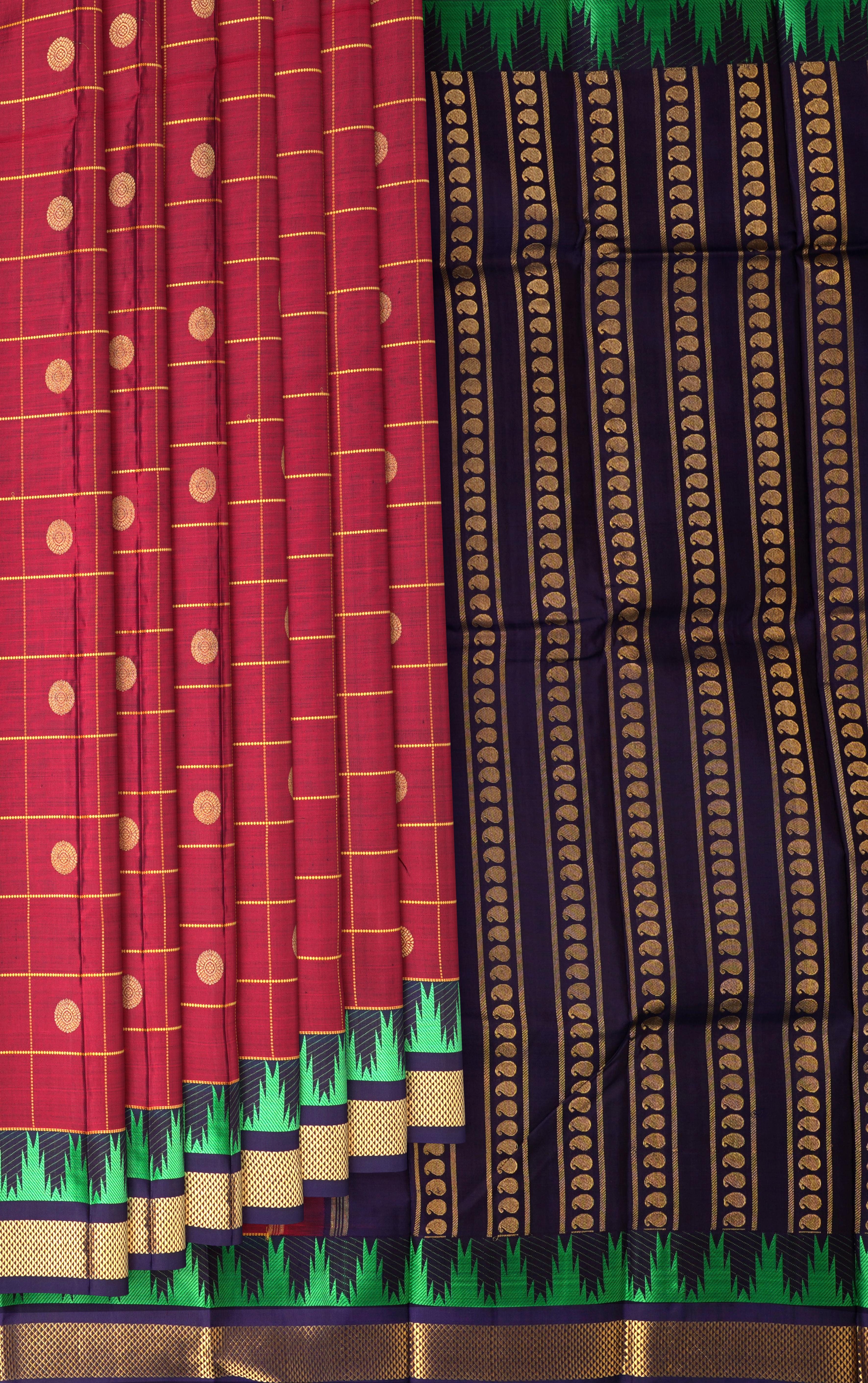 Make a statement with this stunning Blood Red and Navy Blue Kanchipuram Pure Zari Saree. The checks pattern with a Bhutta border, a hallmark of Kanchipuram Pure Zari, is a testament to the artisan's skill and dedication. The bold blood red and navy blue colors, symbolizing love and sophistication, are perfectly complemented by the delicate checks design. The dual tone of blood red and navy blue adds a touch of elegance and poise to this saree, making it perfect for formal events and weddings.