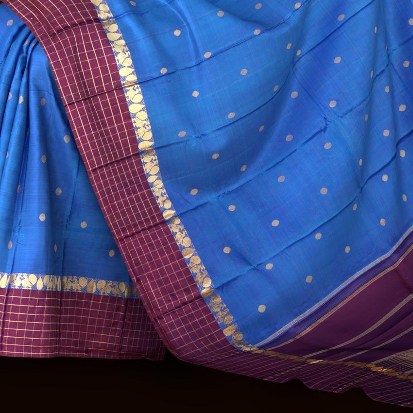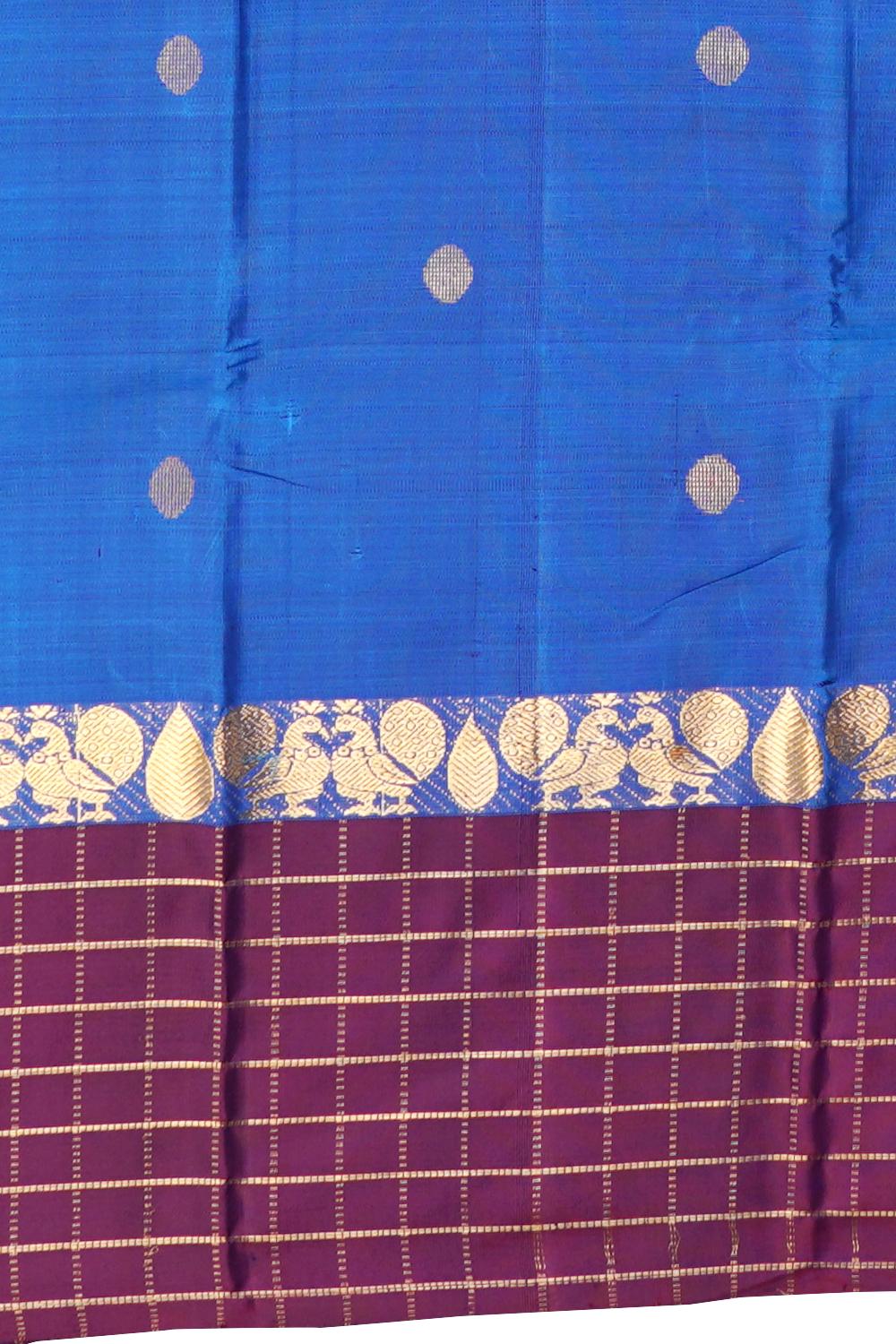 Experience the elegance of this stunning Blue and Maroon Kanchipuram Pure Zari Saree. The Butta design, a hallmark of Kanchipuram Pure Zari, is a testament to the artisan's skill and dedication. The bold blue and maroon colors, symbolizing trust and creativity, are perfectly complemented by the intricate Butta design. The dual tone of blue and maroon adds a touch of sophistication and poise to this saree, making it perfect for formal events and weddings.