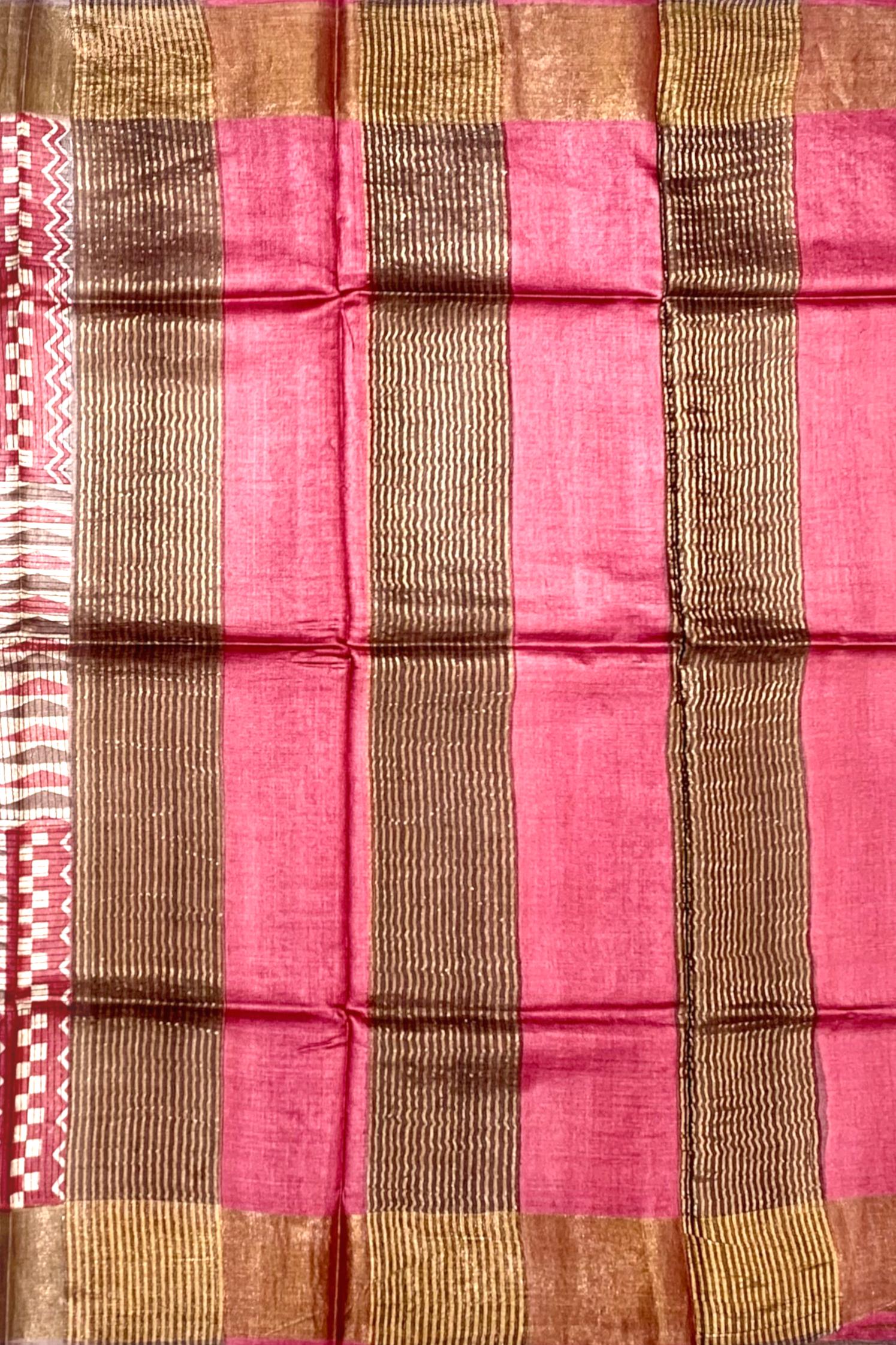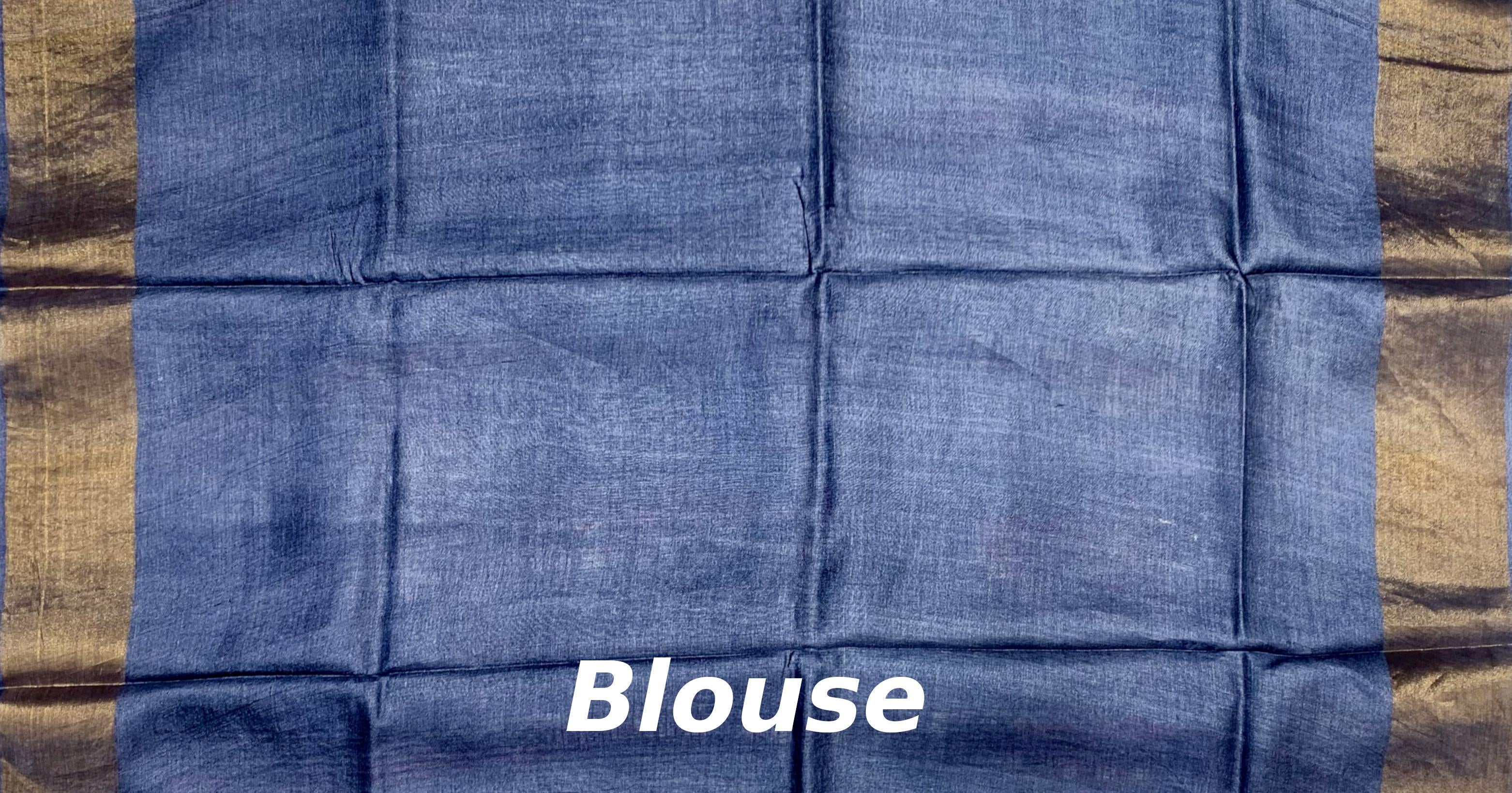 Make a statement with this majestic Blue Brown Tussar saree, featuring a single-side design. The dual-tone blue and brown hues create a striking contrast, while the gold accents add a touch of luxury.