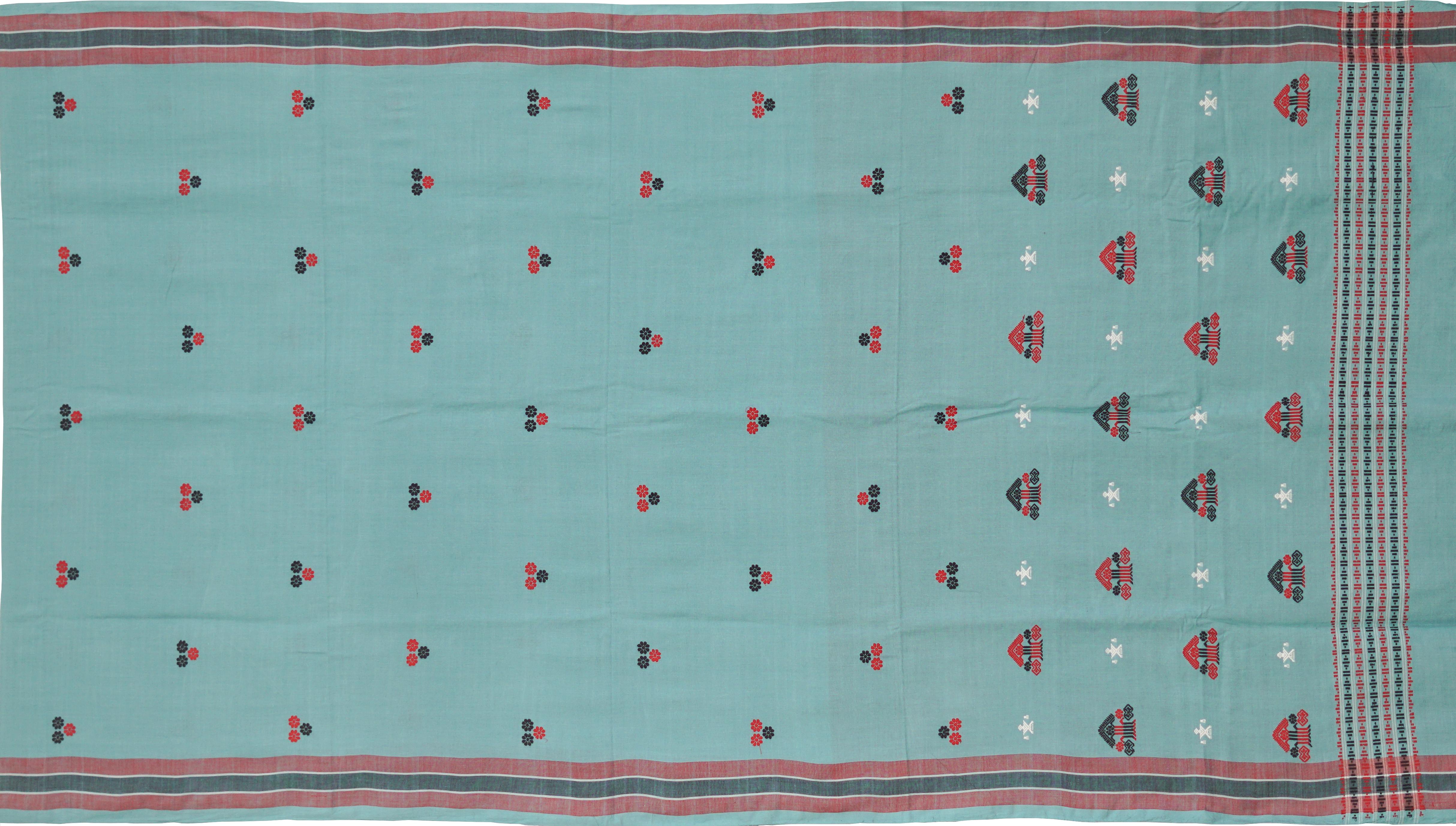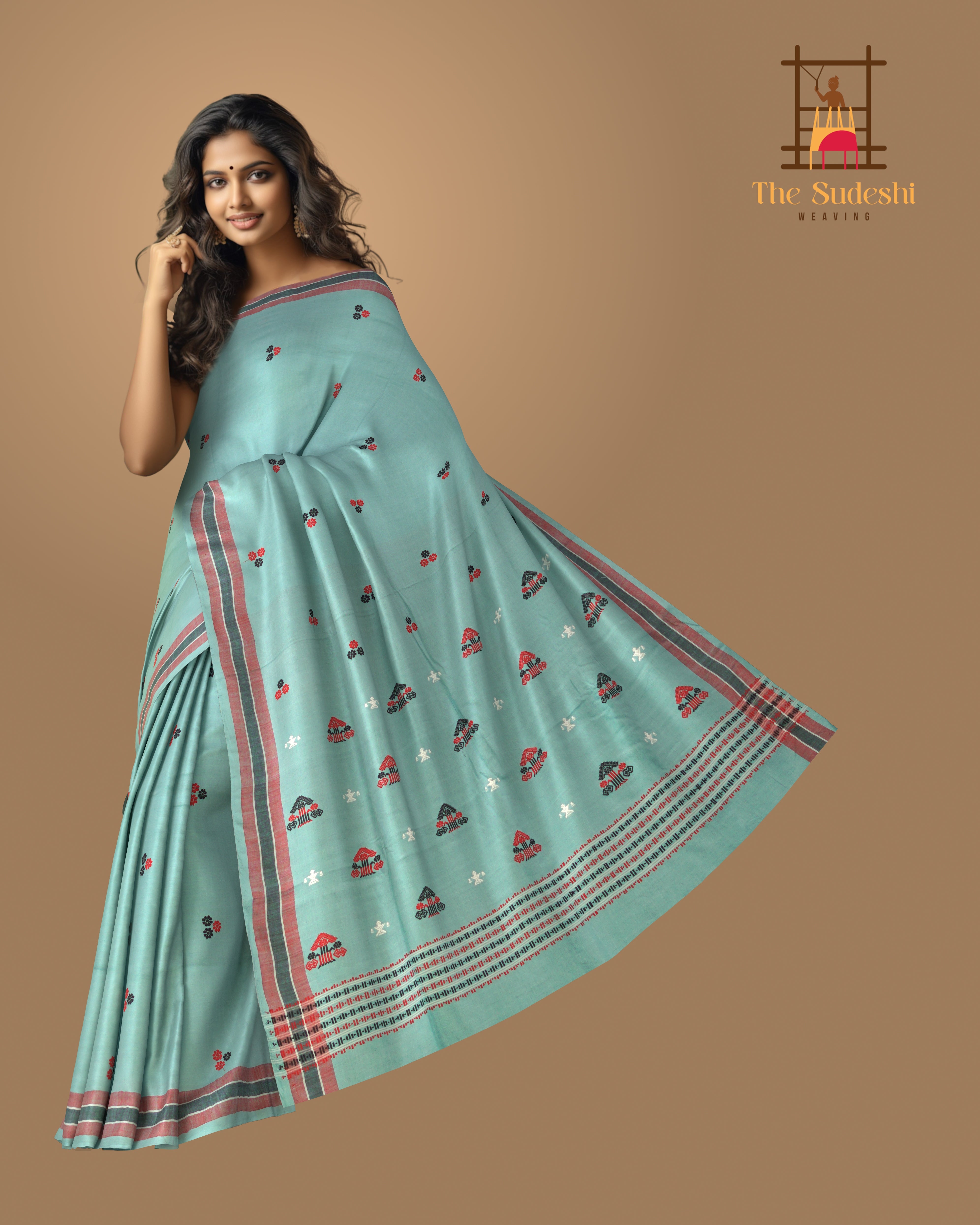 The motifs on this saree are inspired by Assamese culture and nature, featuring geometric and stylized patterns that symbolize flowers, plants, and traditional artifacts. These motifs, woven using the extra-weft technique, add a raised, embossed effect that enhances the saree's texture and depth. The combination of blue and red is both classic and contemporary, appealing to women of all ages.