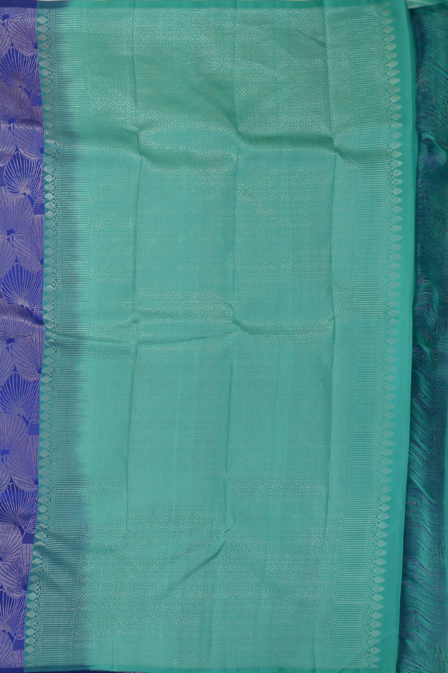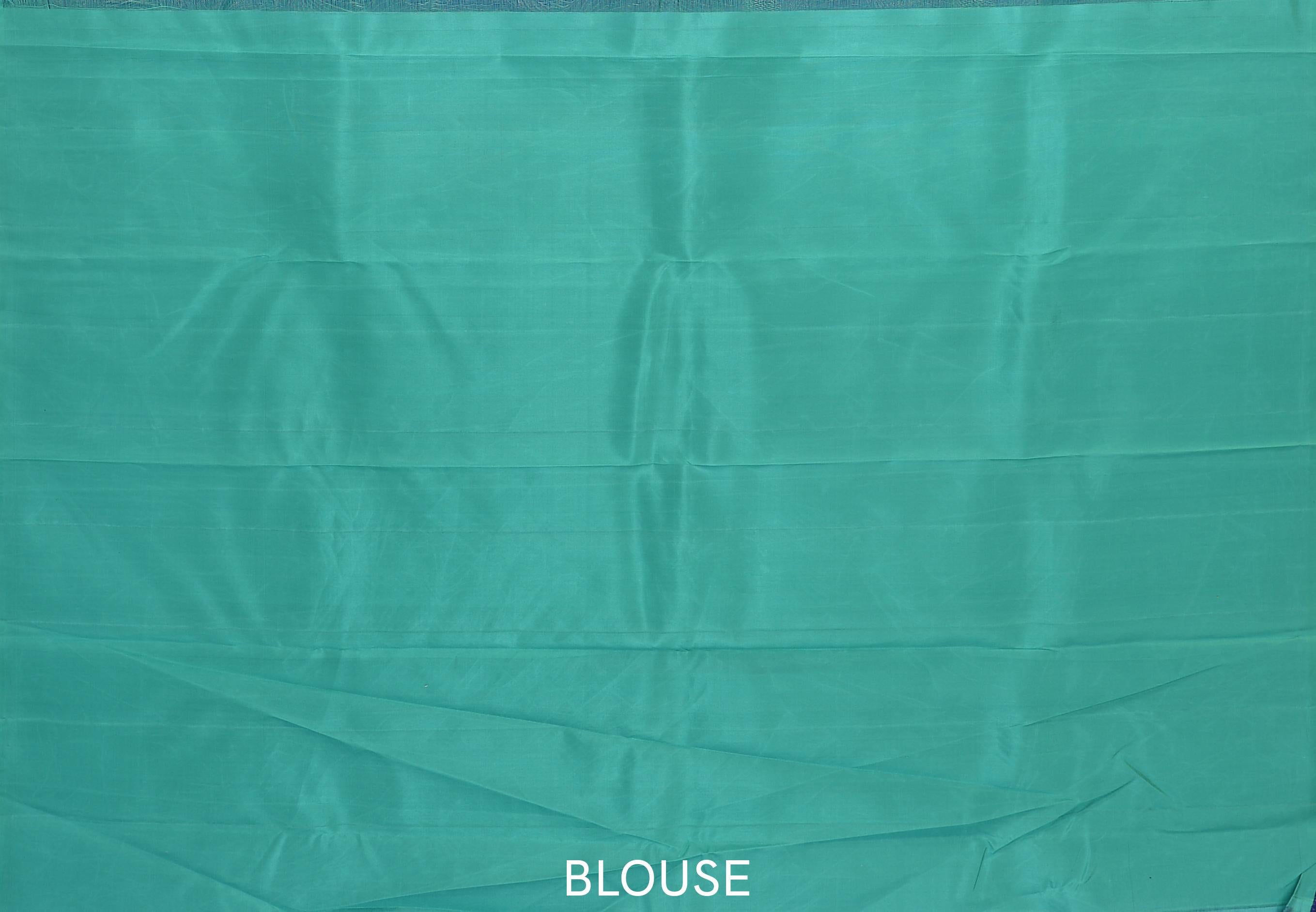 The grand Sea Green pallu is a masterpiece of intricate design, offering a subtle contrast that is both elegant and understated. Perfect for any occasion where elegance is key, this saree is a testament to the beauty of Kancheevaram silk, offering a timeless piece that transcends fashion trends.