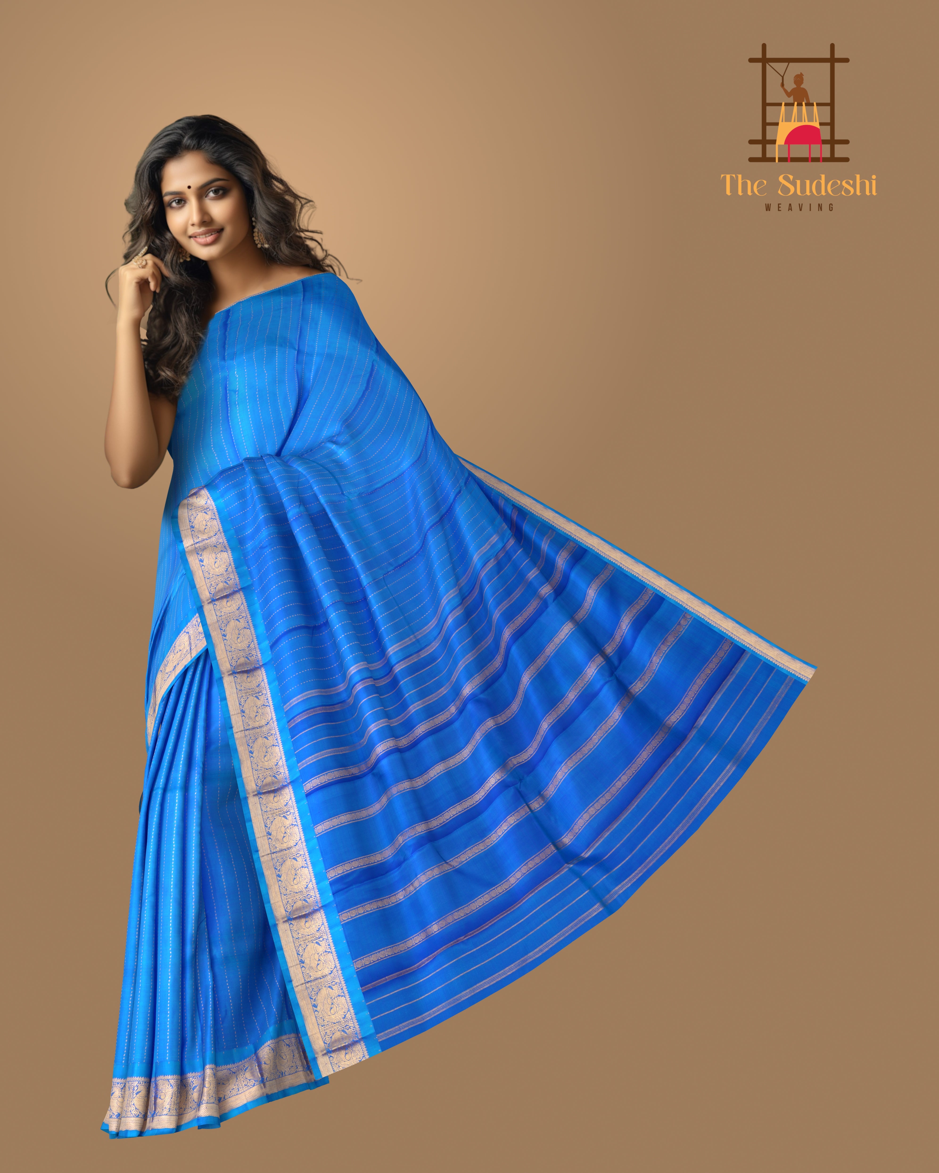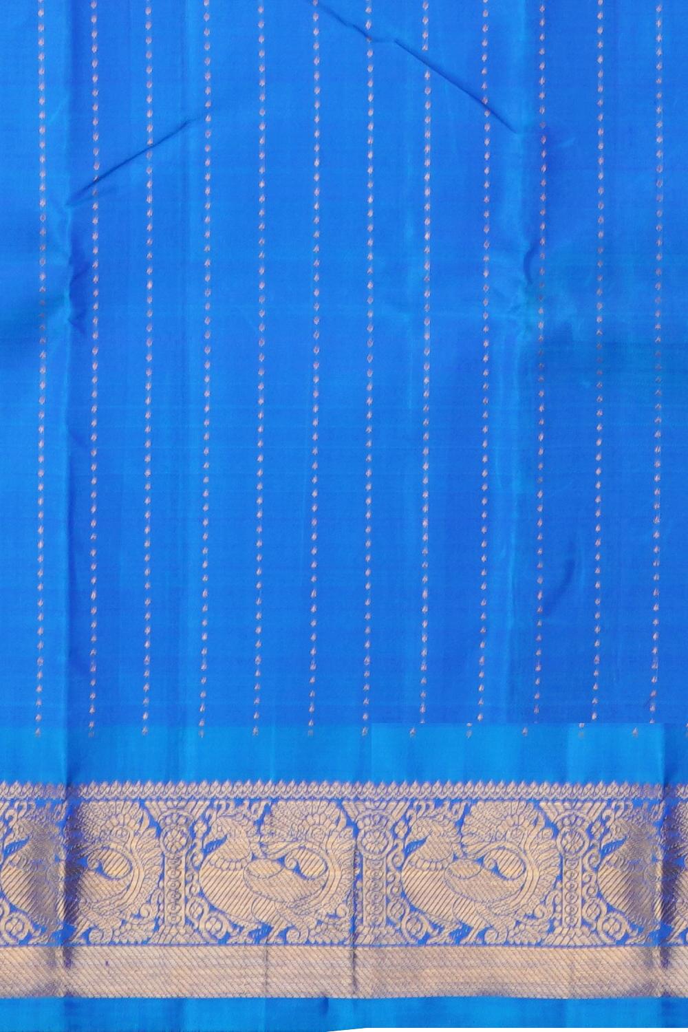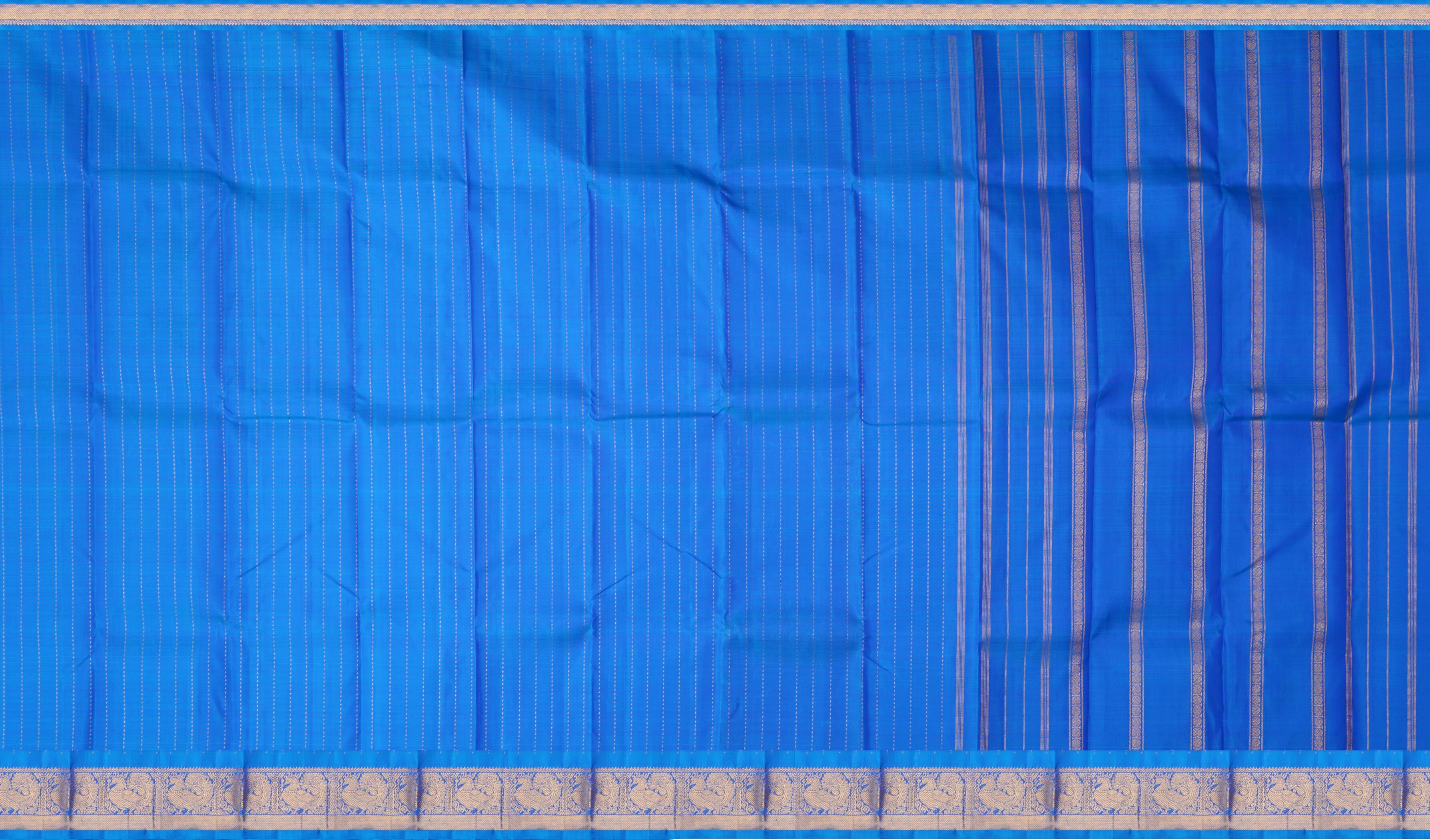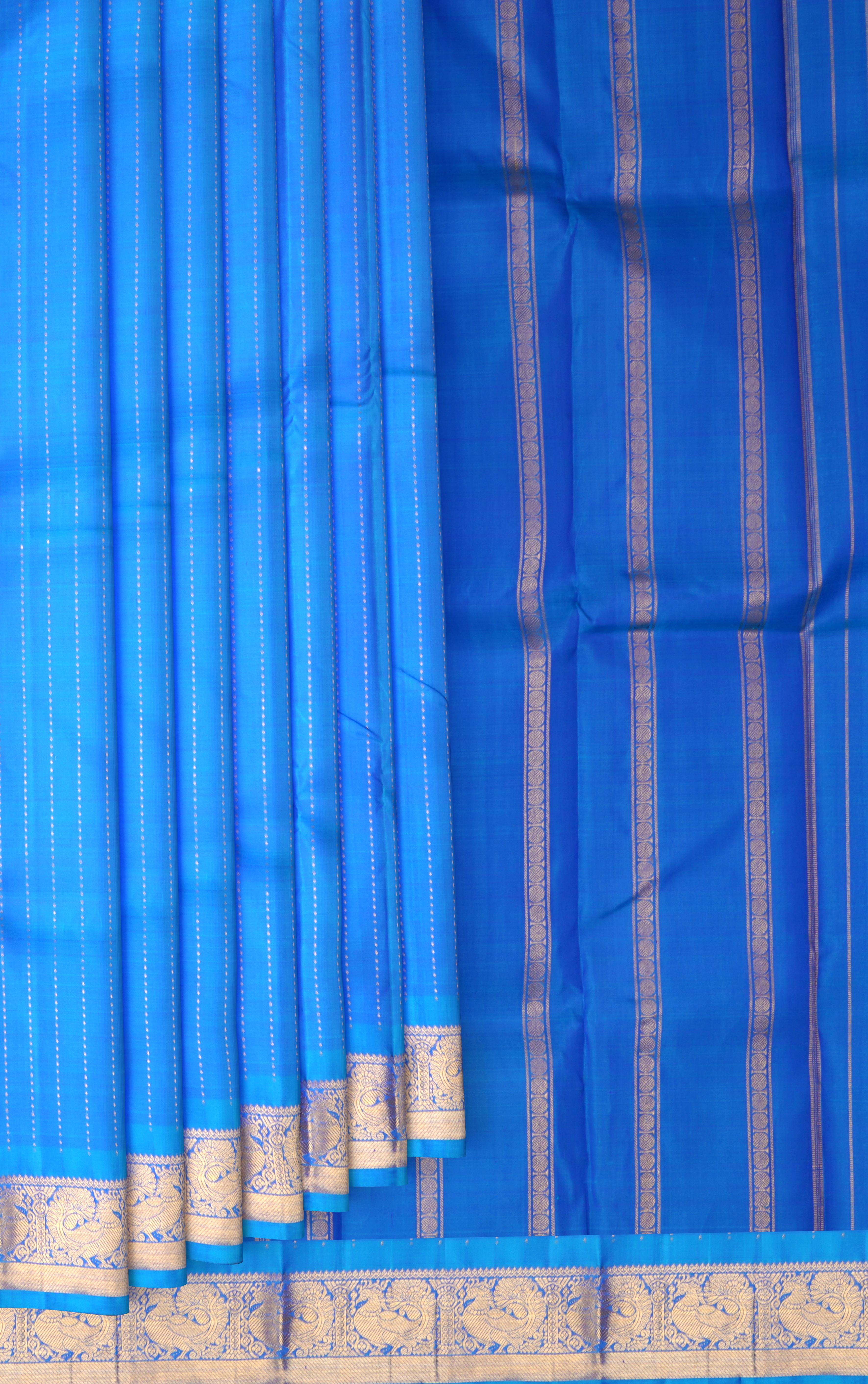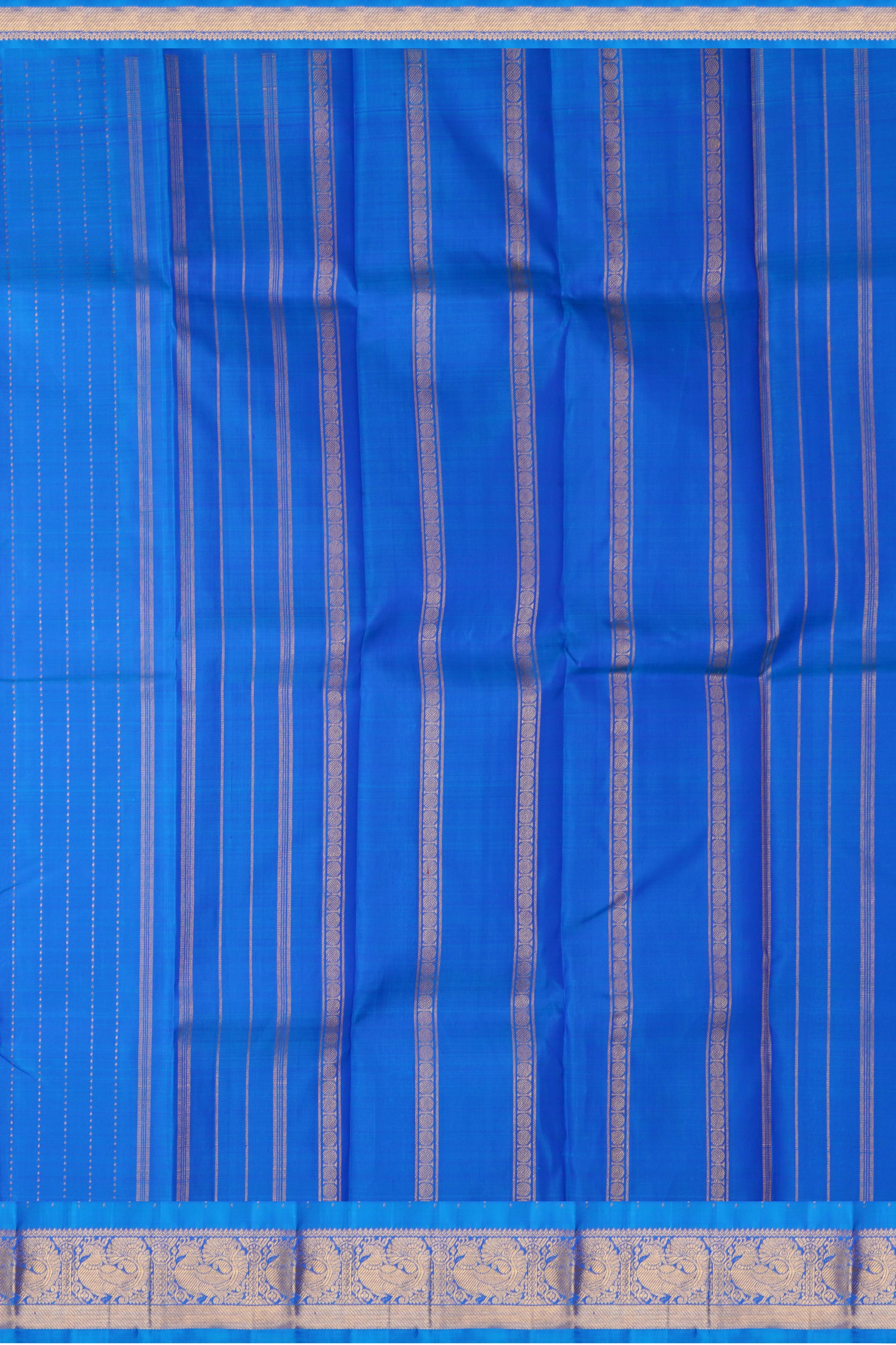 Embrace Classic Elegance with a Blue Kanchipuram Pure Zari Saree.Discover the timeless beauty of this Blue Kanchipuram Pure Zari Saree. Handwoven with meticulous care, this saree showcases the intricate craftsmanship of traditional Indian textiles. The classic blue hue, adorned with a darker blue border, creates a captivating and visually striking ensemble. The lustrous zari threads, woven into the fabric with precision, add a touch of opulence and shimmer.