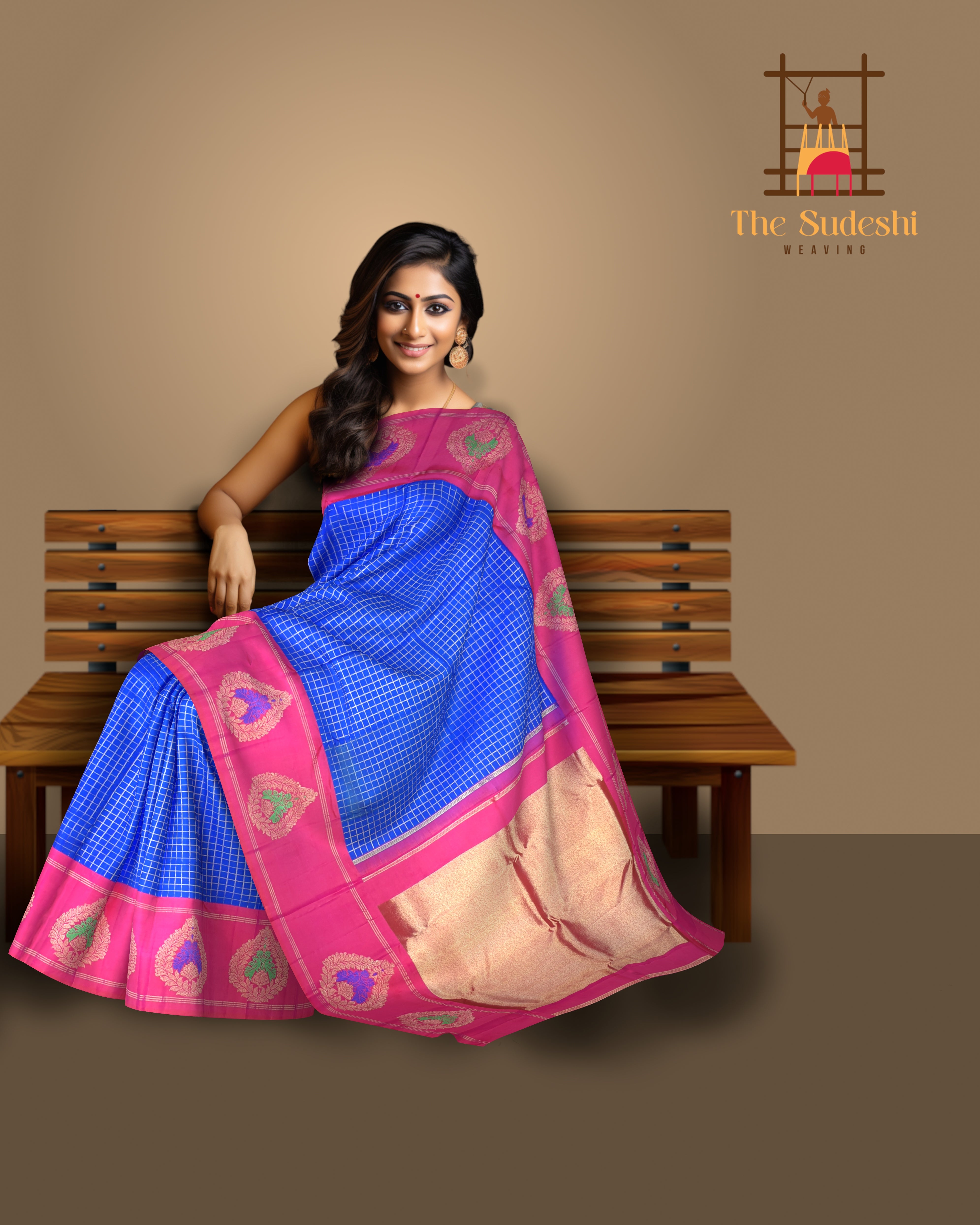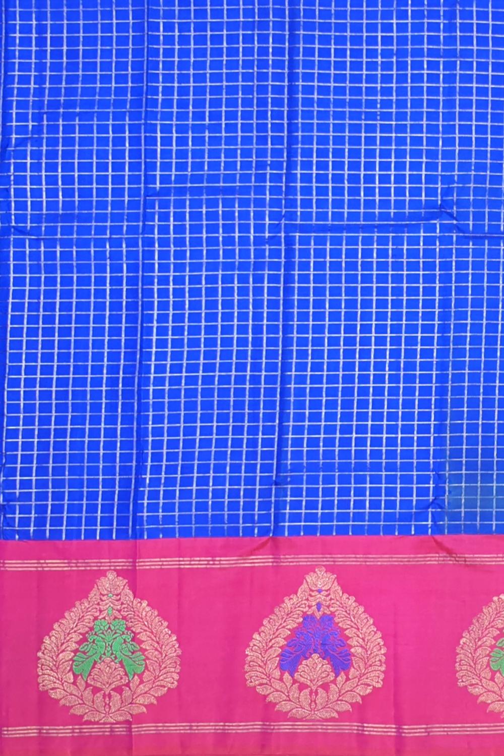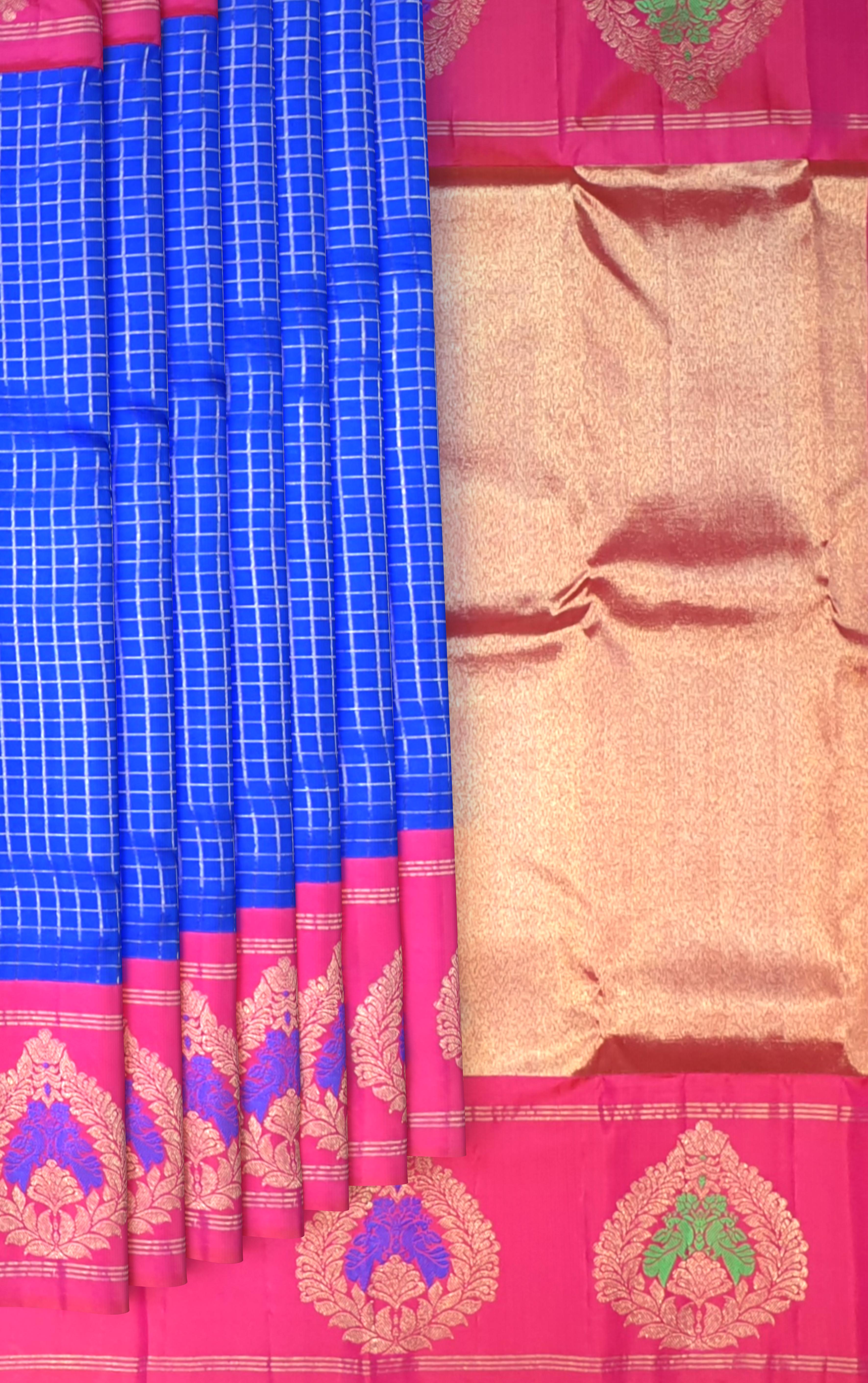 Celebrate heritage with a modern twist in this stunning blue Kanchipuram silk saree featuring bold checks across the body. The structured design is elevated by a charming pink border adorned with traditional motifs, creating a balanced contrast that draws the eye. The rich pink pallu and matching blouse add warmth to the cool tones of the body, making it a visually striking yet classically composed piece.