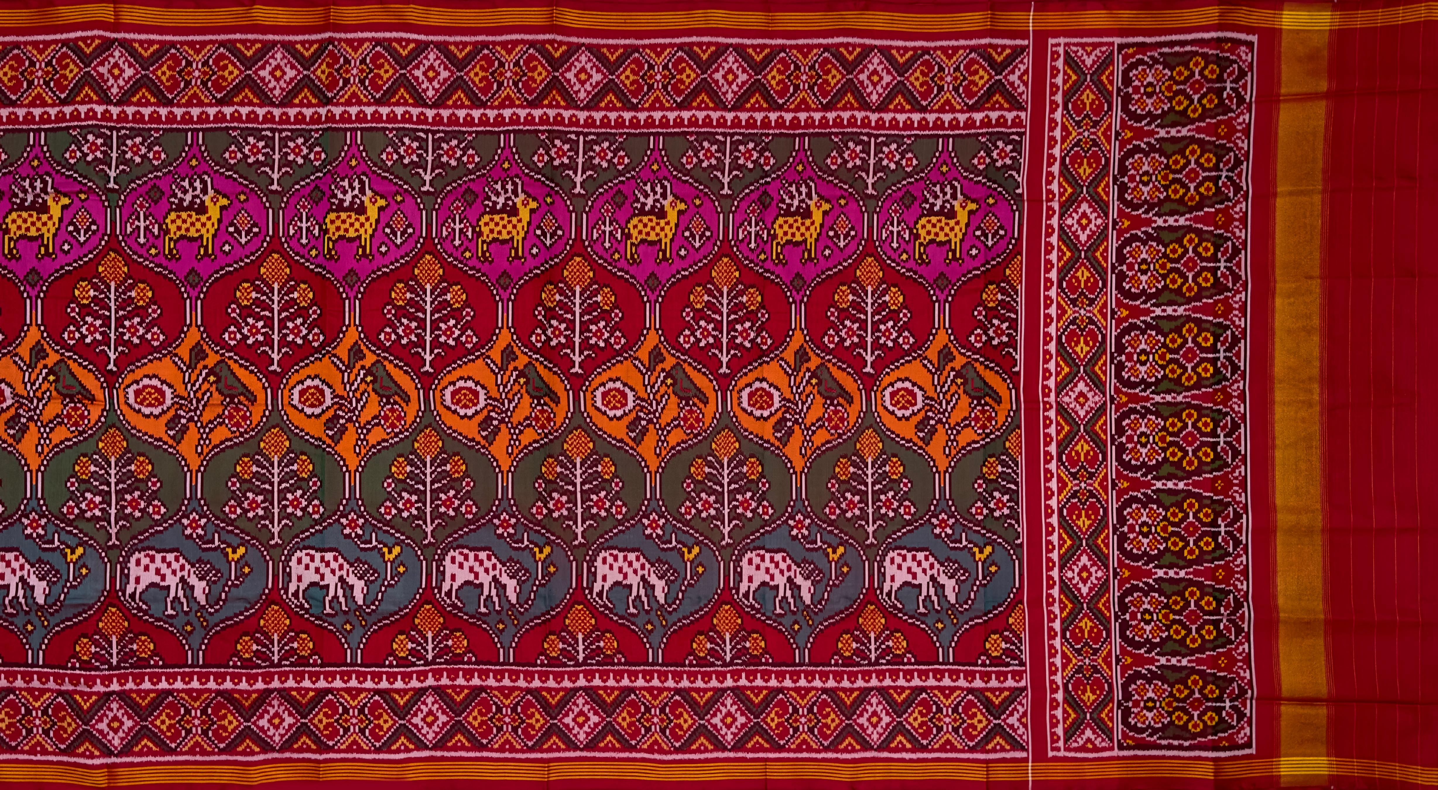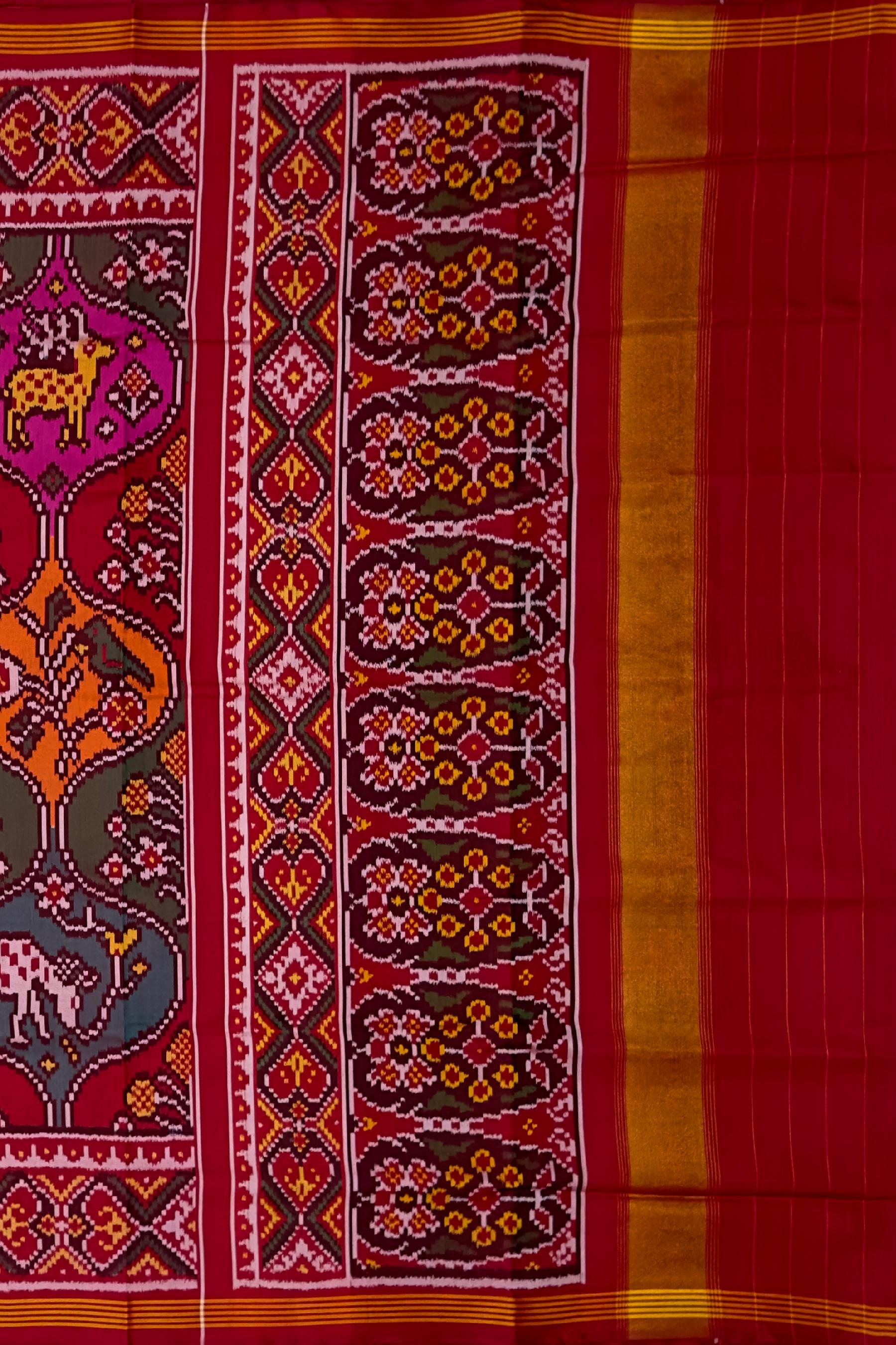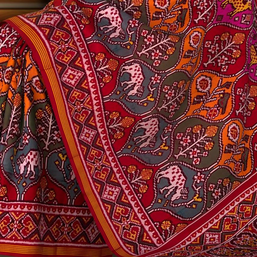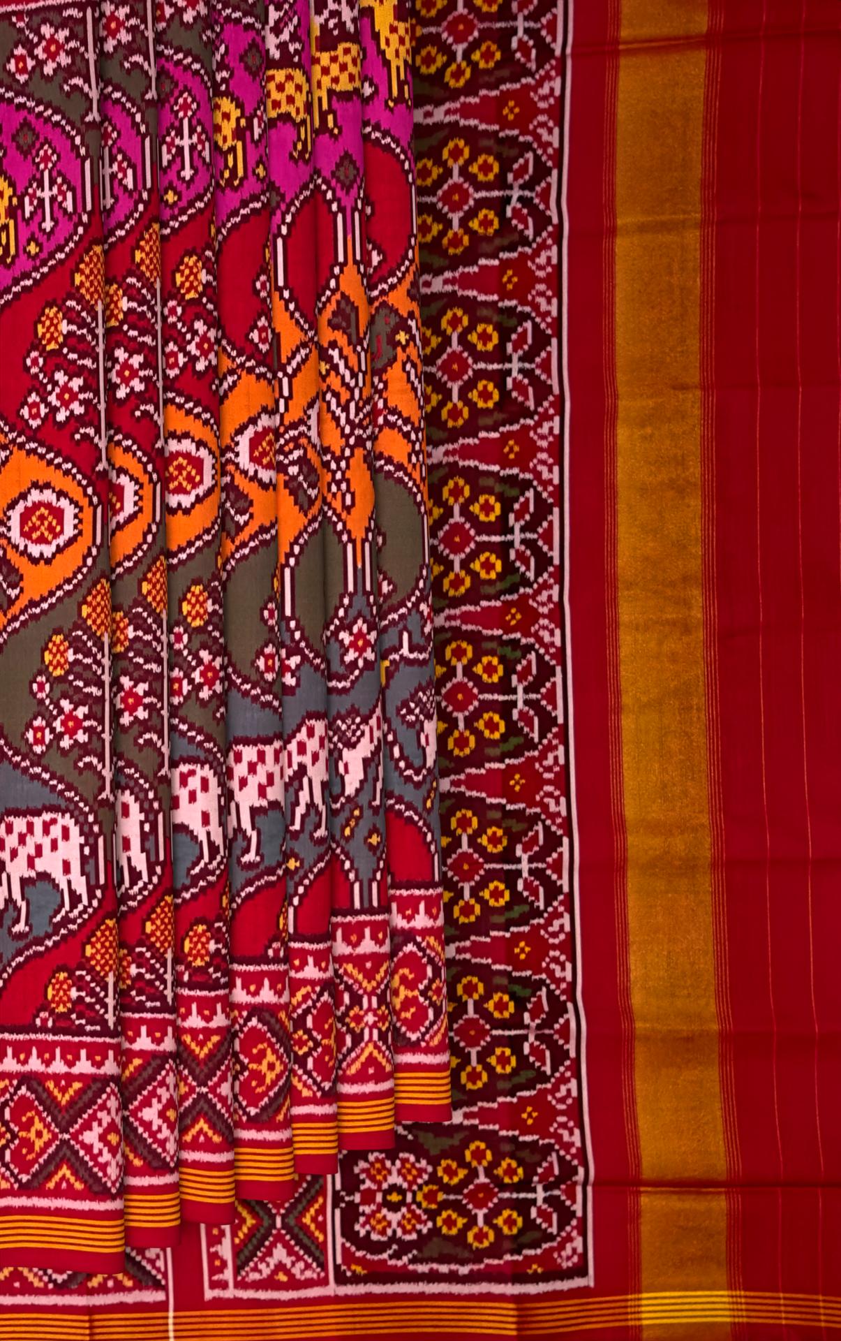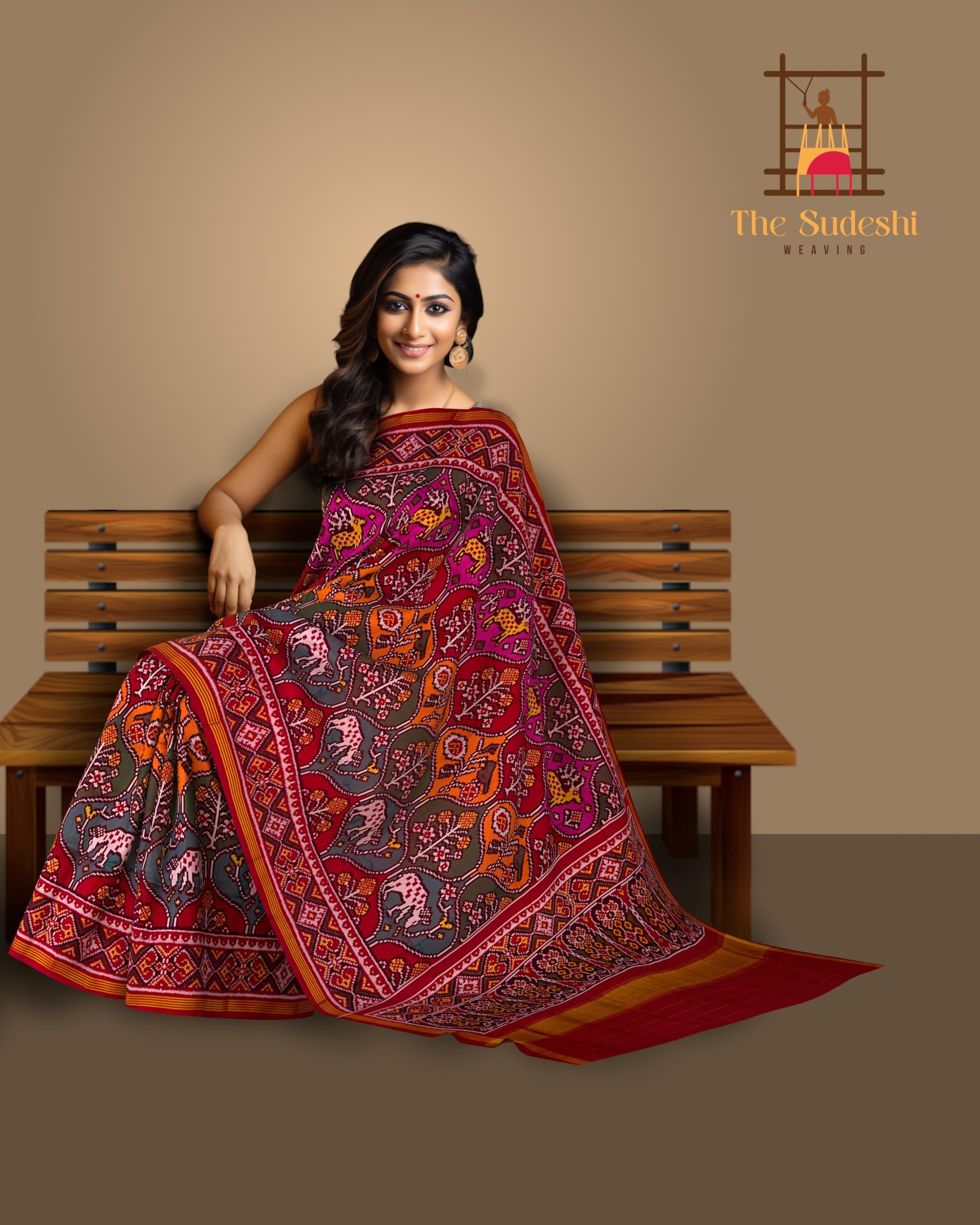Experience the vibrant beauty of the Blue Matka Design Multicolor Patola Saree, a stunning representation of traditional Indian craftsmanship. Utilizing the single ikat technique, this saree features the intricate Matka design, known for its detailed and elaborate patterns. The unique multicolor effect provides a striking backdrop for the motifs that extend from the body to the pallu. The semi-lustrous finish adds a touch of sophistication, making it perfect for festive and cultural occasions. This saree is ideal for grand weddings, cultural festivities, and social gatherings. It embodies the rich heritage of Rajkot Patola, making each piece a unique narrative of tradition and pride. Adorn yourself with the Blue Matka Design Multicolor Patola Saree, a timeless addition to your wardrobe that celebrates your roots with grace and elegance.