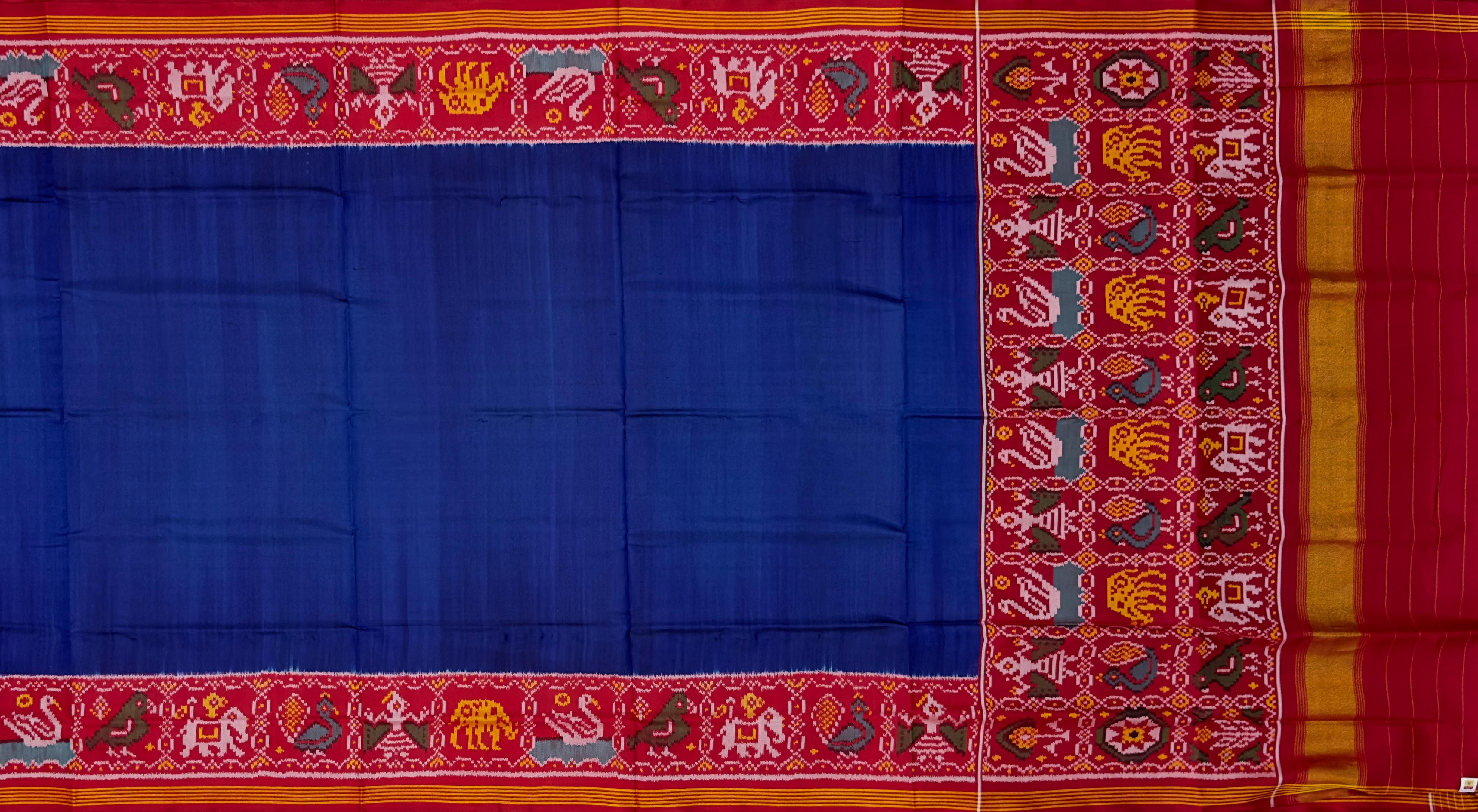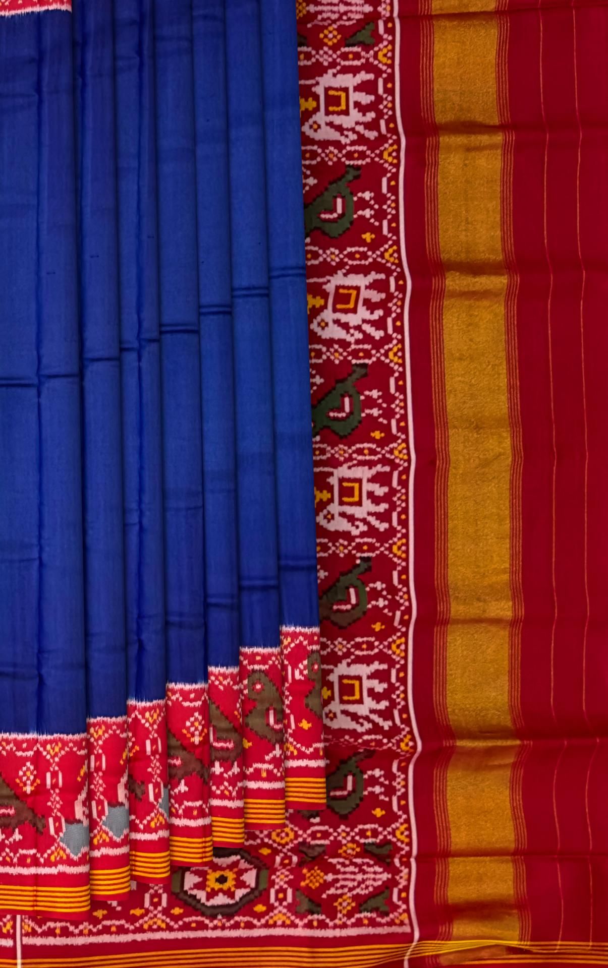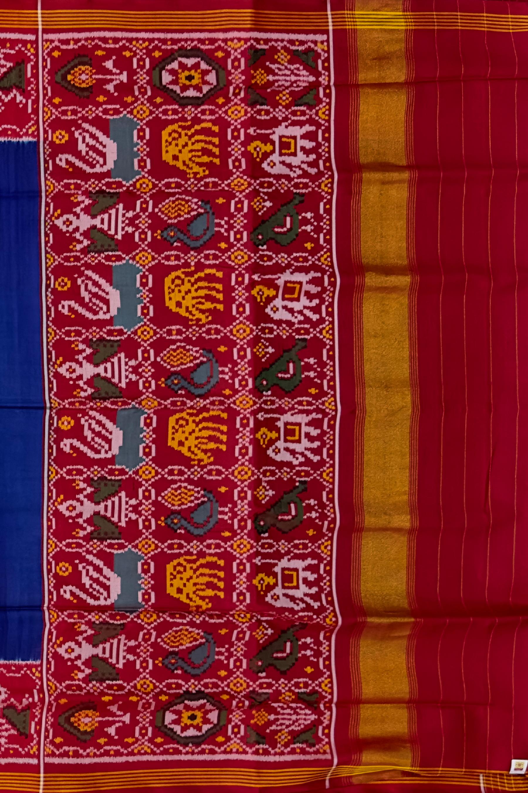 The Blue Navy Galo Semi Patan Saree is a stunning ensemble for important celebrations, with its rich navy blue and maroon colors and intricate Navratna designs.