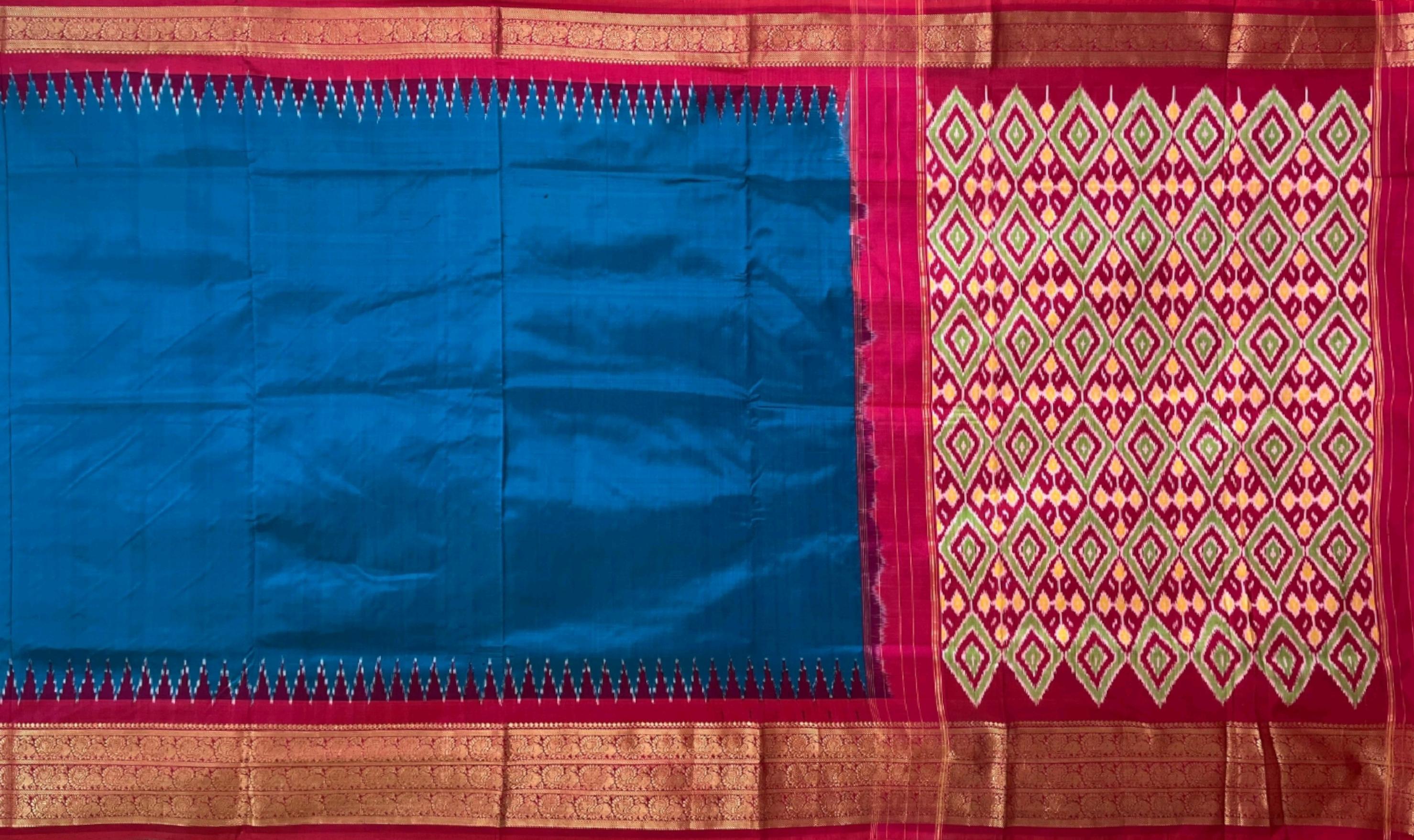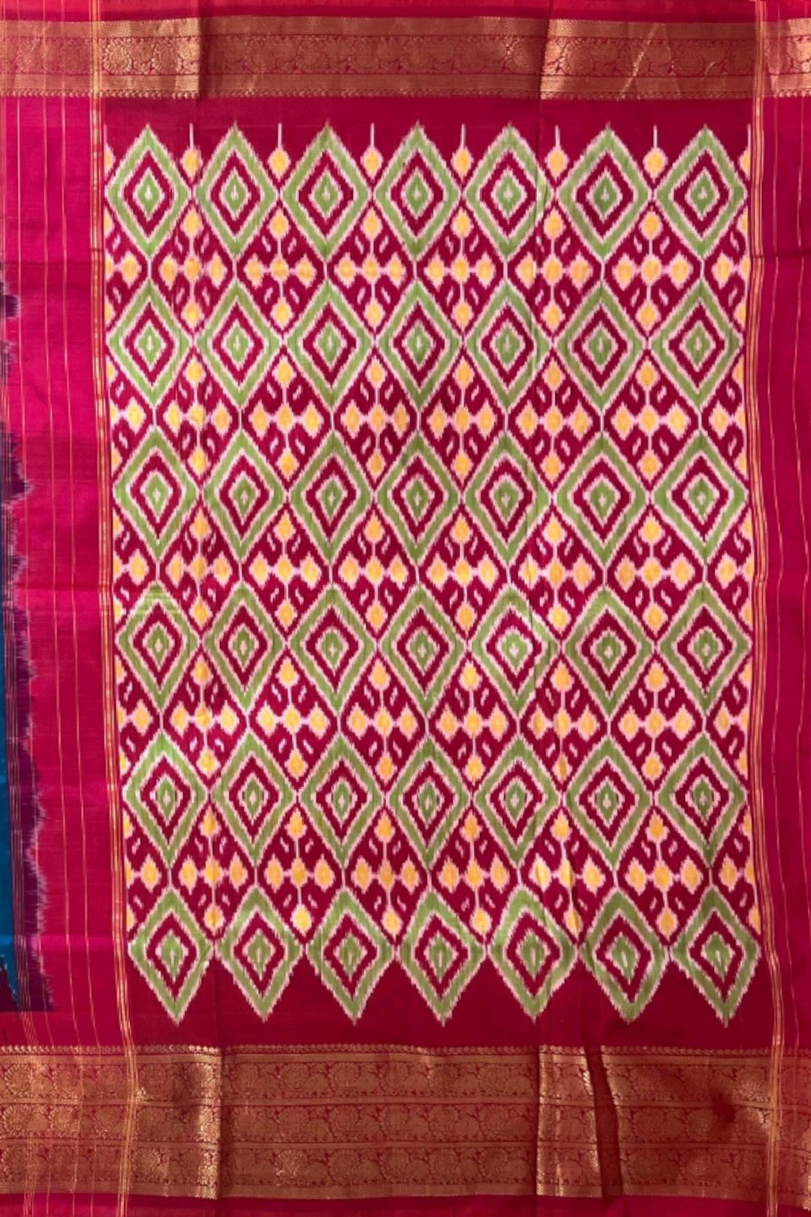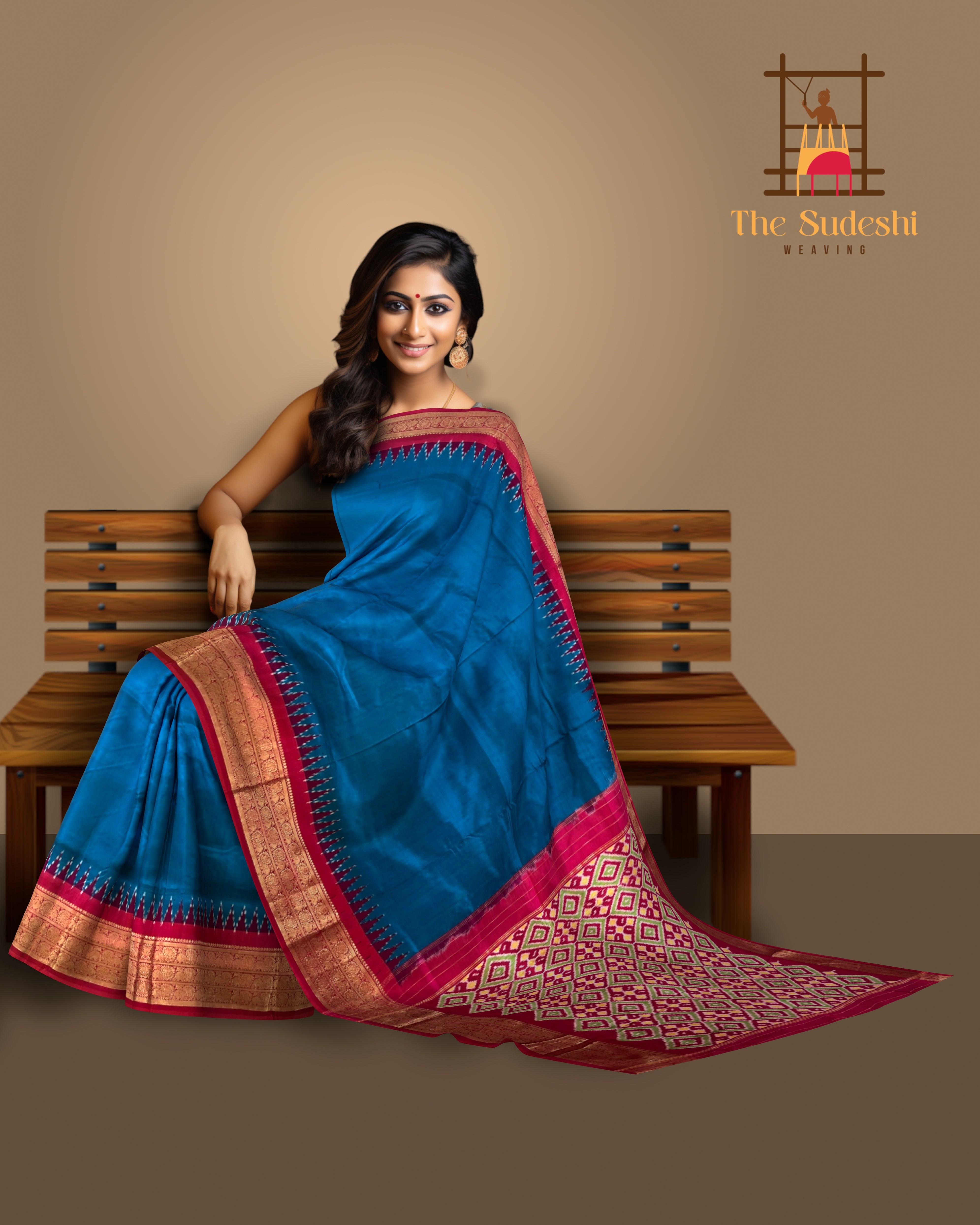 The Blue Pochampally Ikat Saree with its vibrant pink border and pallu is a delightful fusion of boldness and elegance. The rich blue body signifies depth and calm, while the bright pink accents infuse the saree with a playful, festive charm. Intricate ikat patterns across the saree add a layer of traditional craftsmanship, making it a visually appealing piece. Woven in Pochampally, Telangana, this saree is a fine example of the double ikat technique, where pre-dyed threads are meticulously woven to create harmonious and symmetrical patterns. Blue and pink together represent a balance of serenity and joy, making this saree ideal for versatile styling. This saree is perfect for festive celebrations, cultural events, or family gatherings. It pairs beautifully with a pink or gold blouse. Complete your look with statement jewelry, such as antique silver or temple designs, to complement the vibrant tones of the saree. Note: The appearance of the product’s colors may vary due to lighting conditions or your device’s screen calibration. For further assistance or additional images/videos, feel to contact us at +91 97897 60367 / +1 (945) 308-5962 or email at wecare@thesudeshiweaving.com.