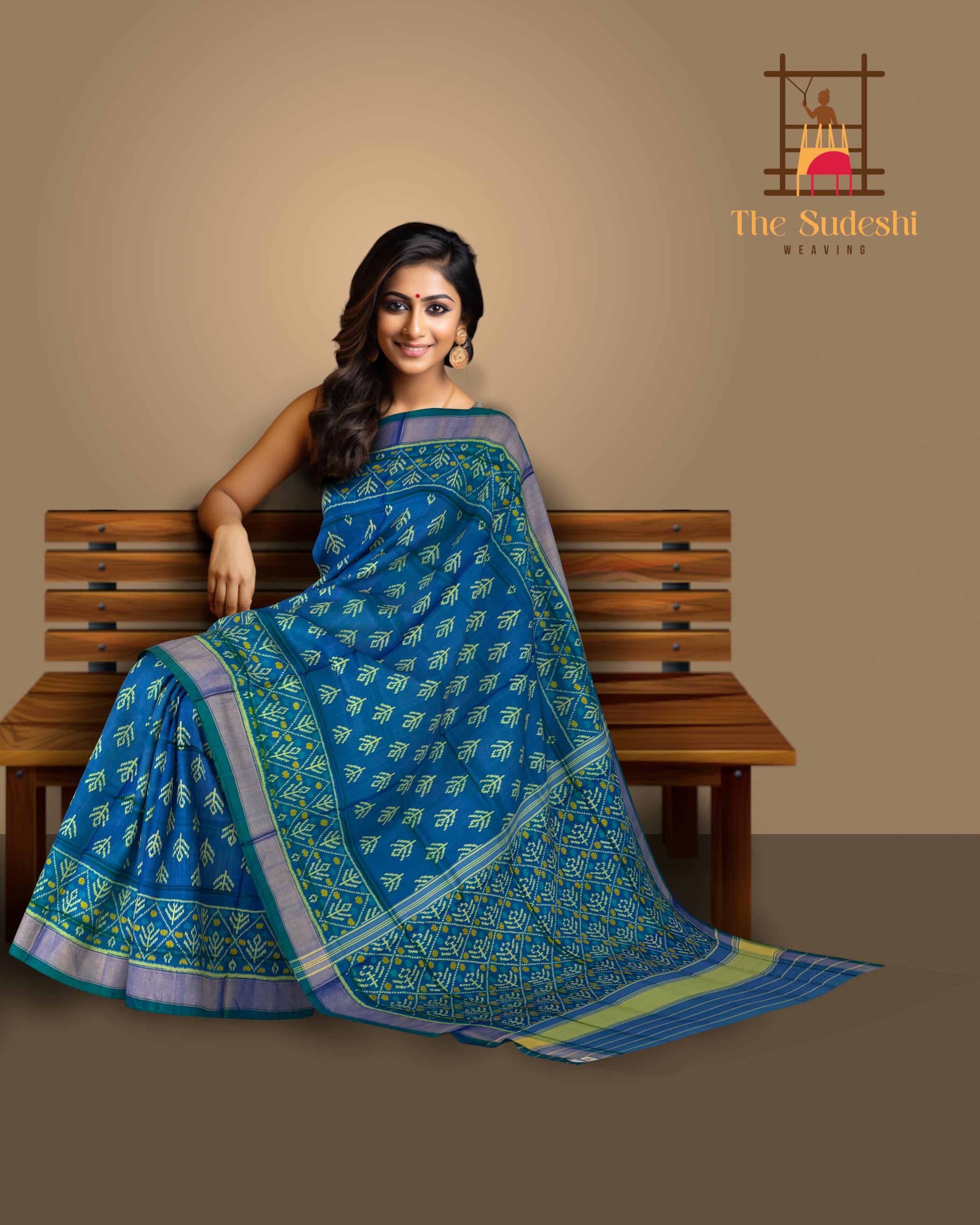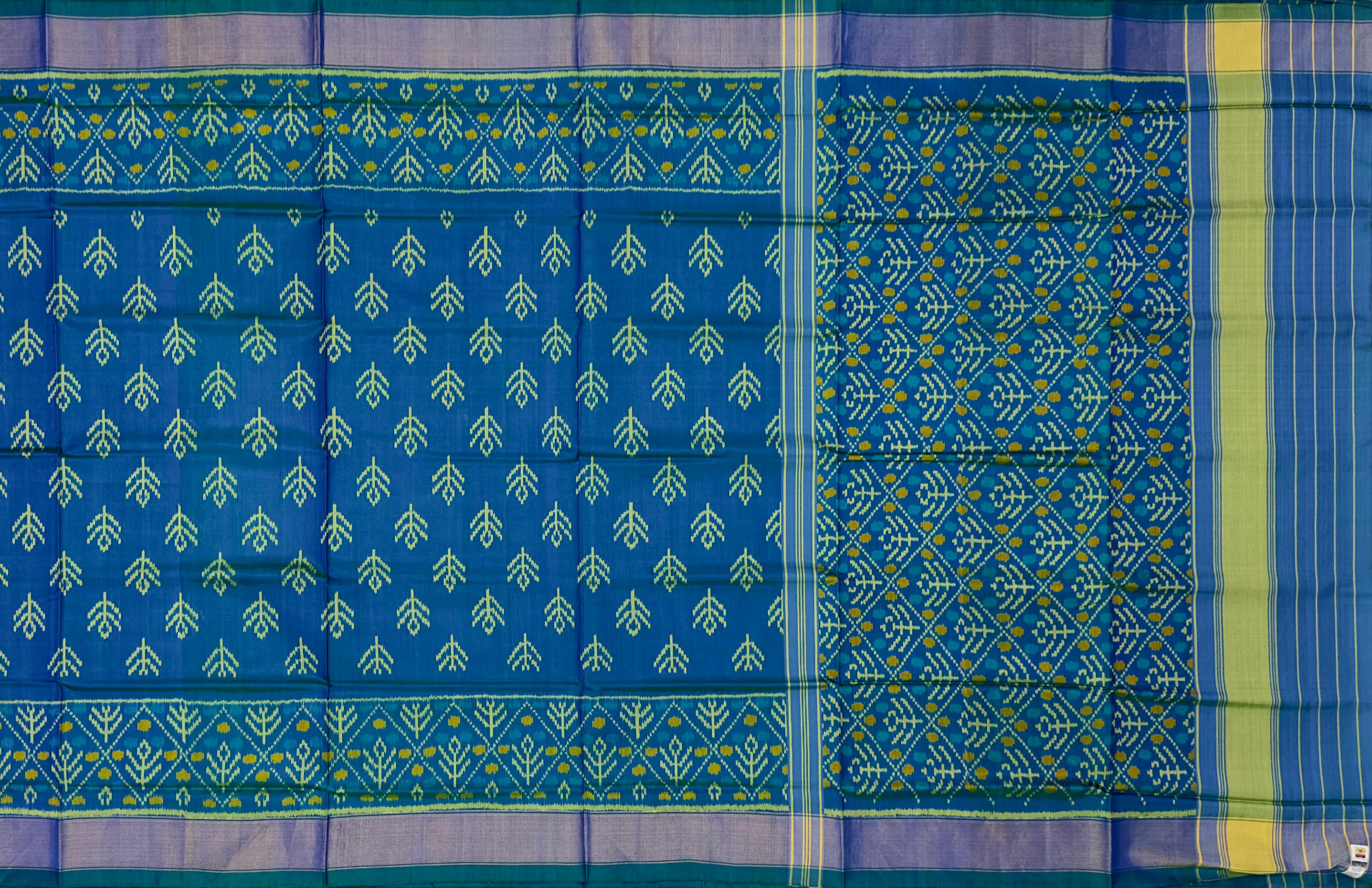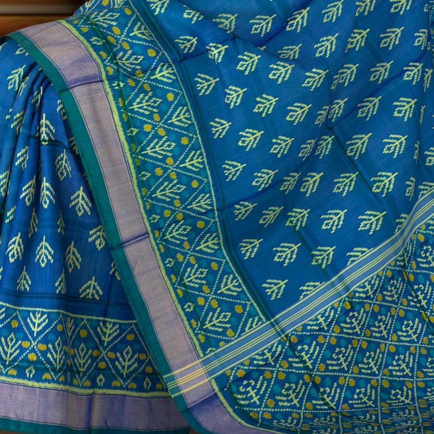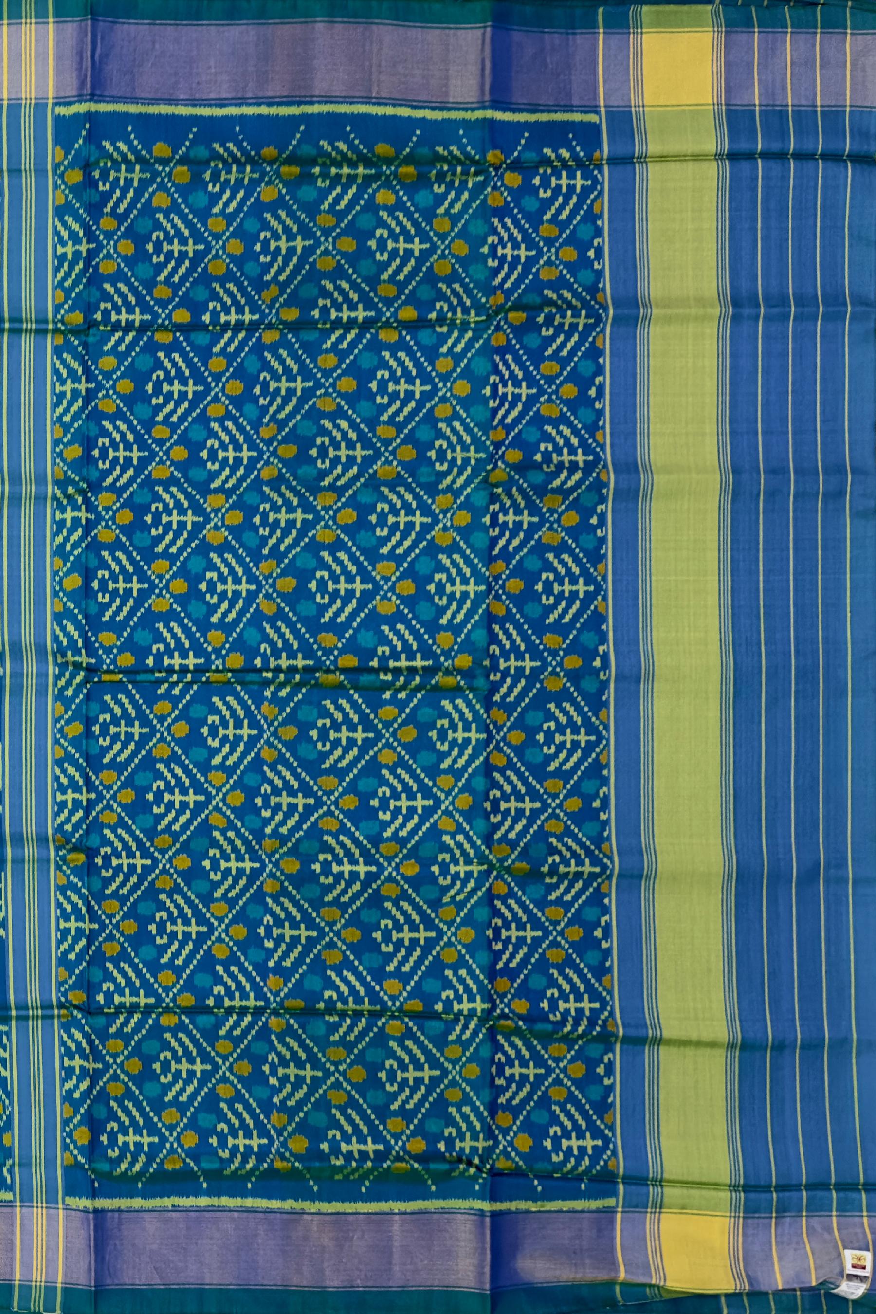 This Green Blue Rajkot Patola Saree captures the essence of the ocean with its 'Small Shanku' design, making it a sublime piece for any wardrobe. Crafted for the discerning woman, it's perfect for events that call for a unique blend of traditional art and modern sophistication.