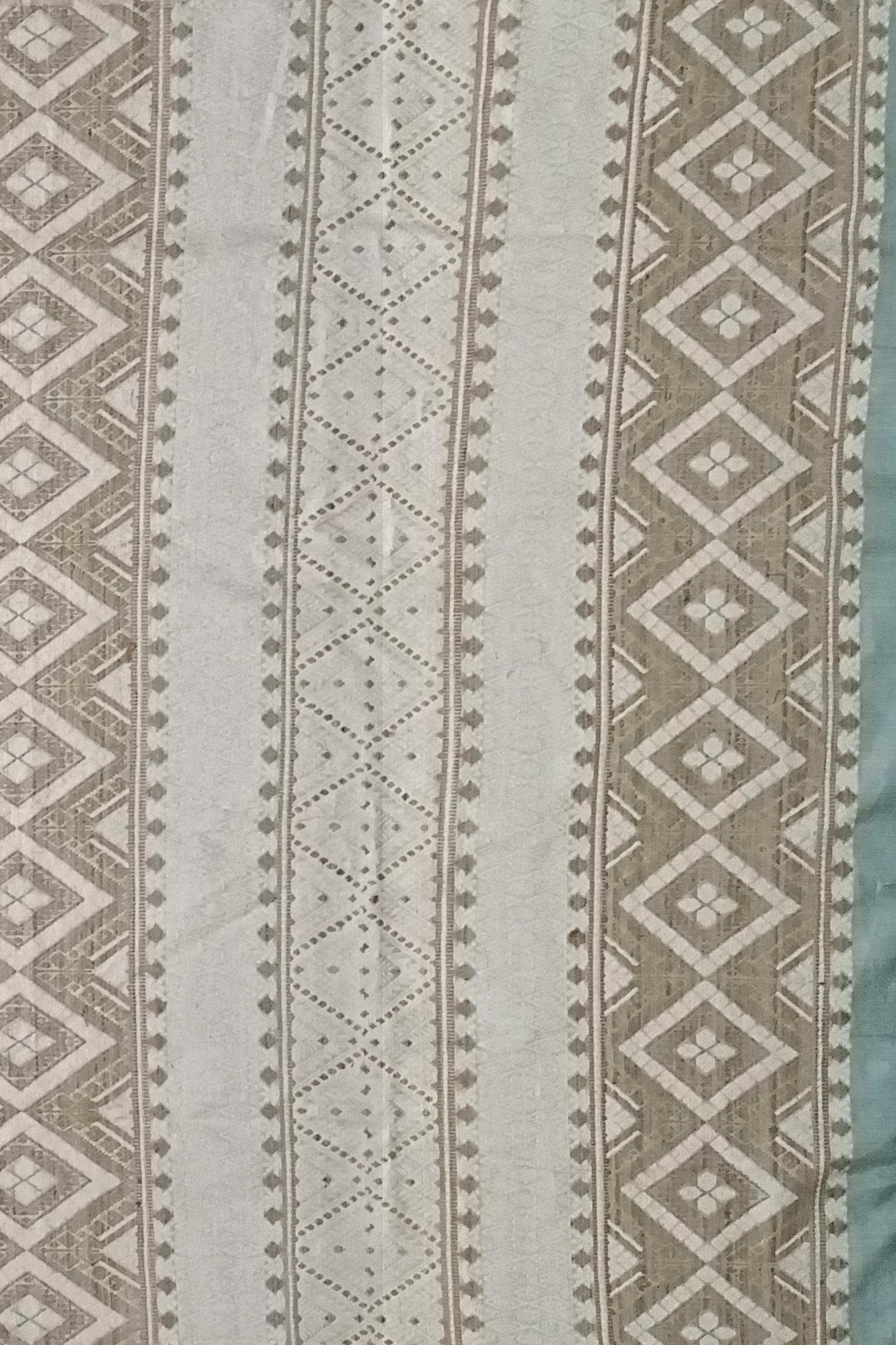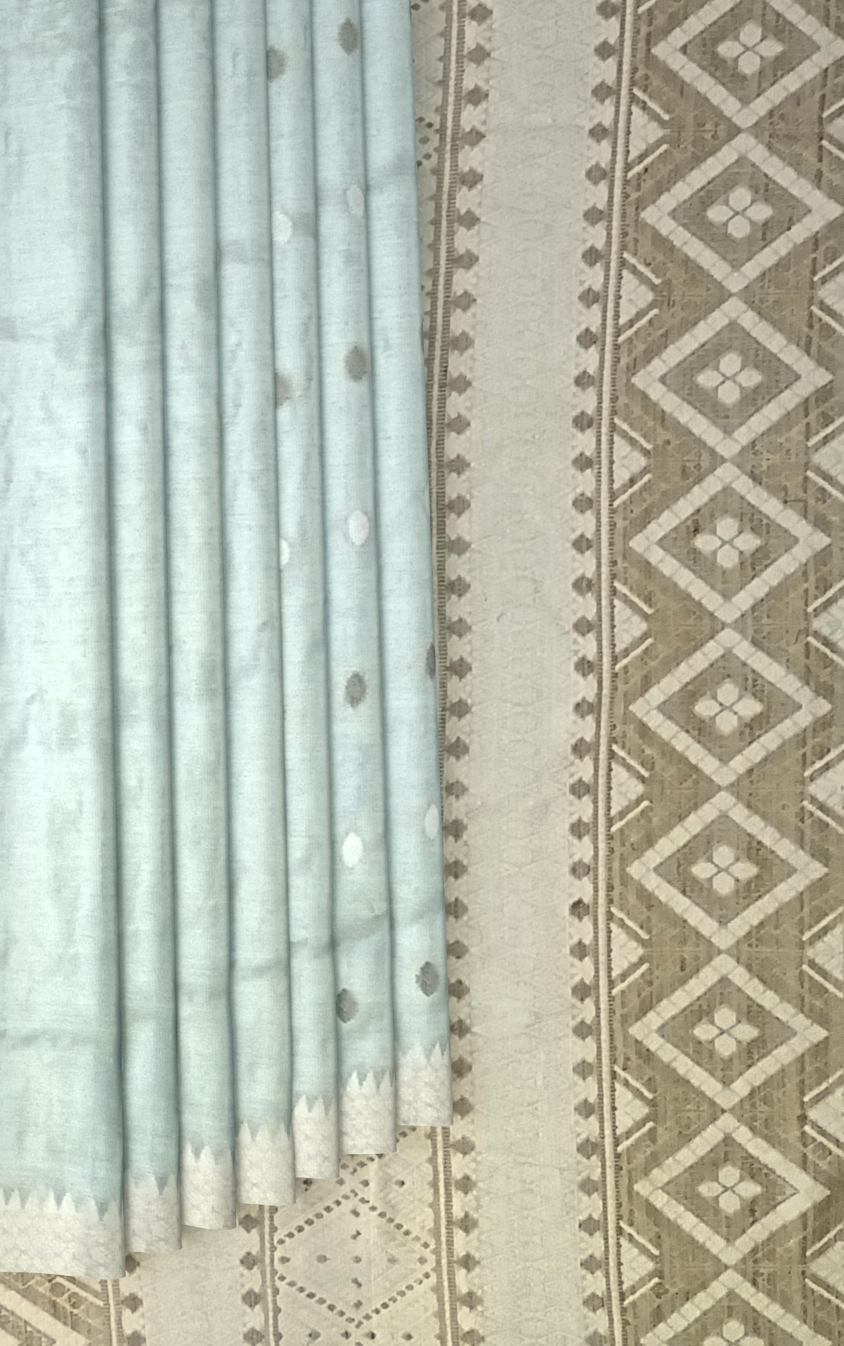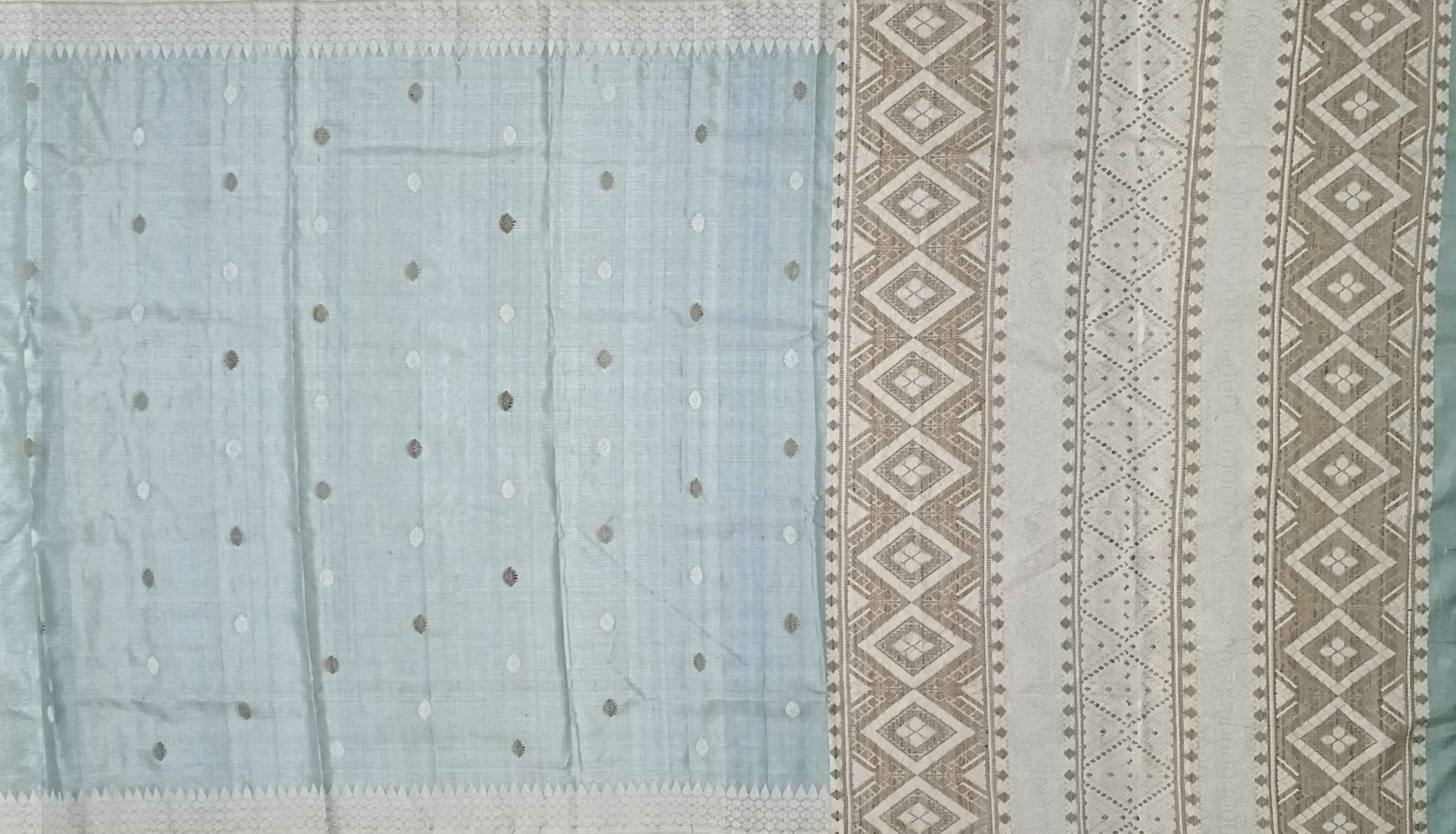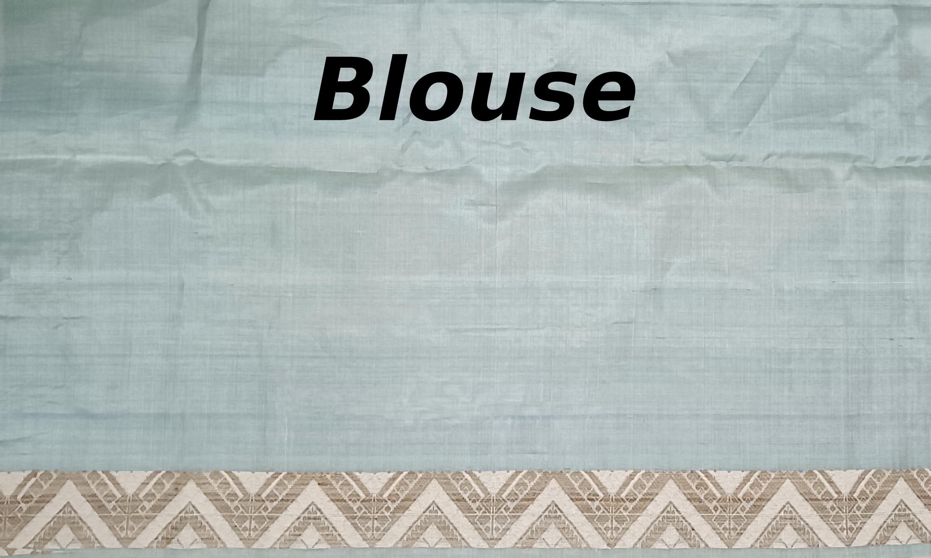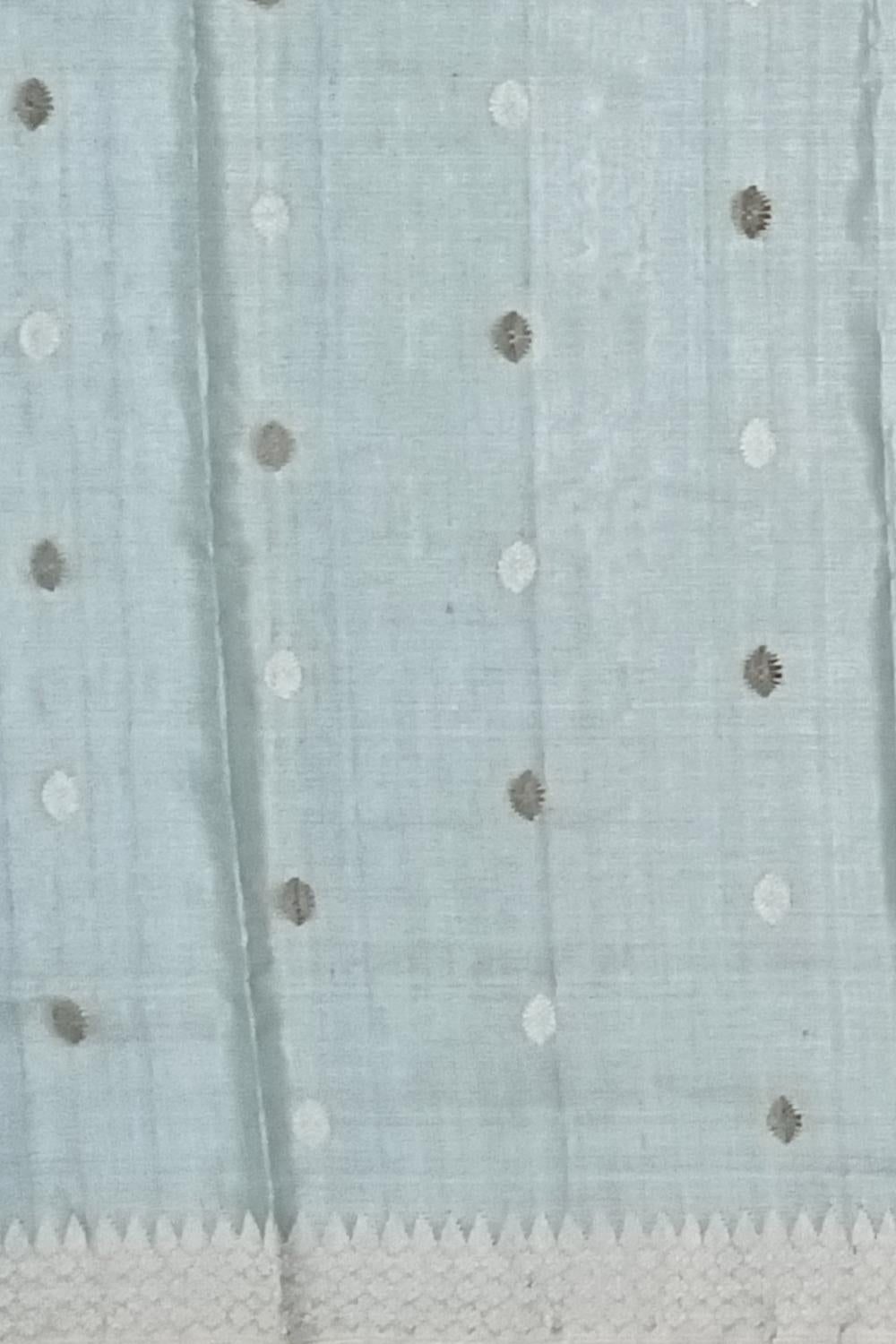 Dive into the serene elegance of this blue Tussar saree from Assam, featuring a soothing combination of off-white in its border and pallu. Adorned with delicate buttis and motifs, the saree embodies the artistic finesse of Assamese weaving traditions. Its cool tones and classic design make it a versatile piece, suitable for both formal and festive occasions.