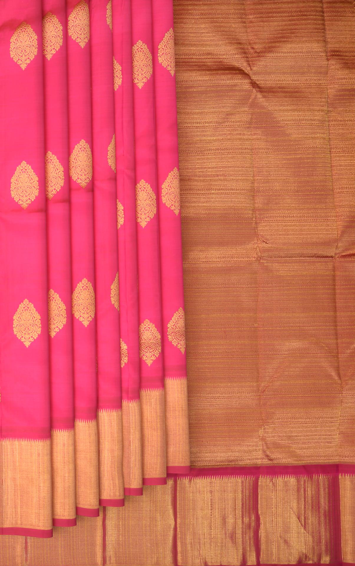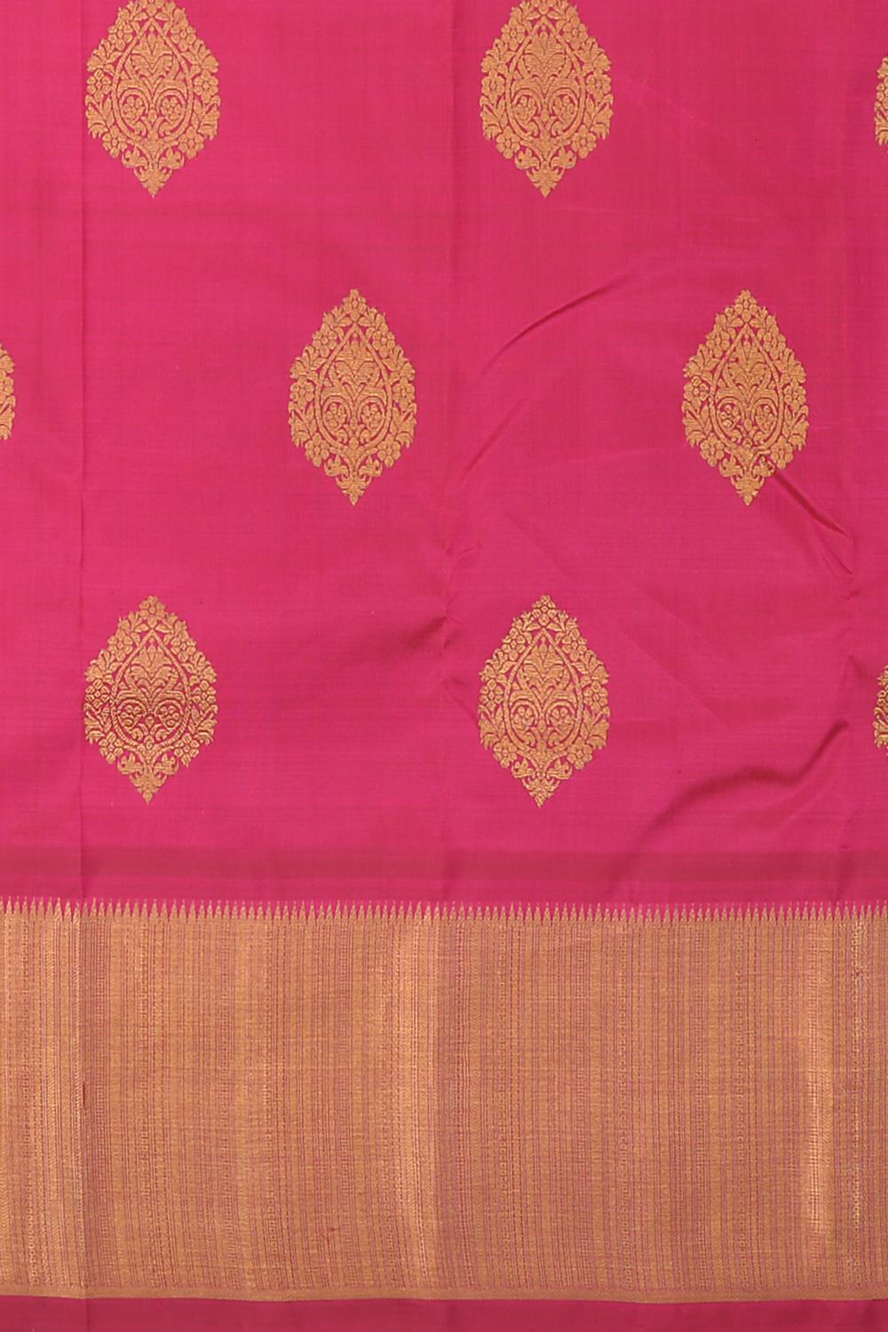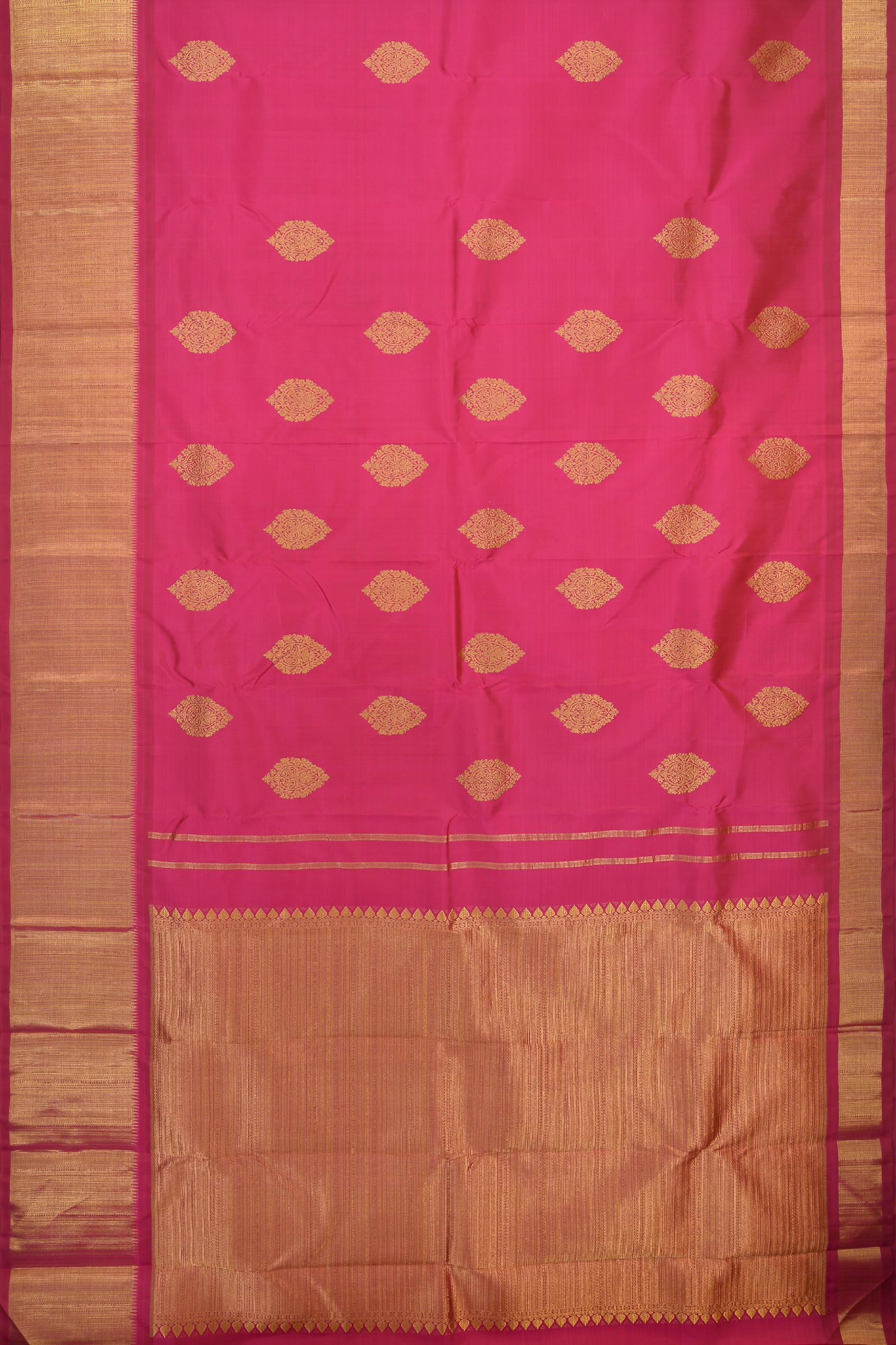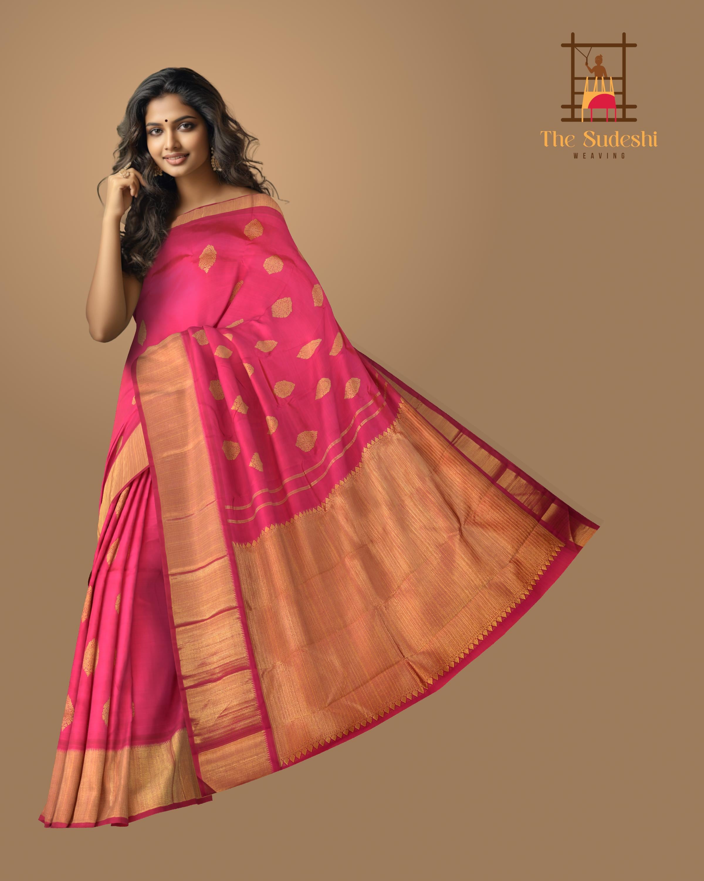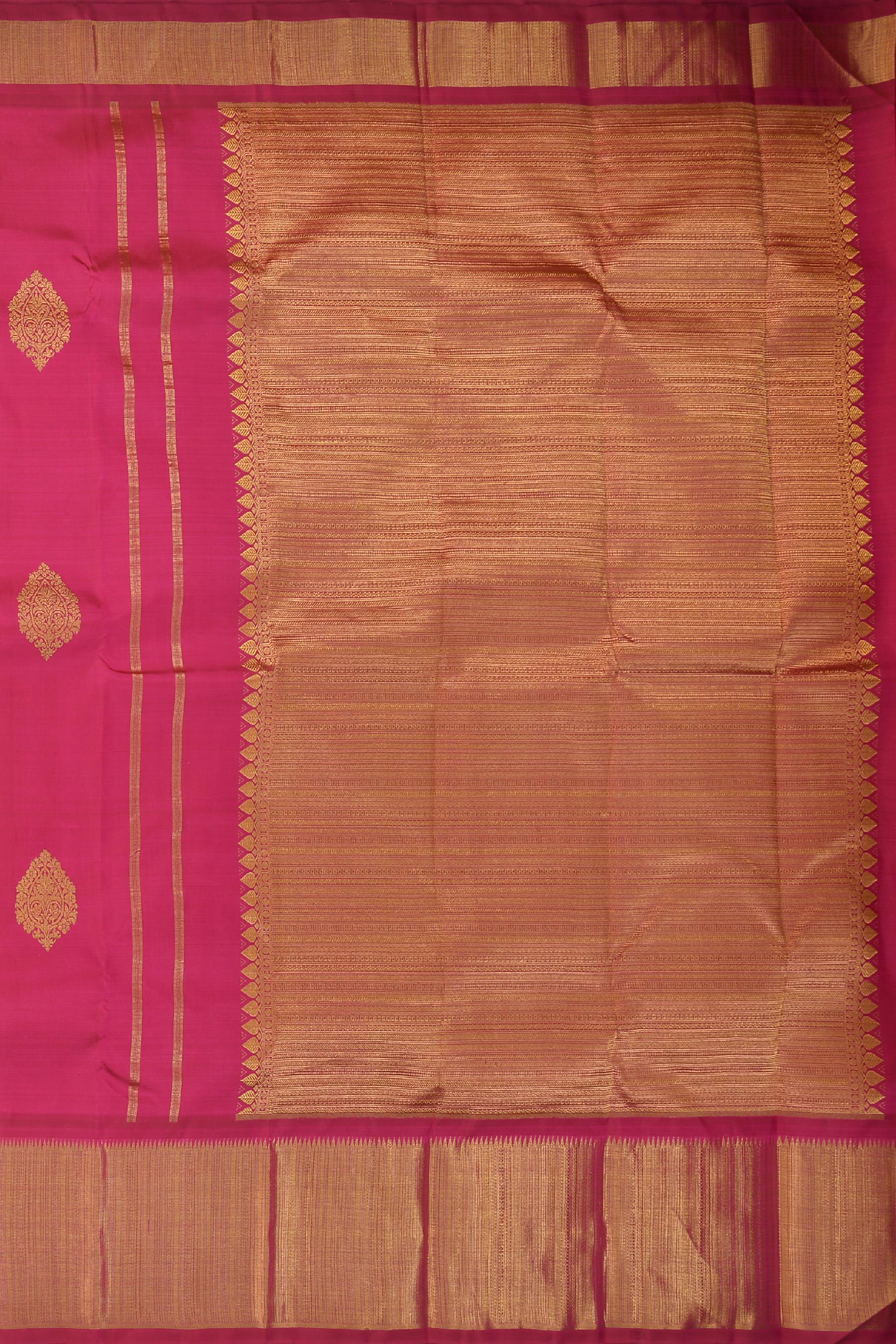 The self-colored pallu is intricately designed with varisapet, a display of weaving wizardry that tells a story with every thread. It is grand, intricate, and meticulously crafted to be the crowning glory of the saree.