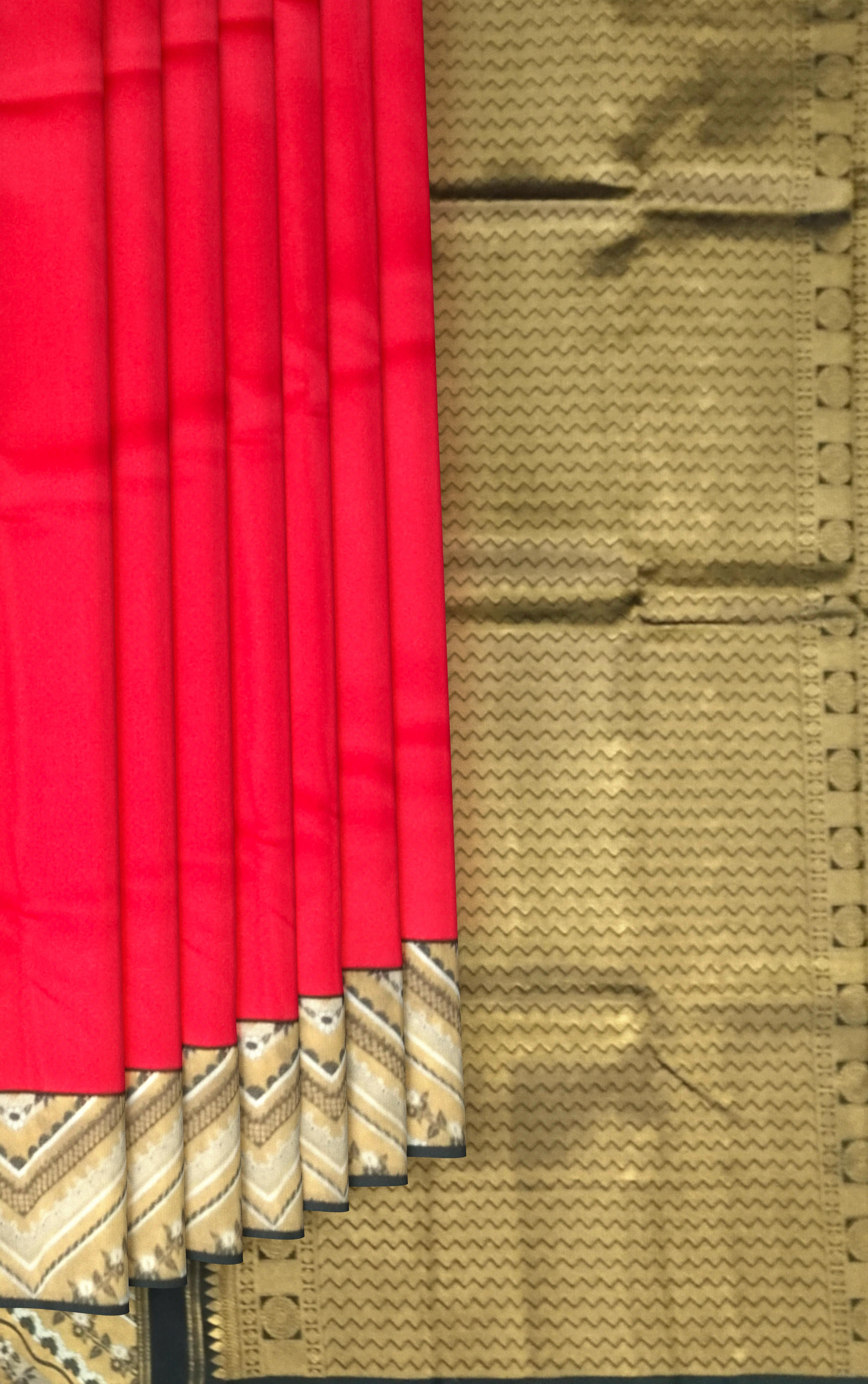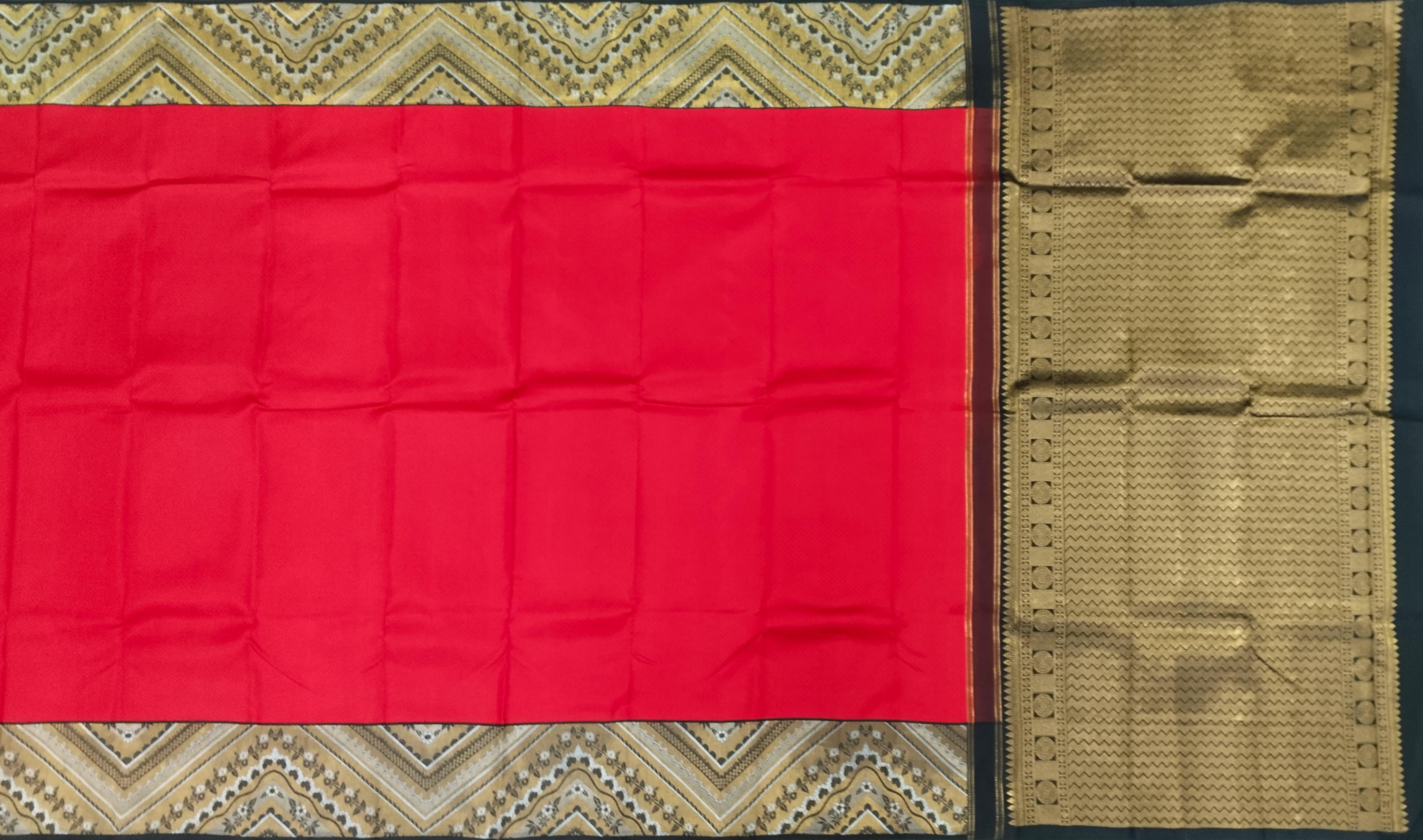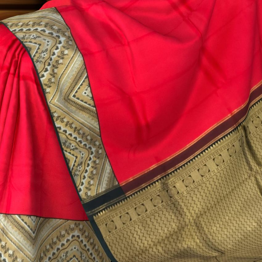 Red and black have long been revered in Indian textiles for their powerful symbolism—red signifies love and auspiciousness, while black represents strength and mystery. The seamless blend of these colors in this saree creates a mesmerizing effect, making it an ideal choice for both modern and traditional wardrobes. The fine silk weave ensures a smooth drape, enhancing the wearer's grace.