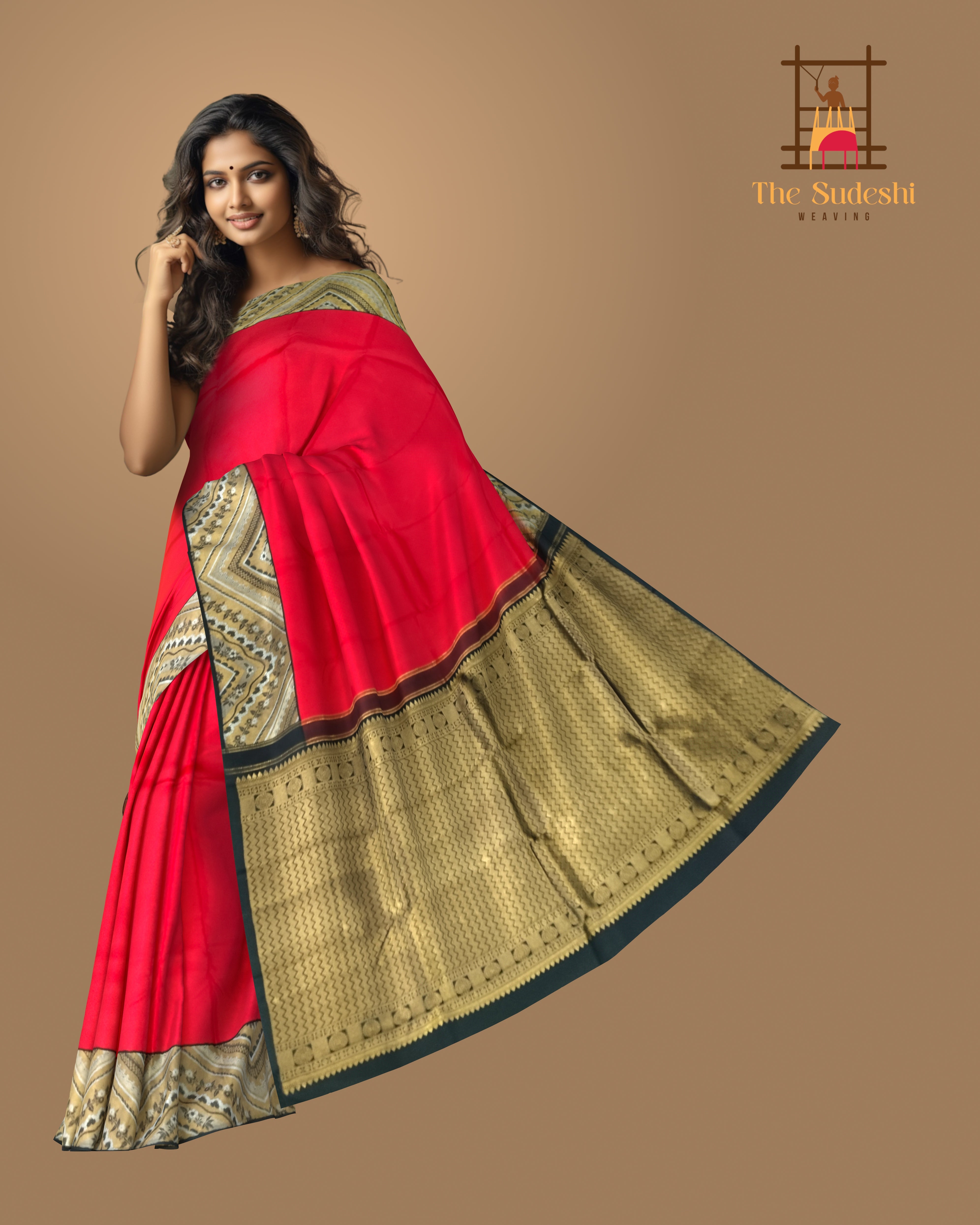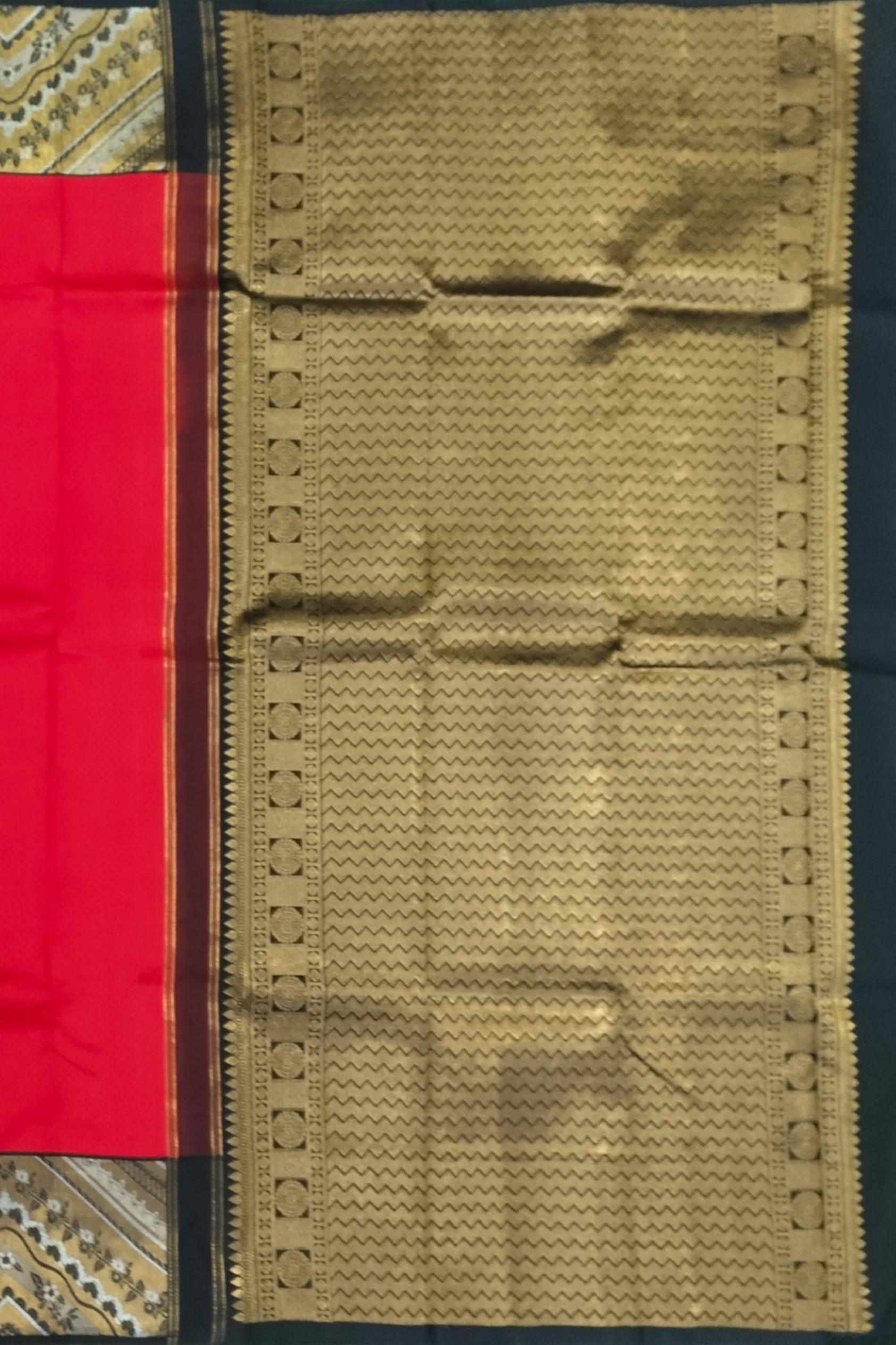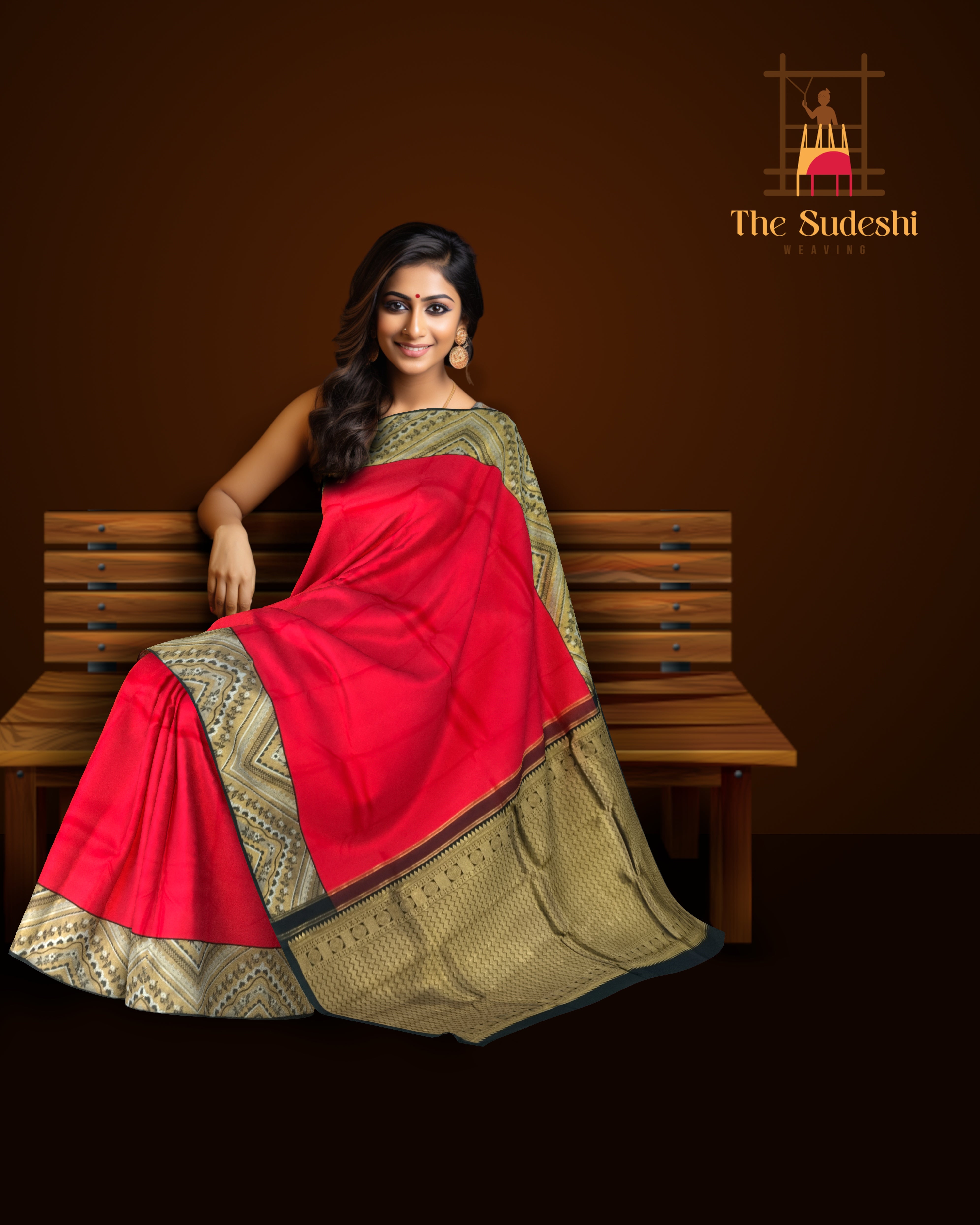 Make a striking statement with this red Kanchipuram silk saree, a symbol of passion and elegance. The deep red body exudes a bold yet sophisticated charm, while the contrasting black pallu adds a dramatic flair. Crafted with precision, this saree embodies the richness of Kanchipuram weaving, making it an essential piece for those who love timeless classics.