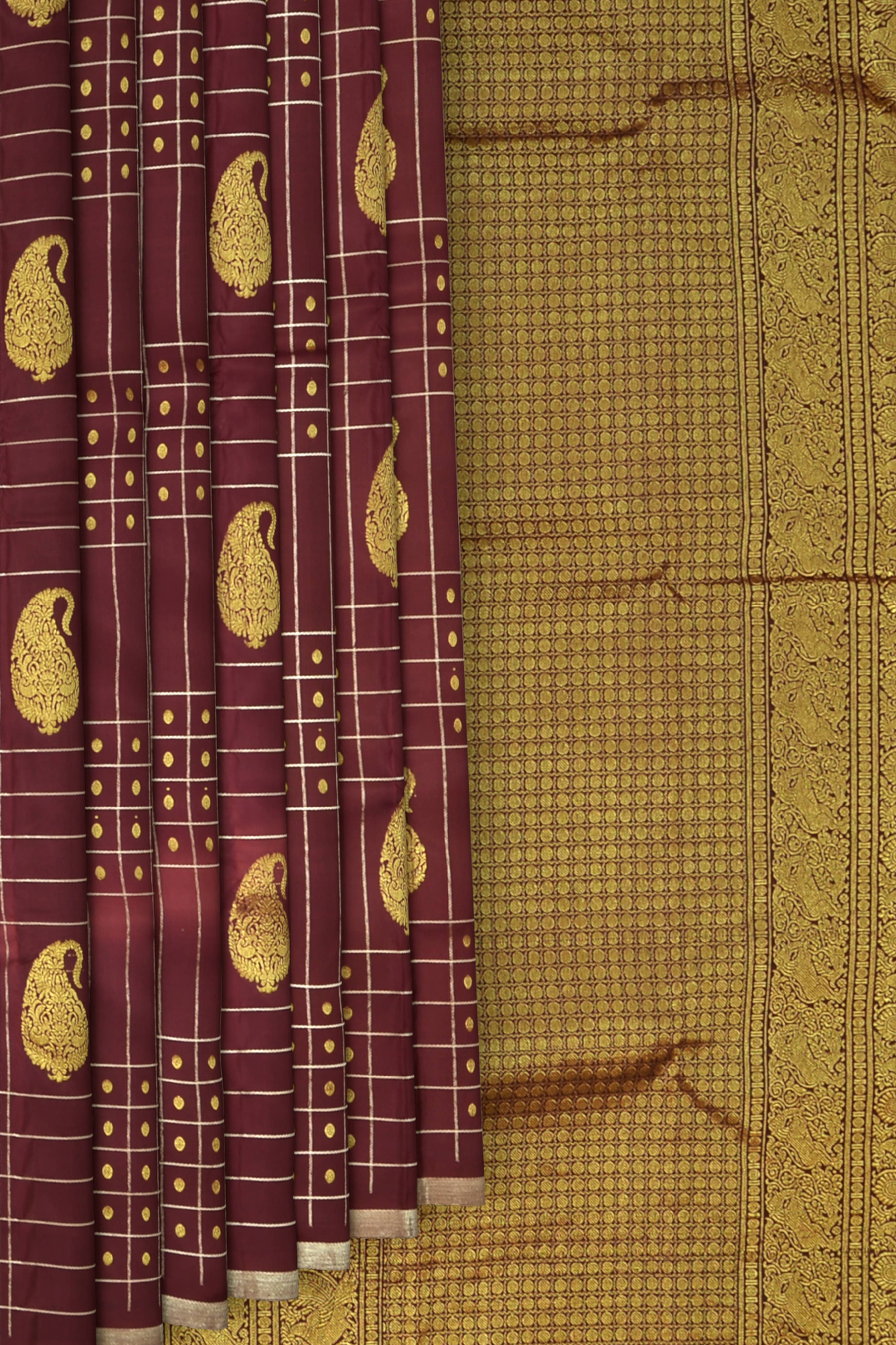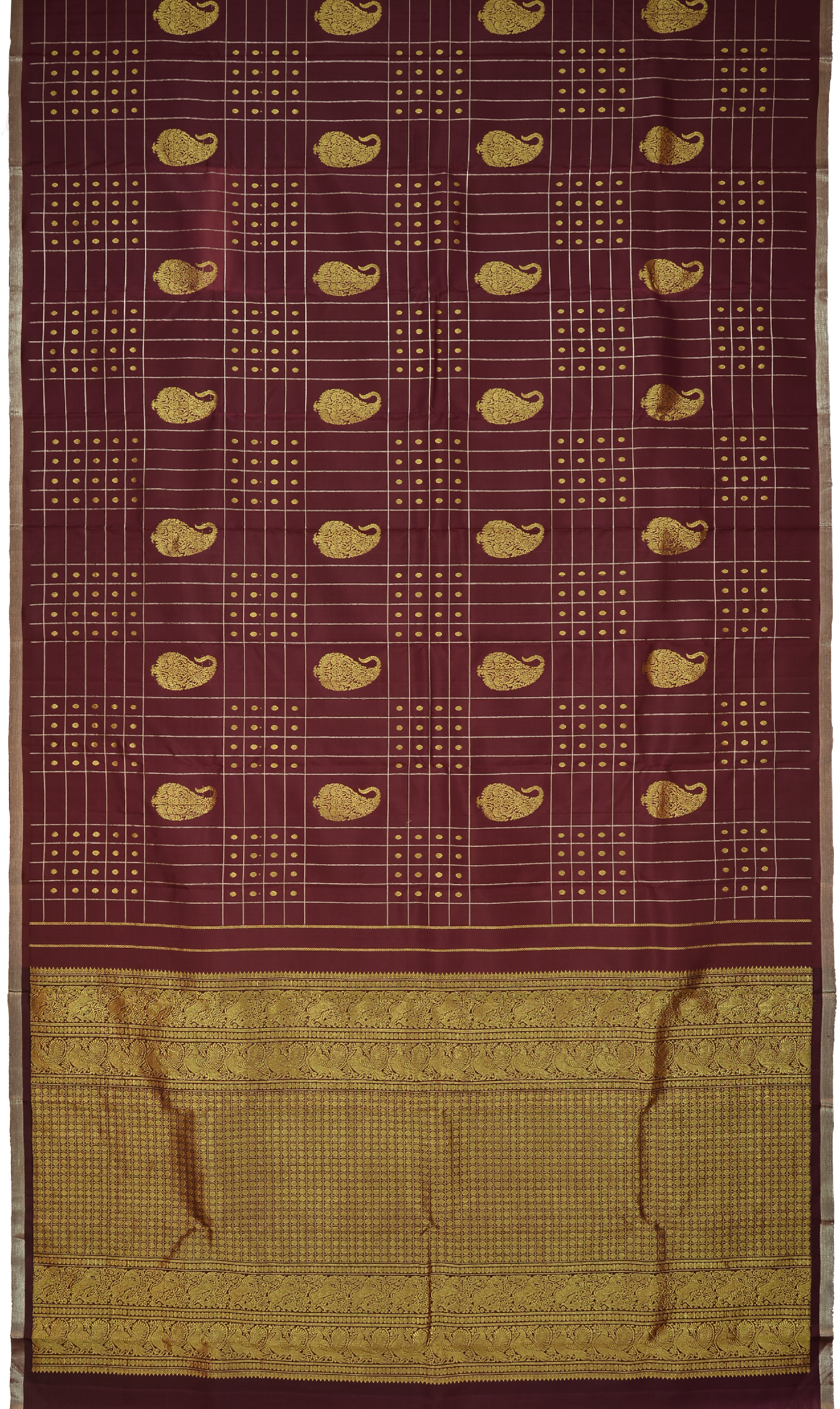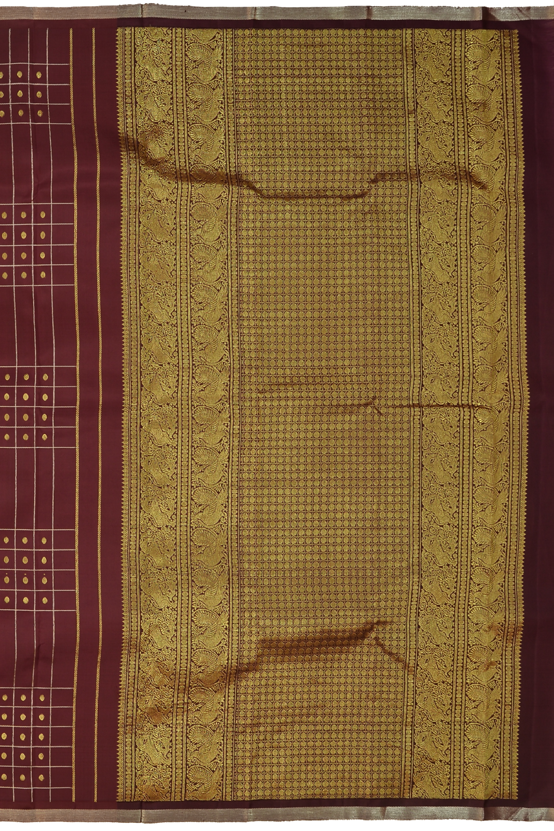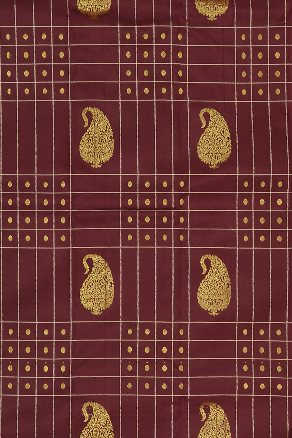 Wrap yourself in the elegance of this pristine Kanchipuram silk saree. The maroon hue evokes a sense of royal allure, amplified by the timeless checks pattern that sprawls across its body. Every detail, every weave narrates a story from our country's rich tapestry of traditions.