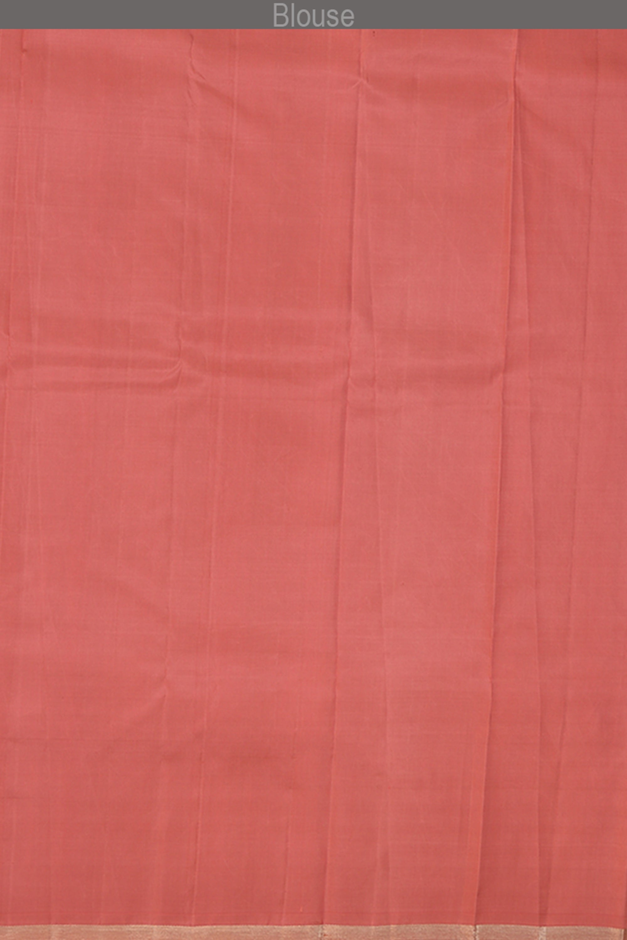 The saree sports a borderless design, making it a contemporary twist on classic motifs. The pallu becomes a canvas of grandeur as maroon embraces silver to bring forth majestic patterns of peacocks, elephants, and Rudraksham checks.