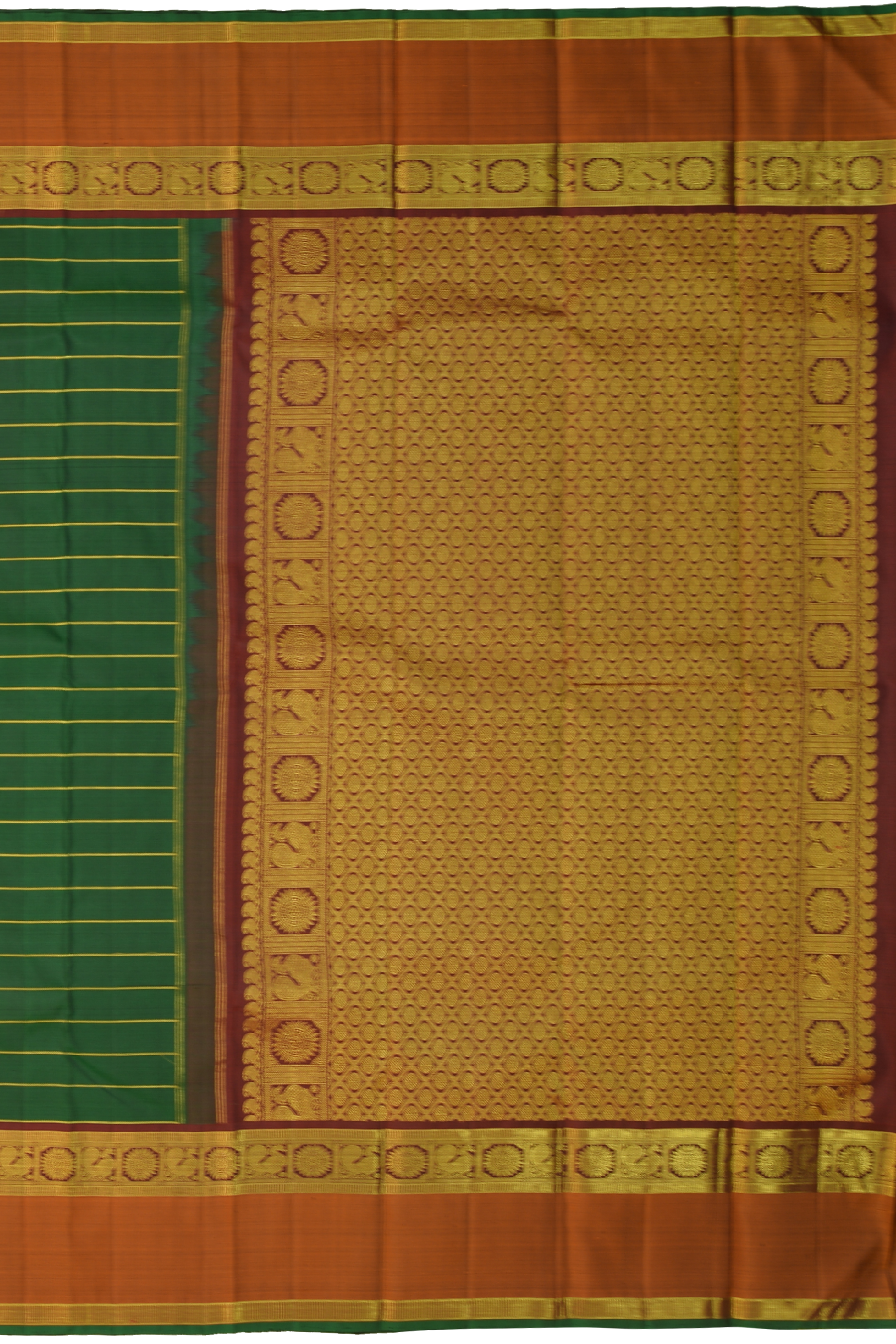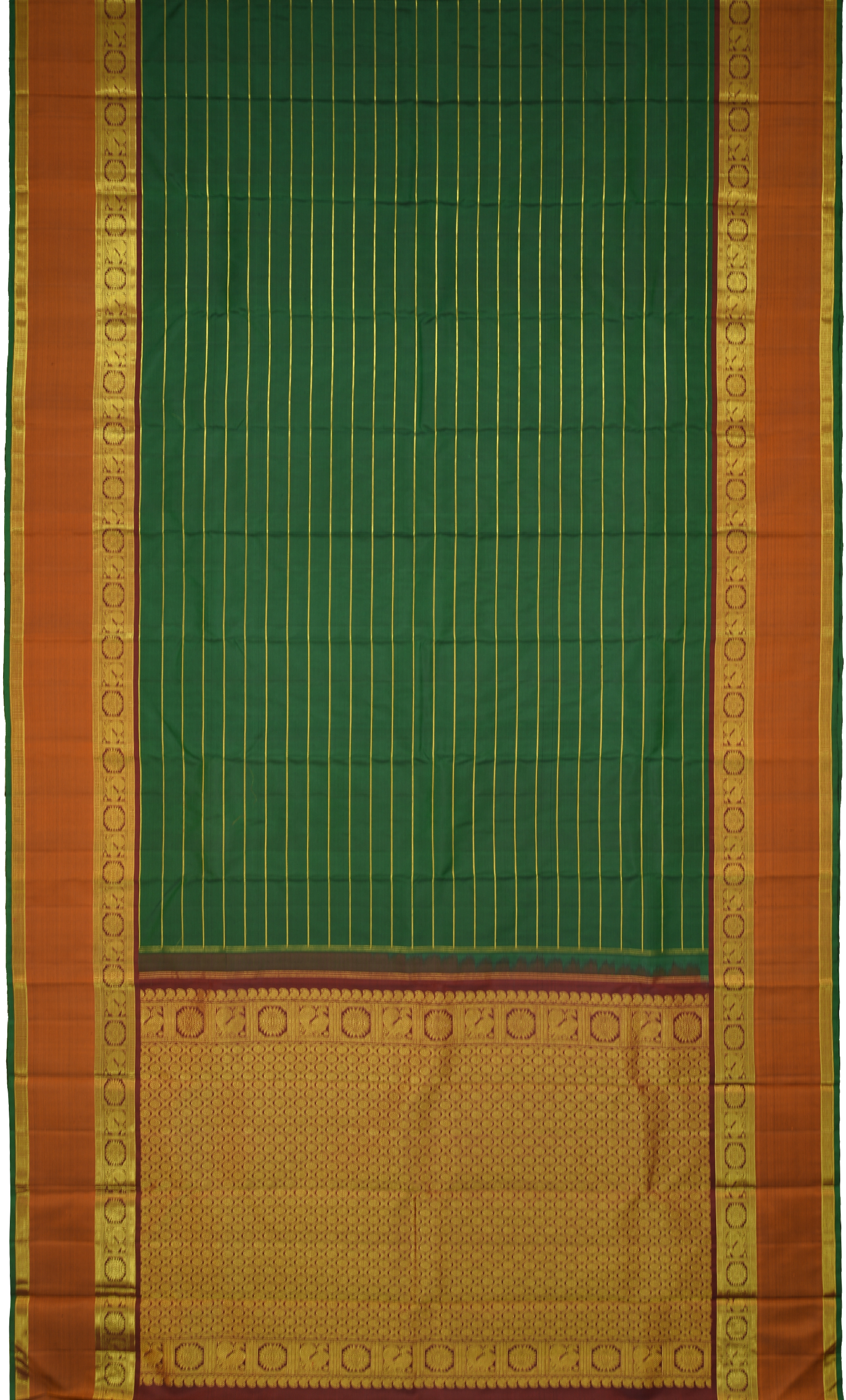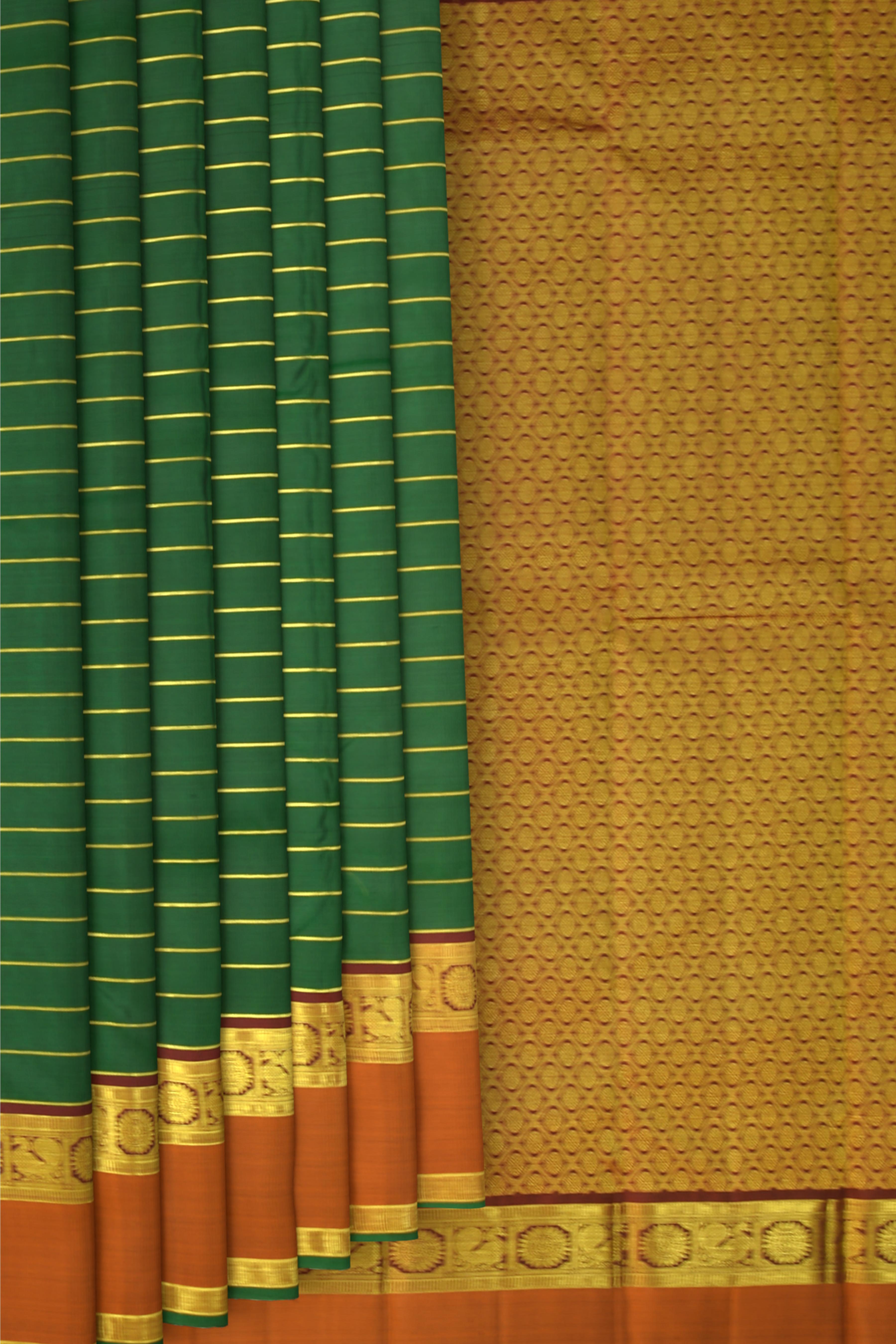 Plunge into the depths of weaving heritage with this mesmerizing Bottle Green saree. The Waves design on the body intertwined with Horizontal Neli narrates tales of ancient India. The Annam and Rudraksham border, painted in hues of Orange and Maroon, adds a layer of contrast and beauty.