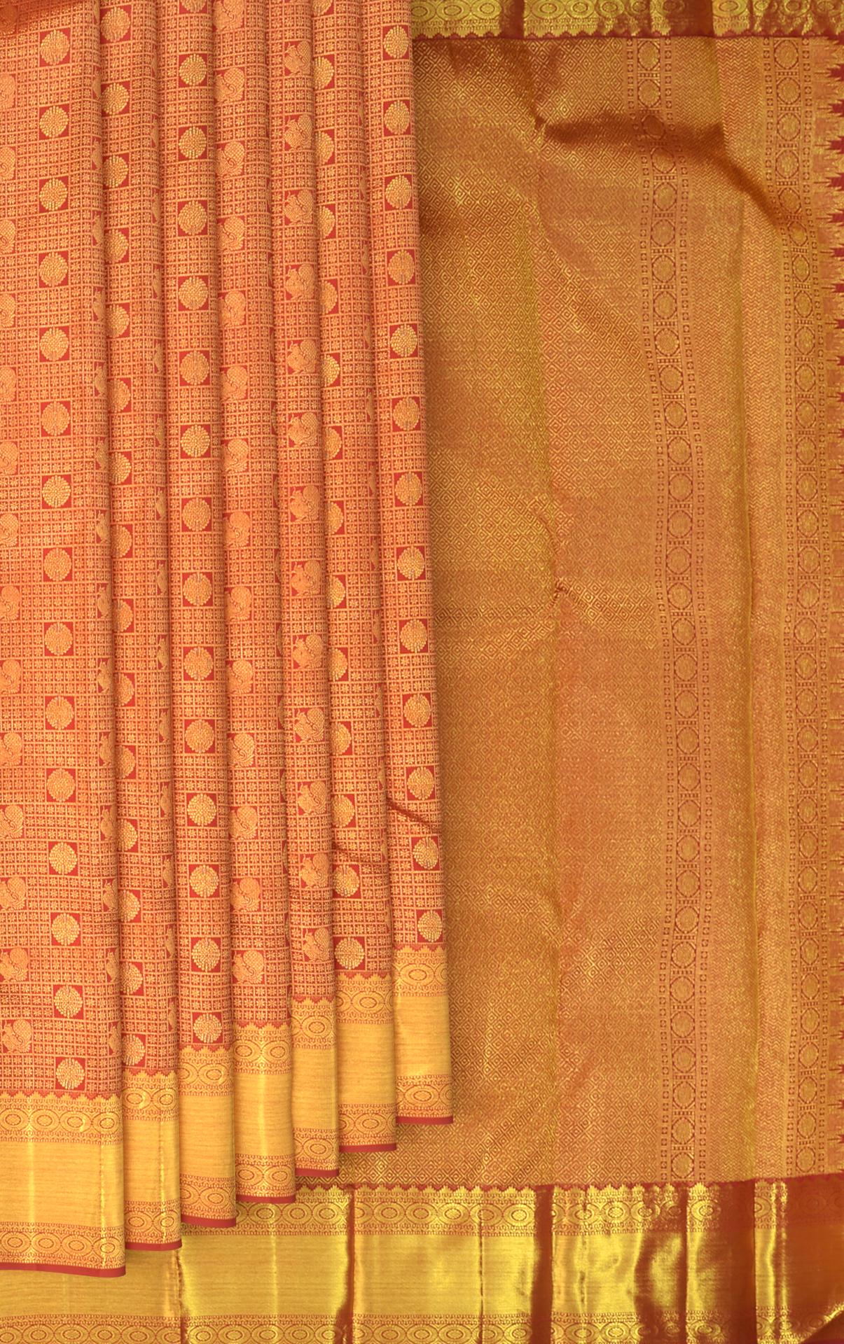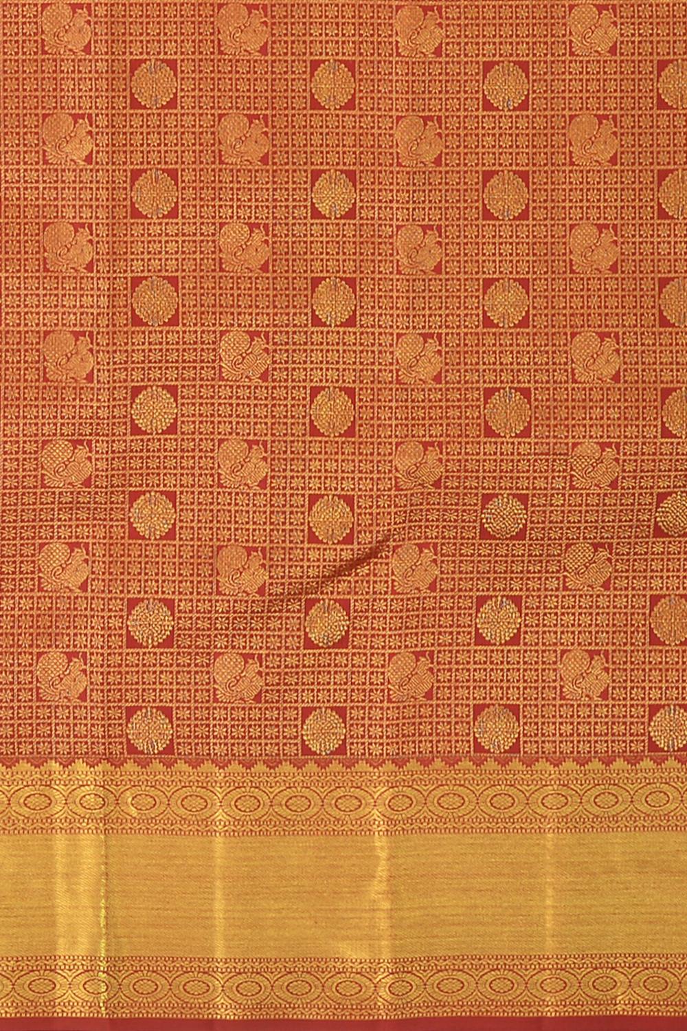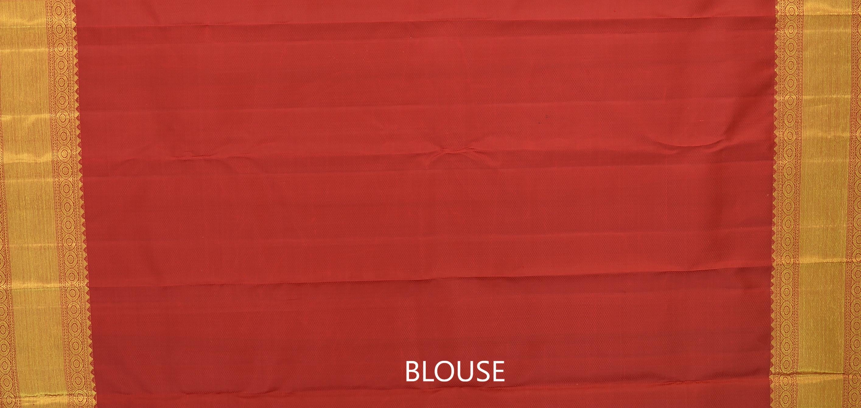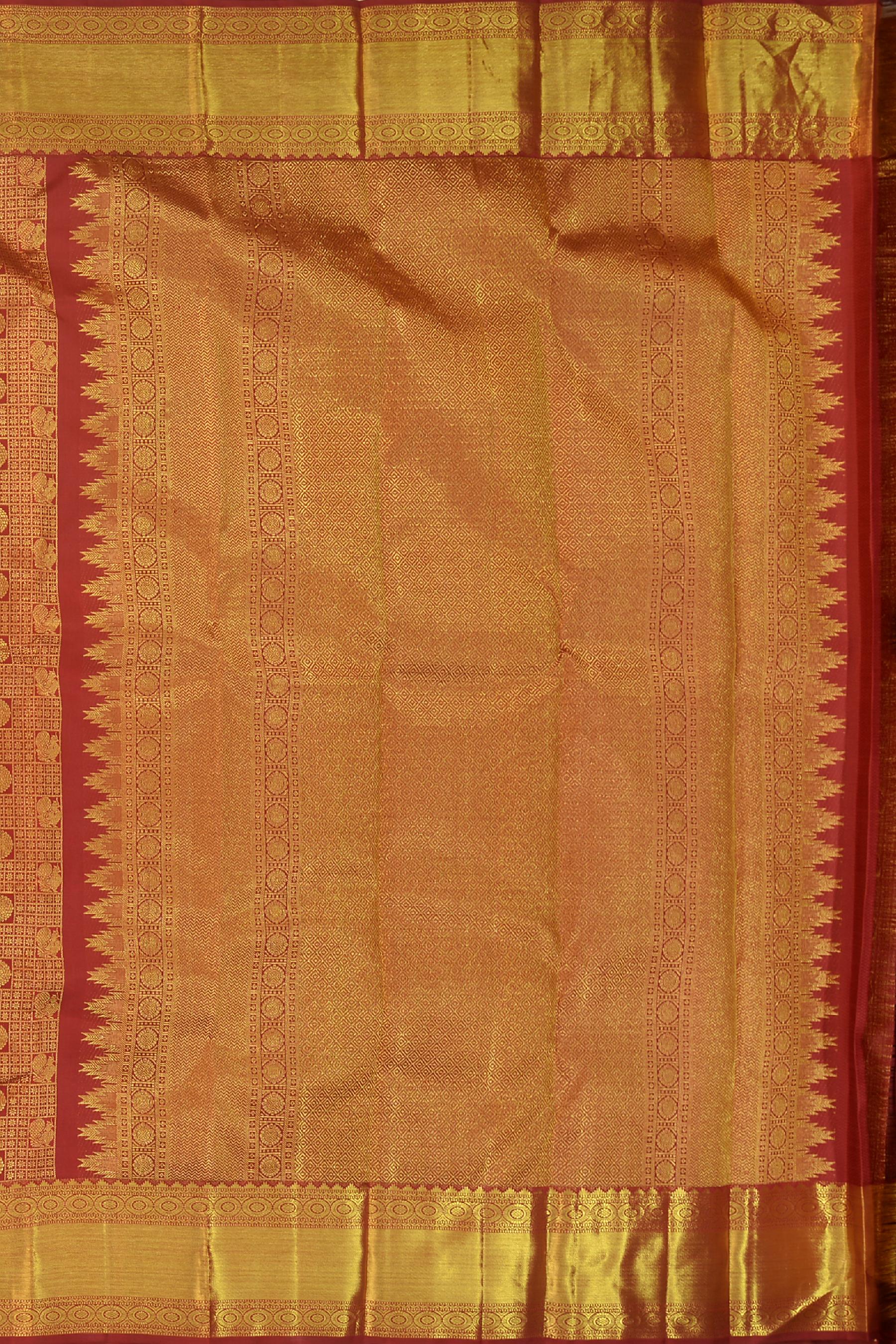 Embrace the warmth and richness of our Brick Red Kancheevaram silk saree. The Jacquard body with checks weaves a narrative of the rich Indian heritage, each check holding a story within its folds. Embedded with Checks, Rudraksham, and Annapakshi motifs, this saree is a symbol of elegance, spirituality, and timeless beauty.