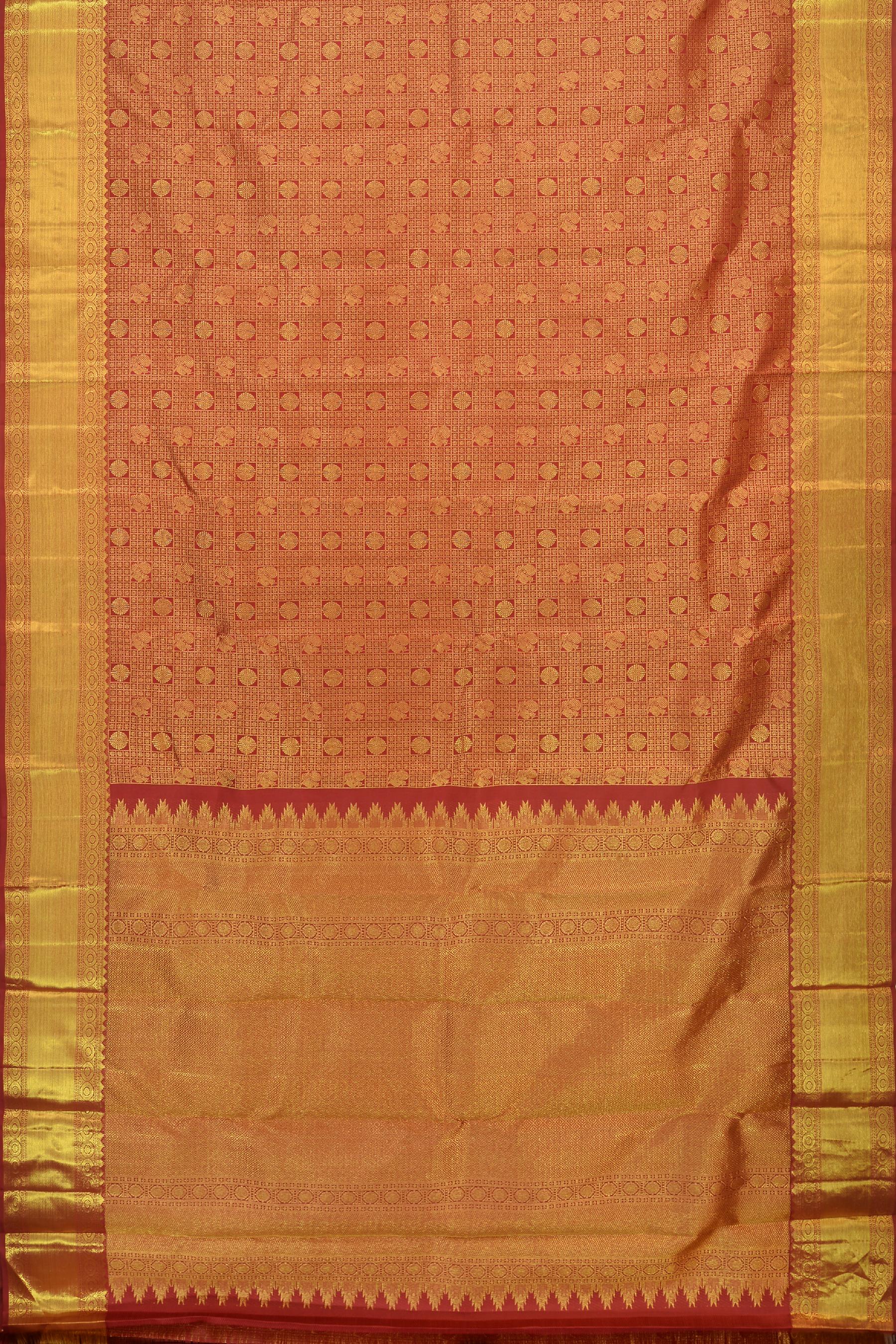 The self-colored border is complemented by the Benaraspet and Kamalam design, which flows into a grand diamond-designed pallu with Rudraksham motifs. This saree is a garment of heritage and sophistication, perfect for events where tradition takes center stage.
