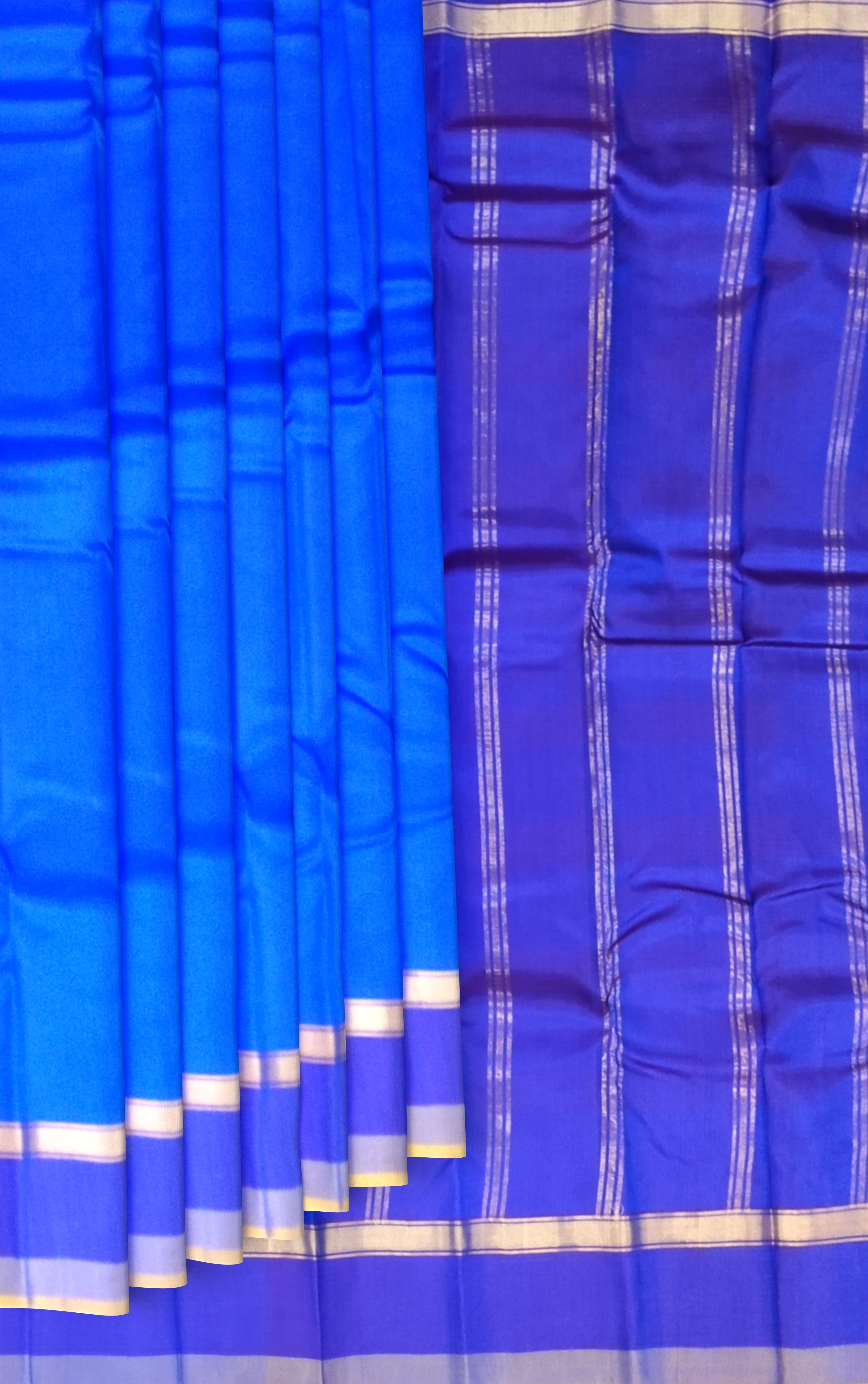 This Bright Blue Kanchipuram Silk Saree exudes effortless charm with its plain, luminous silk body contrasted by a dark blue border and pallu. The monochrome-inspired combination adds depth and refinement, making it a timeless addition to any festive wardrobe. The sheen of pure silk enhances its regal elegance, ideal for both formal and festive occasions. Kanchipuram pure silk sarees are celebrated for their intricate weaving and luxurious texture. Handcrafted by expert weavers, each saree represents a rich legacy of traditional craftsmanship passed down through generations. Pair this saree with a dark blue or silver blouse to accentuate its royal appeal. Style it with statement earrings and bangles for a polished look suitable for celebrations, weddings, and cultural functions. Note: The appearance of the product’s colors may vary due to lighting conditions or your device’s screen calibration. For further assistance or additional images/videos, feel free to contact us at +91 97897 60367 or email at wecare@thesudeshiweaving.com.