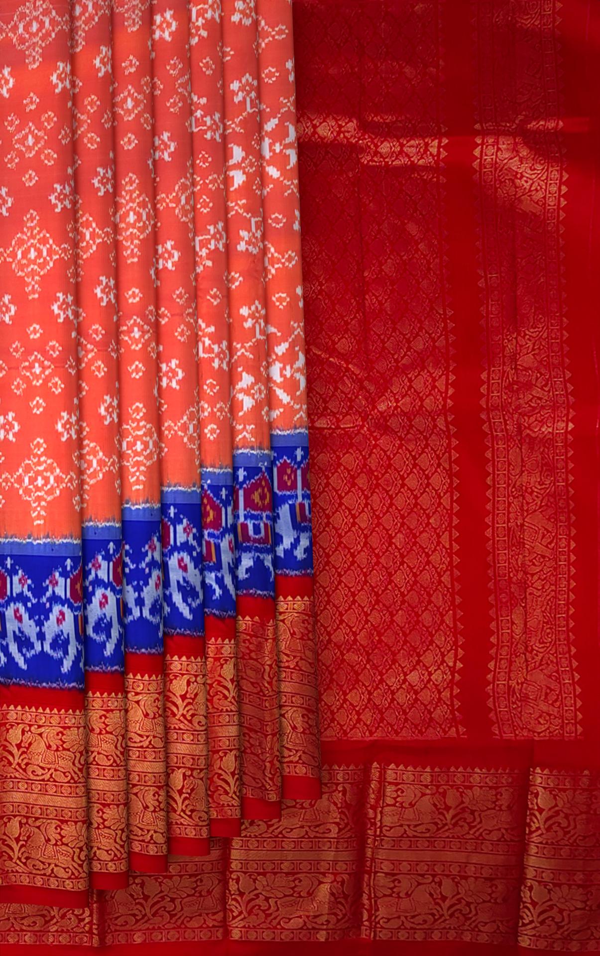 Radiate festive joy with our Bright Orange and Red Navaratna Pochampally Saree. The bright orange body is beautifully paired with a rich red pallu and ikat woven blouse, creating a vibrant and lively ensemble. Ideal for festivals and social events, this saree features the Navaratna body design, symbolizing the nine gems, adding an auspicious touch to your look.
