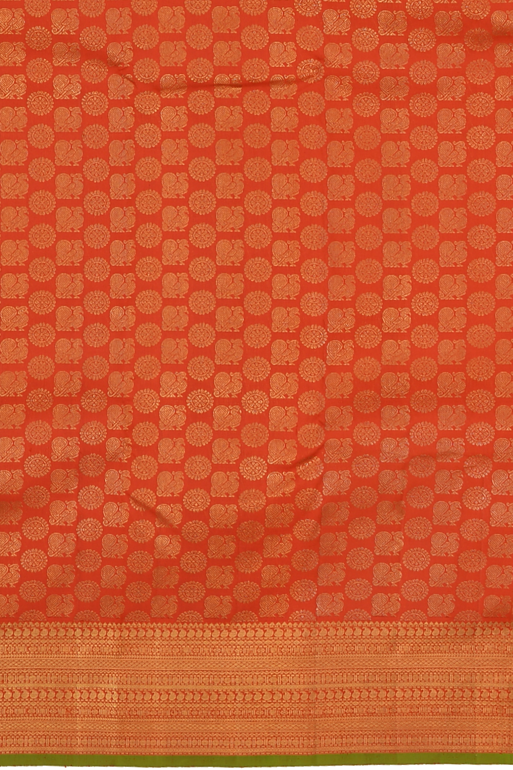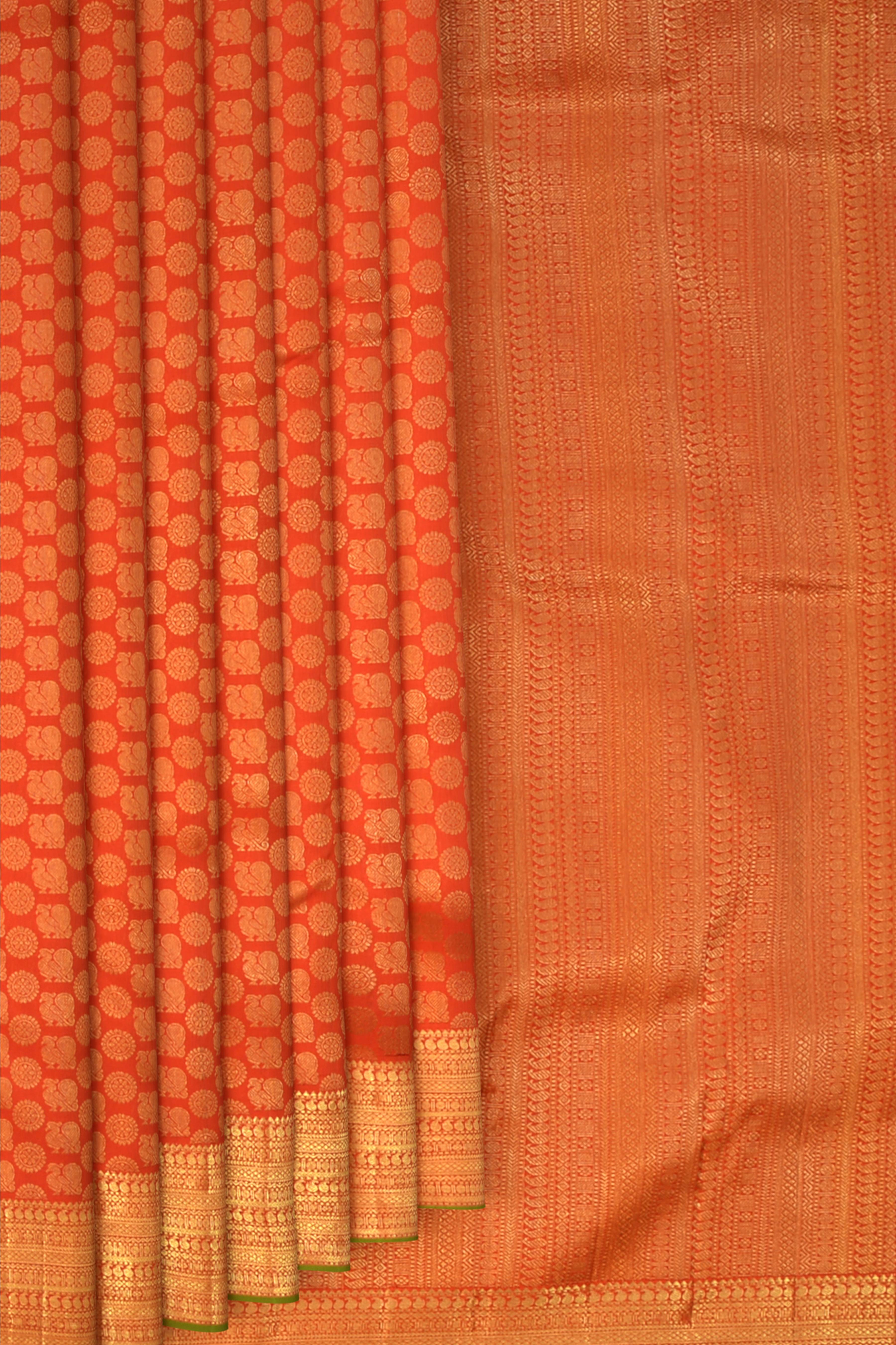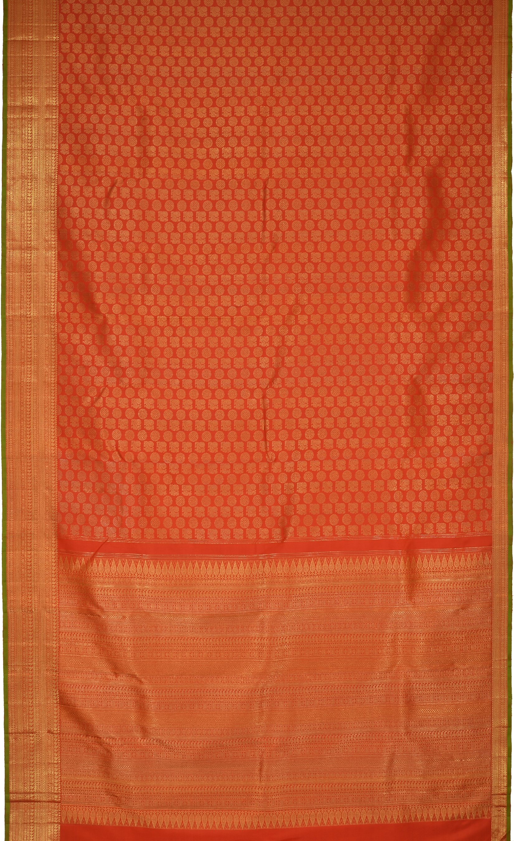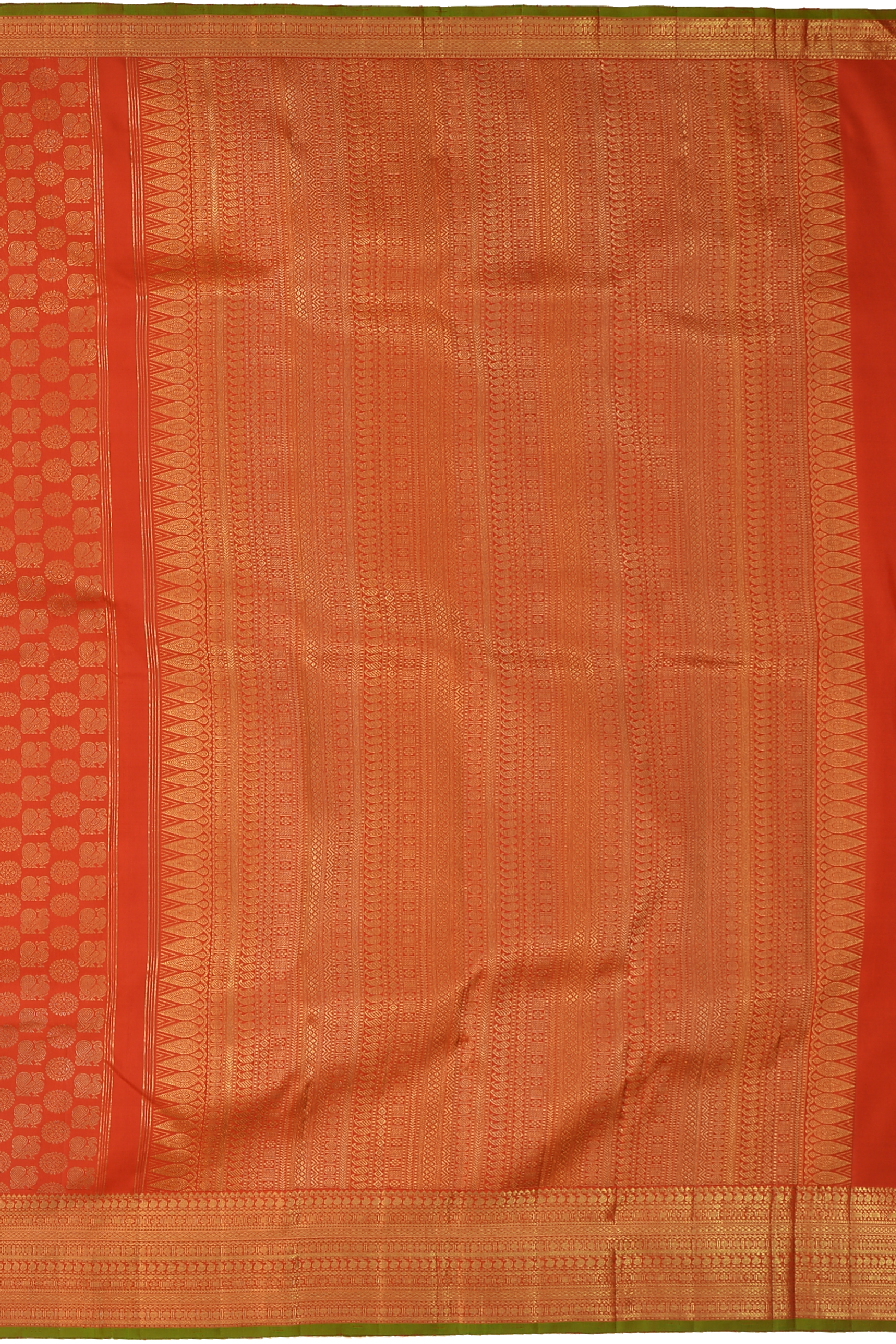 The saree's contrast green selvedge border adds an exquisite touch, leading to a grand red pallu boasting intricate designs of rudraksham, mango motifs, and more.