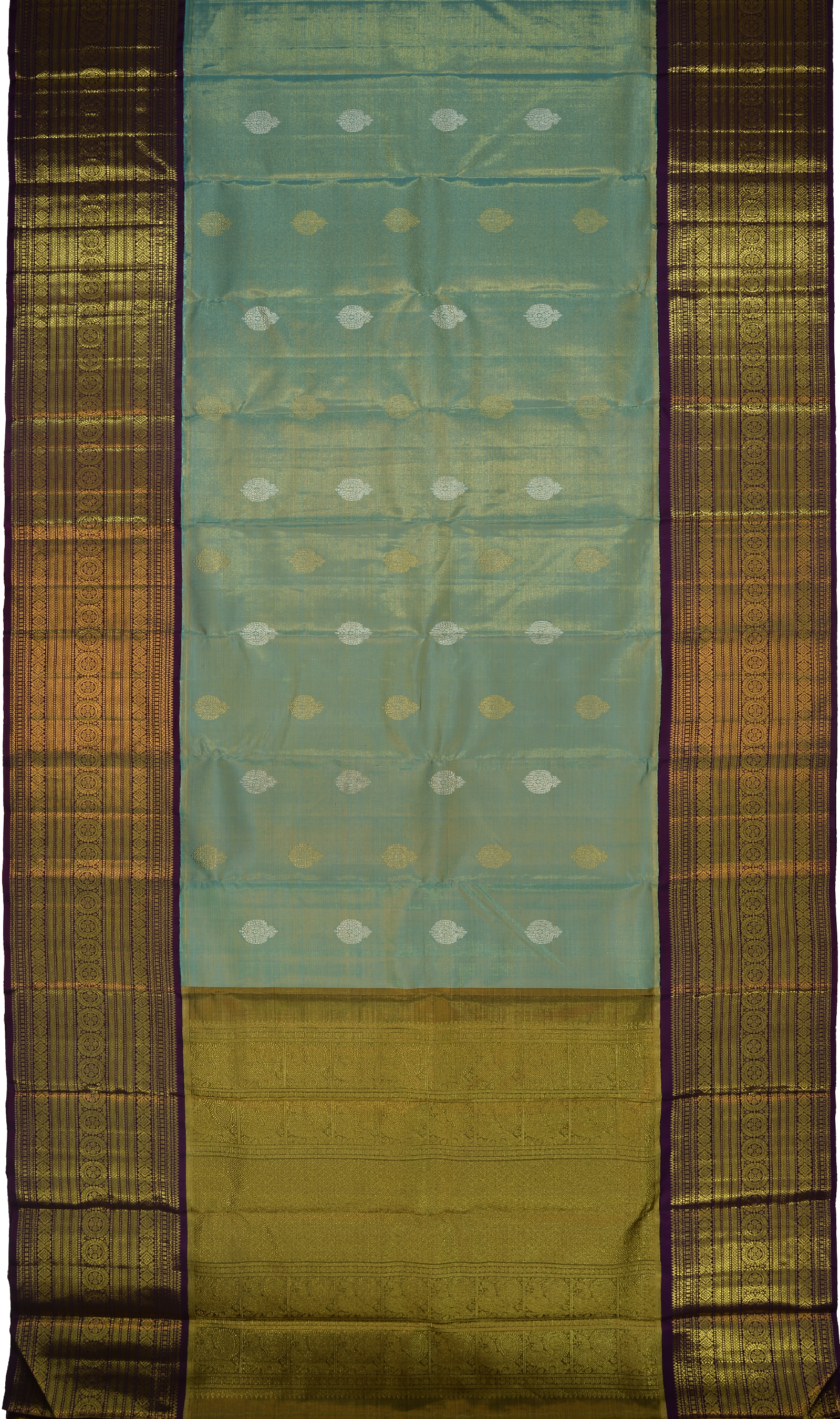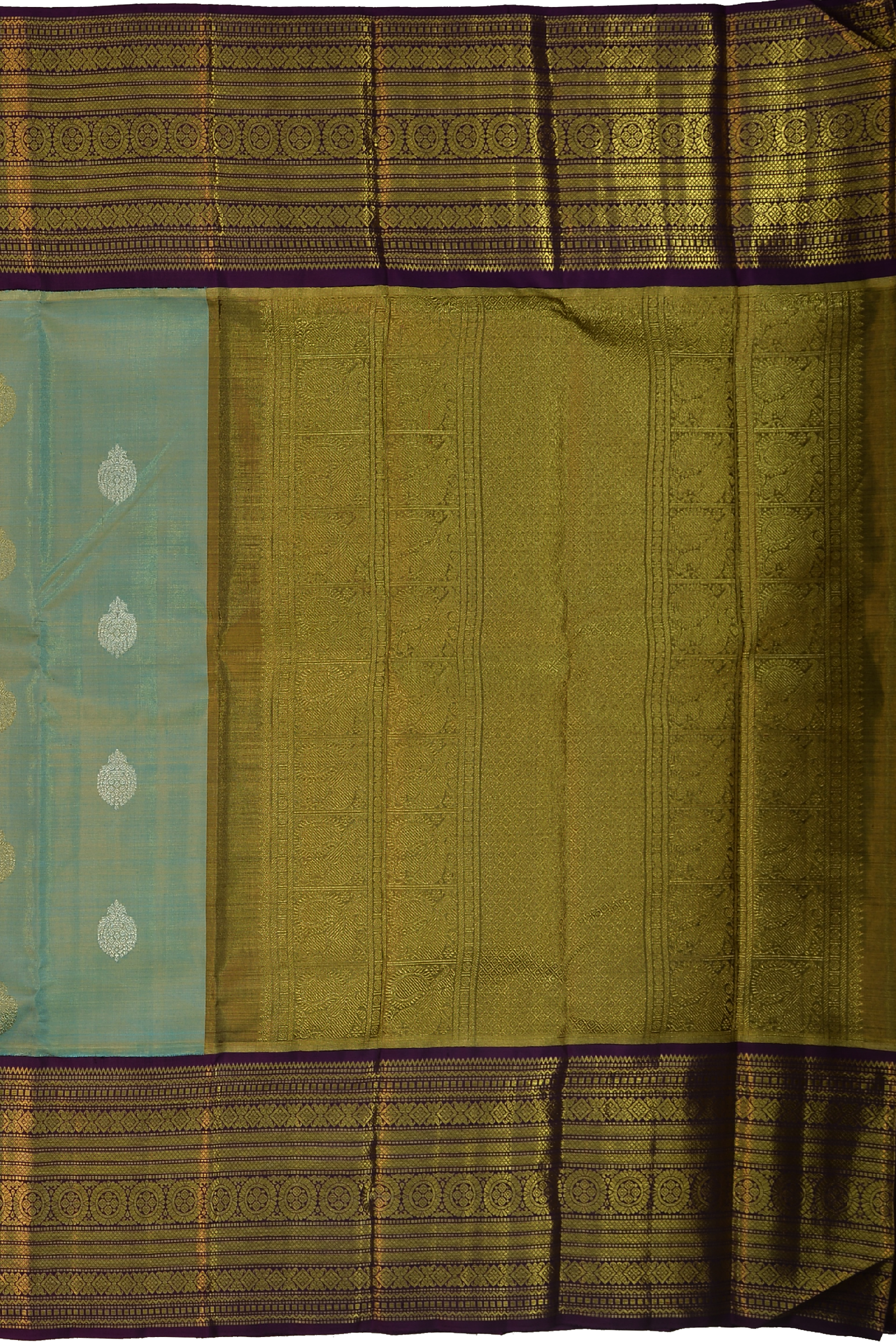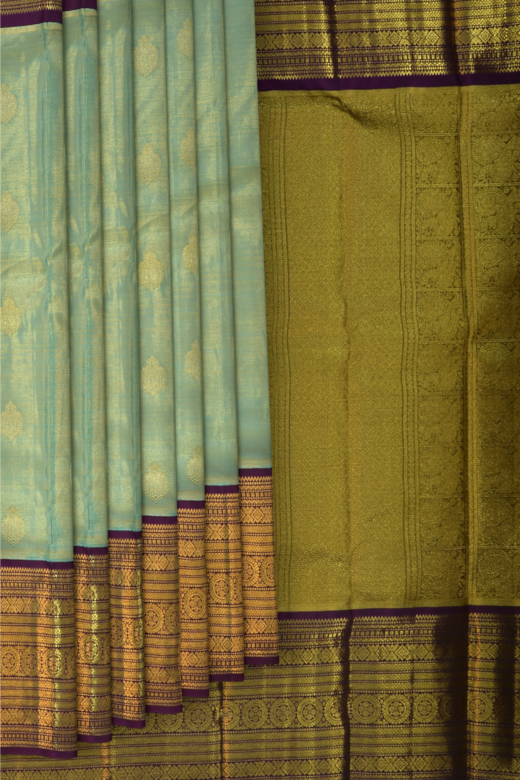 Drifting into the pallu, the grandeur reaches its zenith, making every fold and drape a testament to unparalleled artistry. Coupled with a tissue golden blouse framed with a violet border, this saree promises a look that's both regal and timeless.