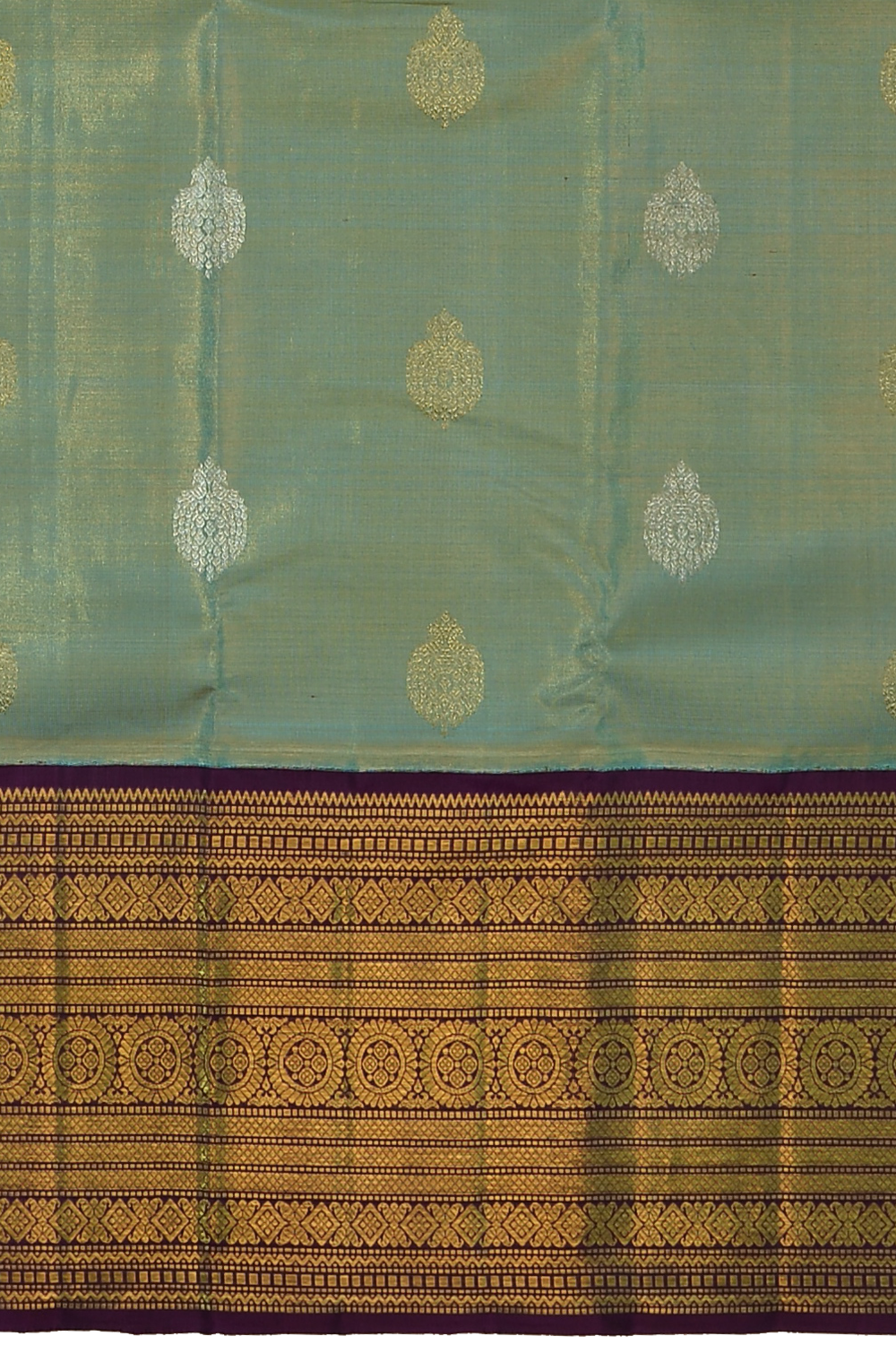 The body boasts an exquisite tissue design intermingled with silver and gold pomegranate motifs, symbolizing prosperity and grandeur. As you transition to its borders, the saree unveils a vibrant violet contrast, adorned with the Varusai pet border featuring motifs like Annam and the majestic Gatti Pallu.