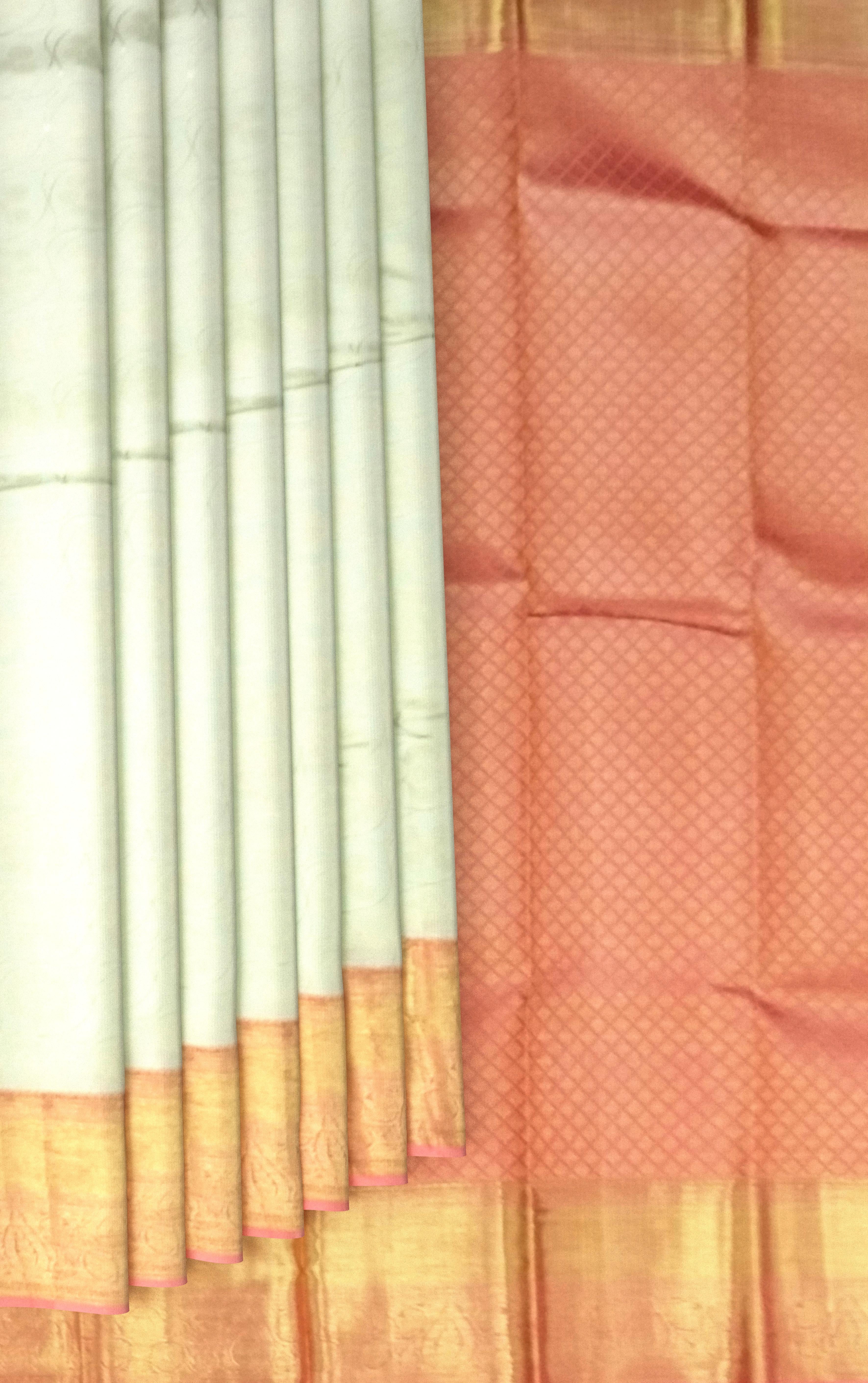 Emanate grace and sophistication with this off-white Kanchipuram silk jacquard saree, delicately woven with an intricate floral design. The peach-hued pallu and blouse add a soft yet striking contrast, making this saree a perfect blend of tradition and modernity. The fine jacquard weave ensures a luxurious drape, enhancing the wearer’s elegance.