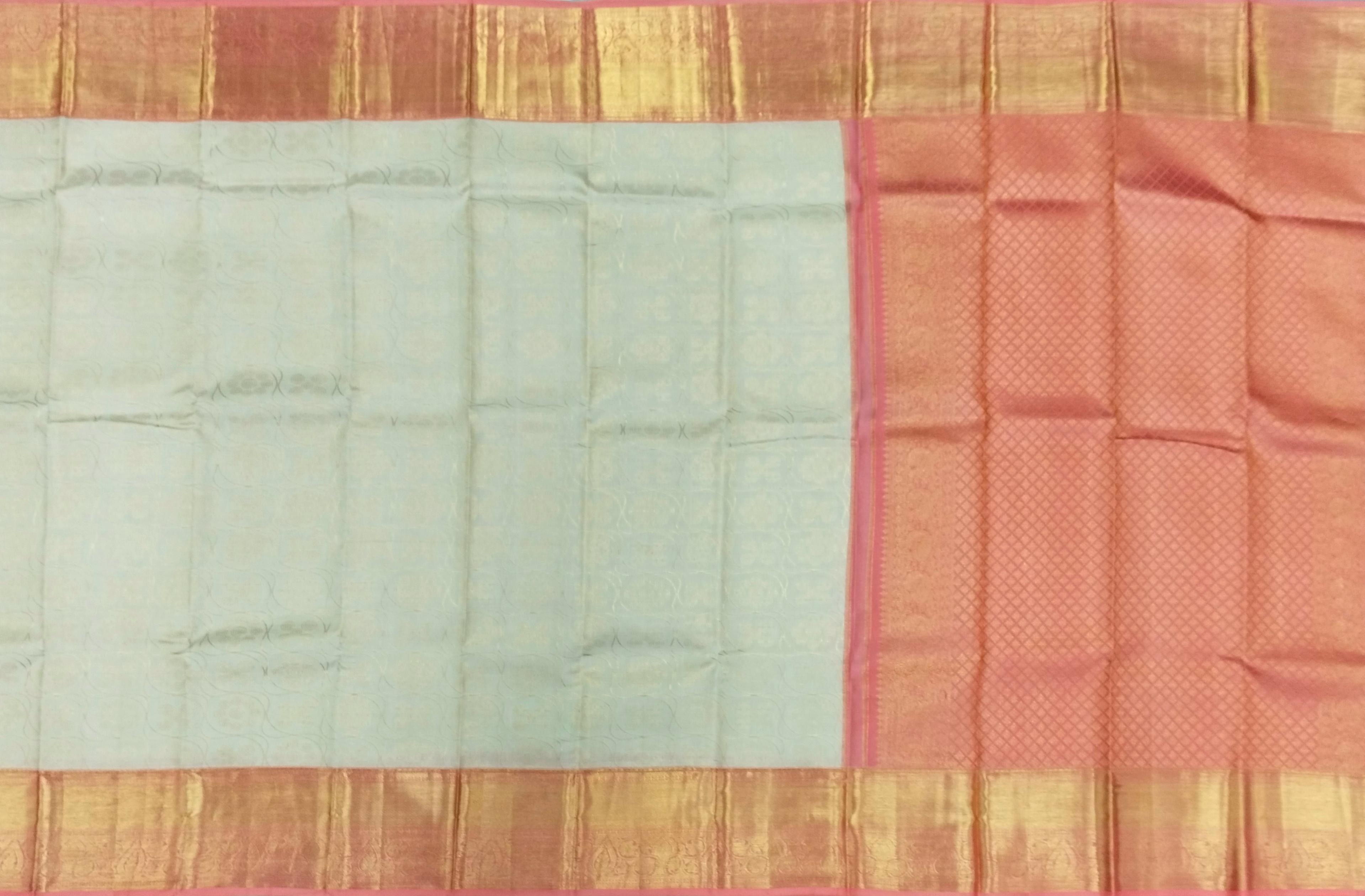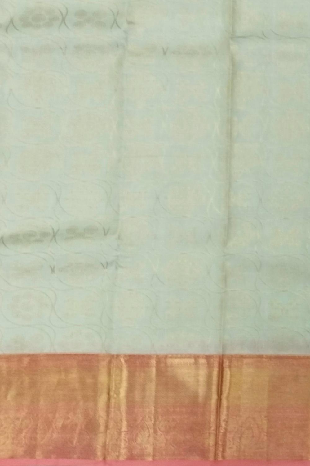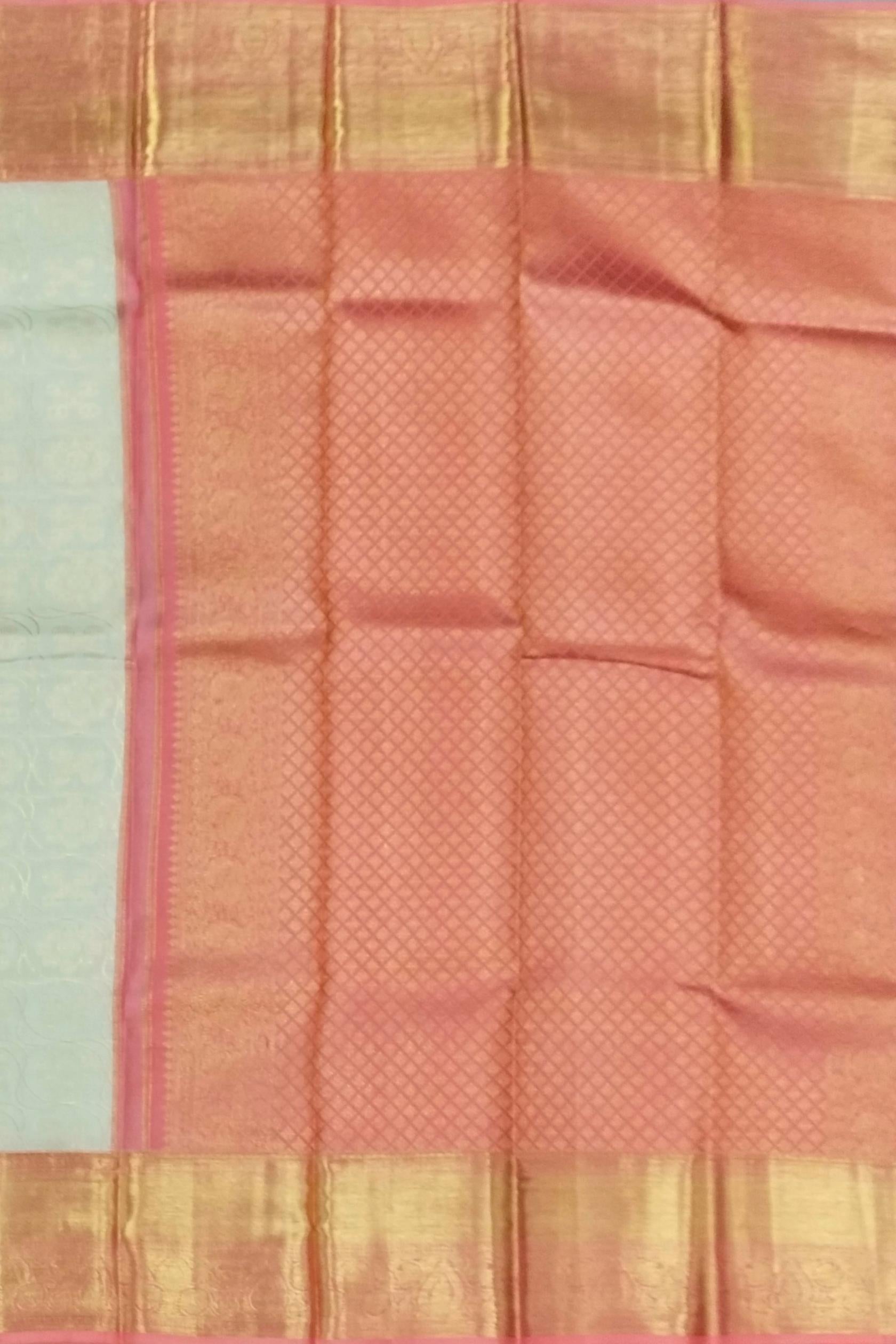 Floral designs in Indian textiles have long been associated with beauty, femininity, and prosperity. The detailed jaquard weaving technique used in this saree showcases the skill of Kanchipuram weavers, who meticulously craft each thread into a masterpiece of elegance. The subtle yet intricate patterns lend an ethereal charm, making this saree a timeless heirloom.